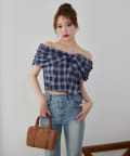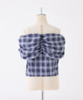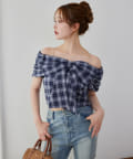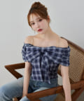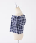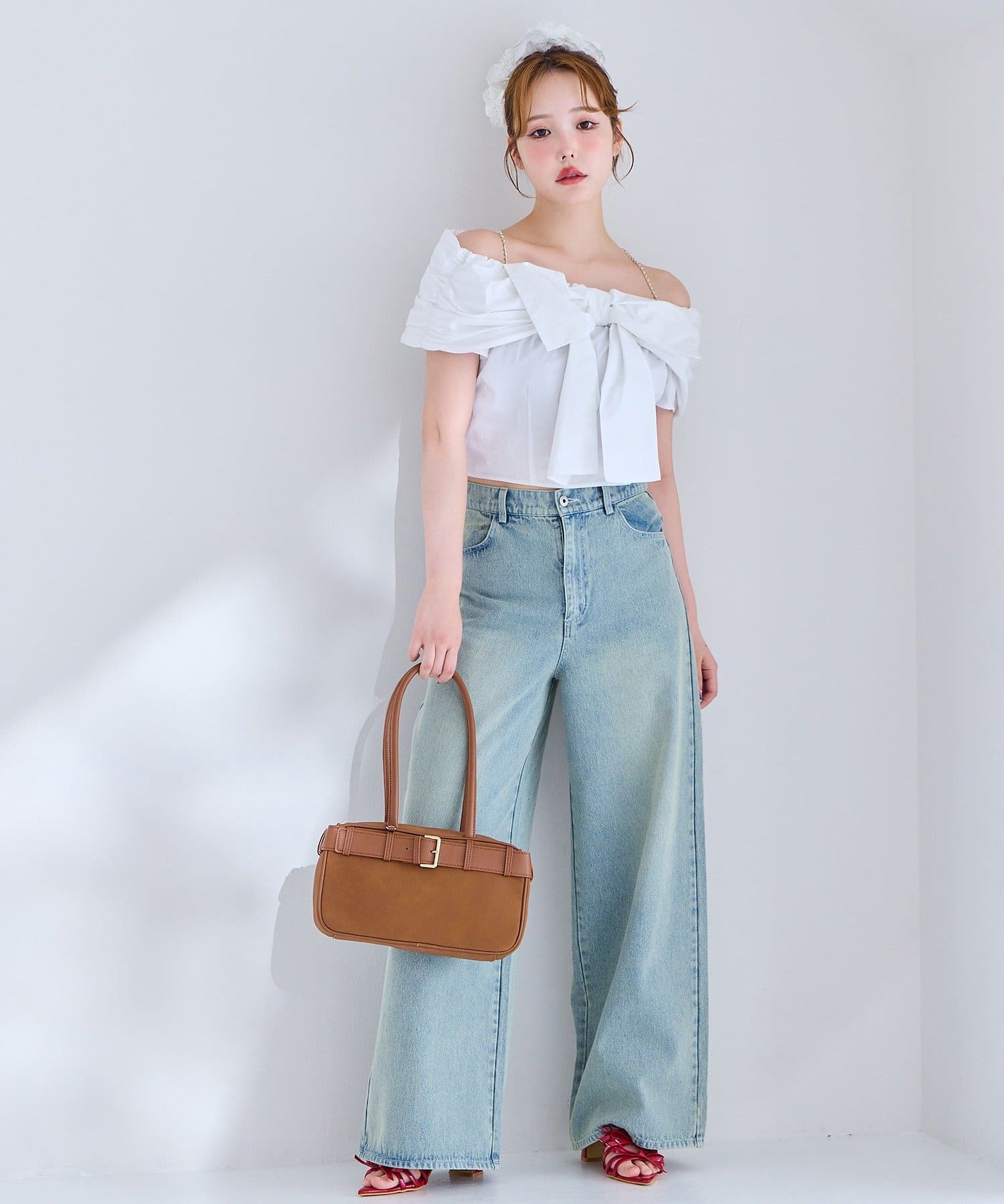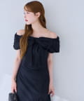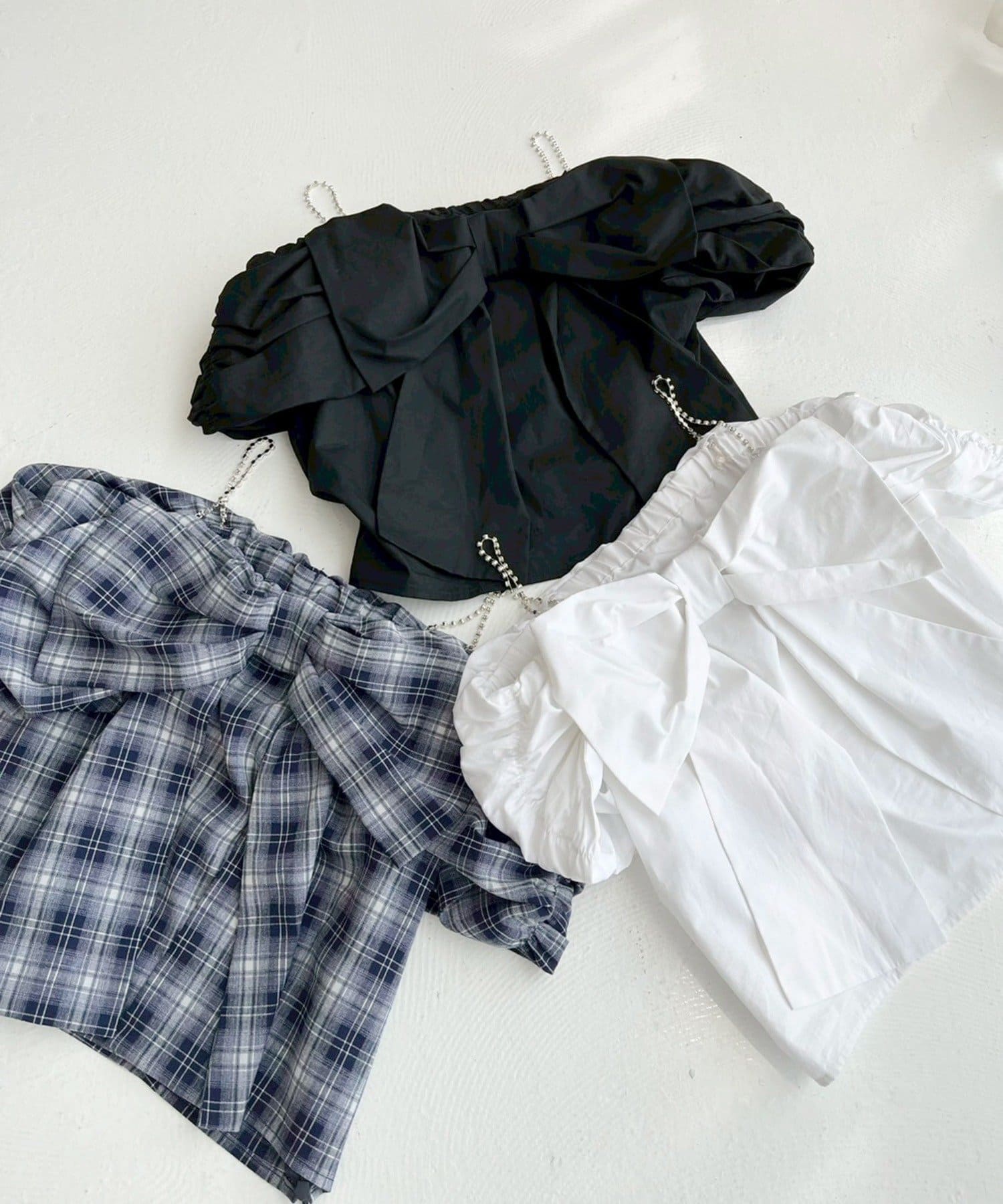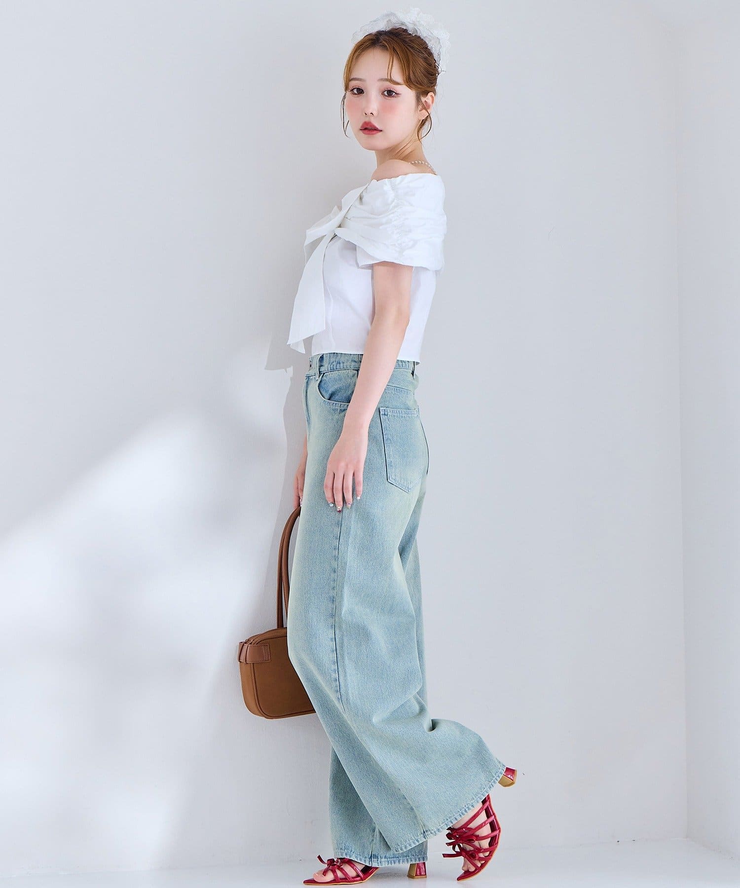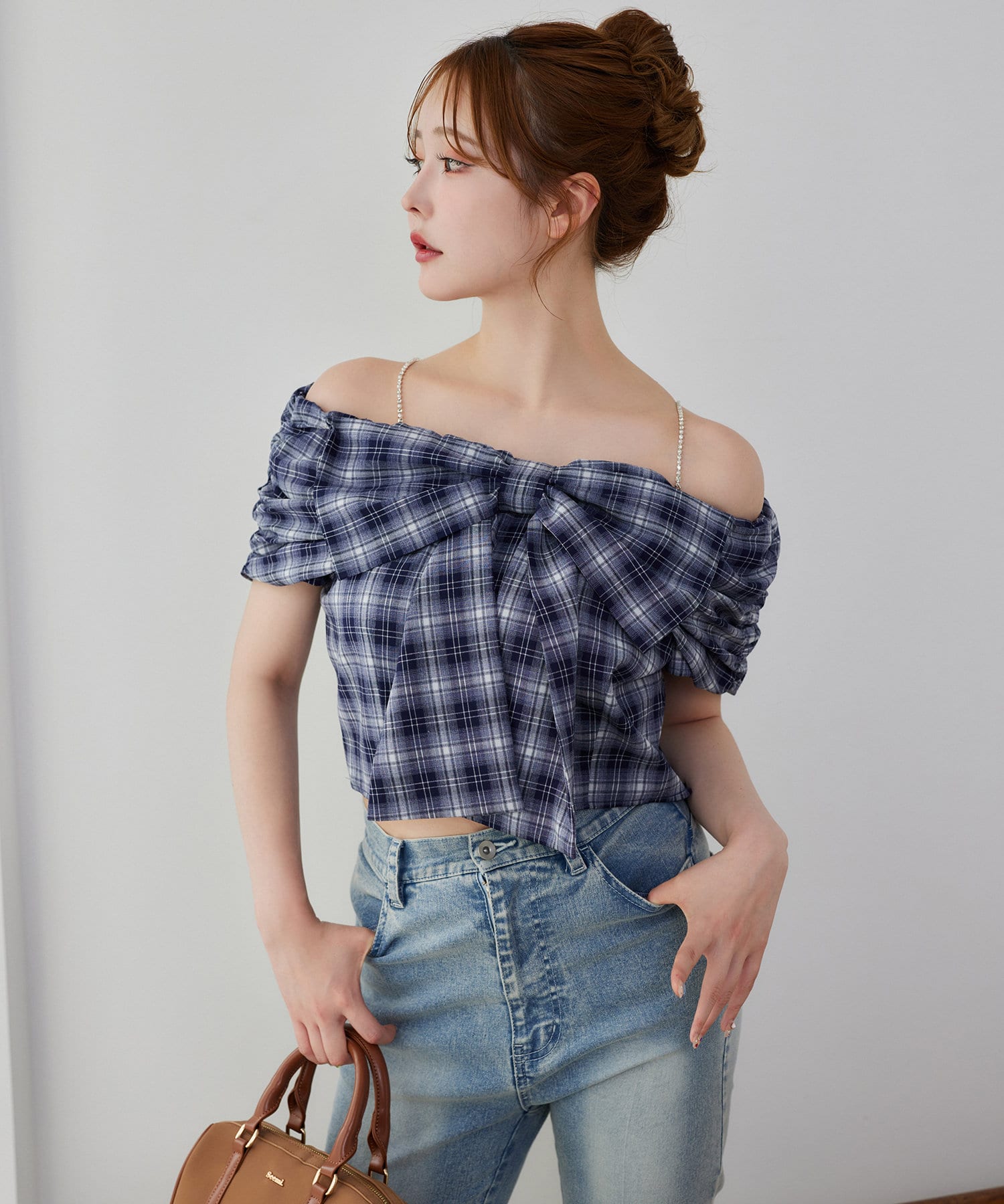 フロントにあしらわれた大きめリボンが主役の、オフショルブラウス