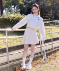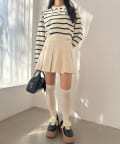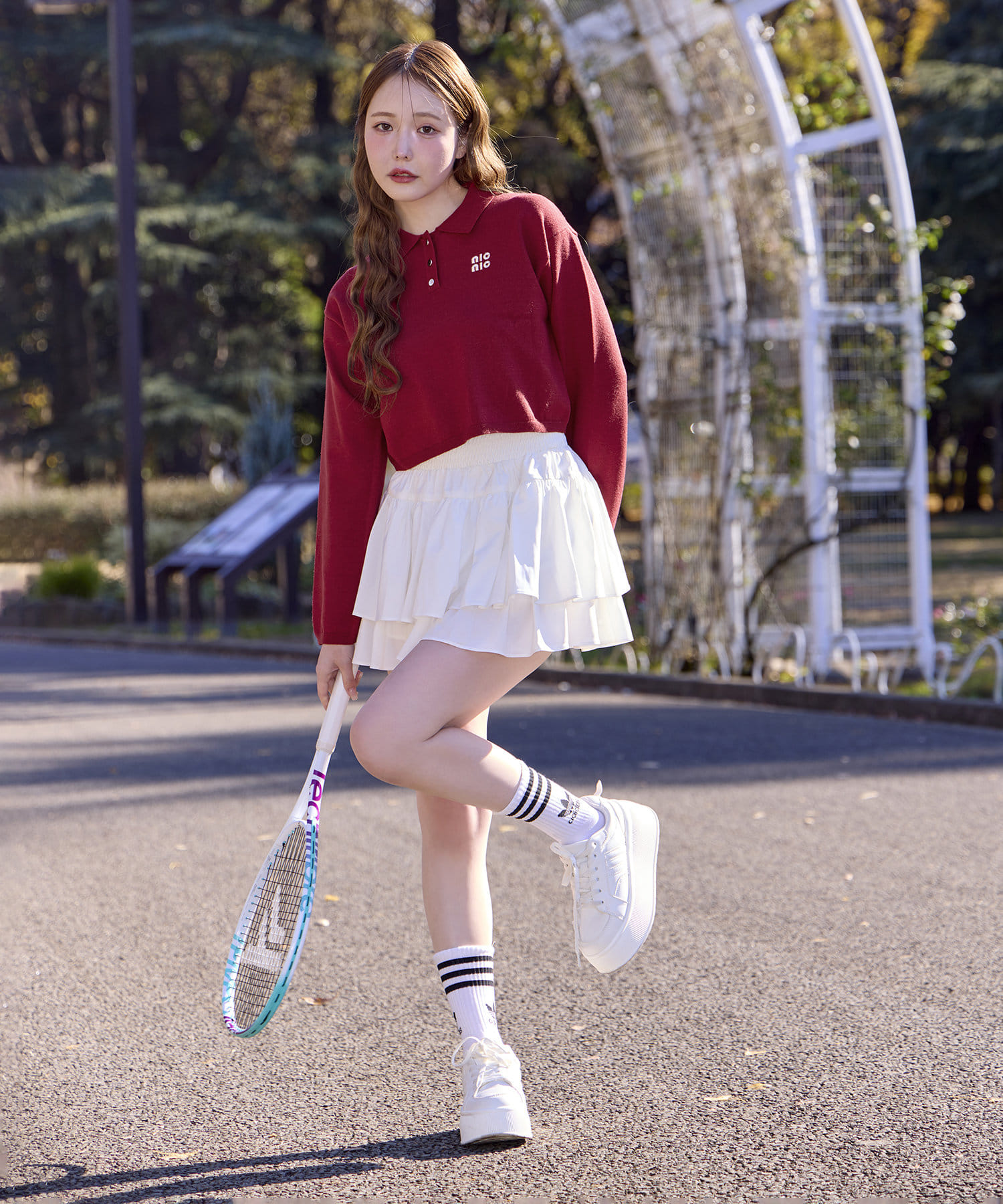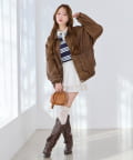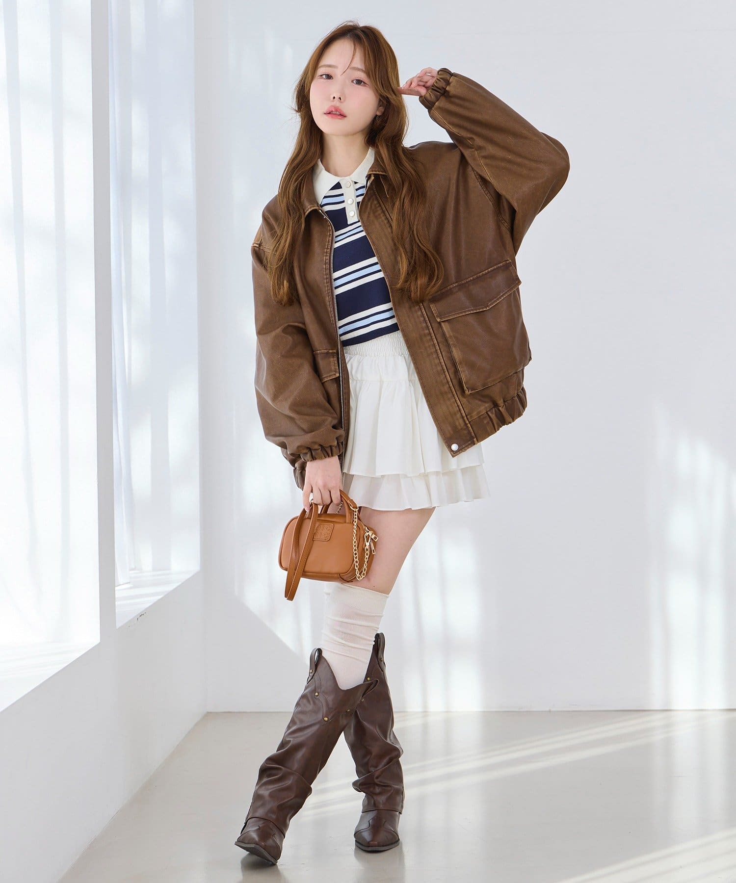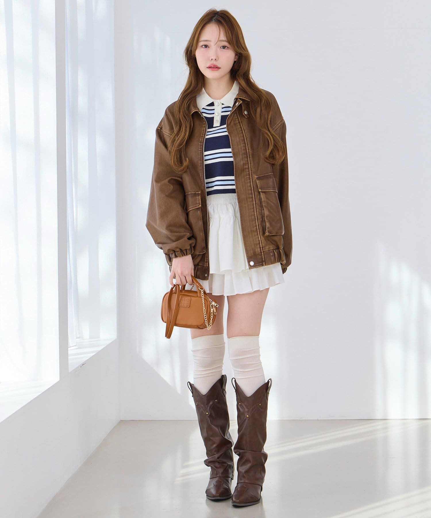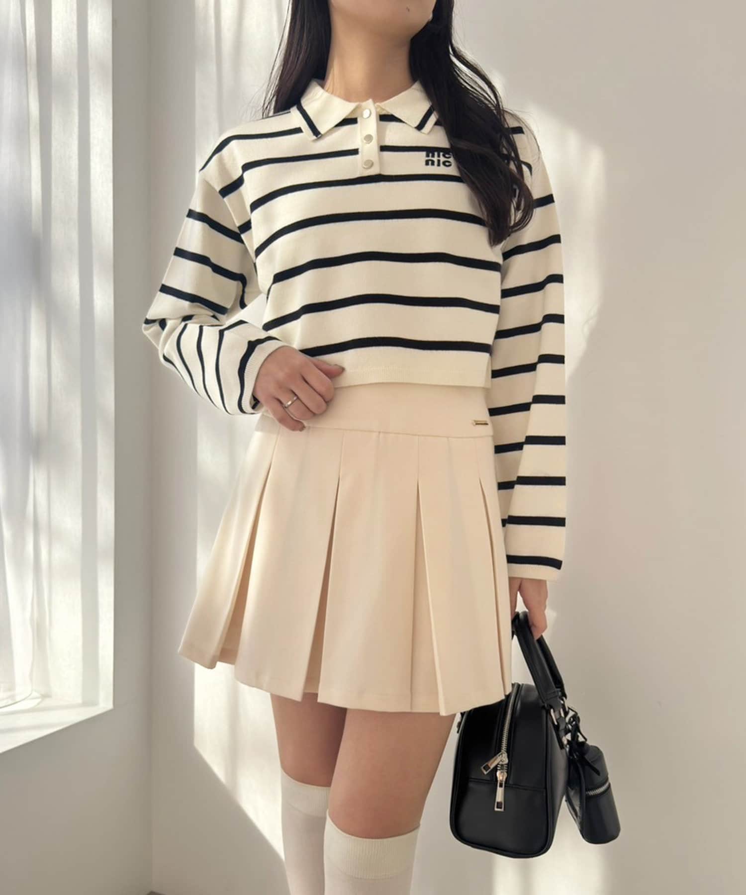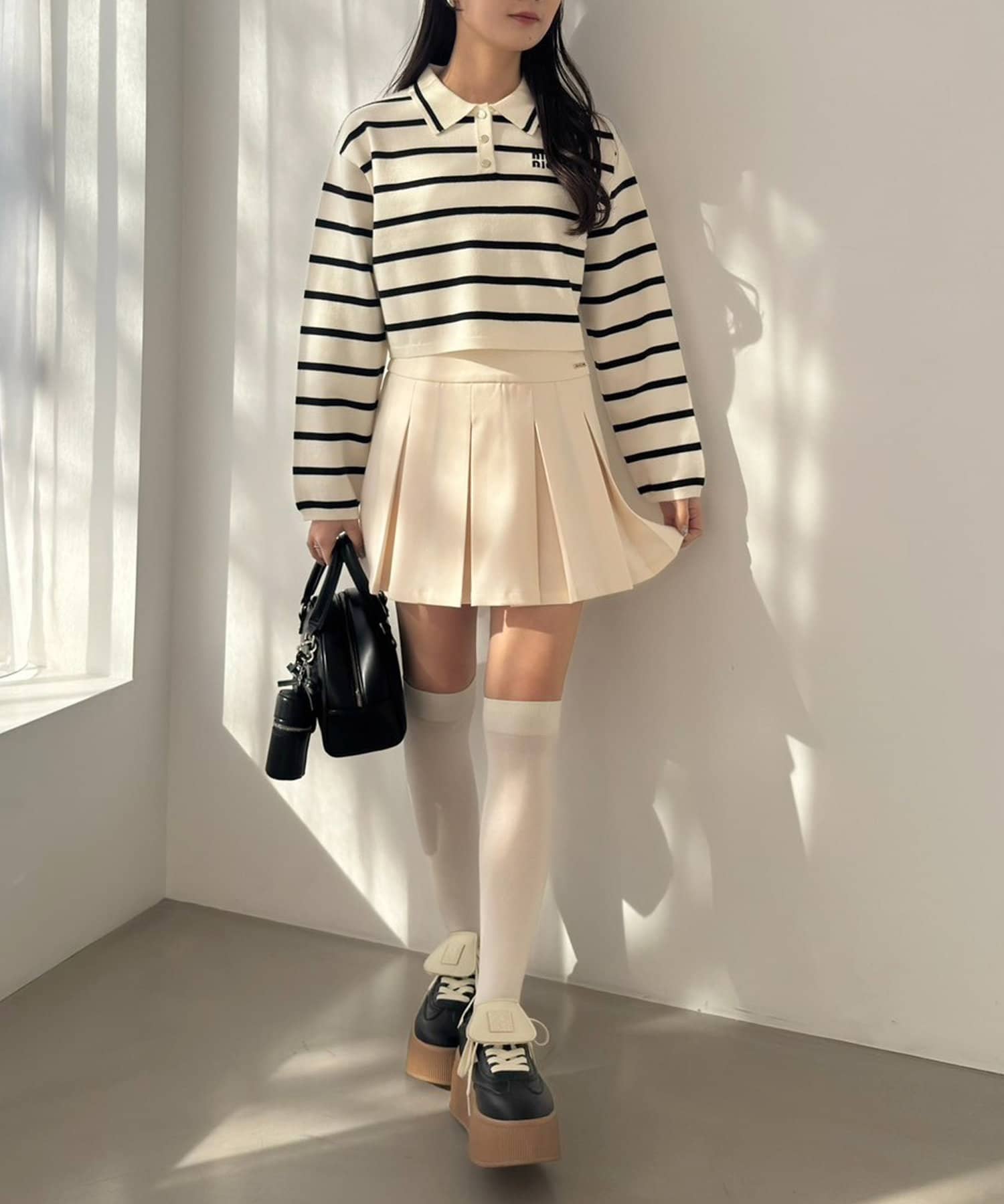 プリーツスカートなどのミニボトムでの合わせがオススメ。