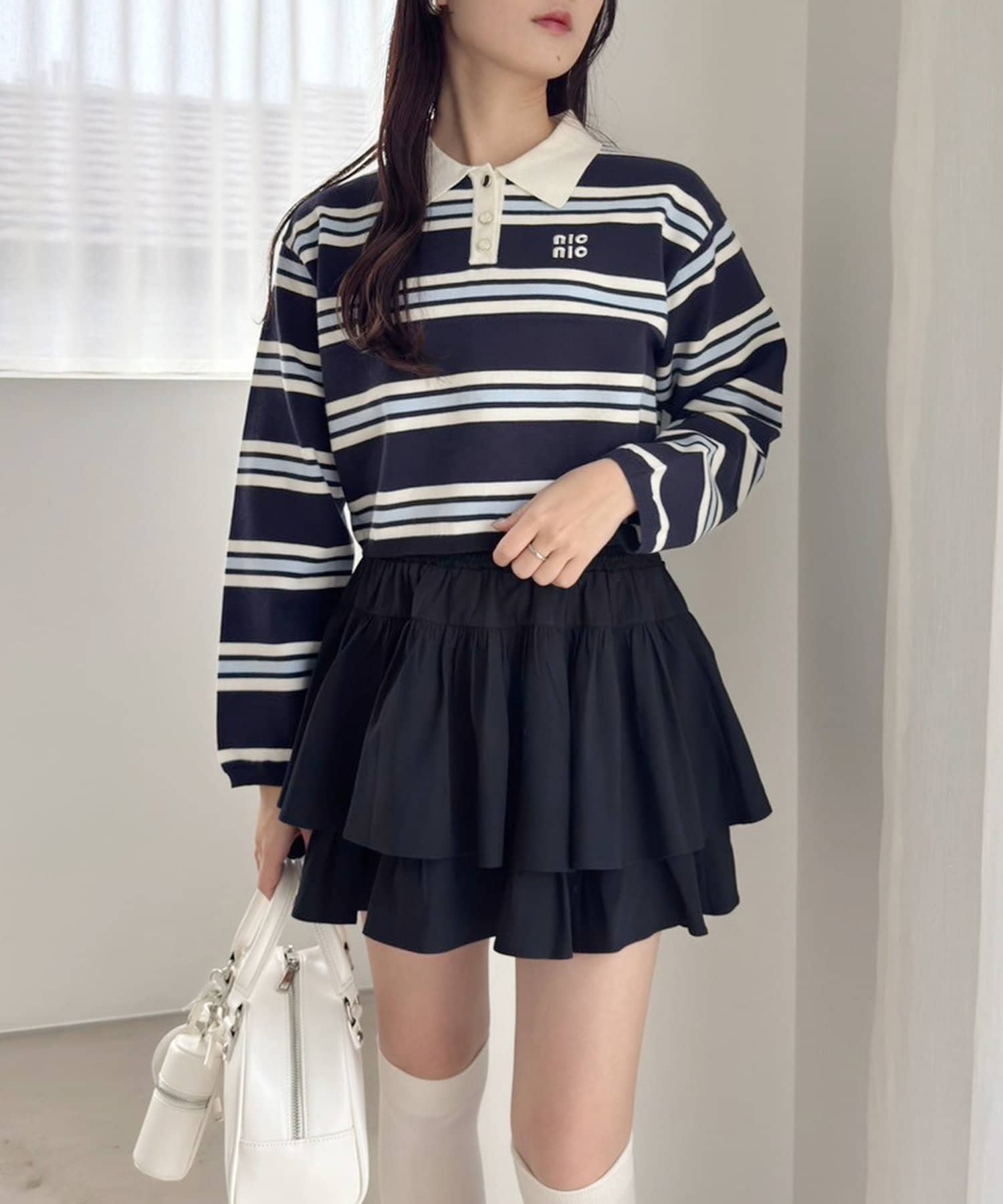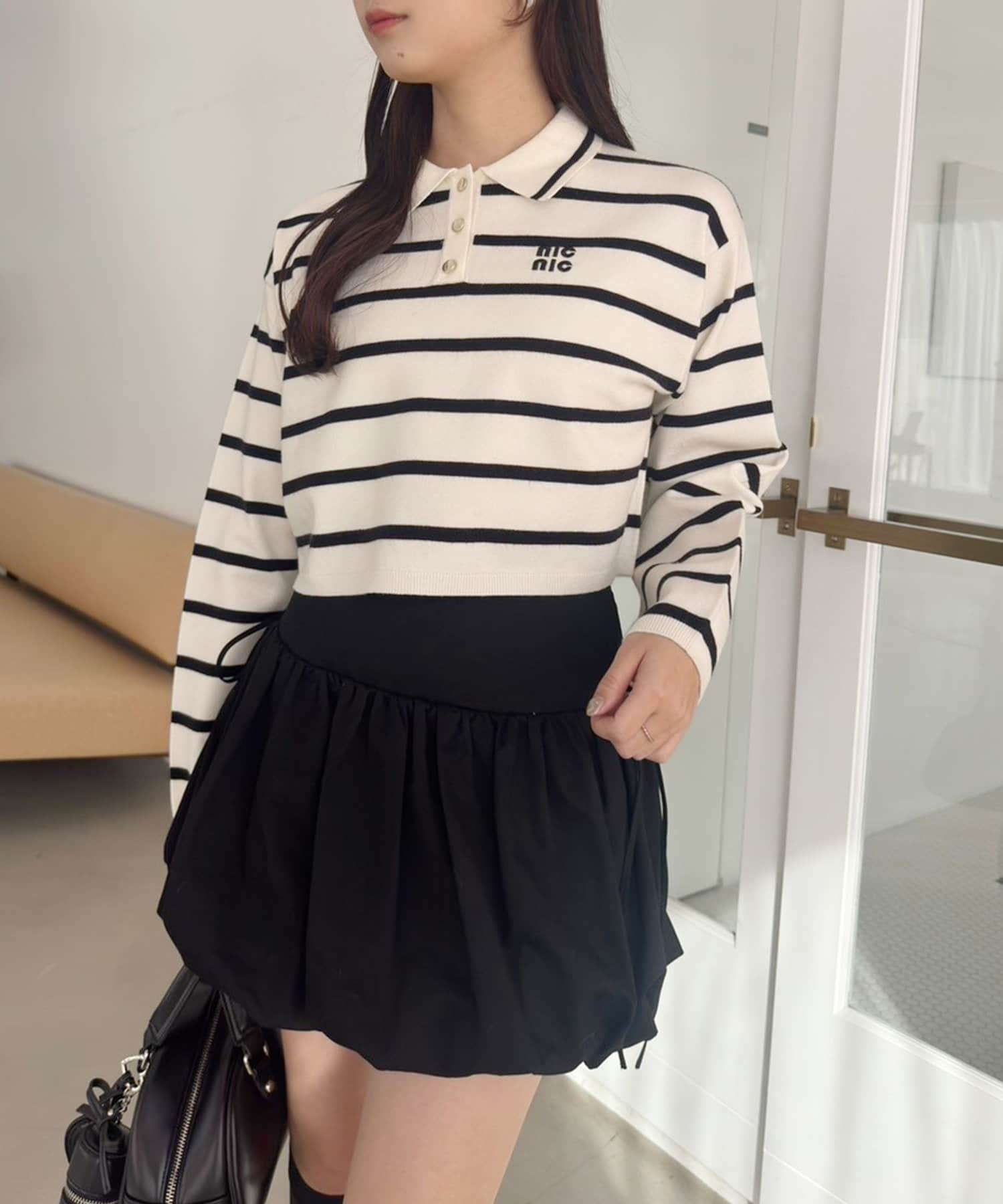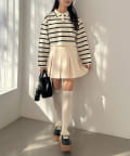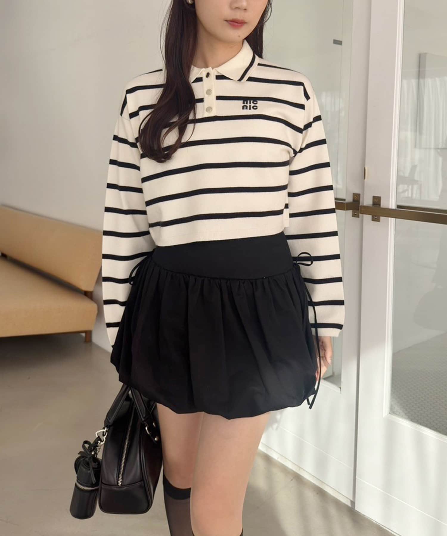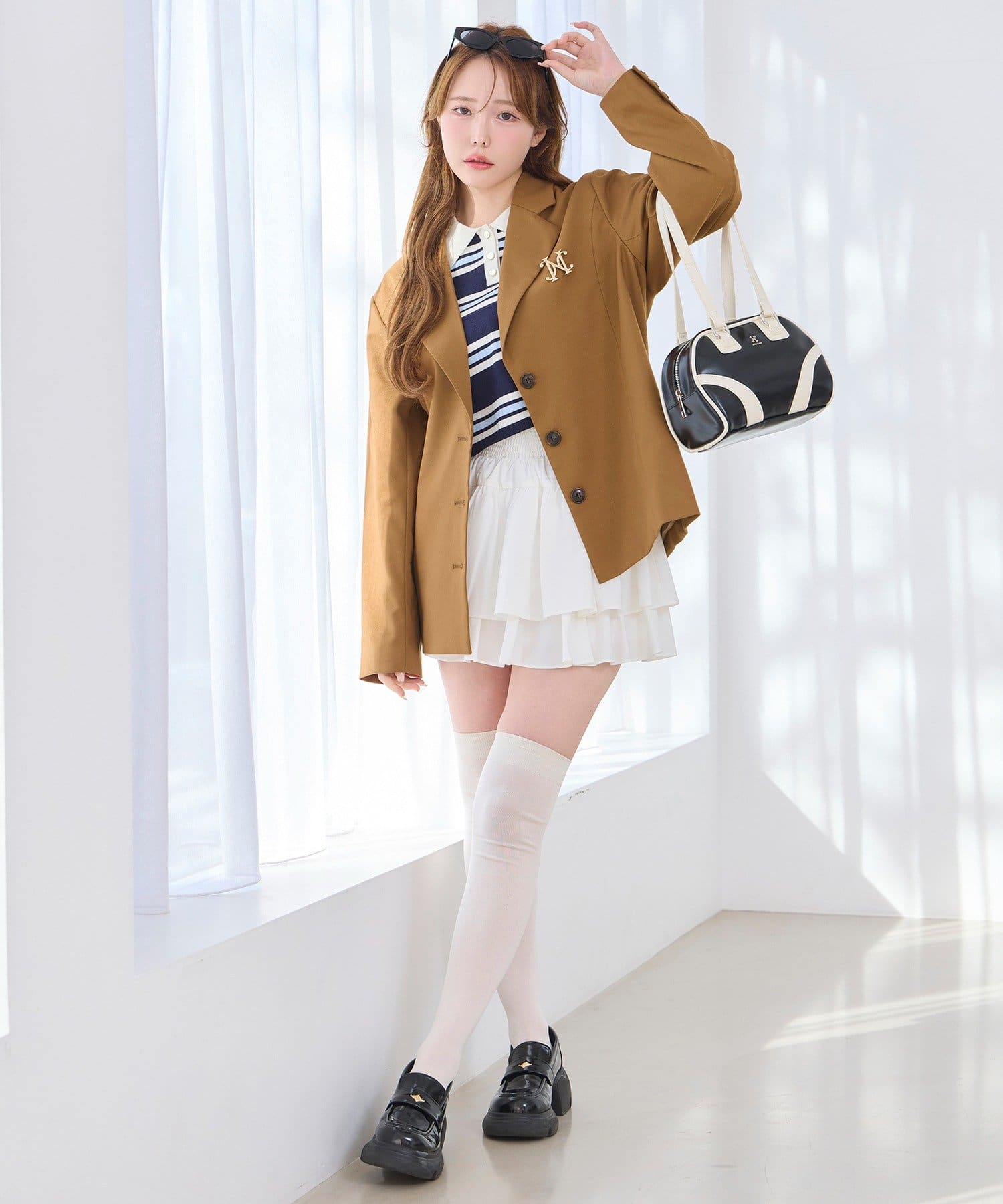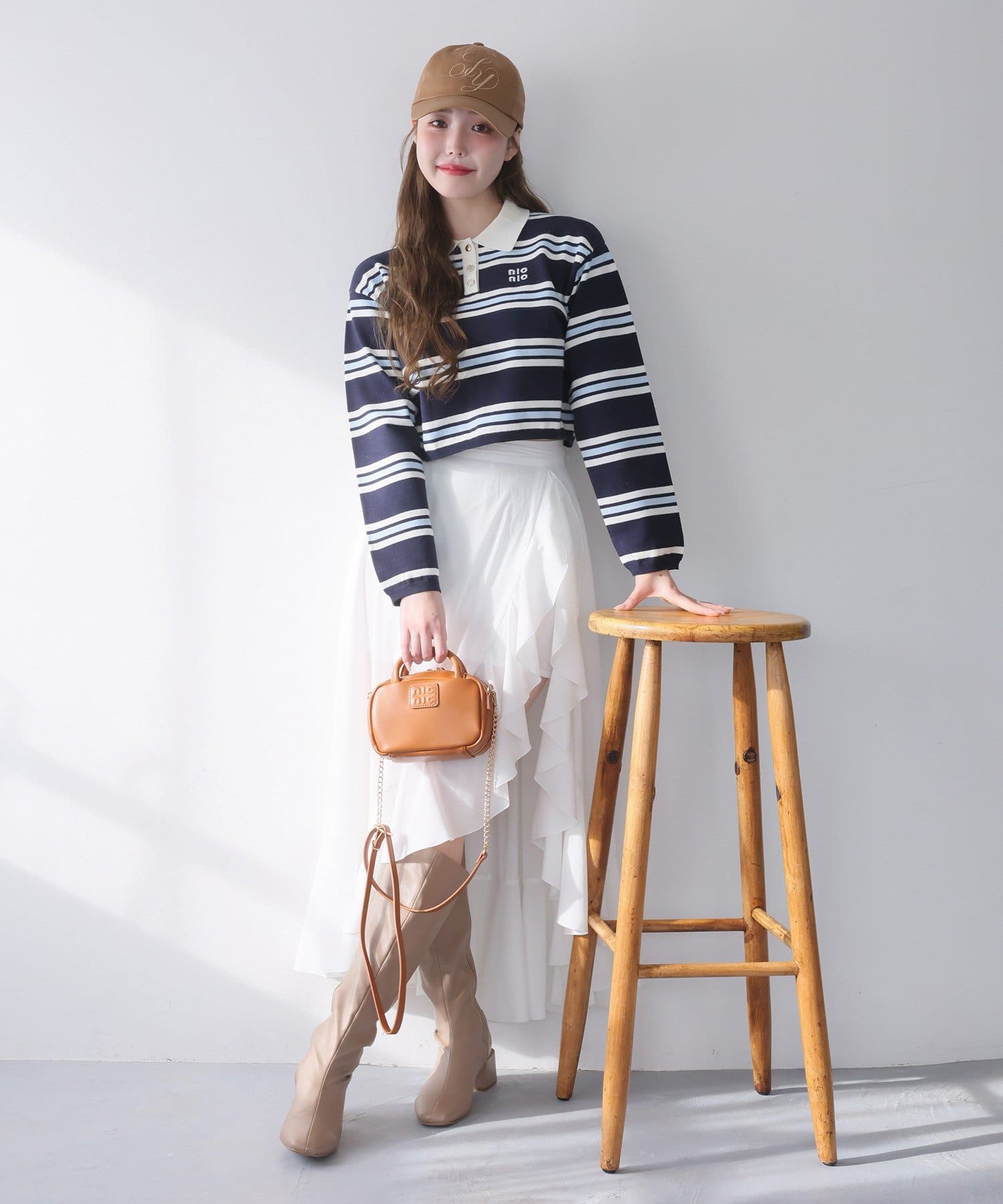 プリーツスカートなどのミニボトムでの合わせがオススメ。