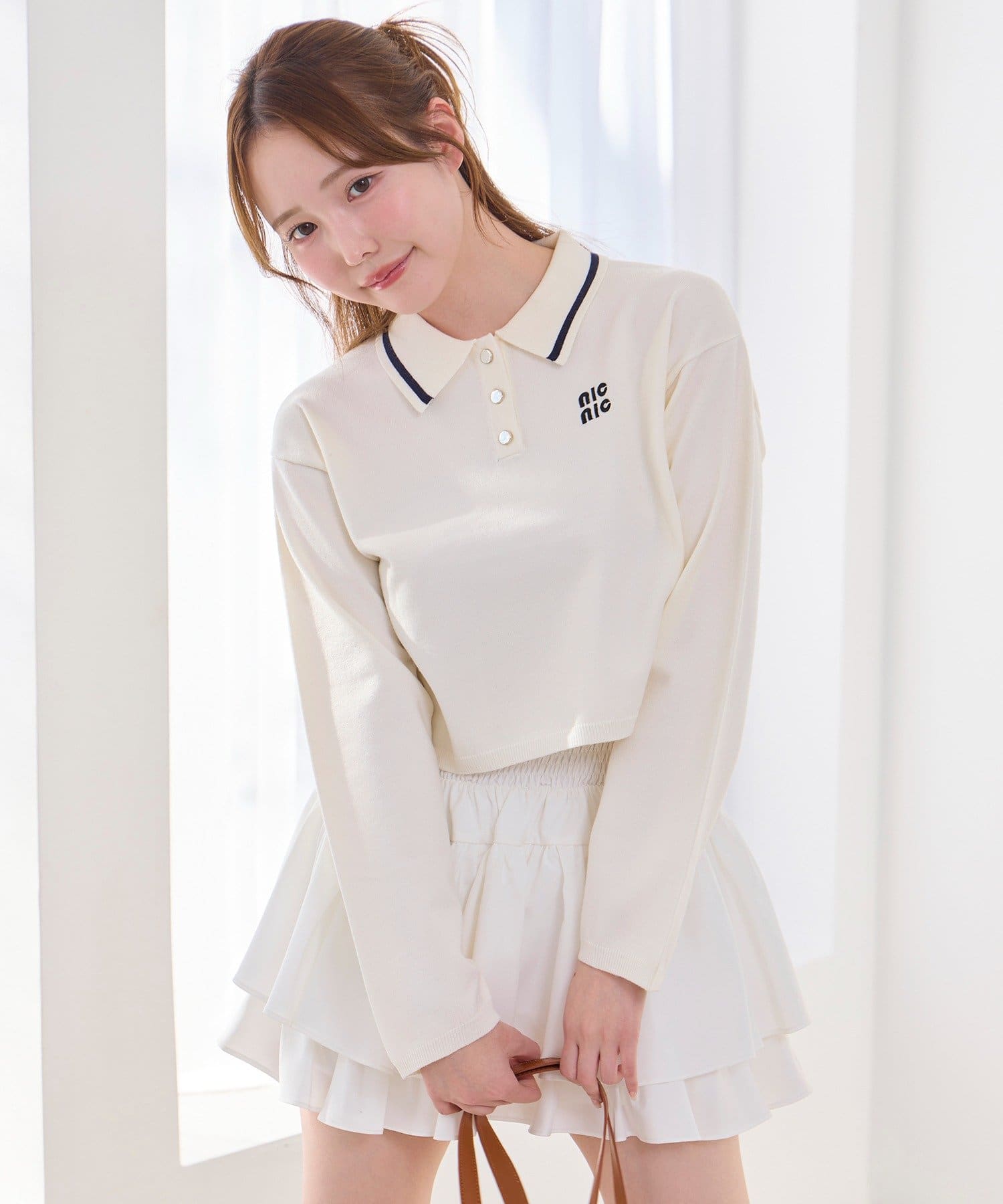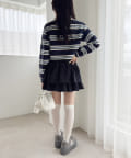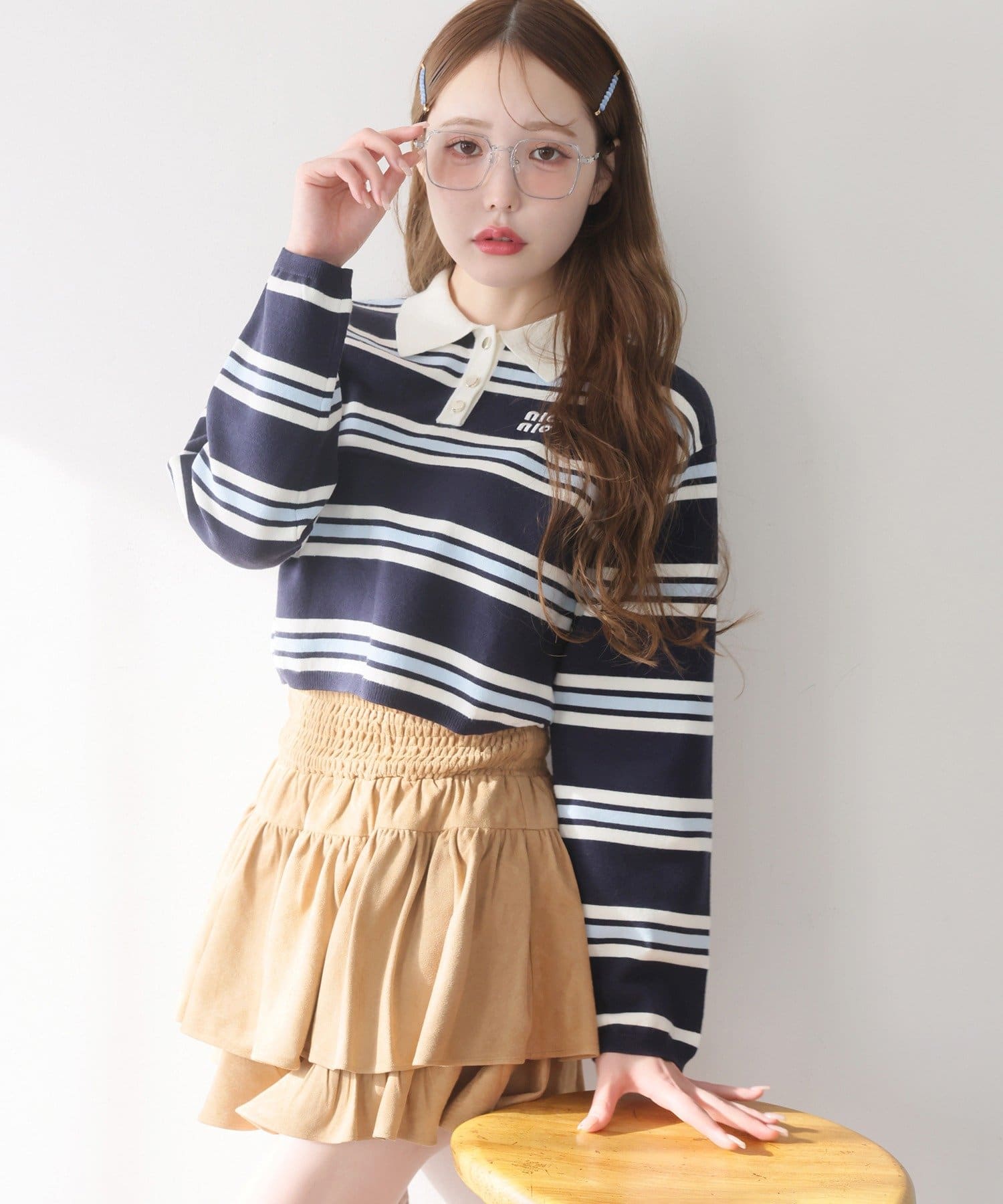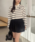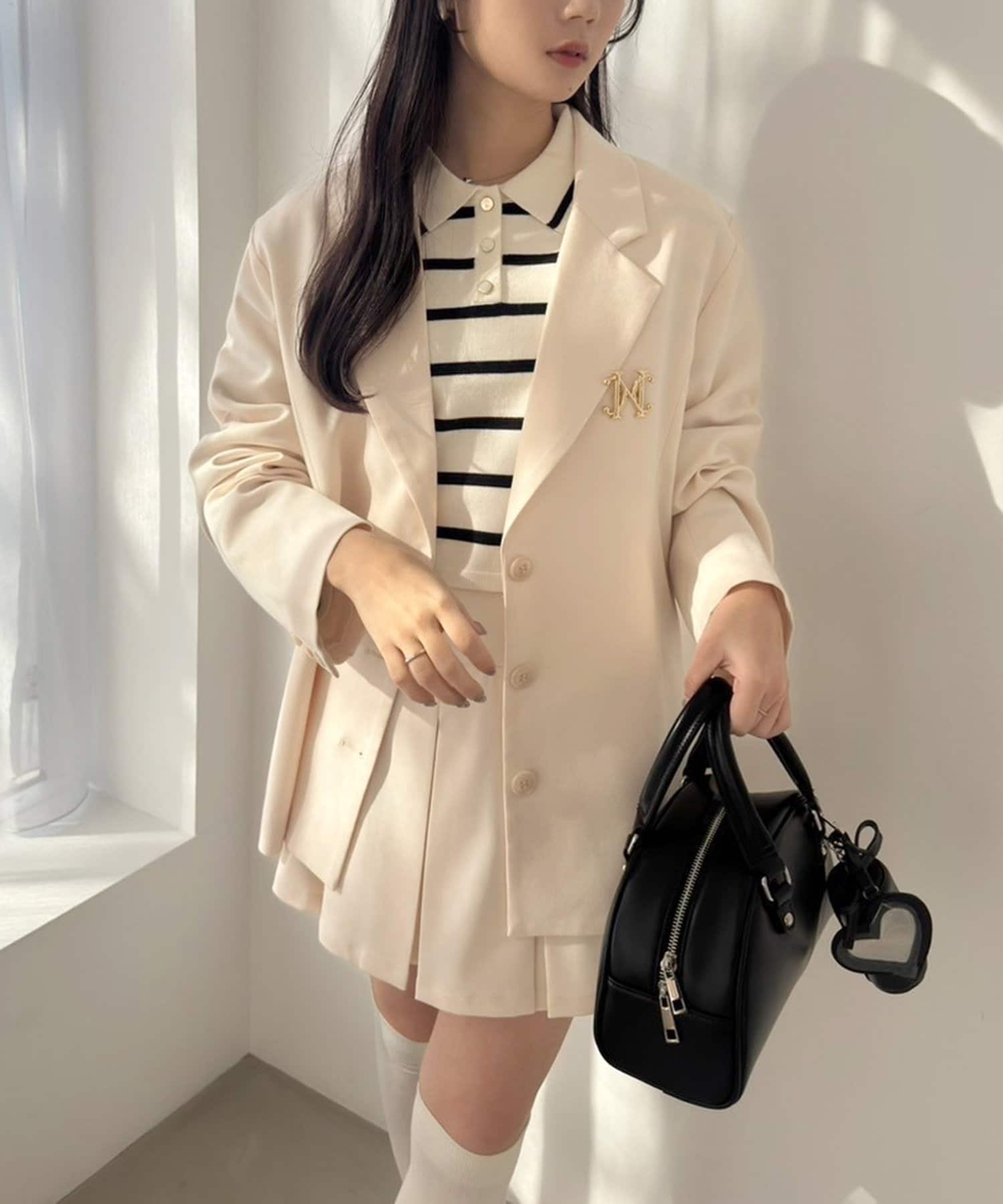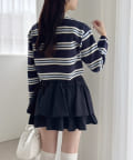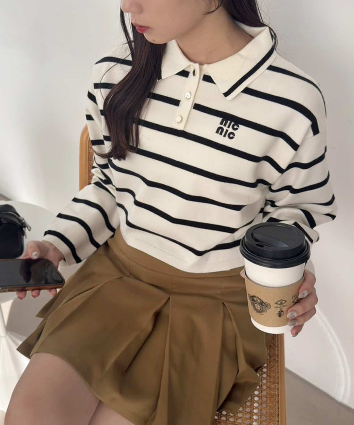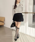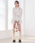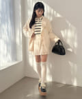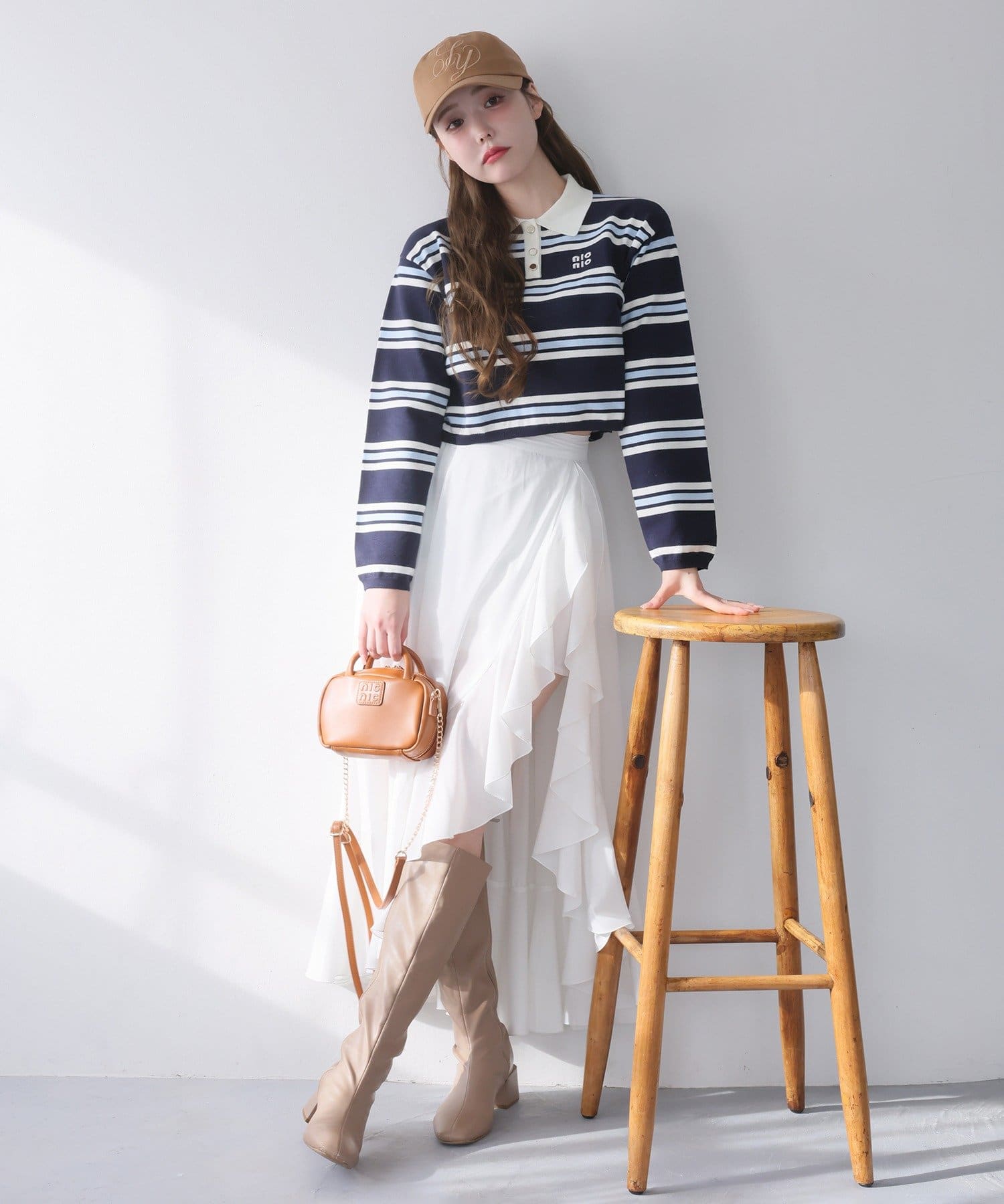 プリーツスカートなどのミニボトムでの合わせがオススメ。