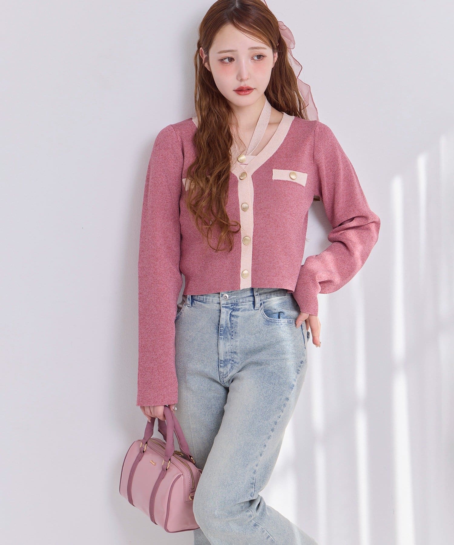 ラメ糸を使用しているため、キラキラとした華やかさが魅力のカーディガン。