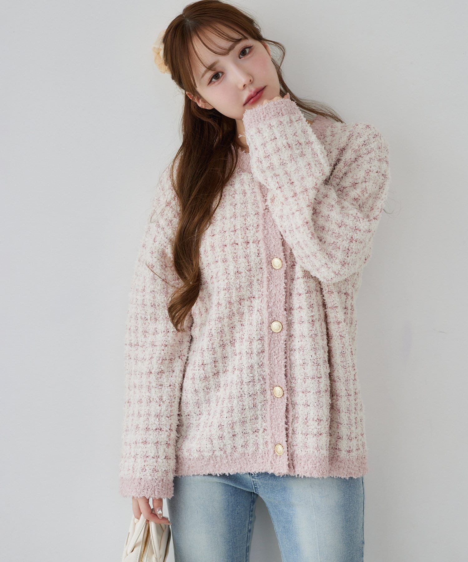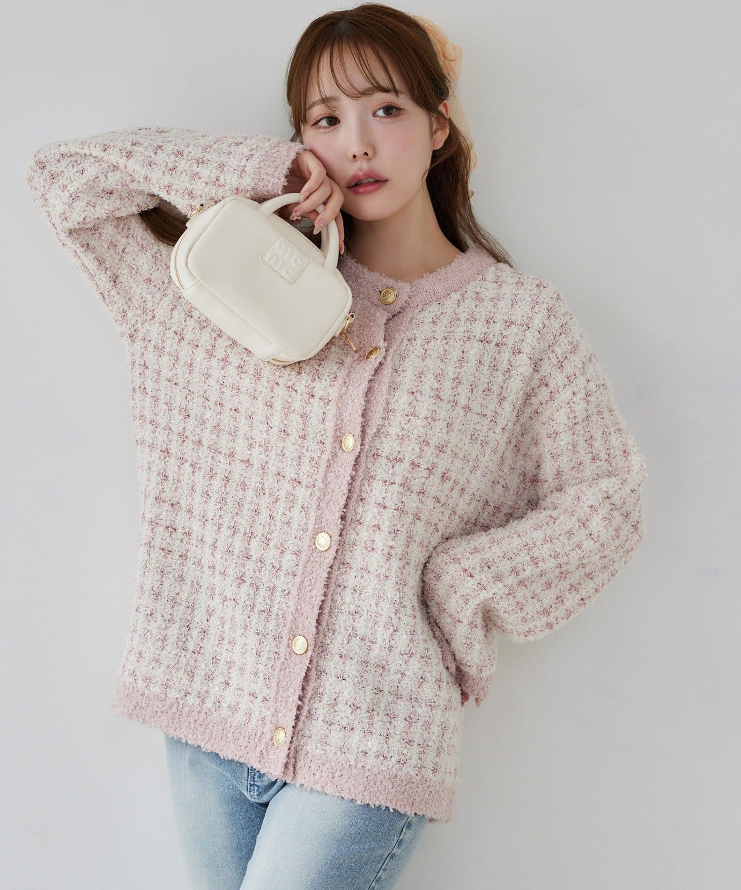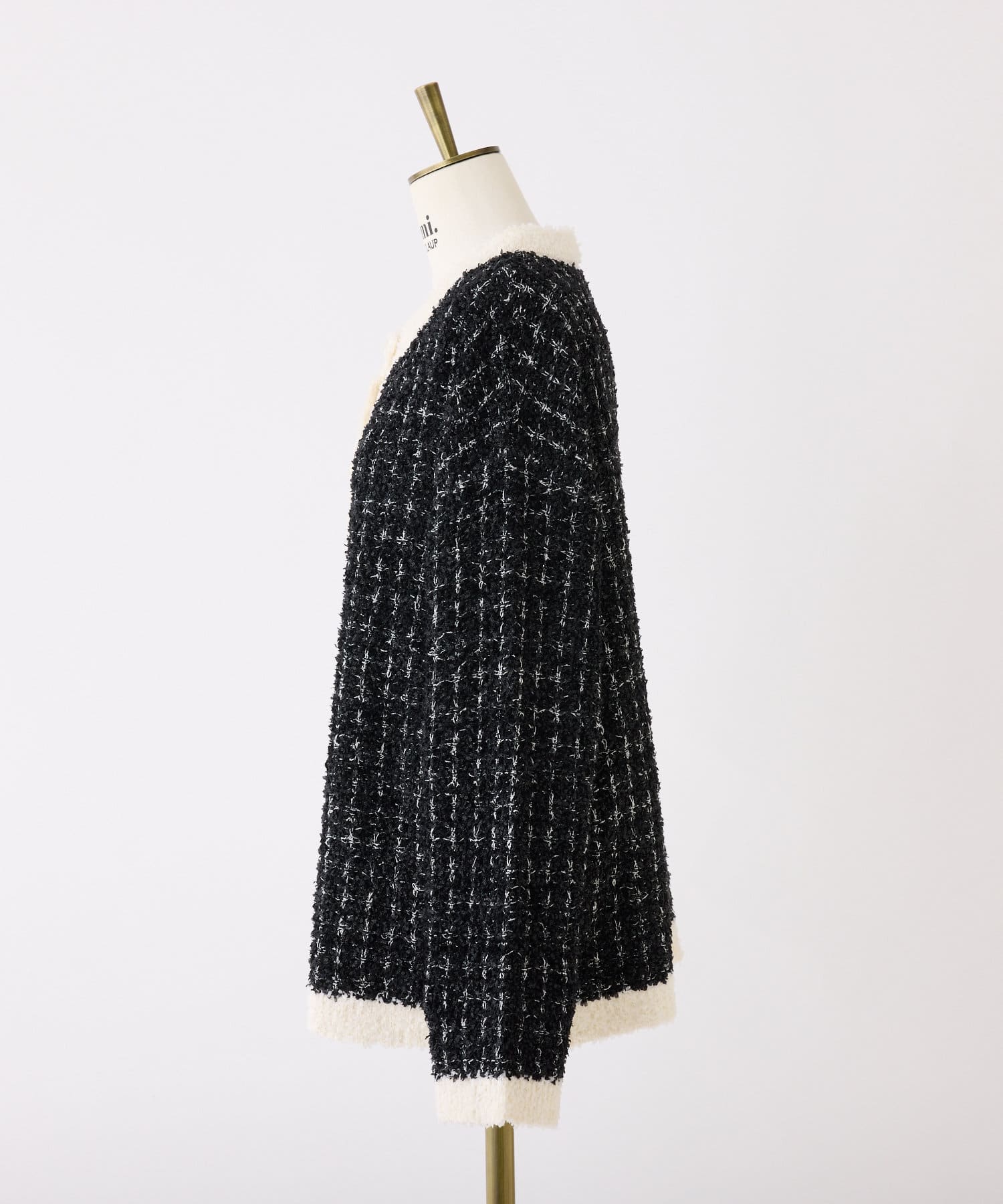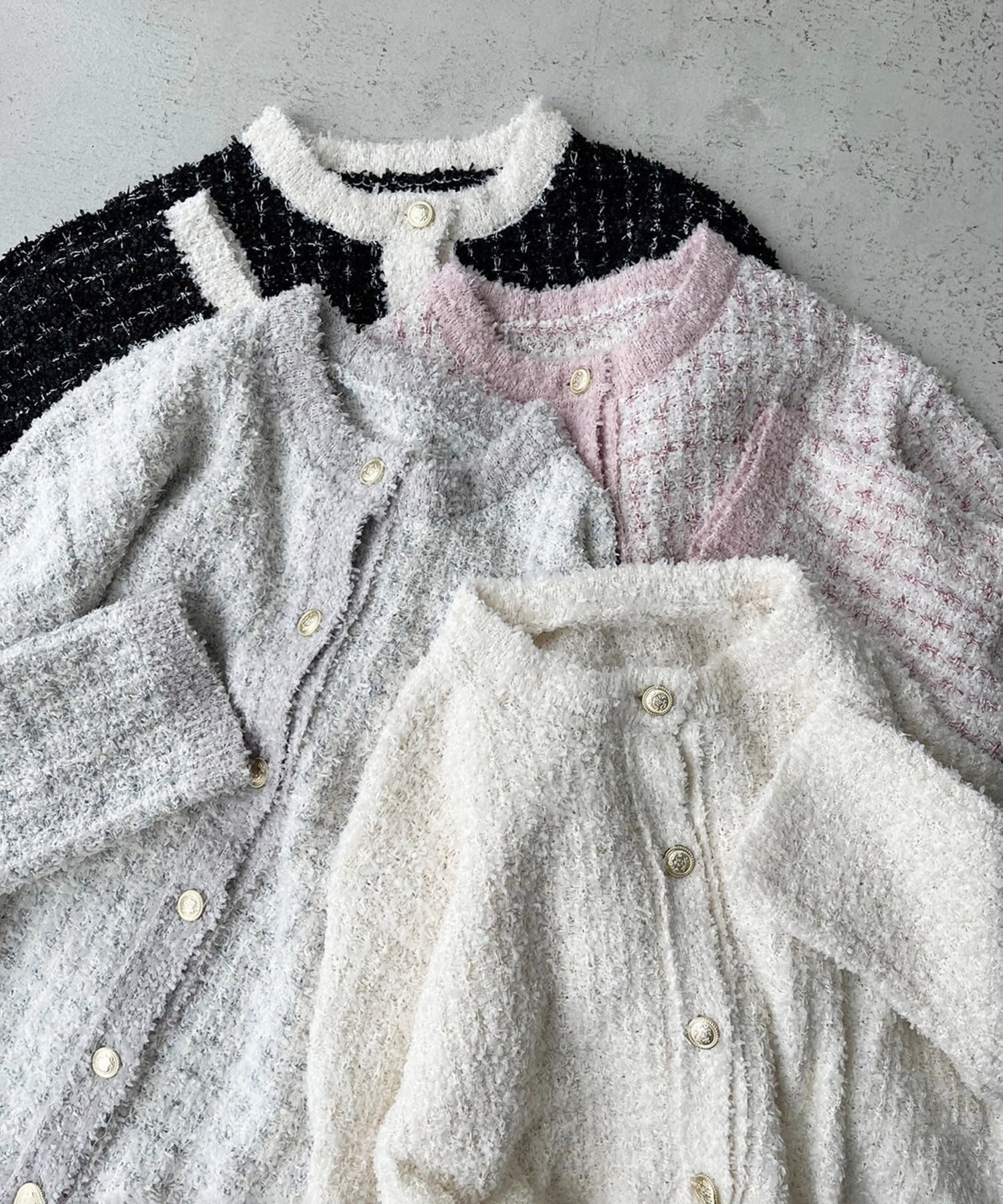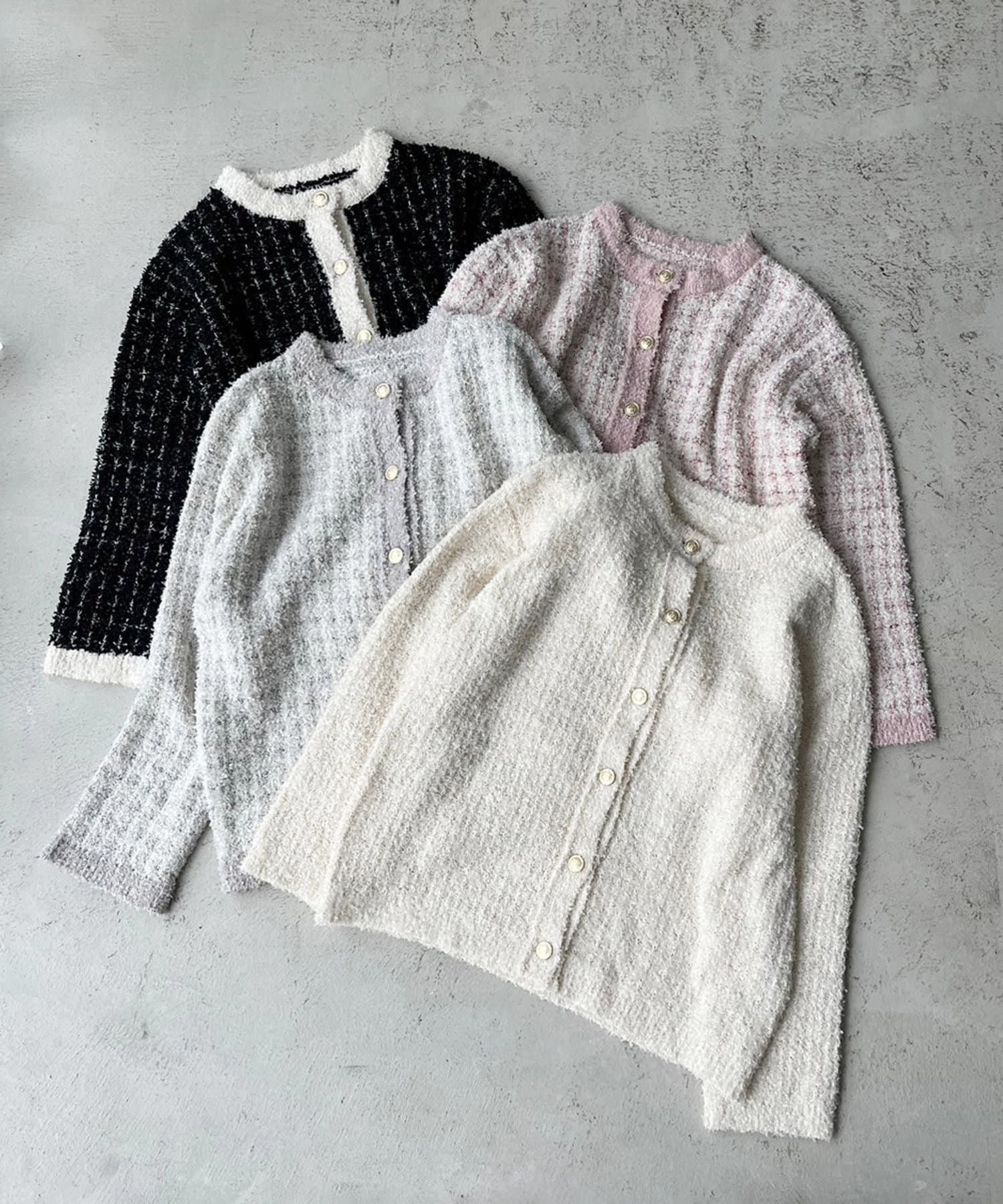 多色の糸を組み合わせて編むことで、立体感と奥行きを出したツイードニットカーディガン。