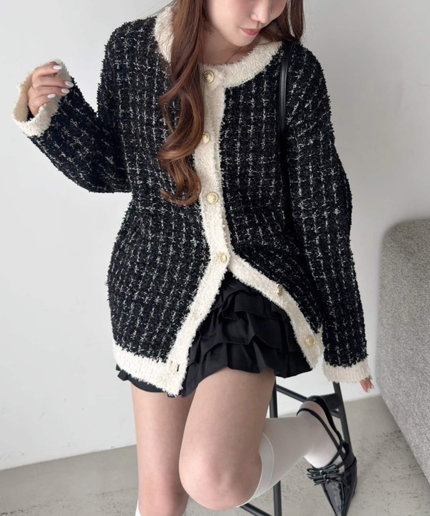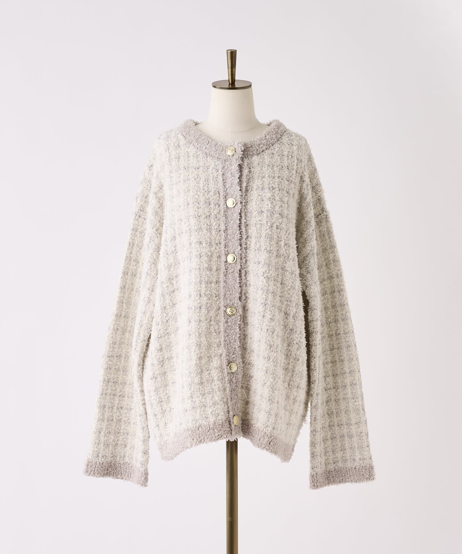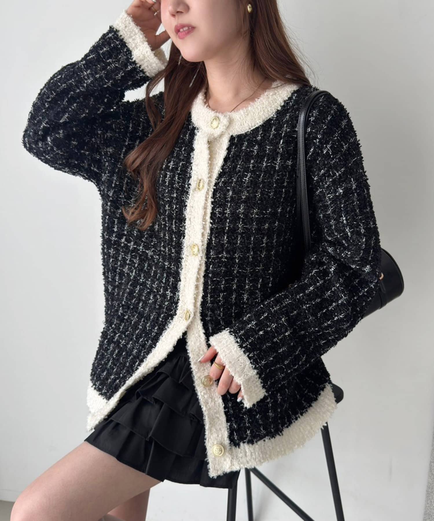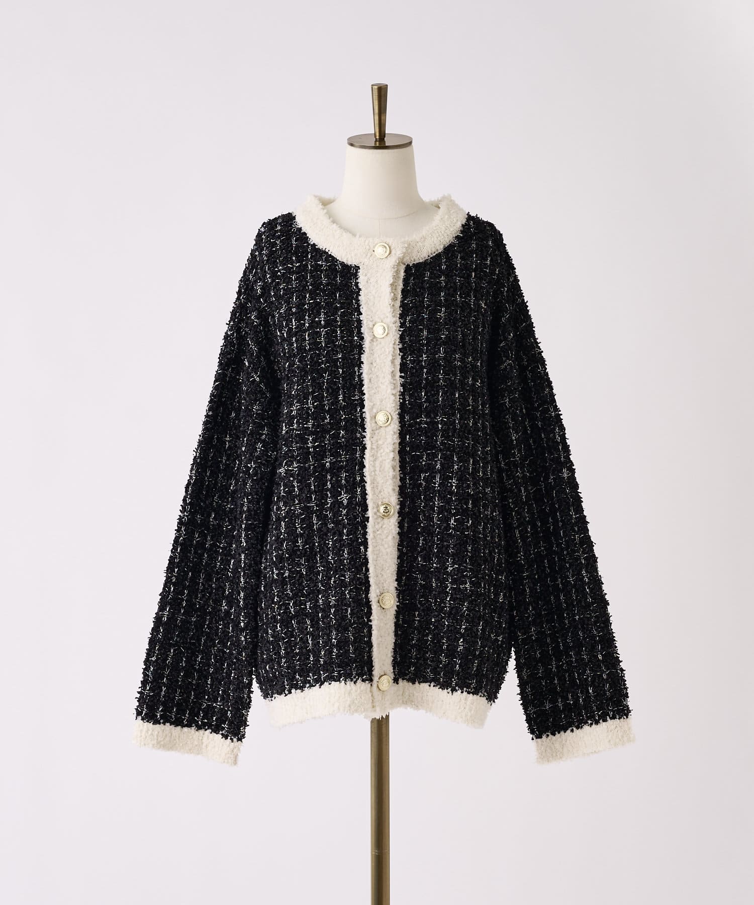 多色の糸を組み合わせて編むことで、立体感と奥行きを出したツイードニットカーディガン。