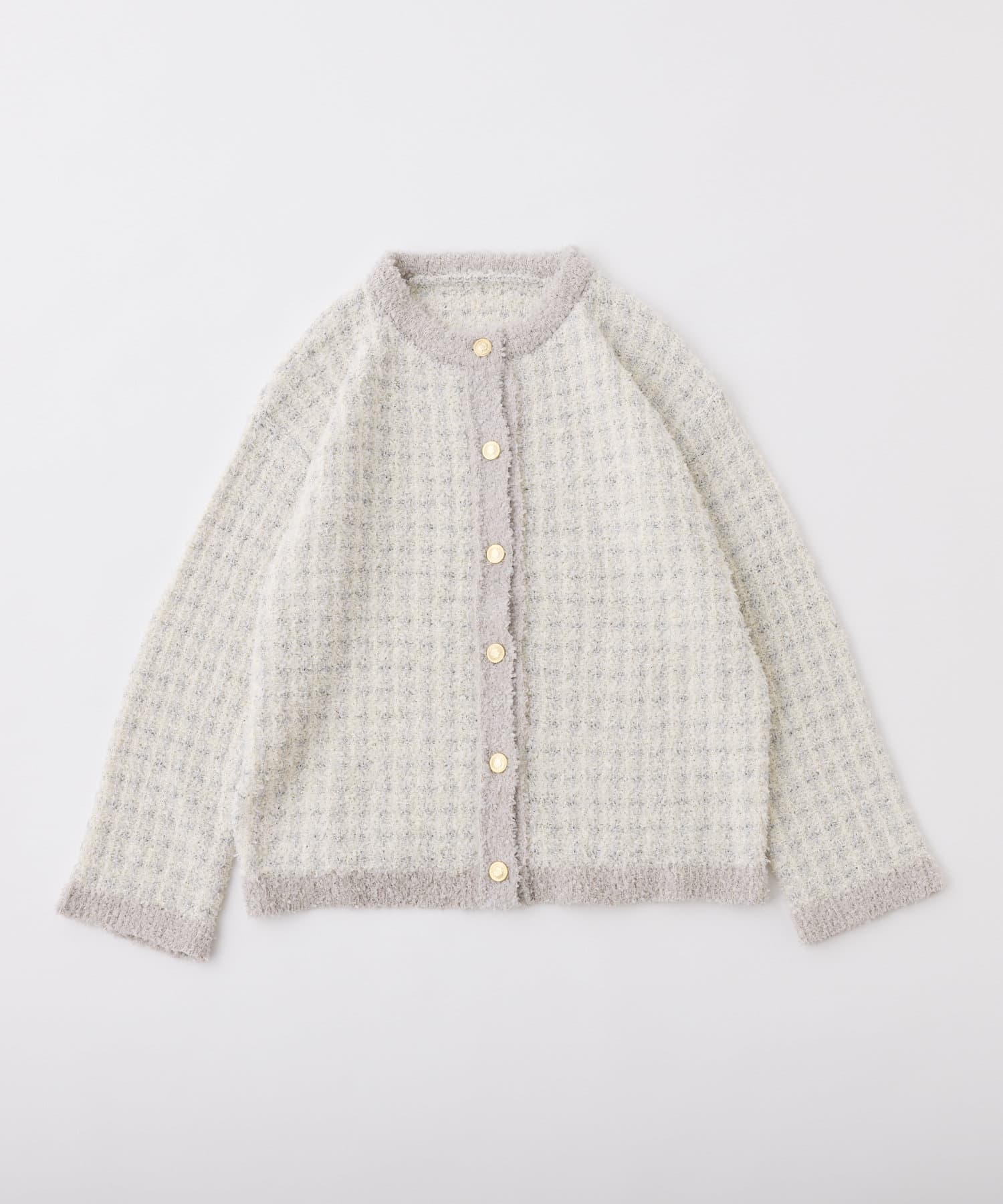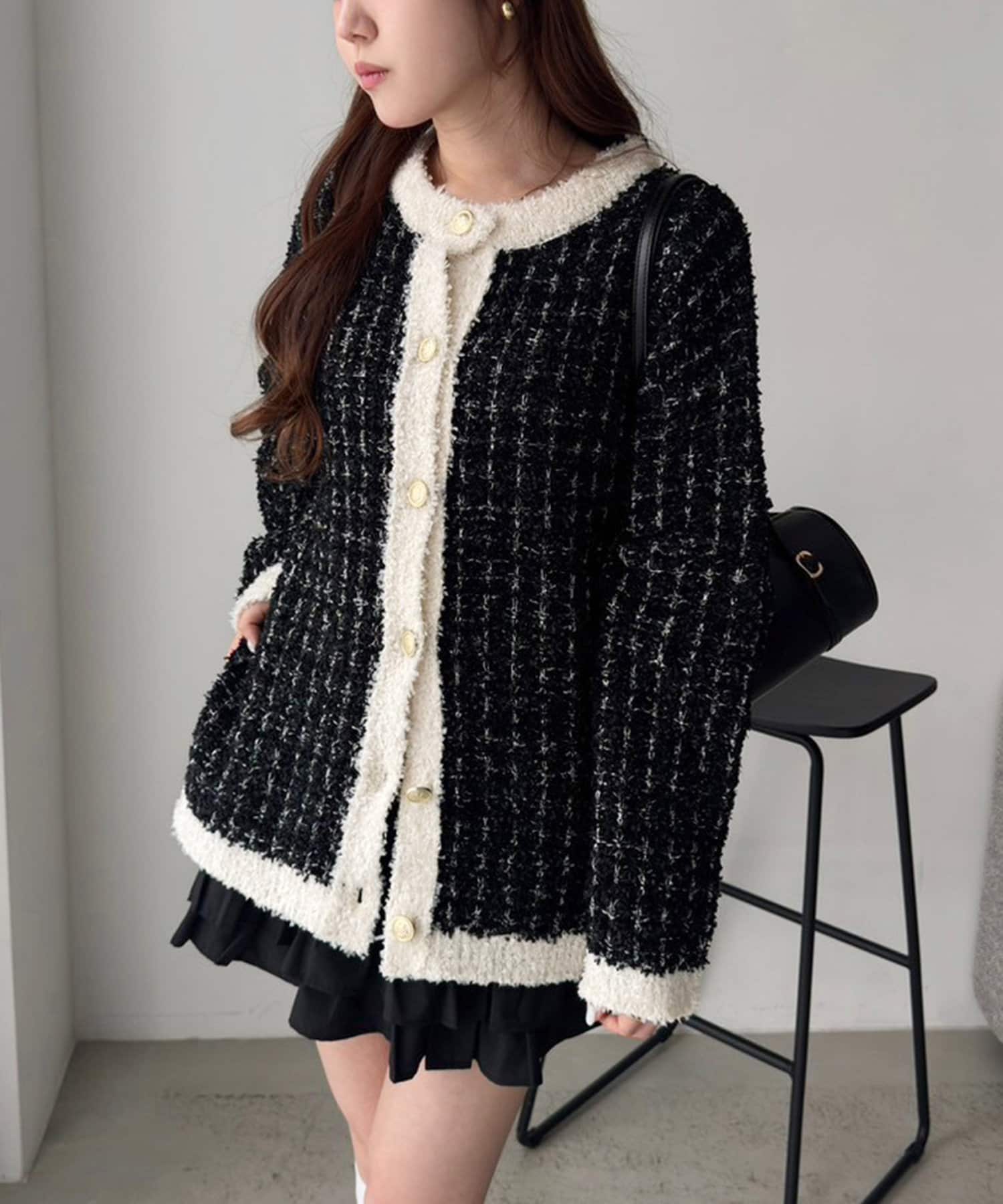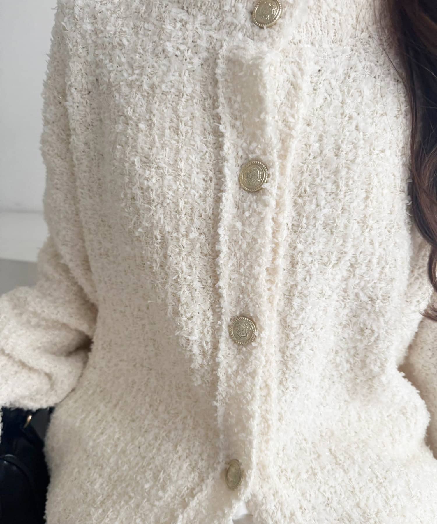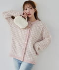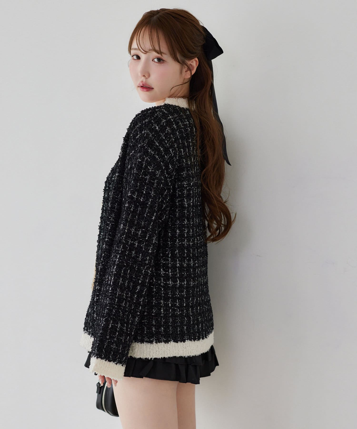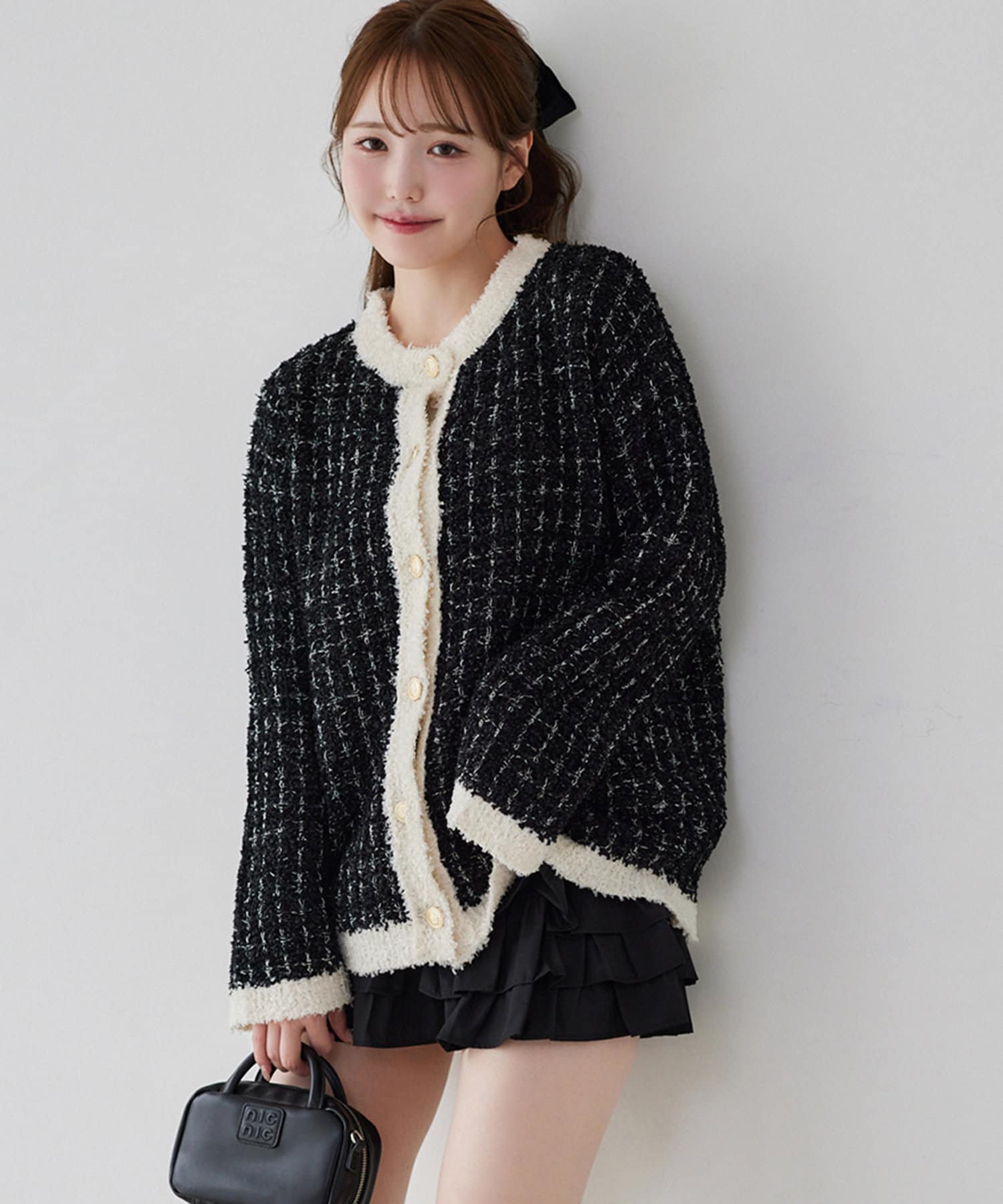 多色の糸を組み合わせて編むことで、立体感と奥行きを出したツイードニットカーディガン。
