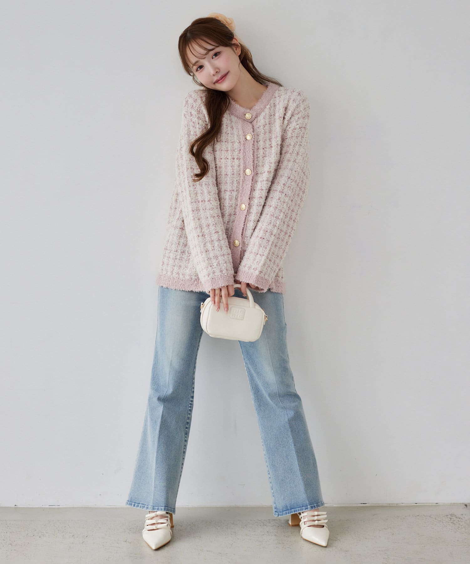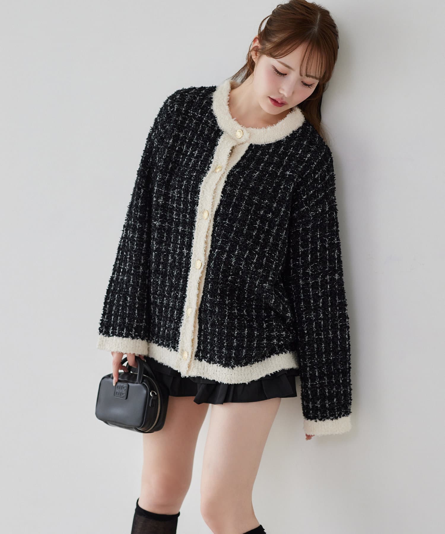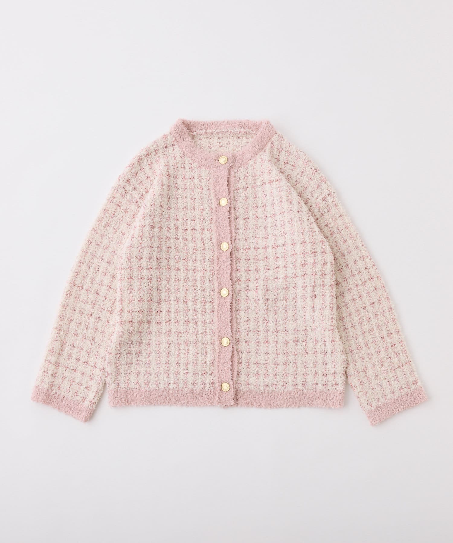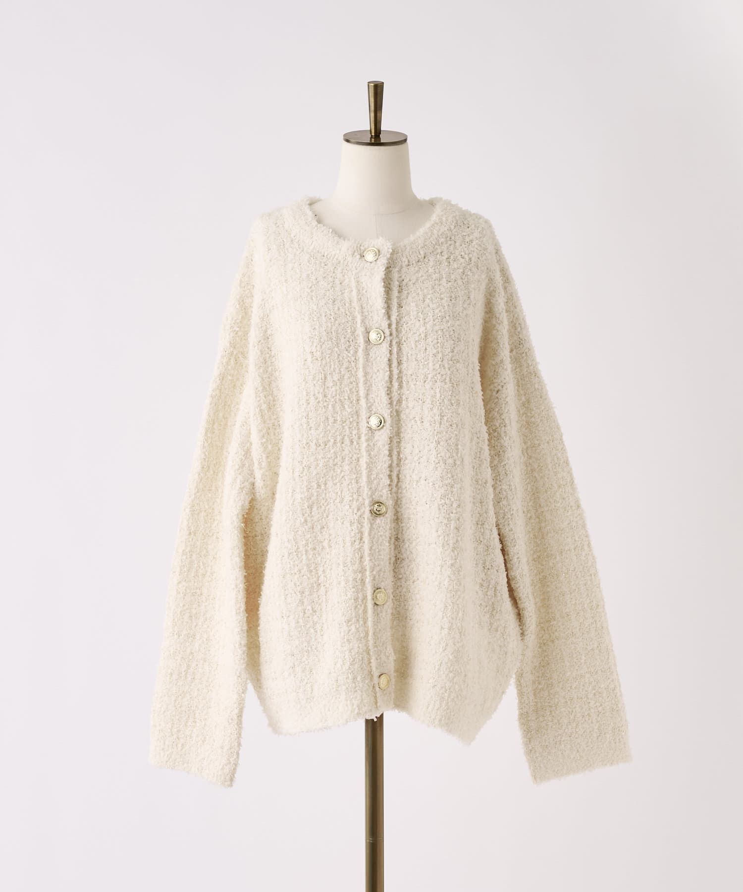 多色の糸を組み合わせて編むことで、立体感と奥行きを出したツイードニットカーディガン。