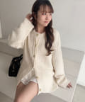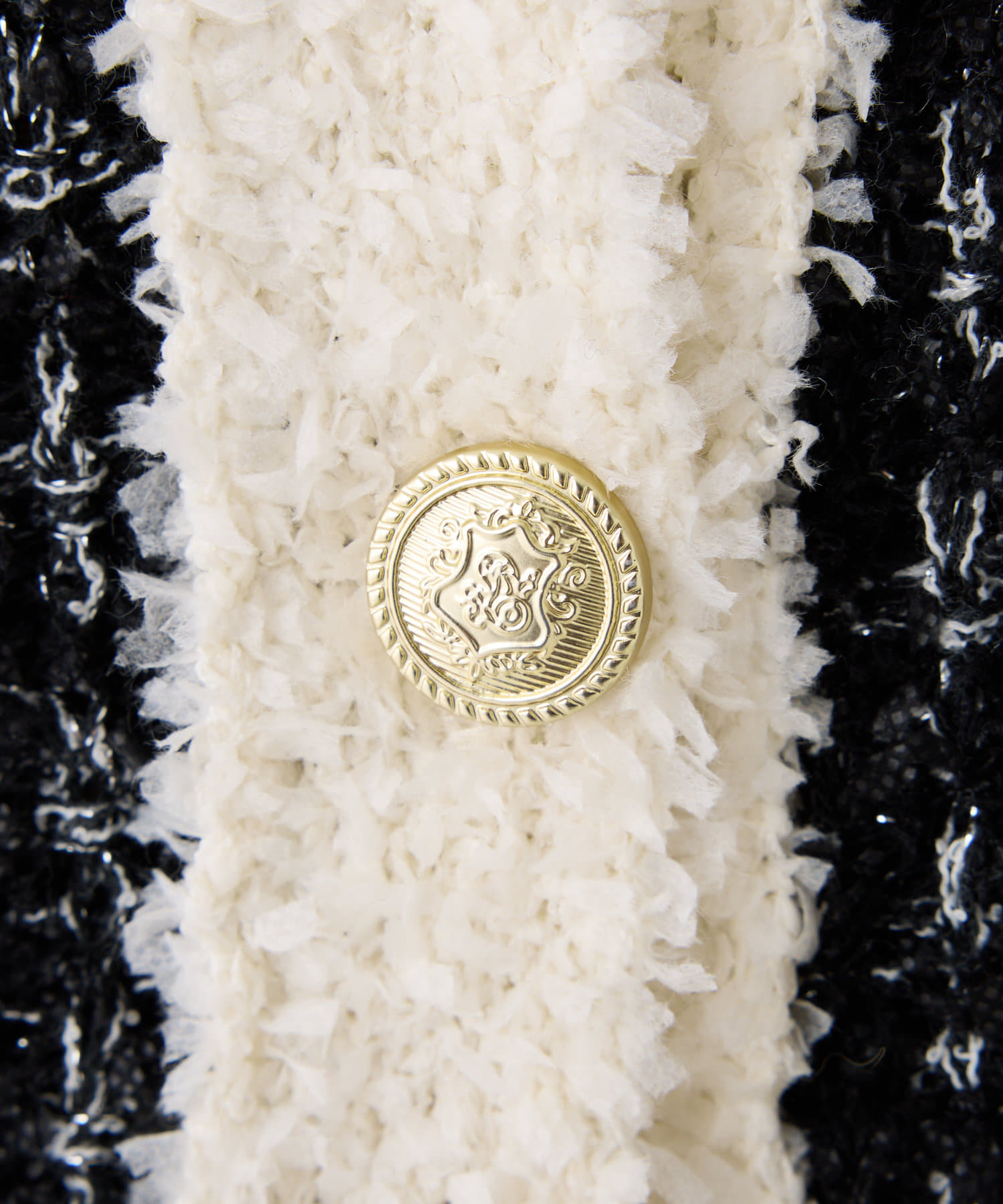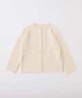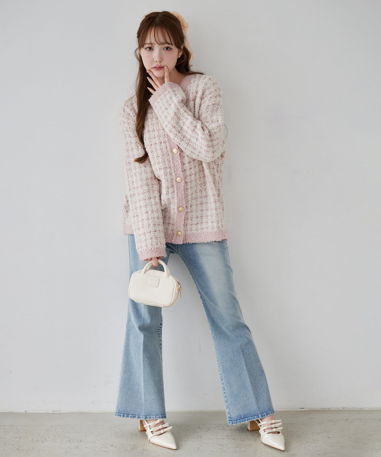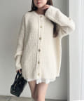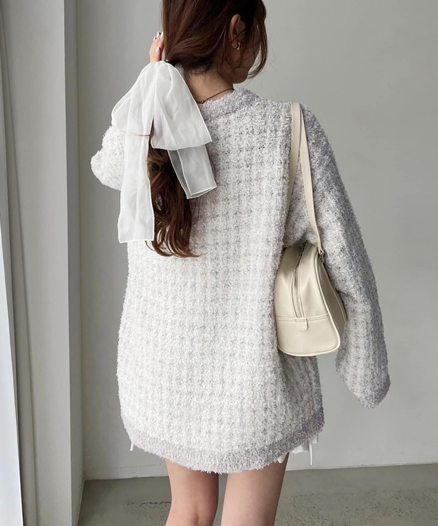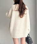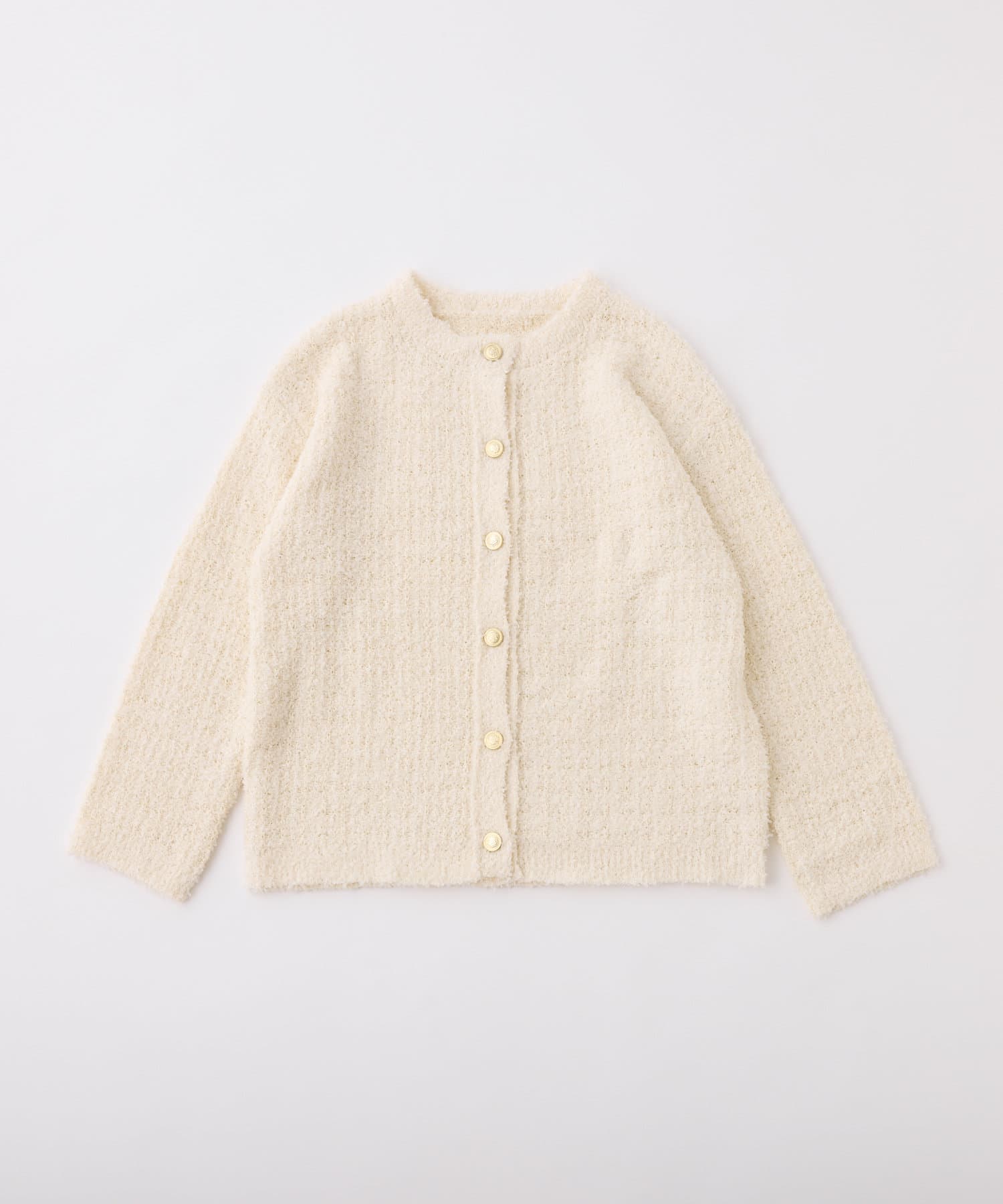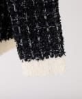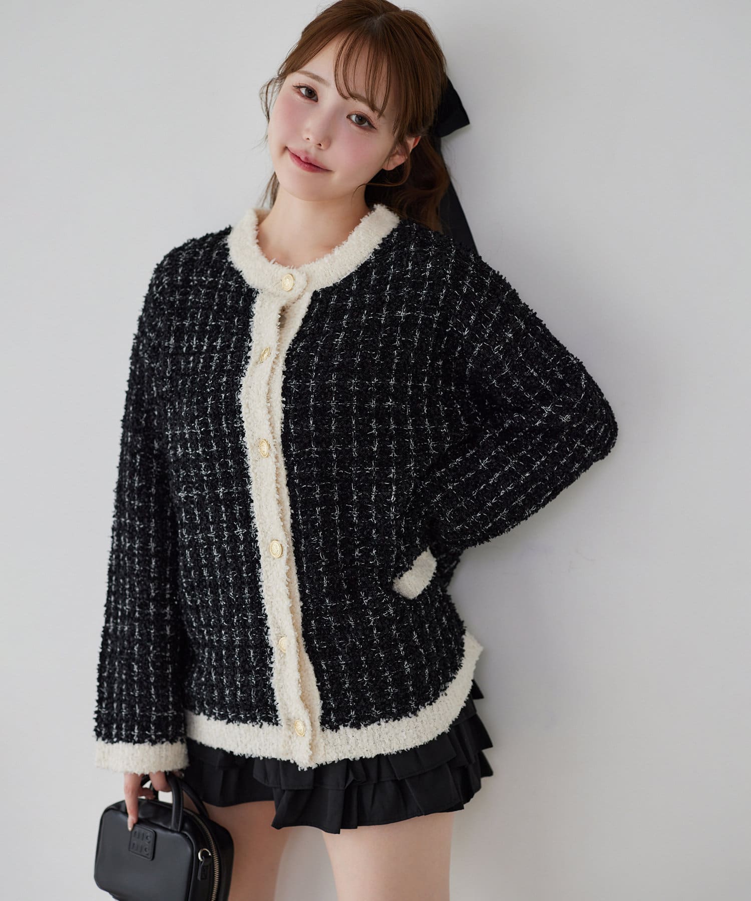 多色の糸を組み合わせて編むことで、立体感と奥行きを出したツイードニットカーディガン。