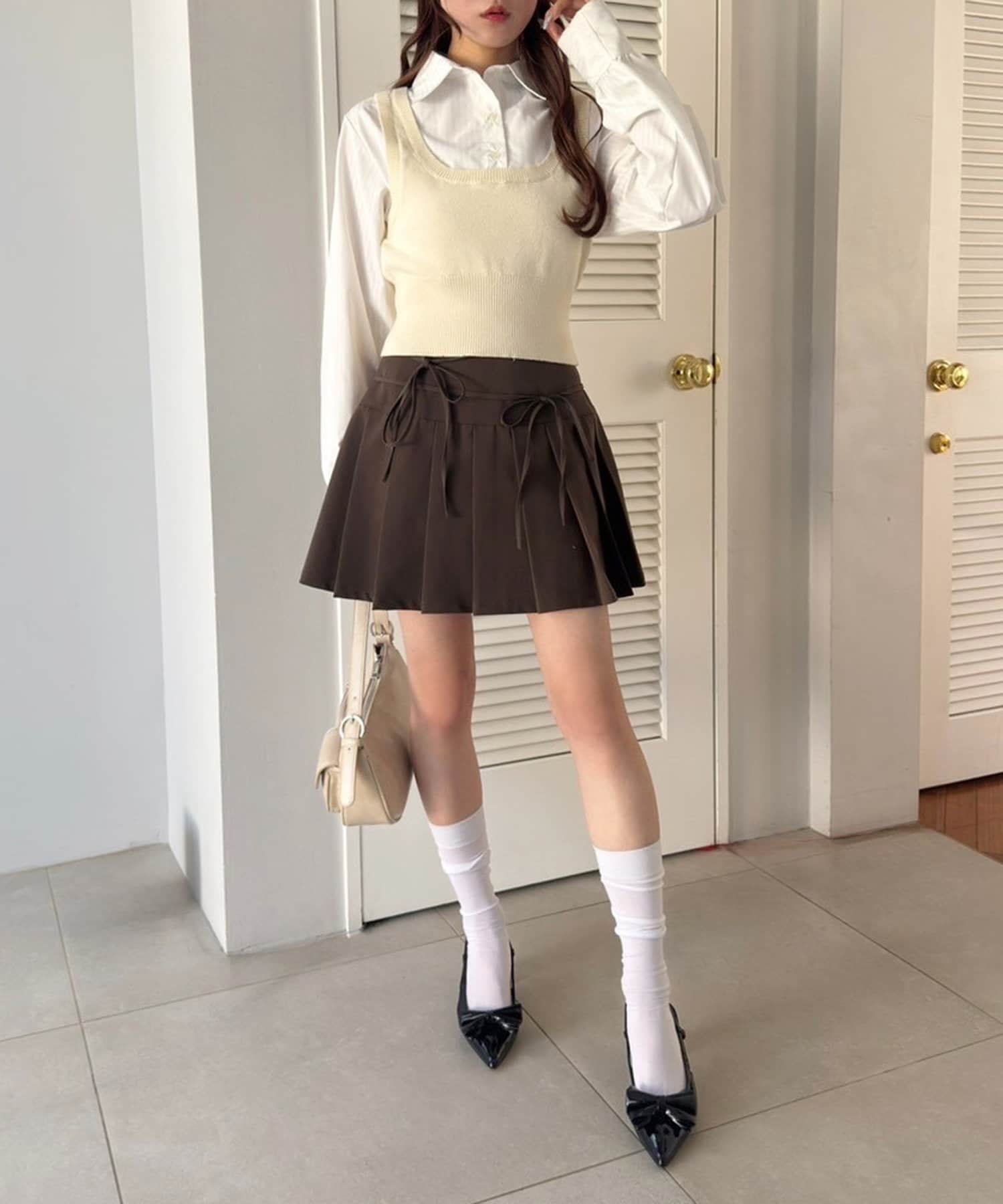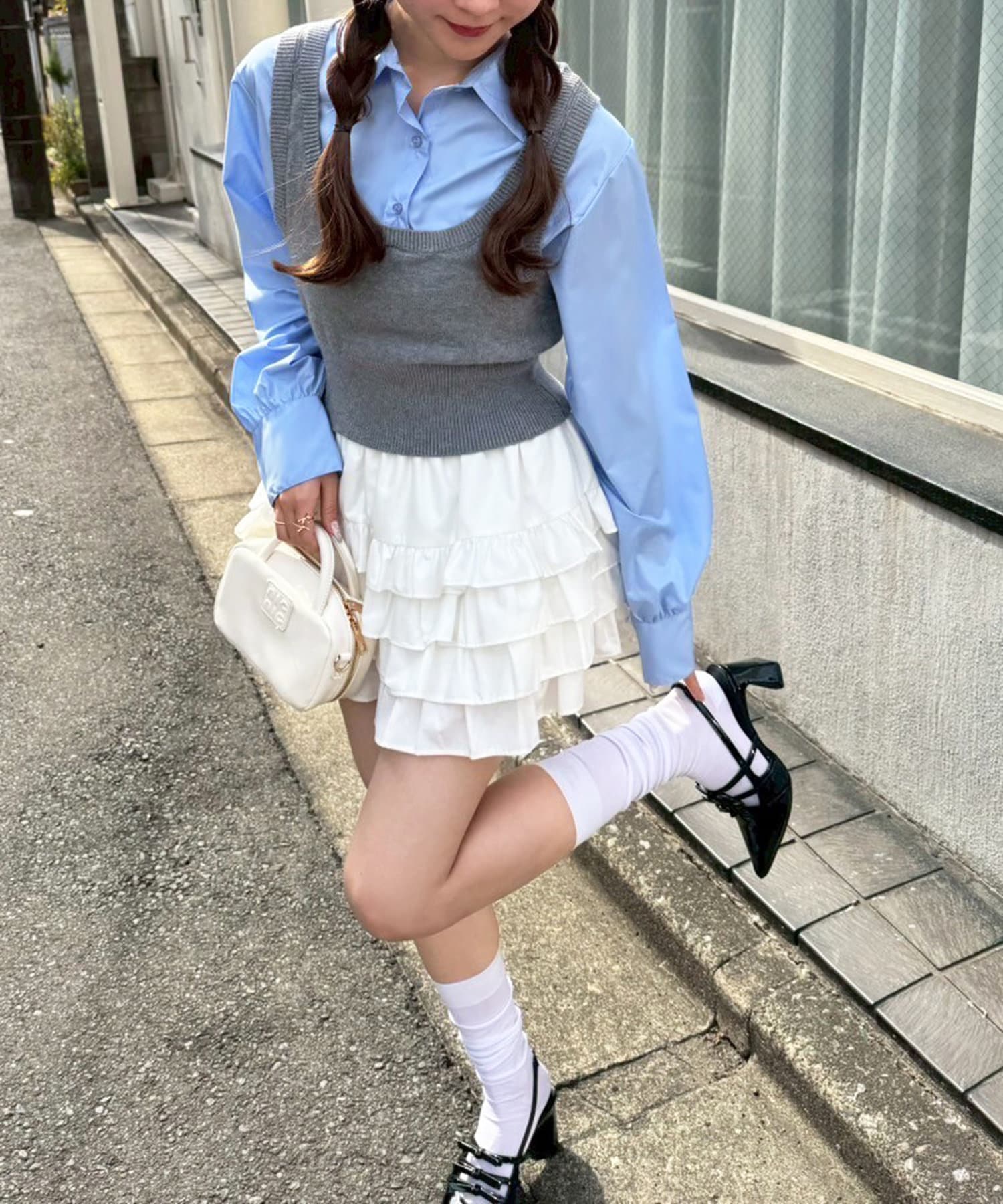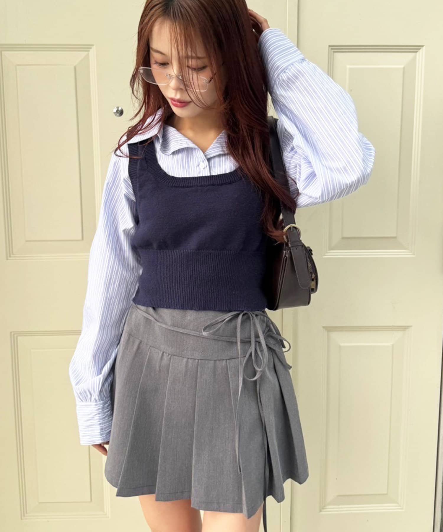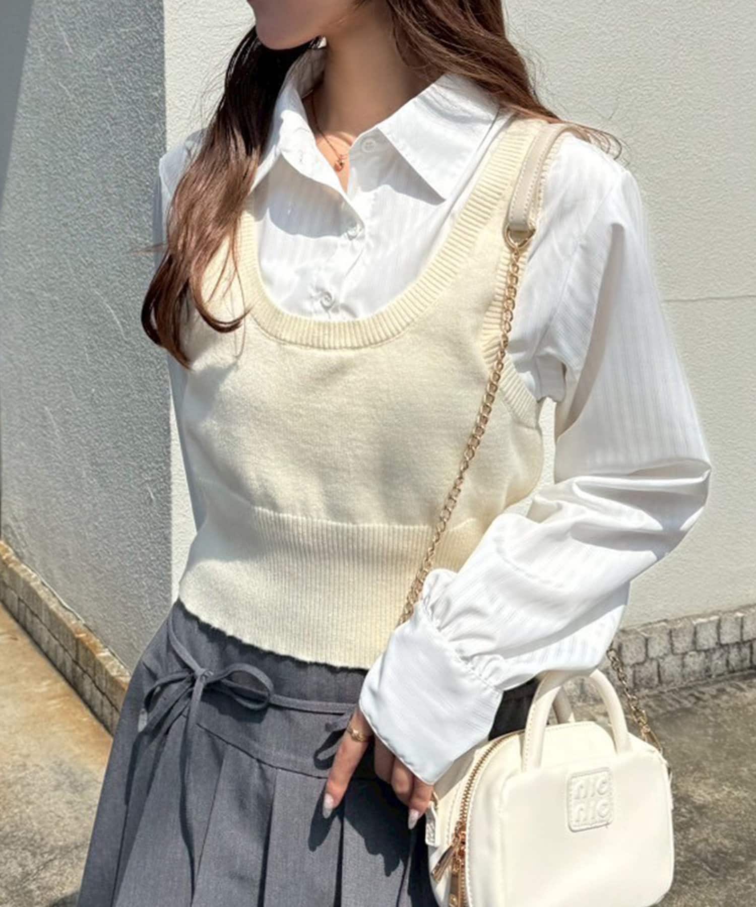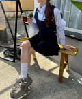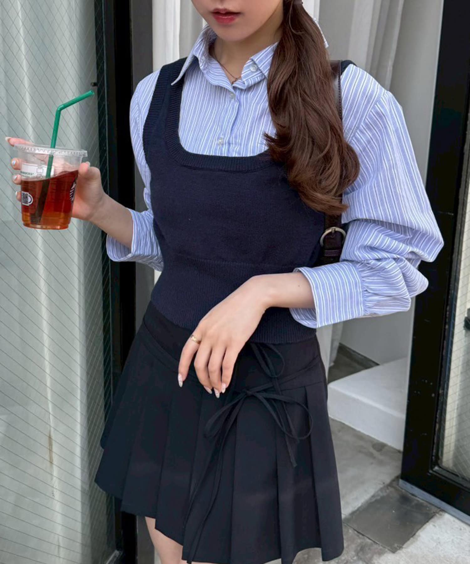 プリーツスカートやタイトスカートと組み合わせると、プレッピーファッションのような印象に。