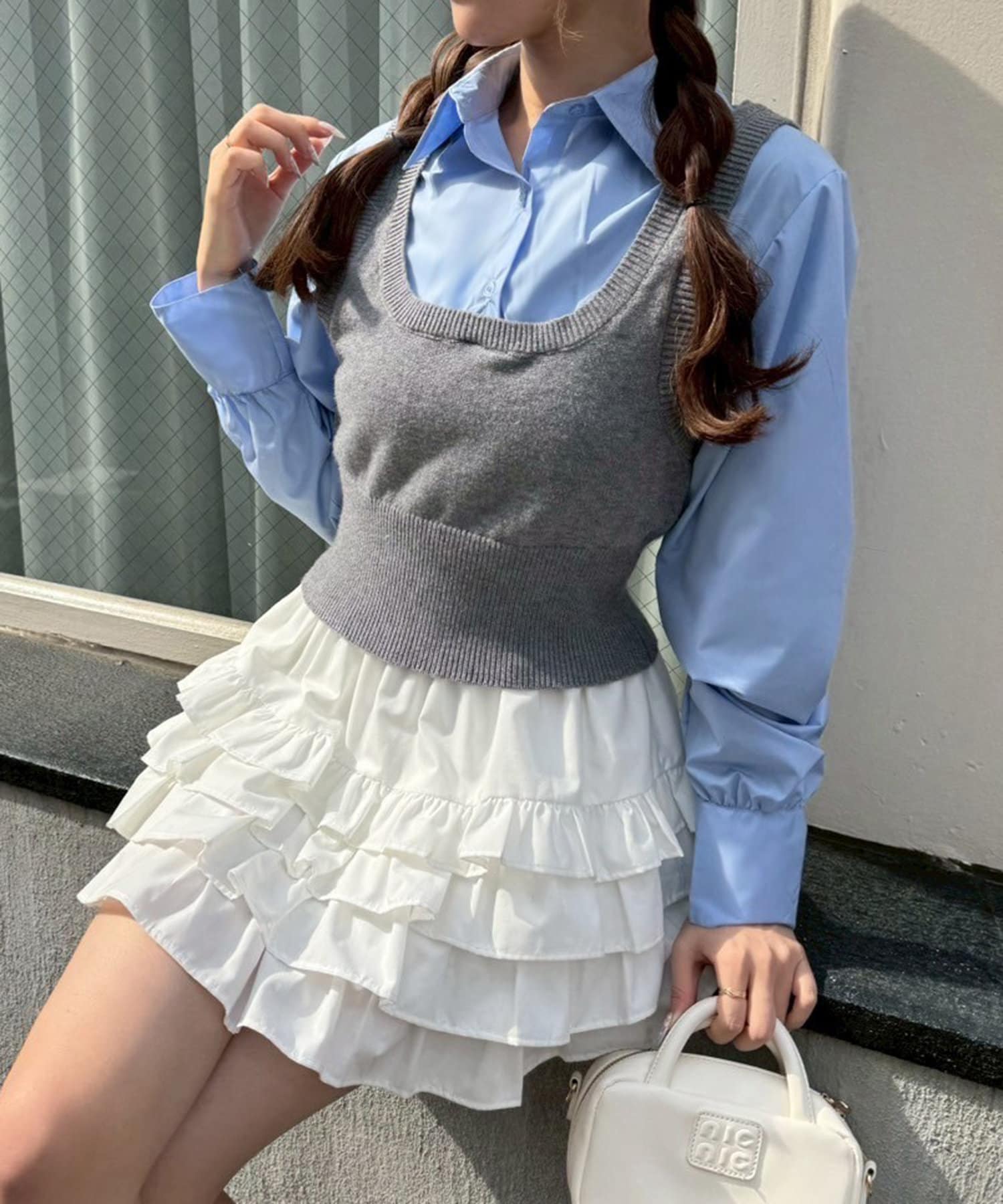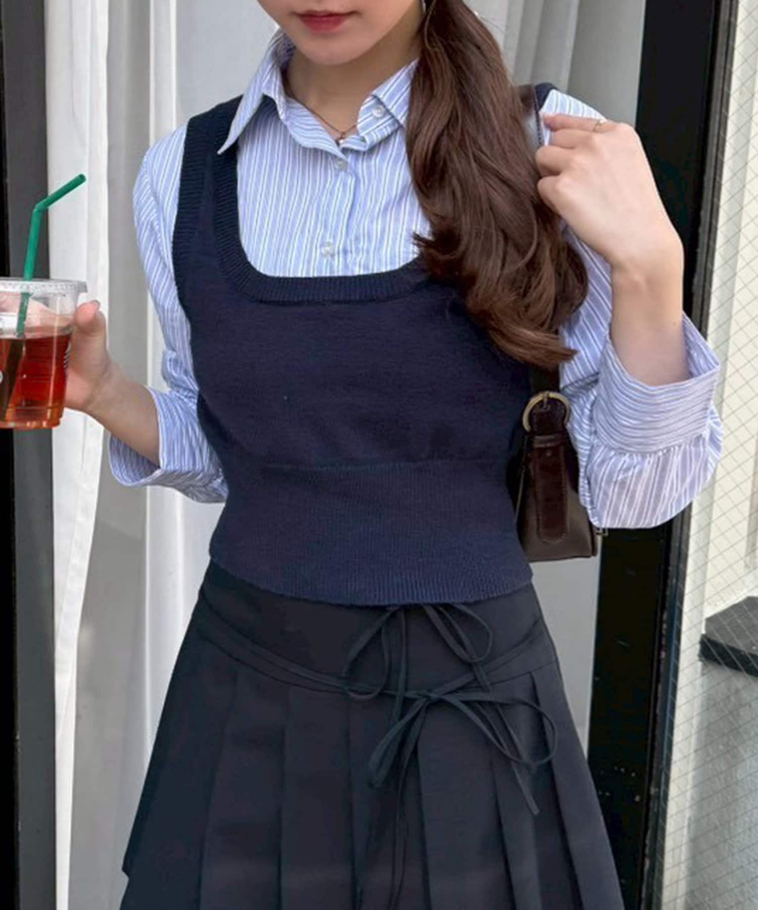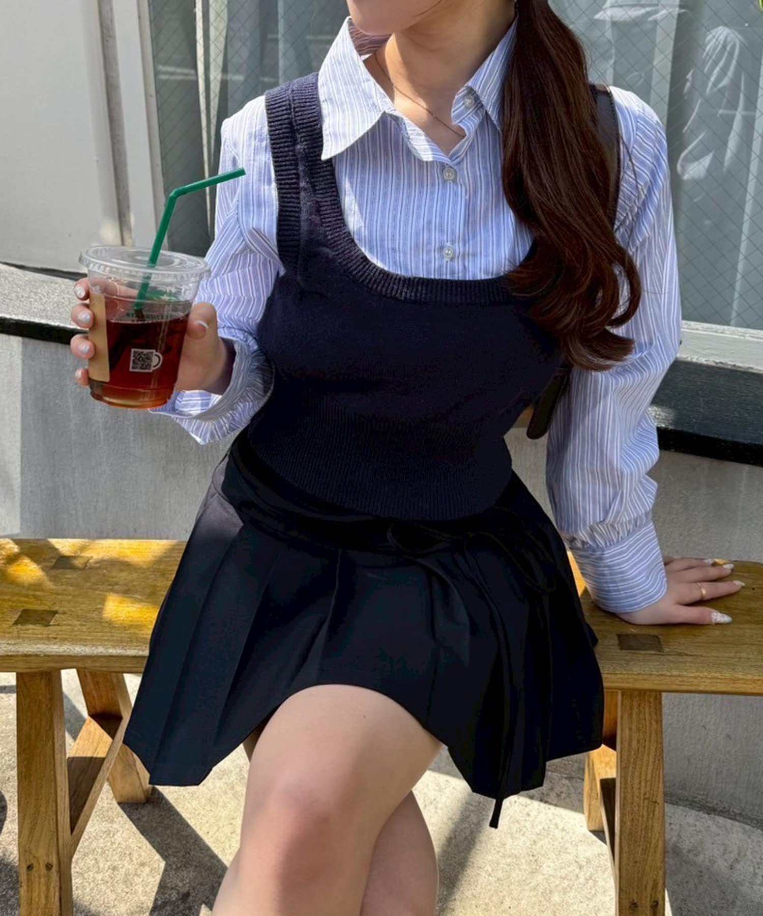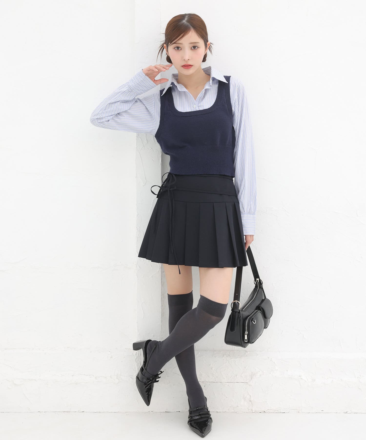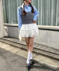 プリーツスカートやタイトスカートと組み合わせると、プレッピーファッションのような印象に。