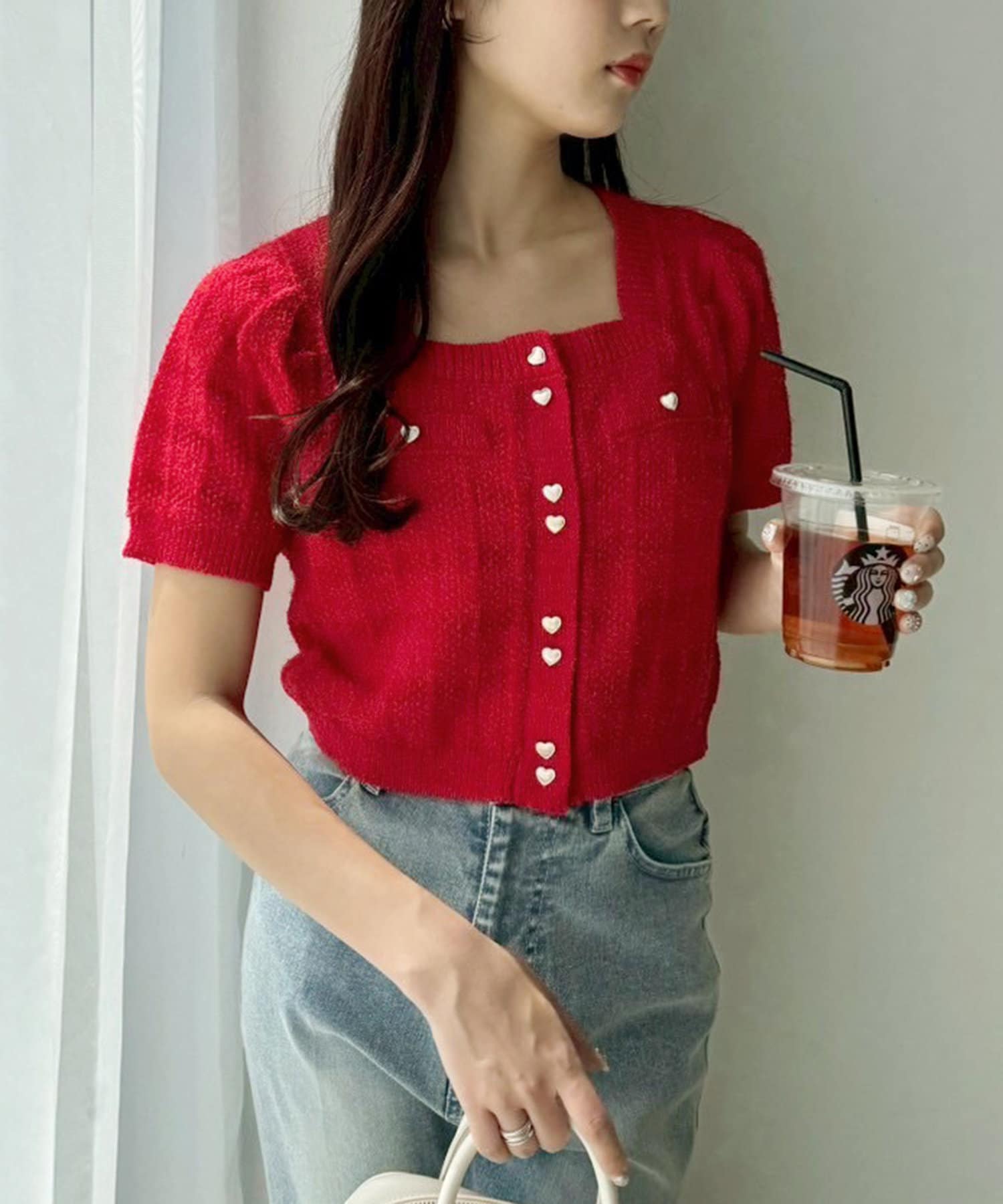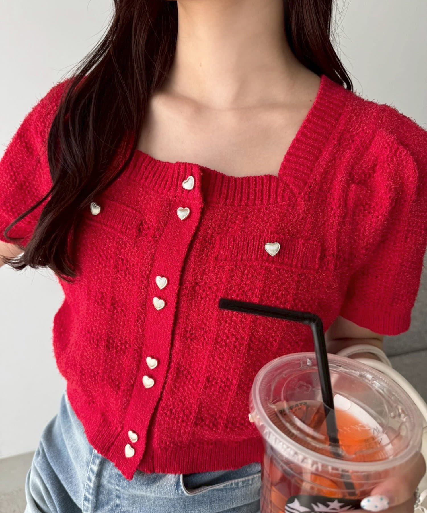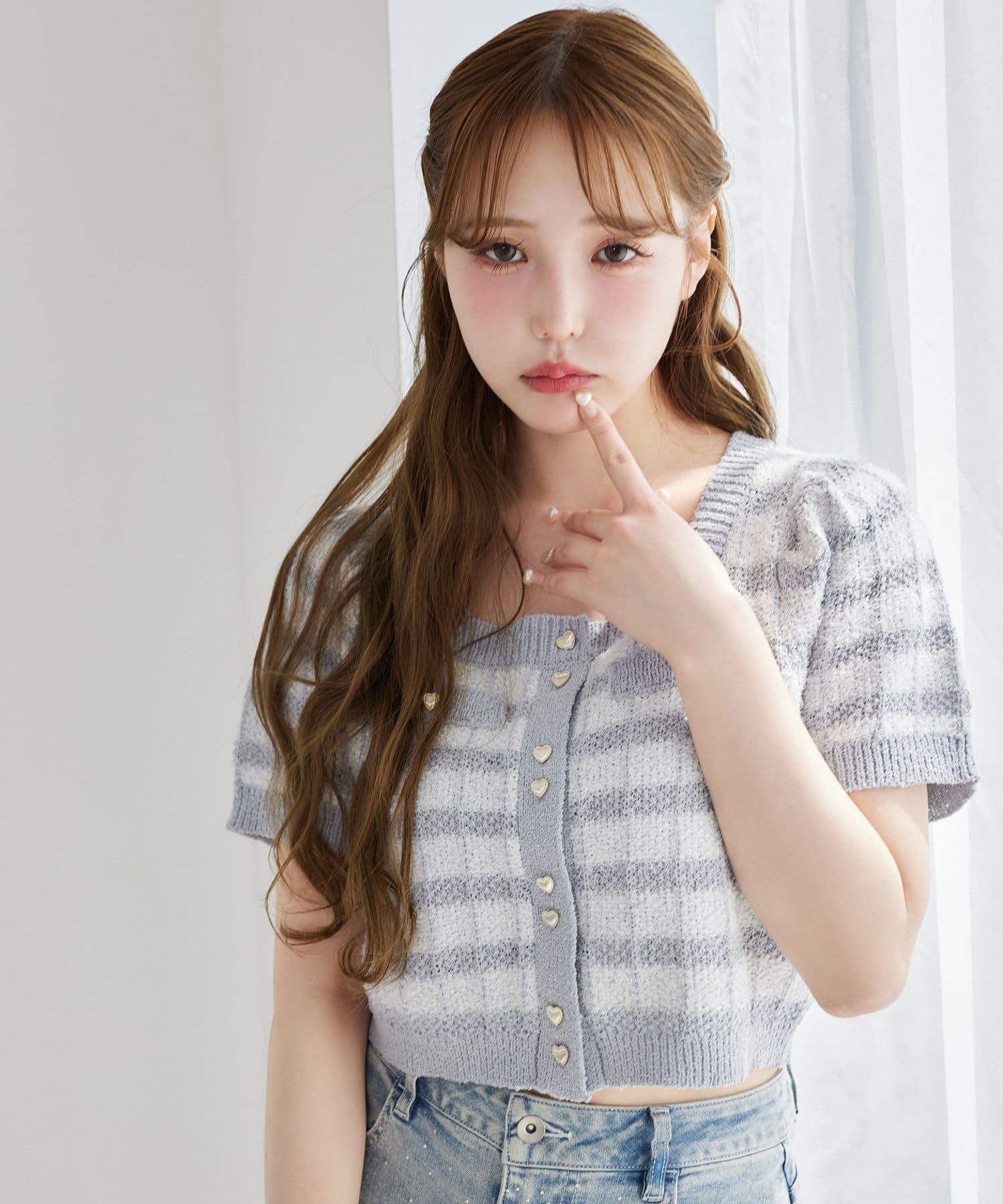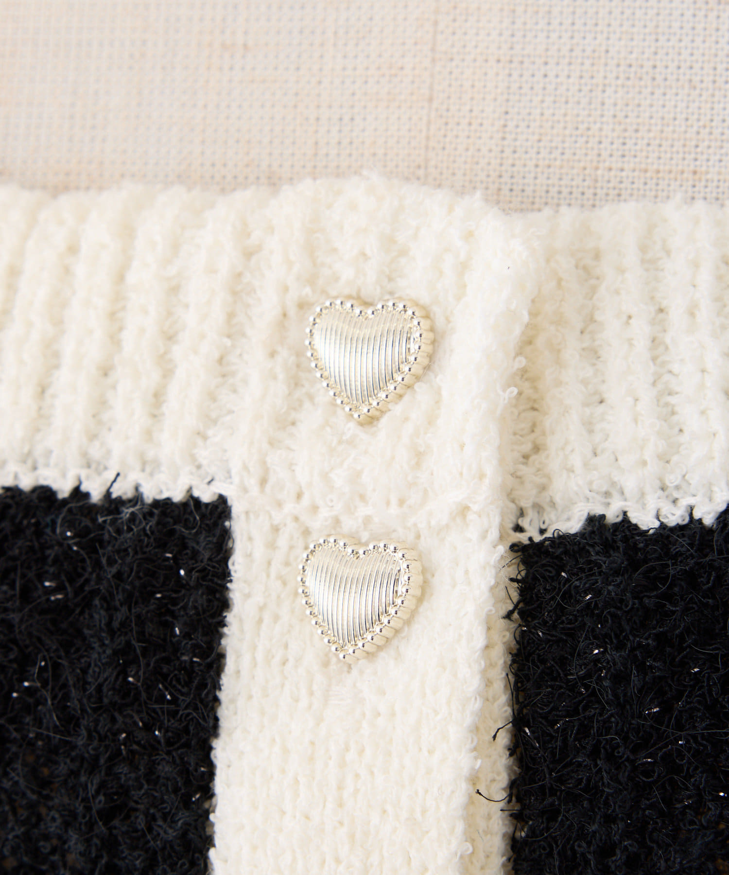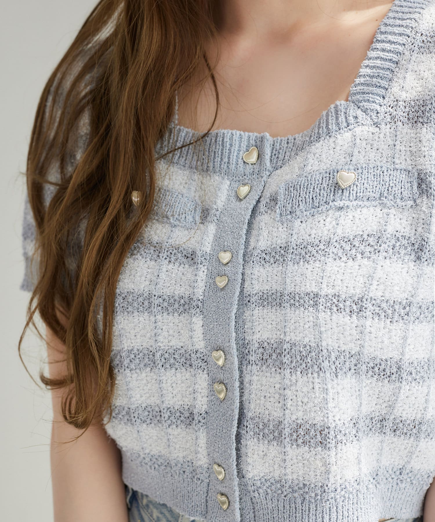 ハート型のボタンがポイントの、ガーリーなチェック柄ニットカーディガン。