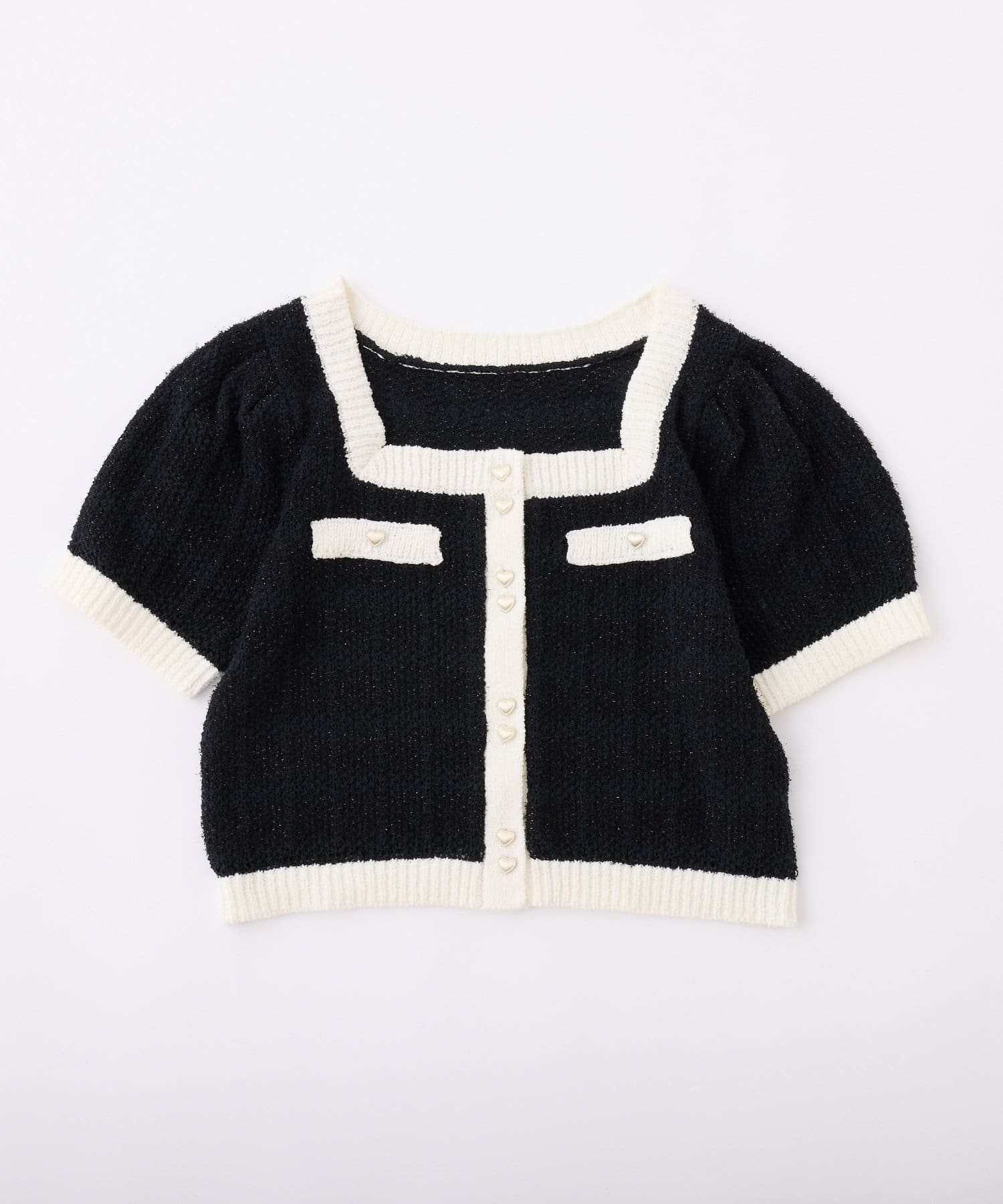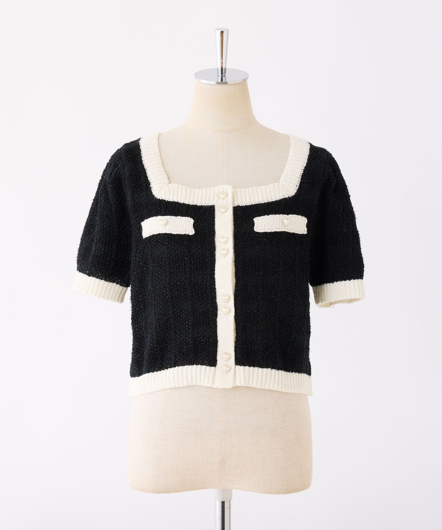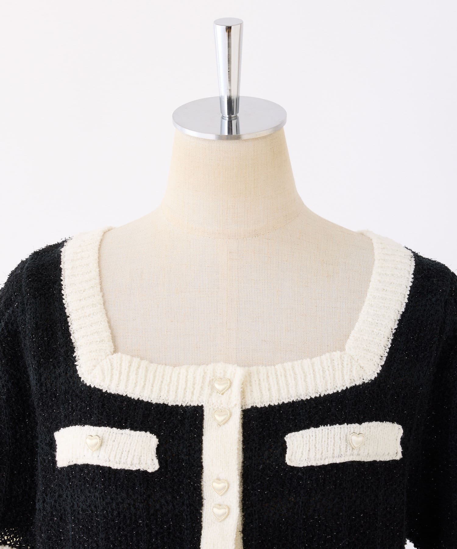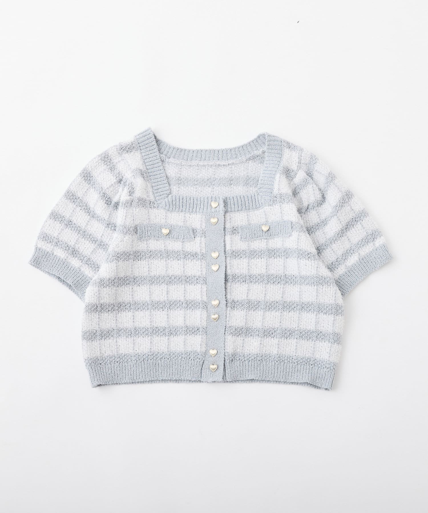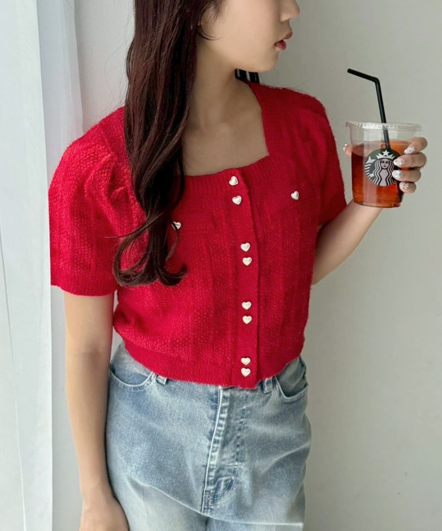 ハート型のボタンがポイントの、ガーリーなチェック柄ニットカーディガン。