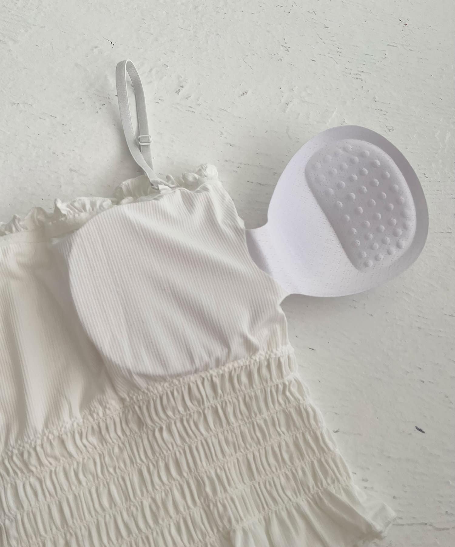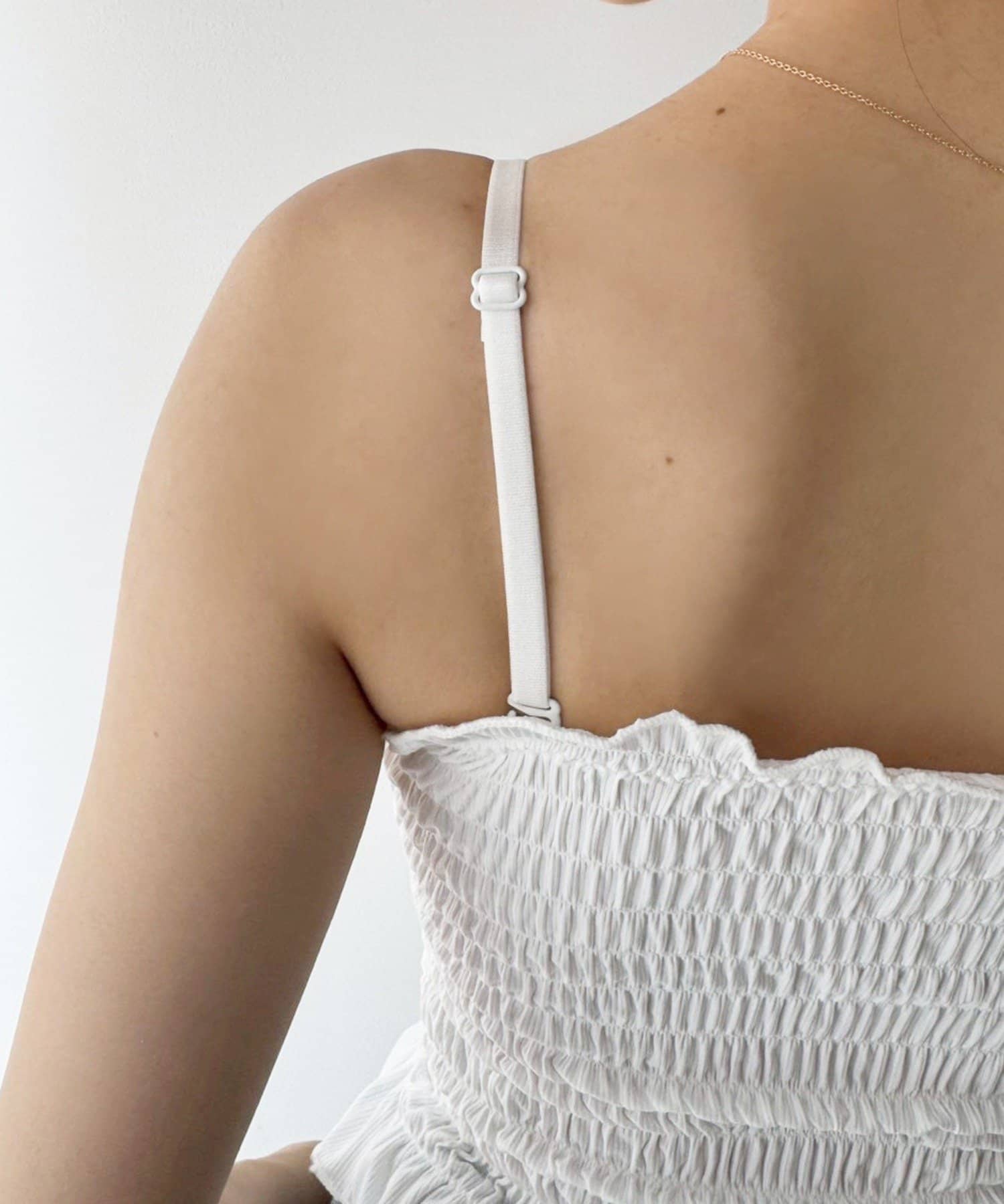 細めの紐がデコルテをきれいに見せ、上品な印象に仕上がるので、