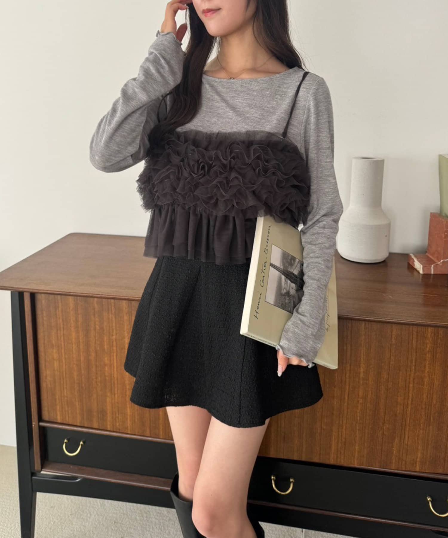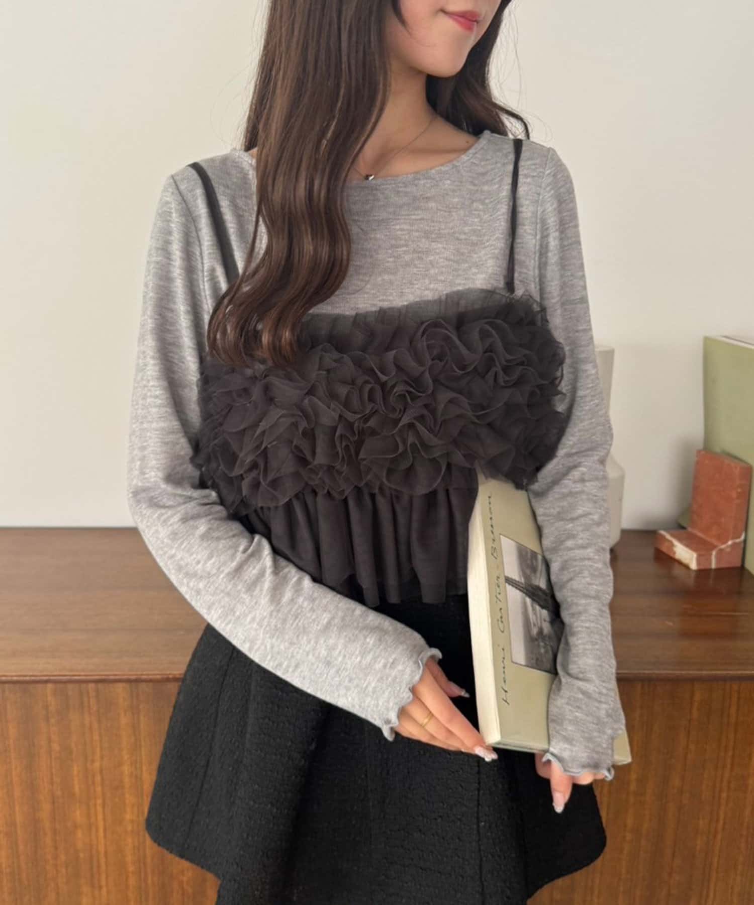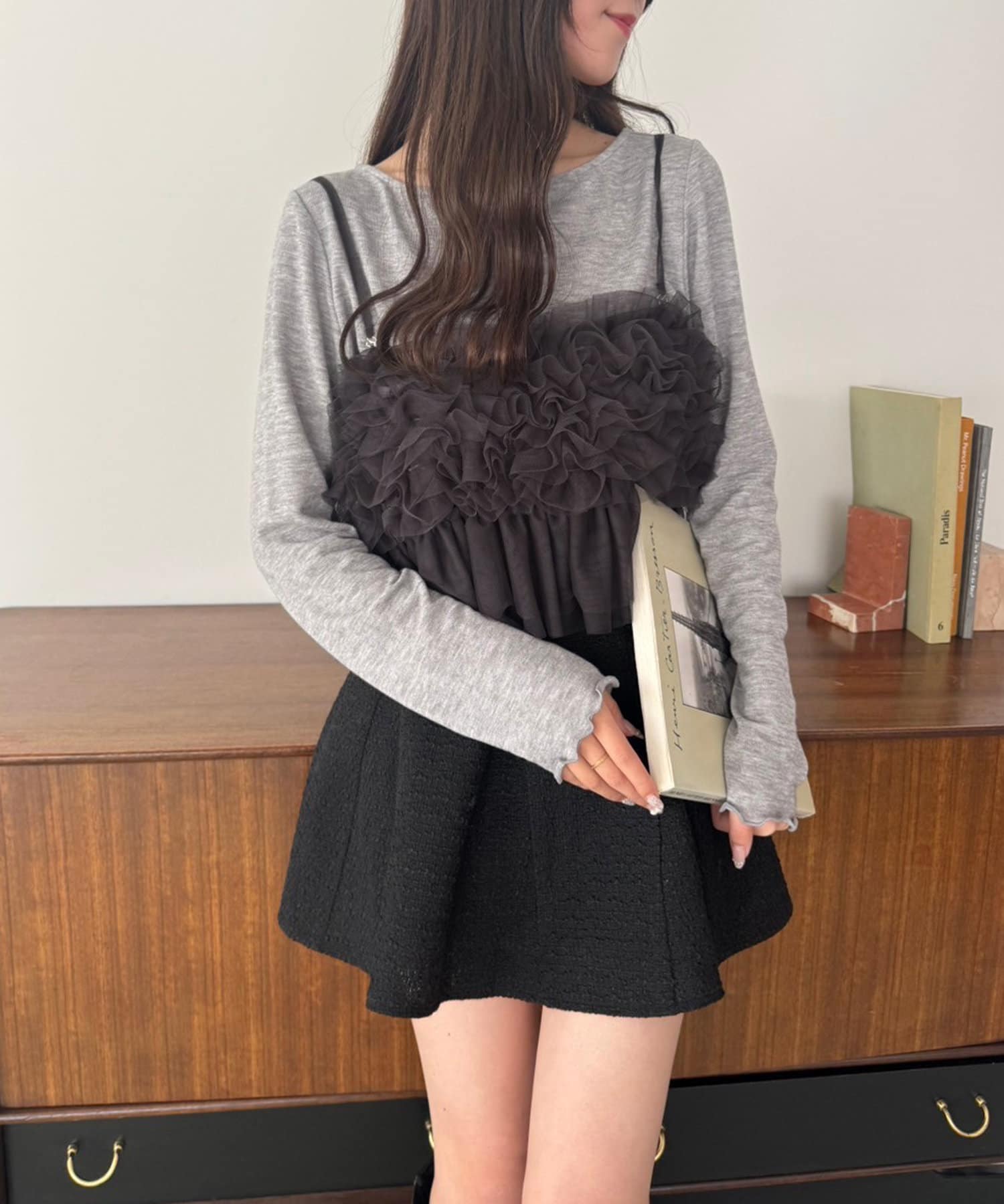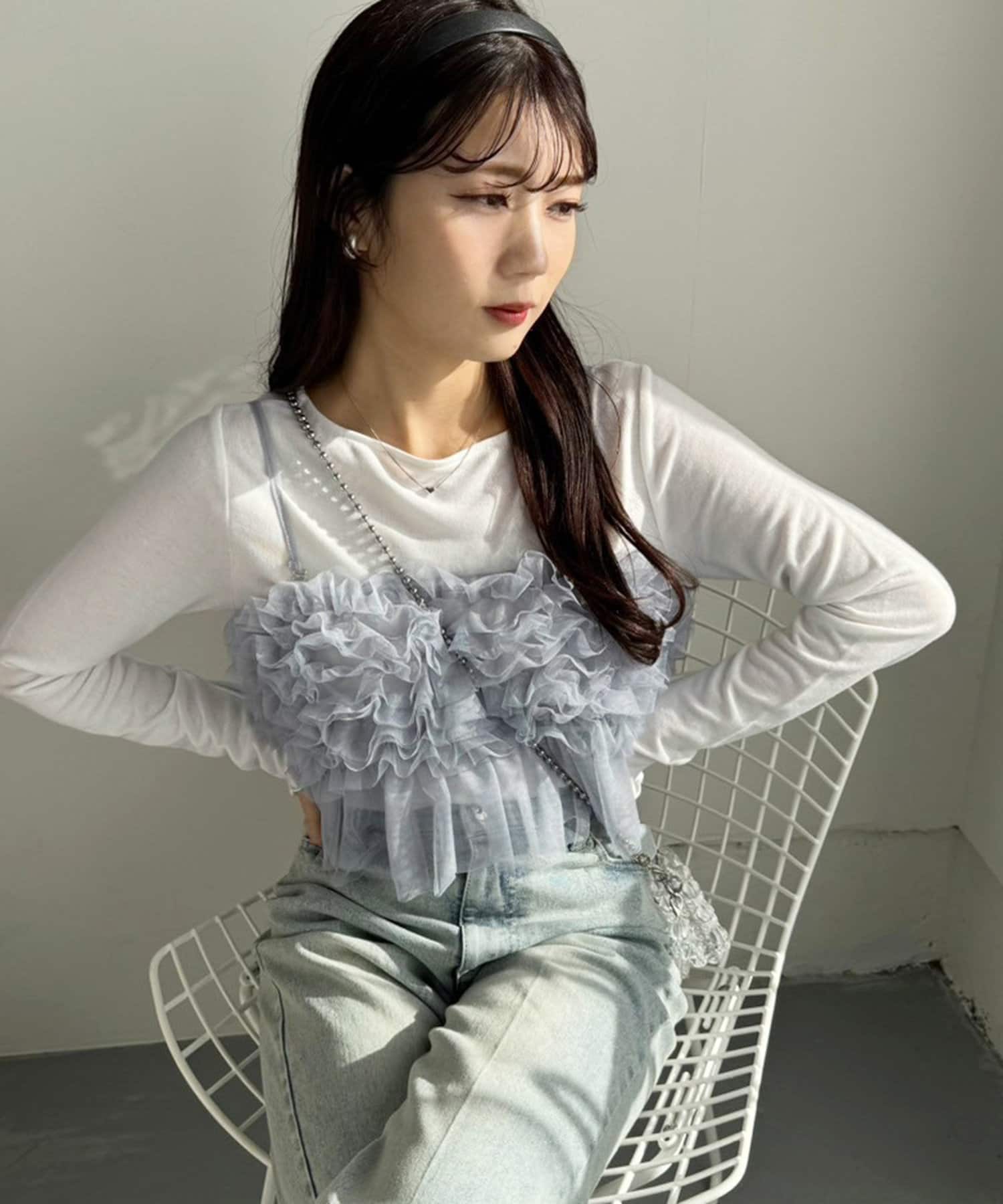 フリルたっぷりのビスチェはシンプルなトップスと重ねるだけで