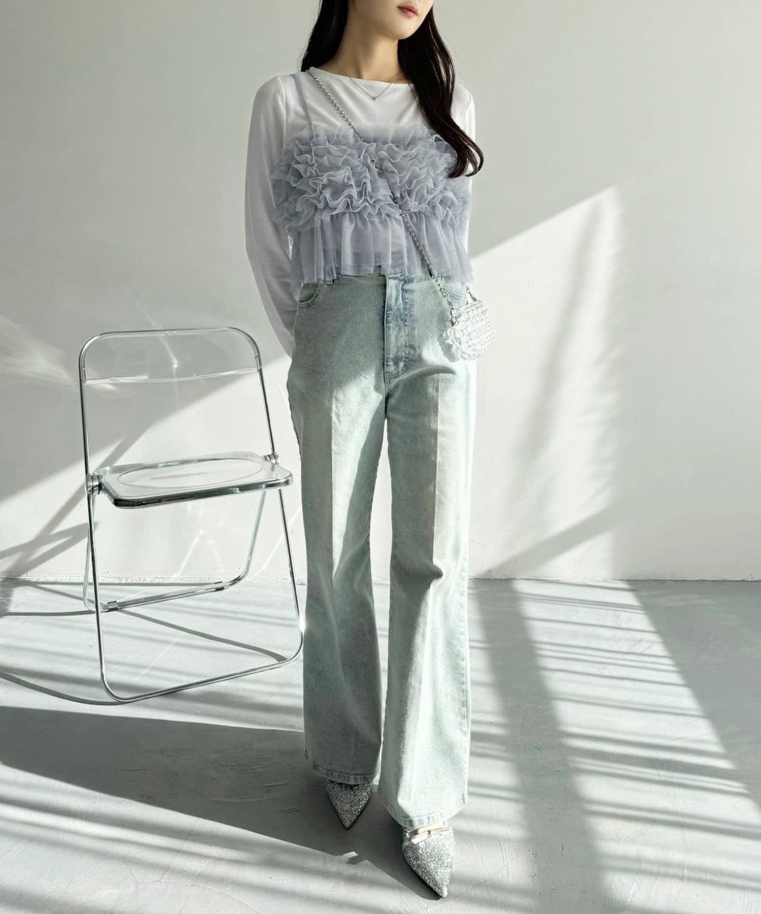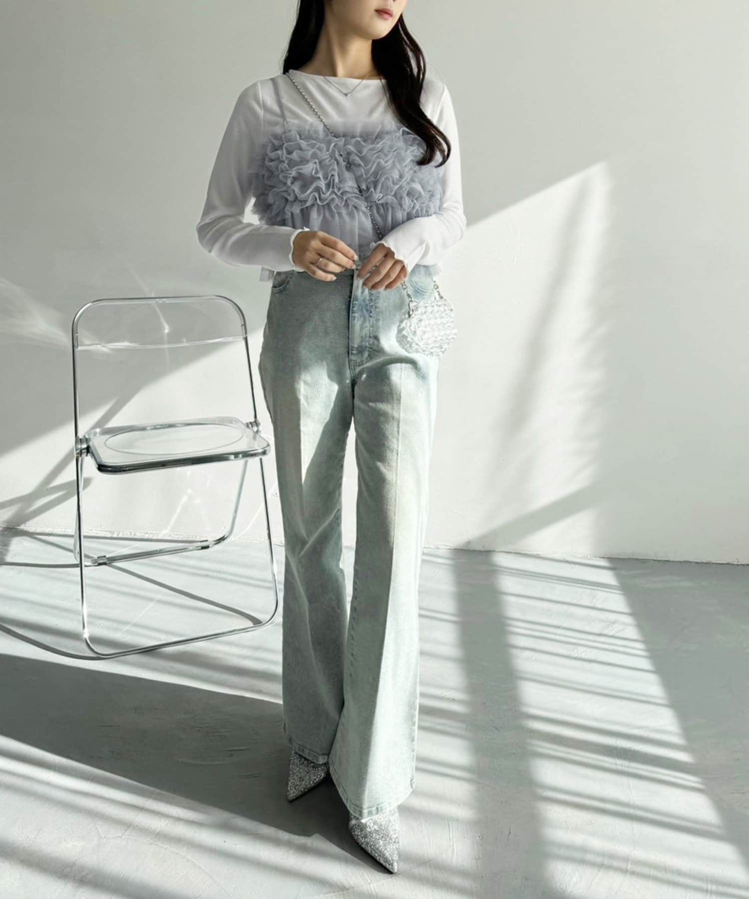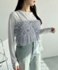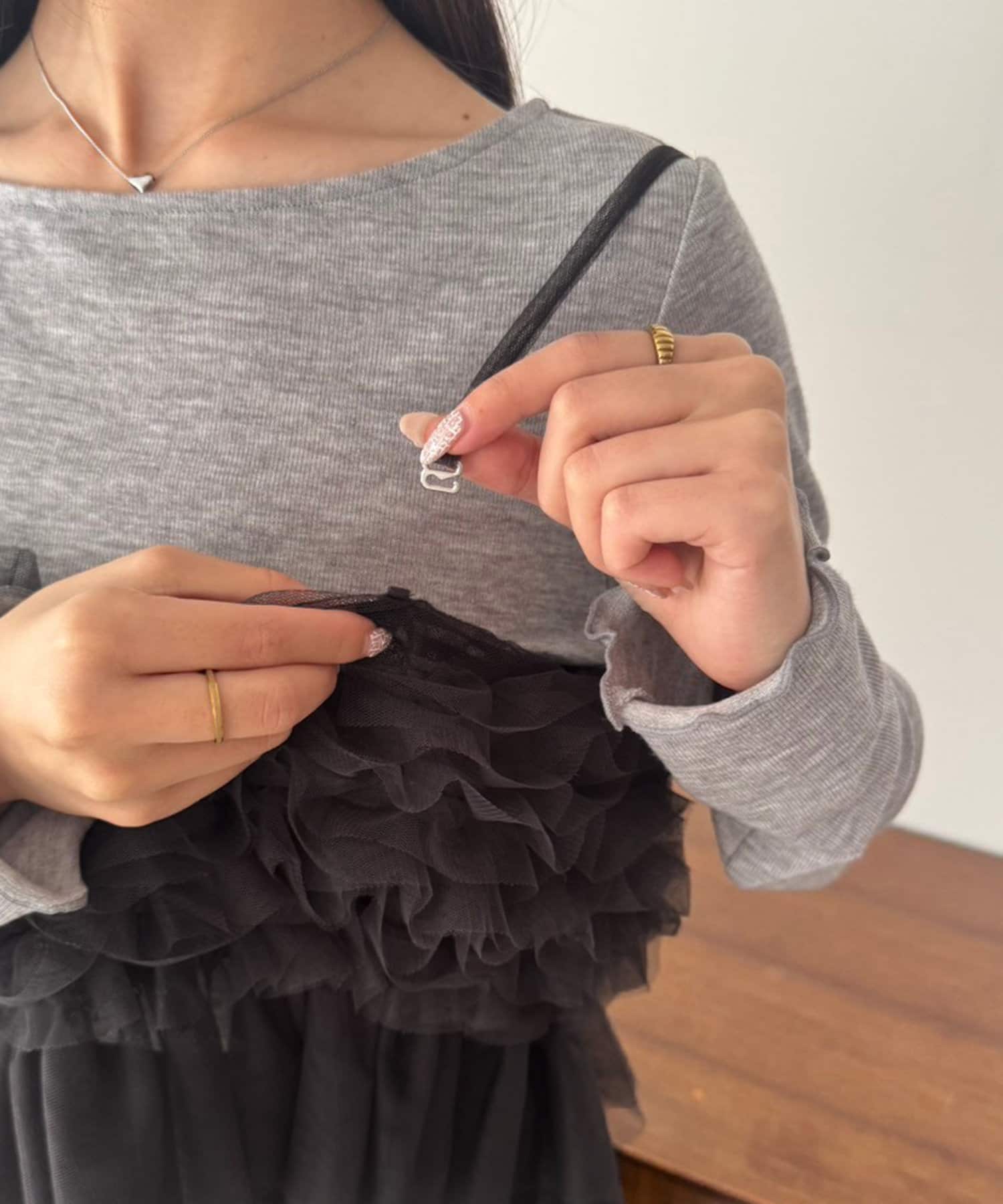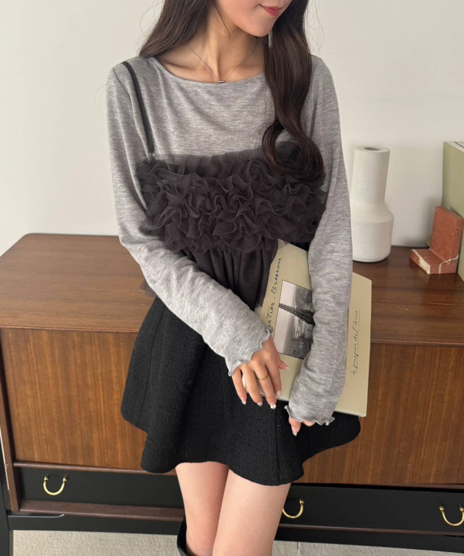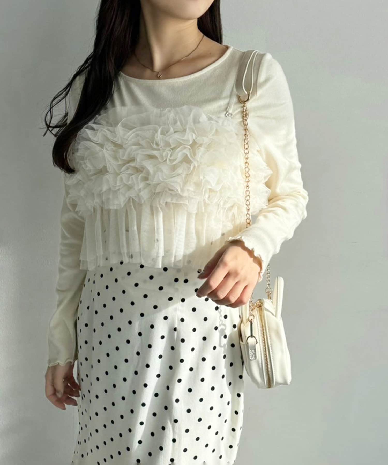 フリルたっぷりのビスチェはシンプルなトップスと重ねるだけで