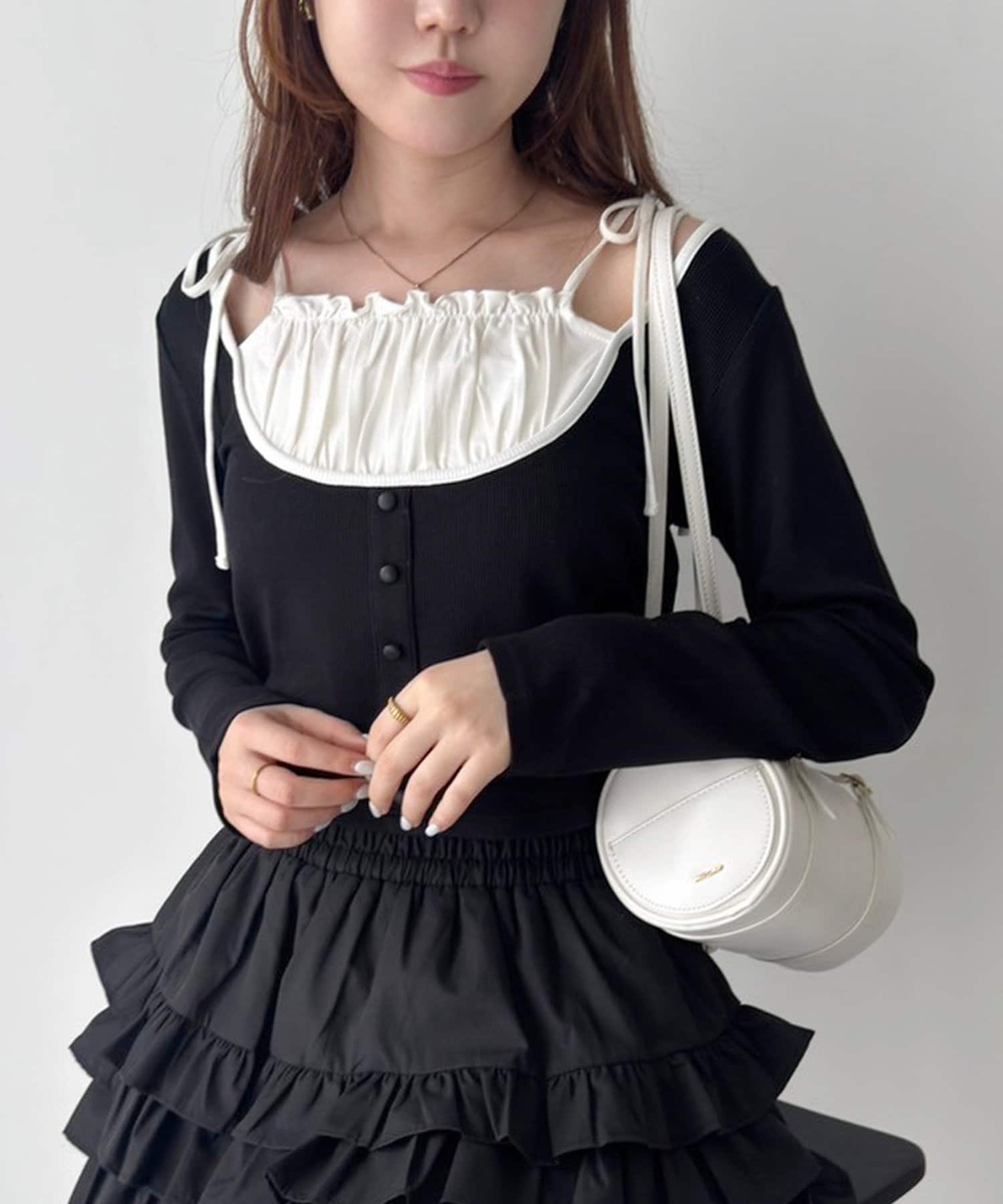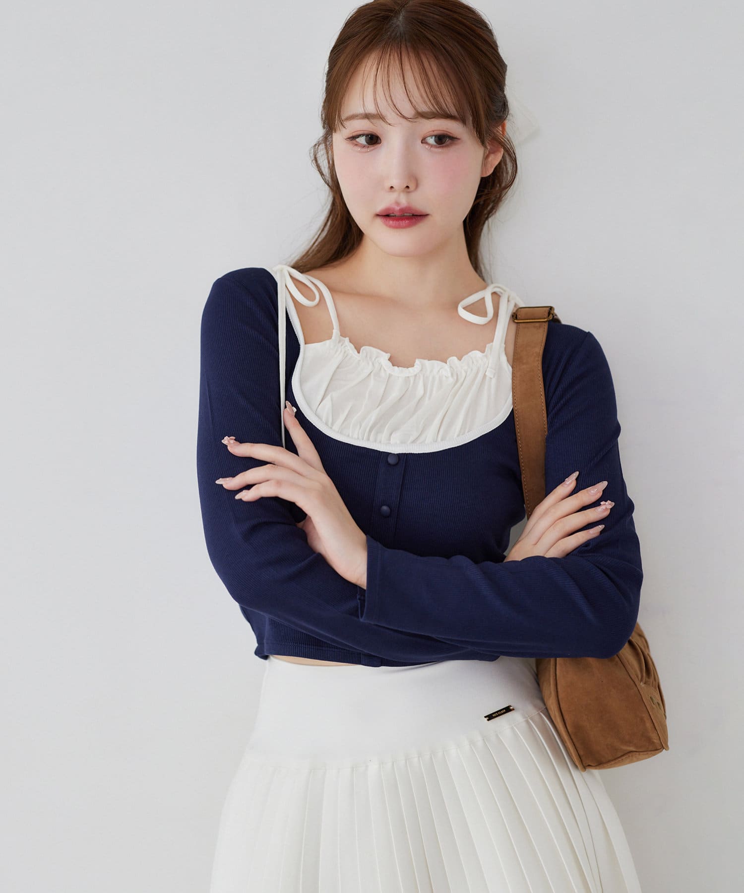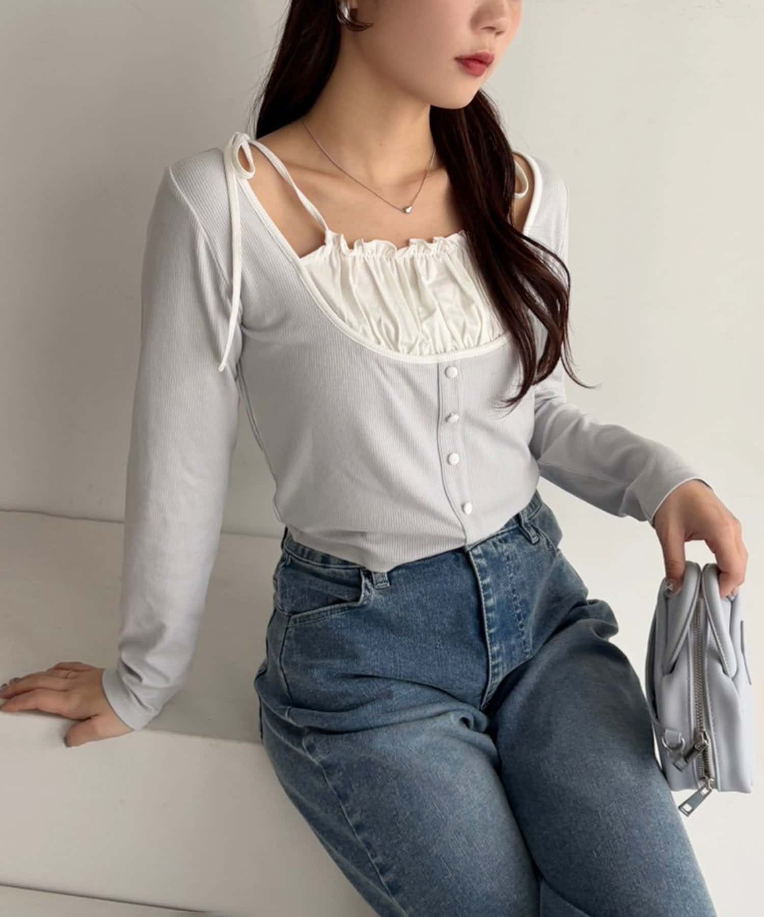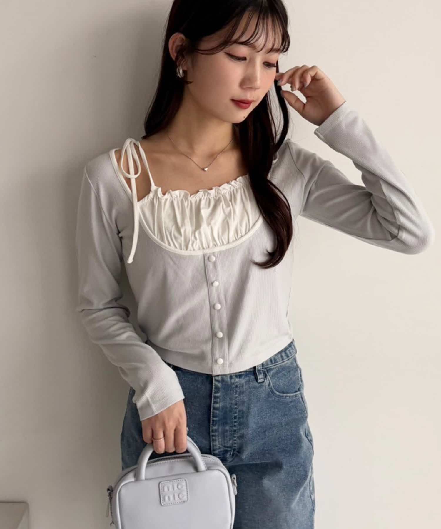 1枚でレイヤードしているようにも見える主役級ニットトップス
