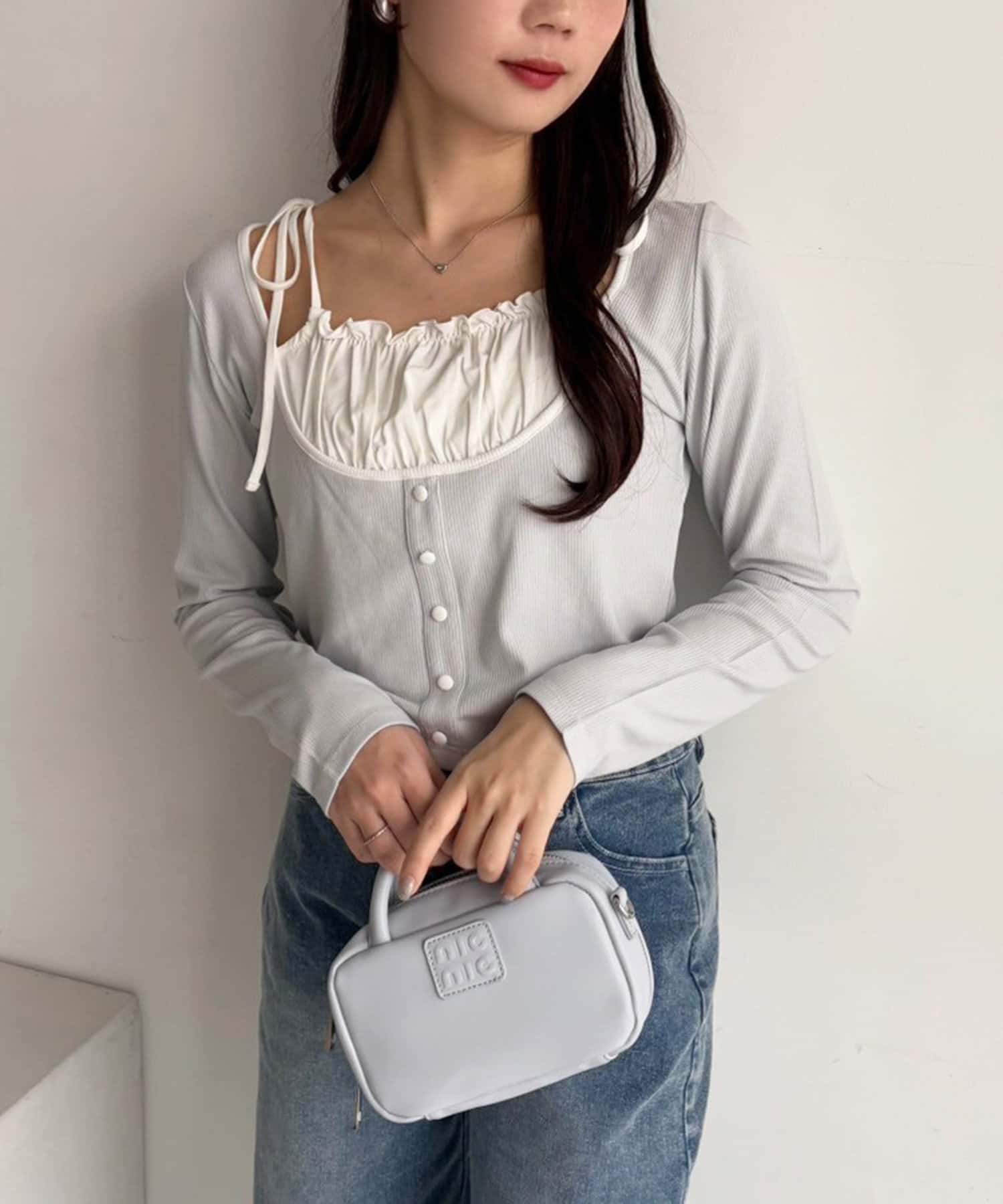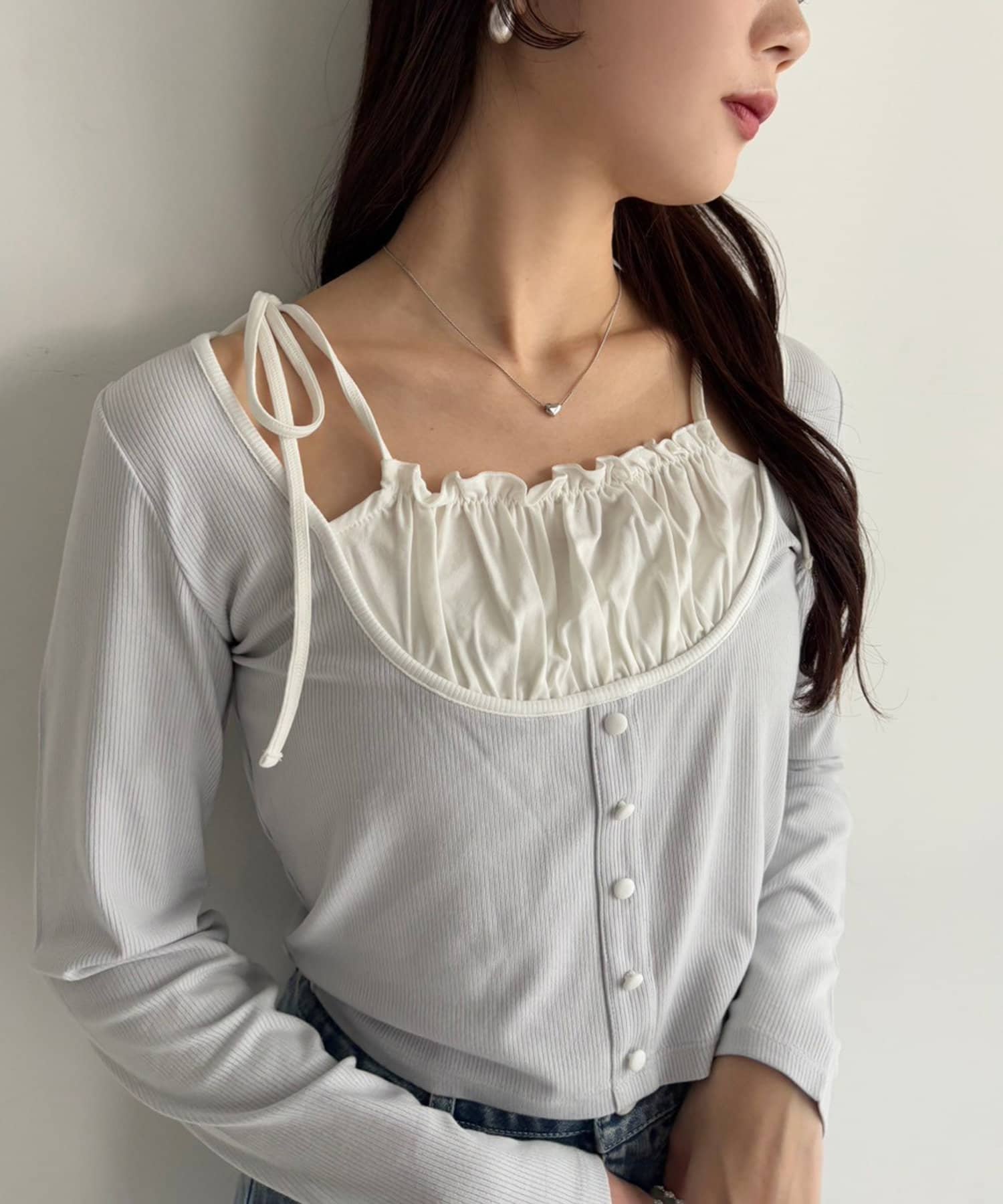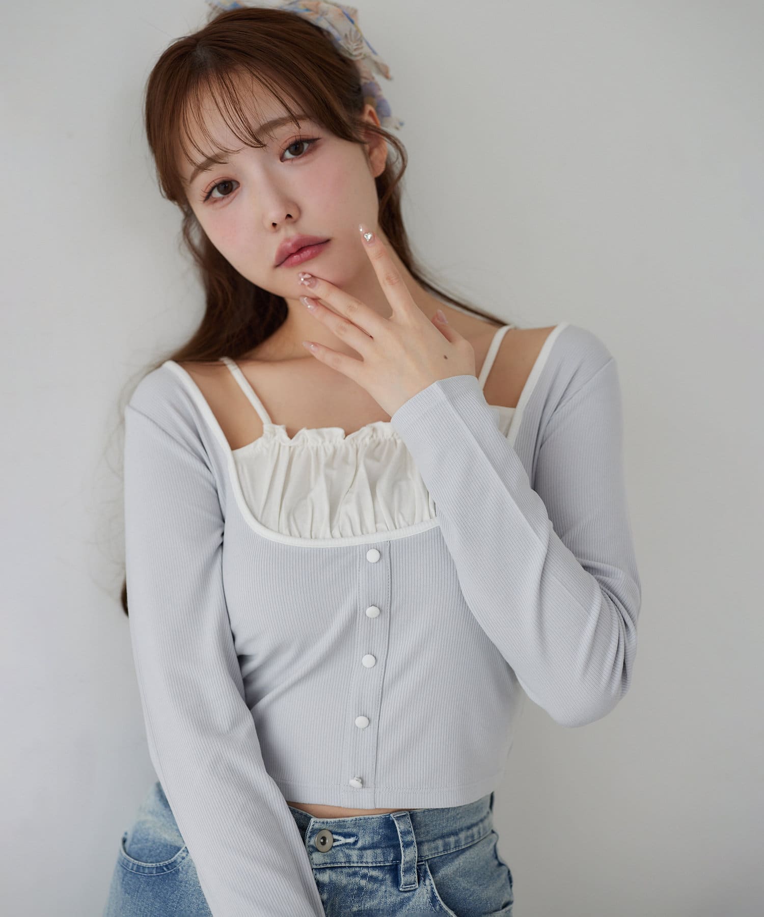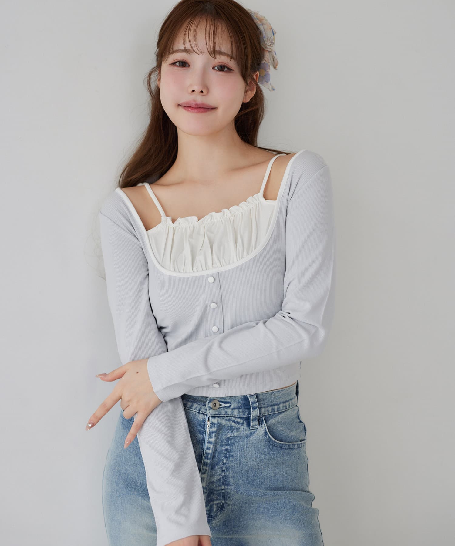 1枚でレイヤードしているようにも見える主役級ニットトップス