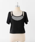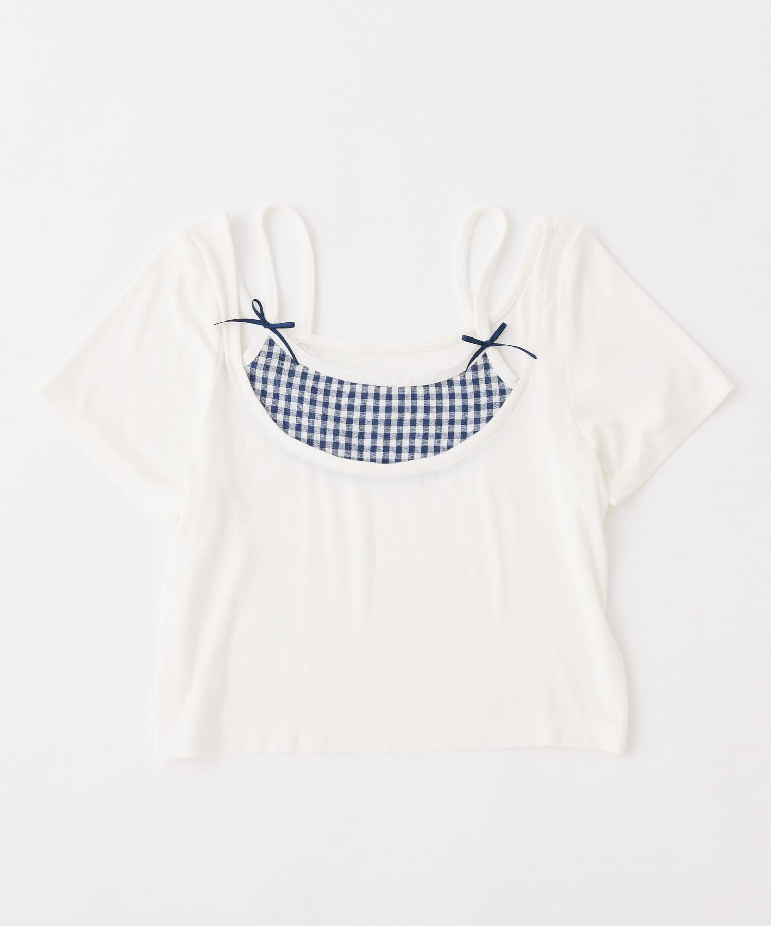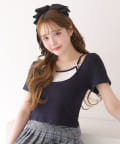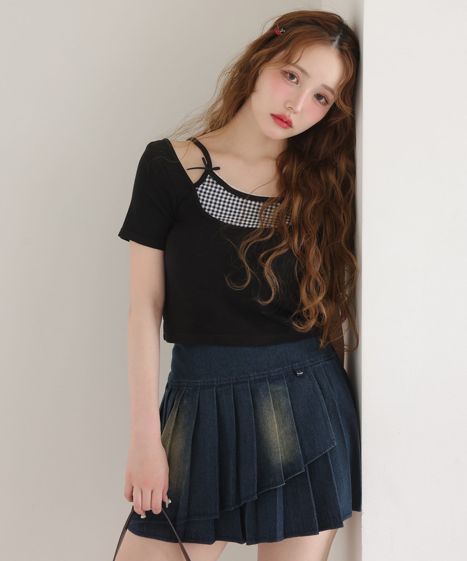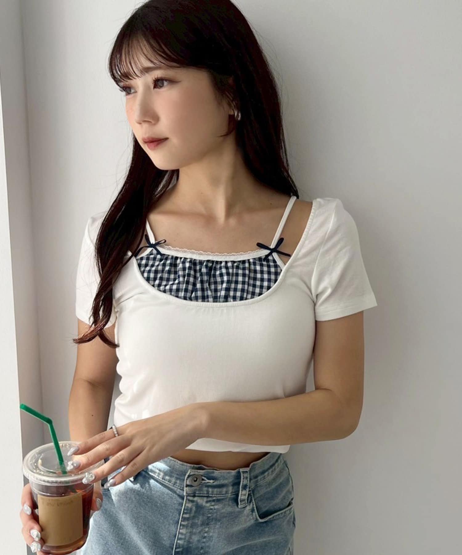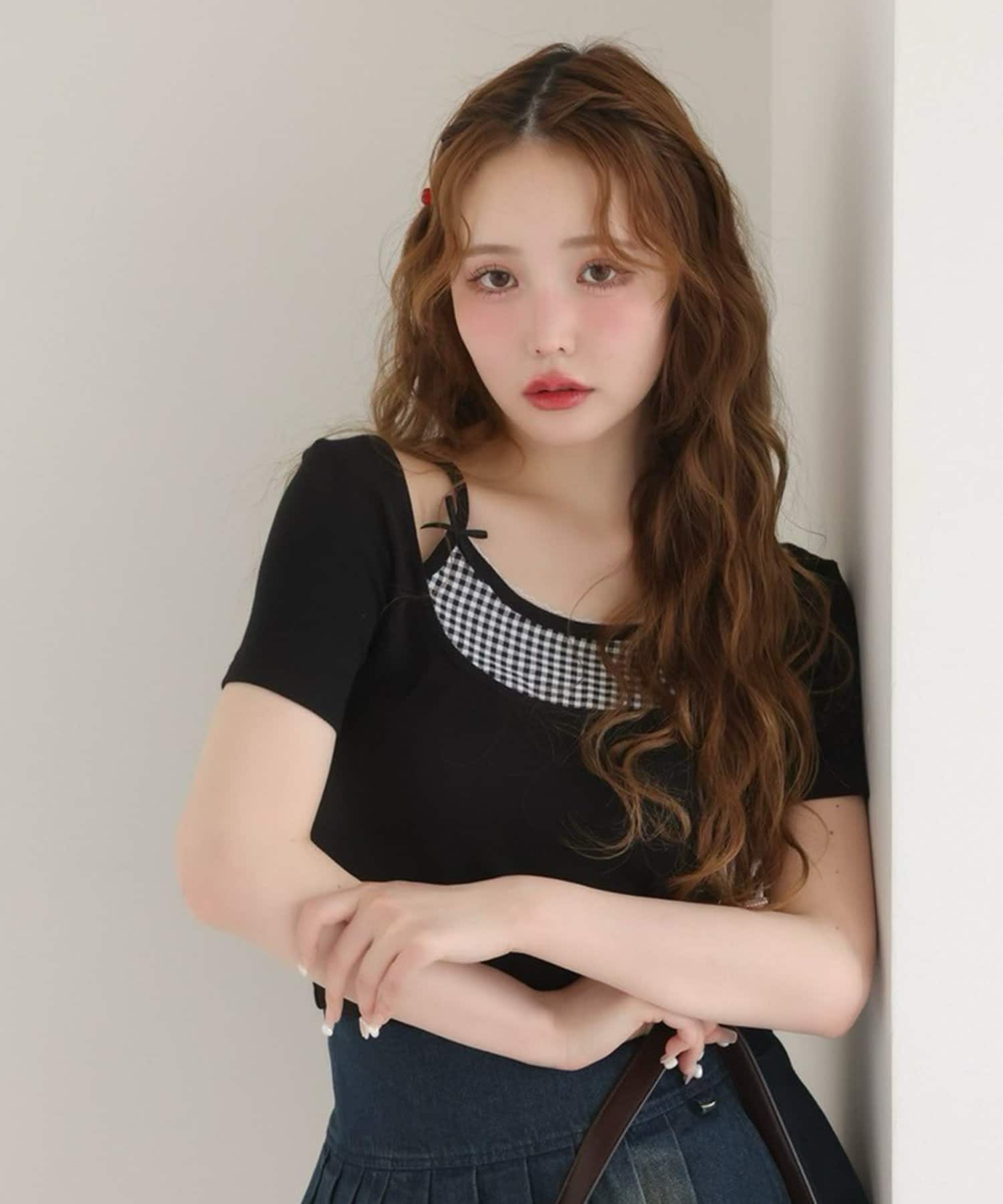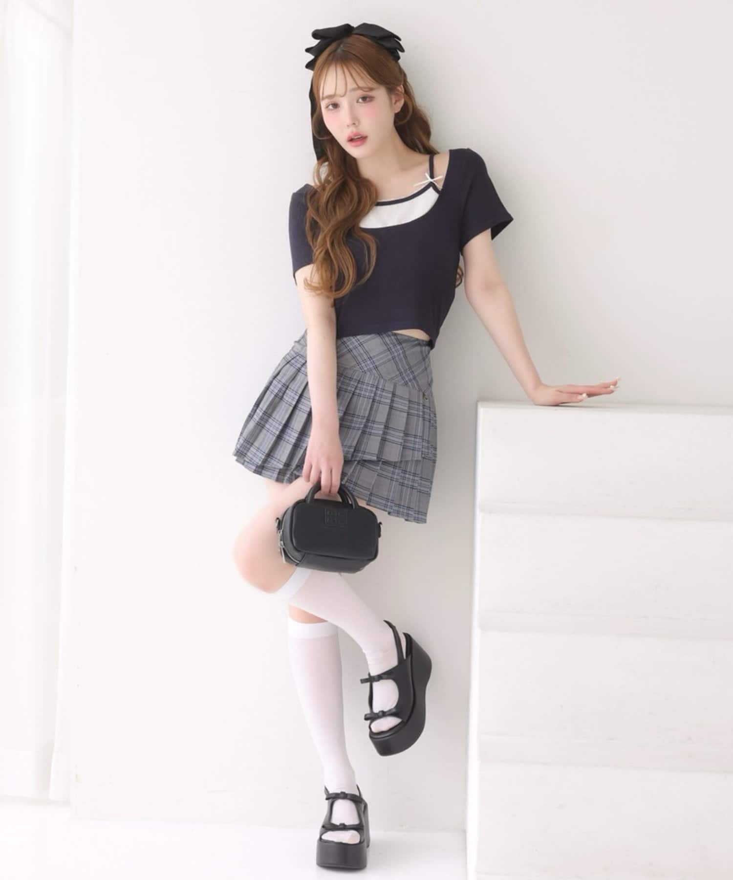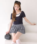 チェックインナーをレイヤードしているようなデザインが特徴の、ガーリーなニット。