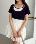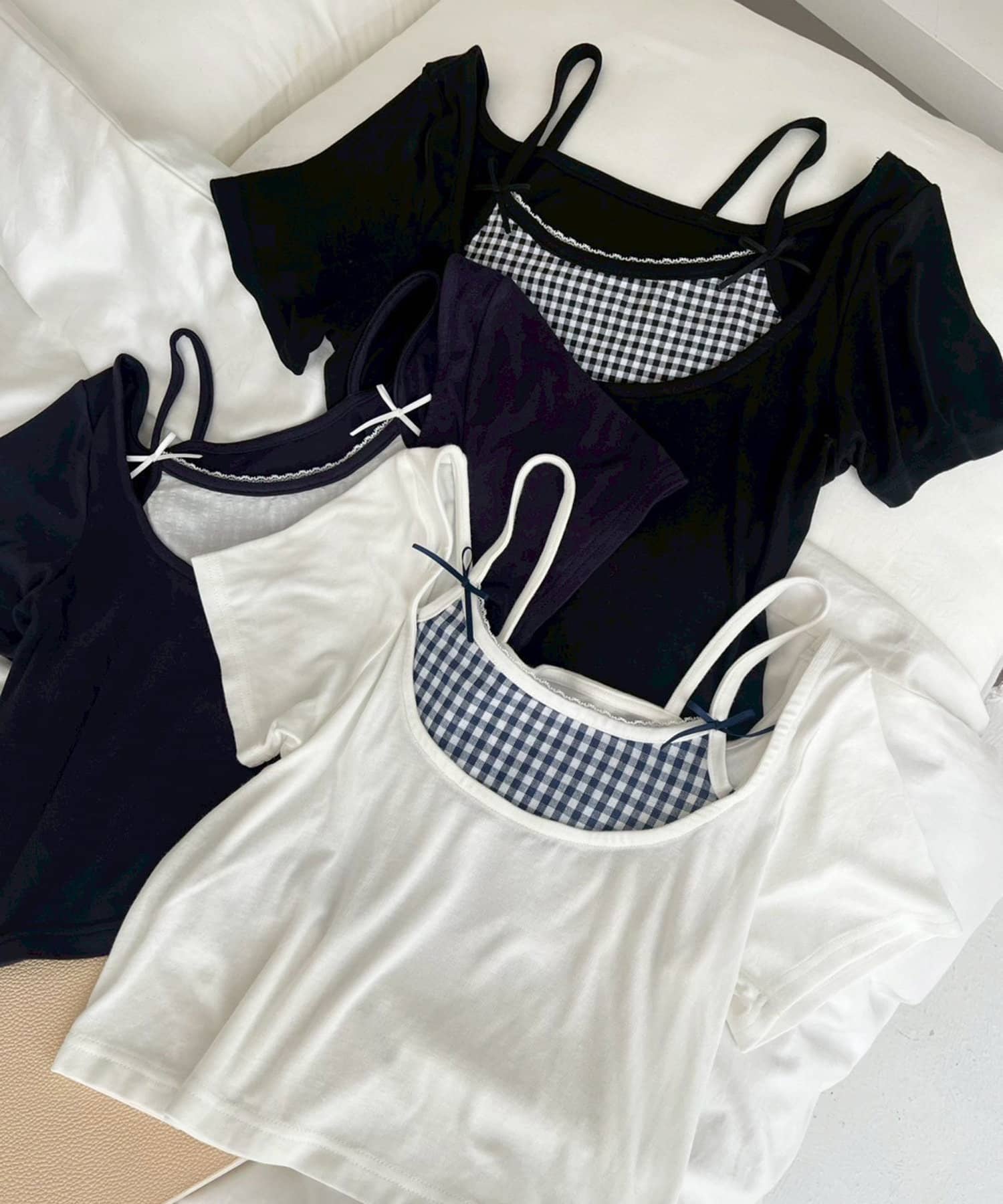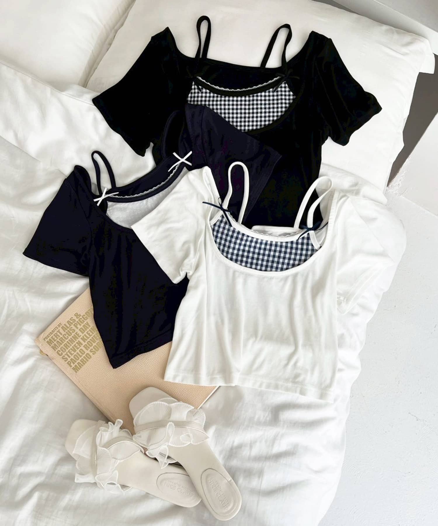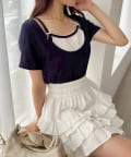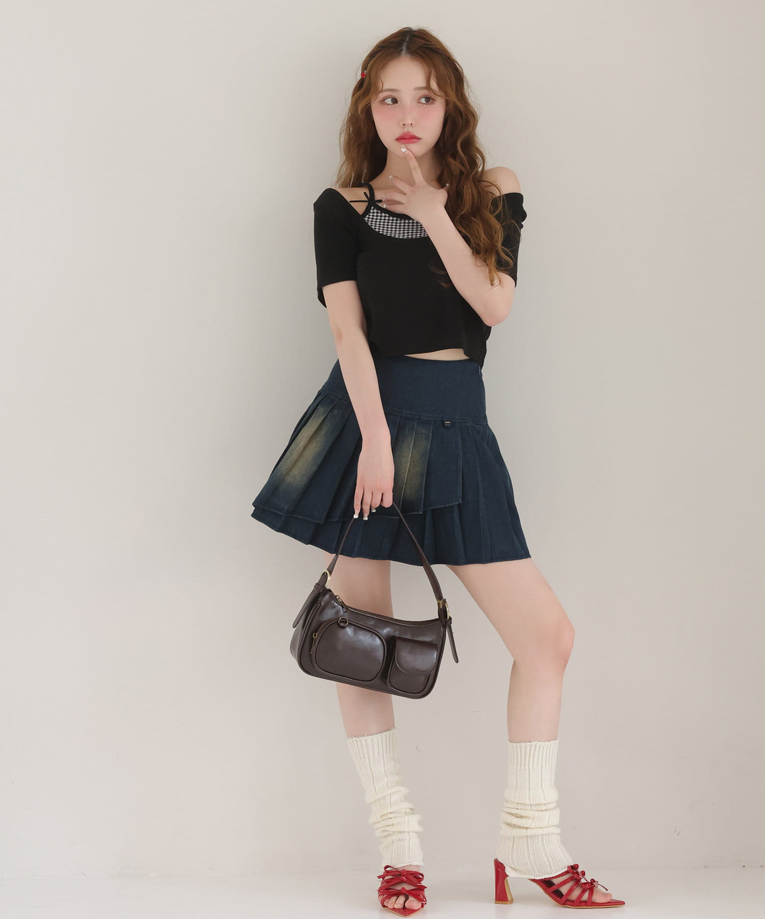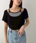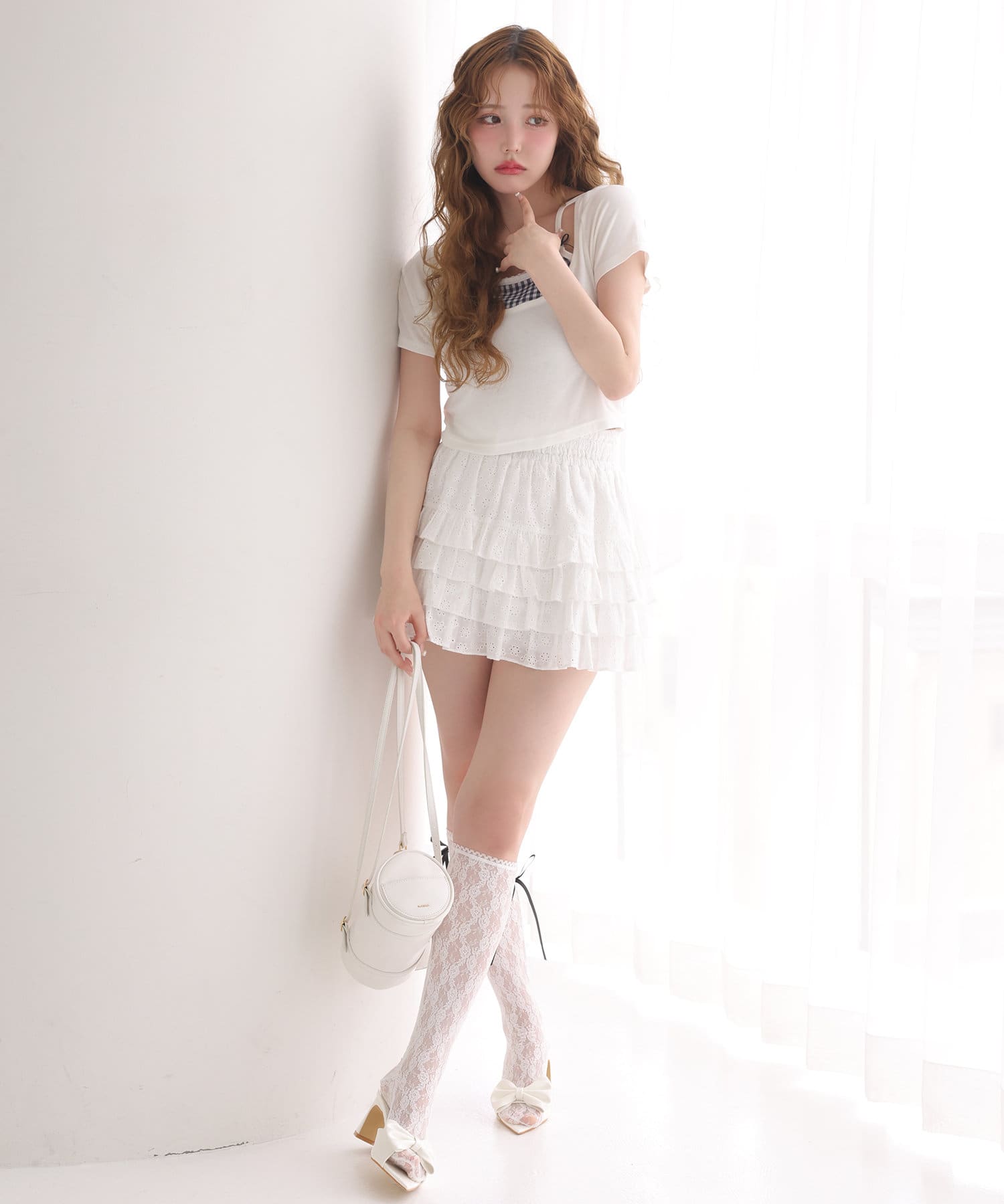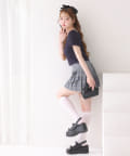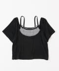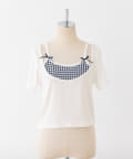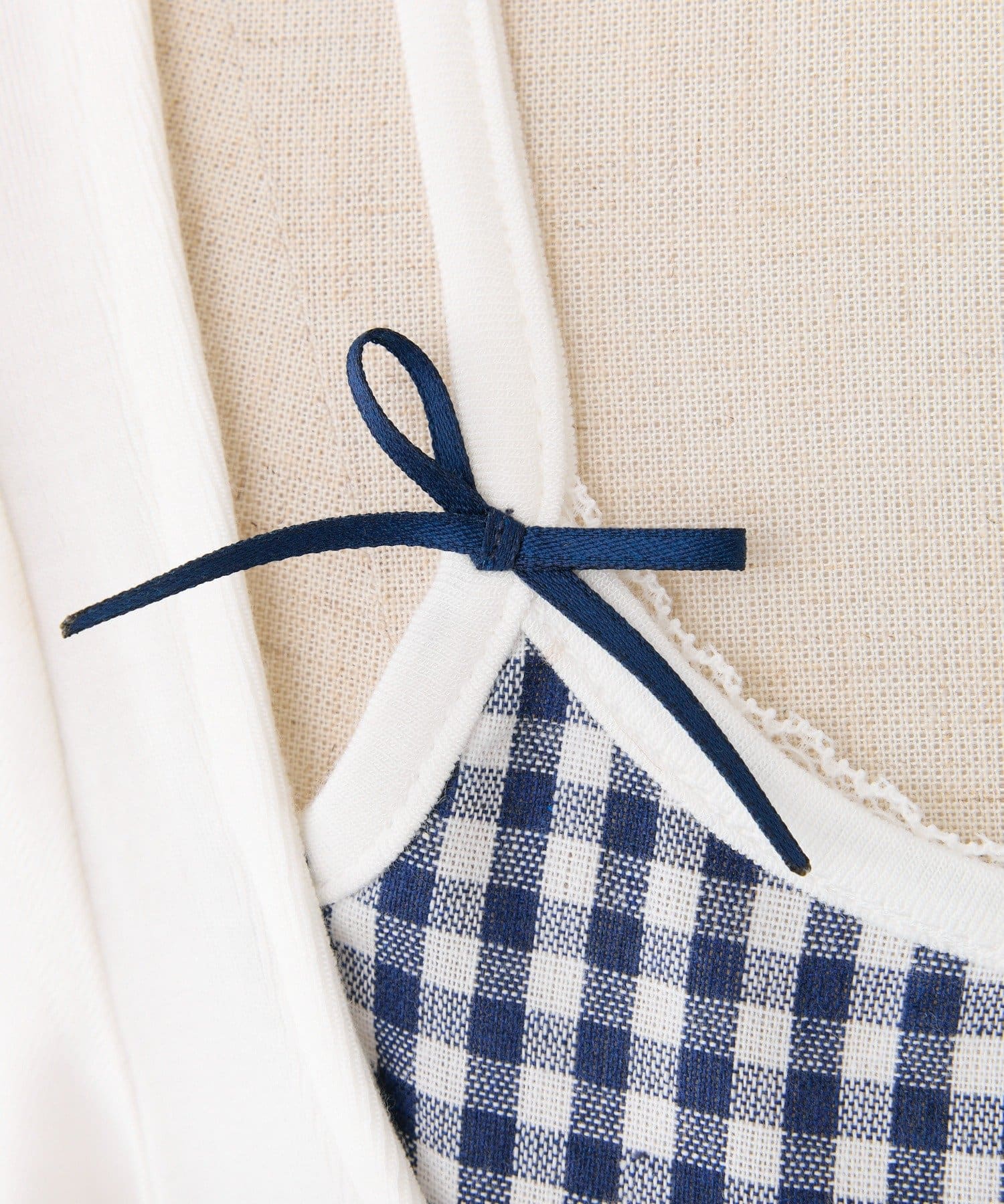 チェックインナーをレイヤードしているようなデザインが特徴の、ガーリーなニット。