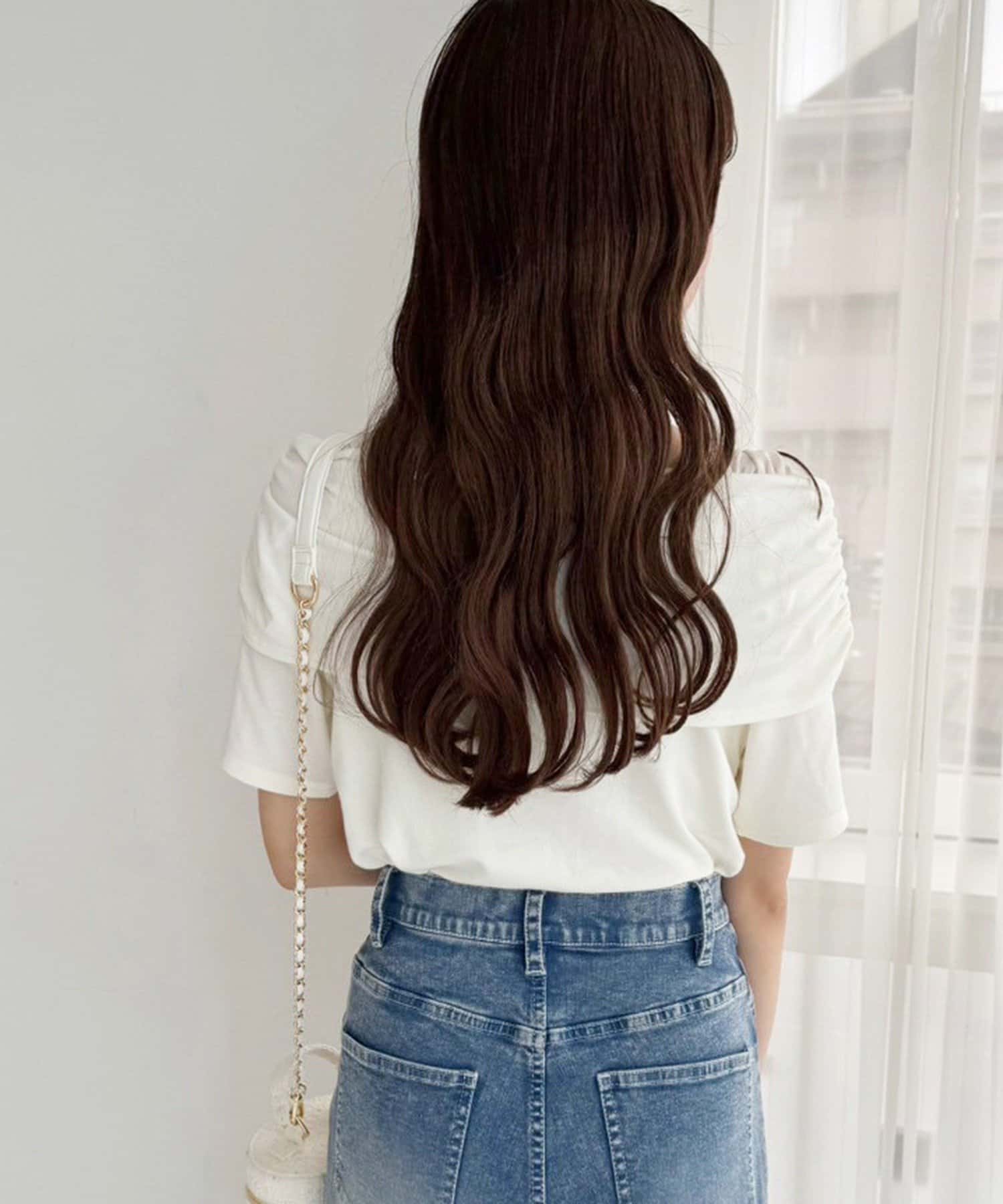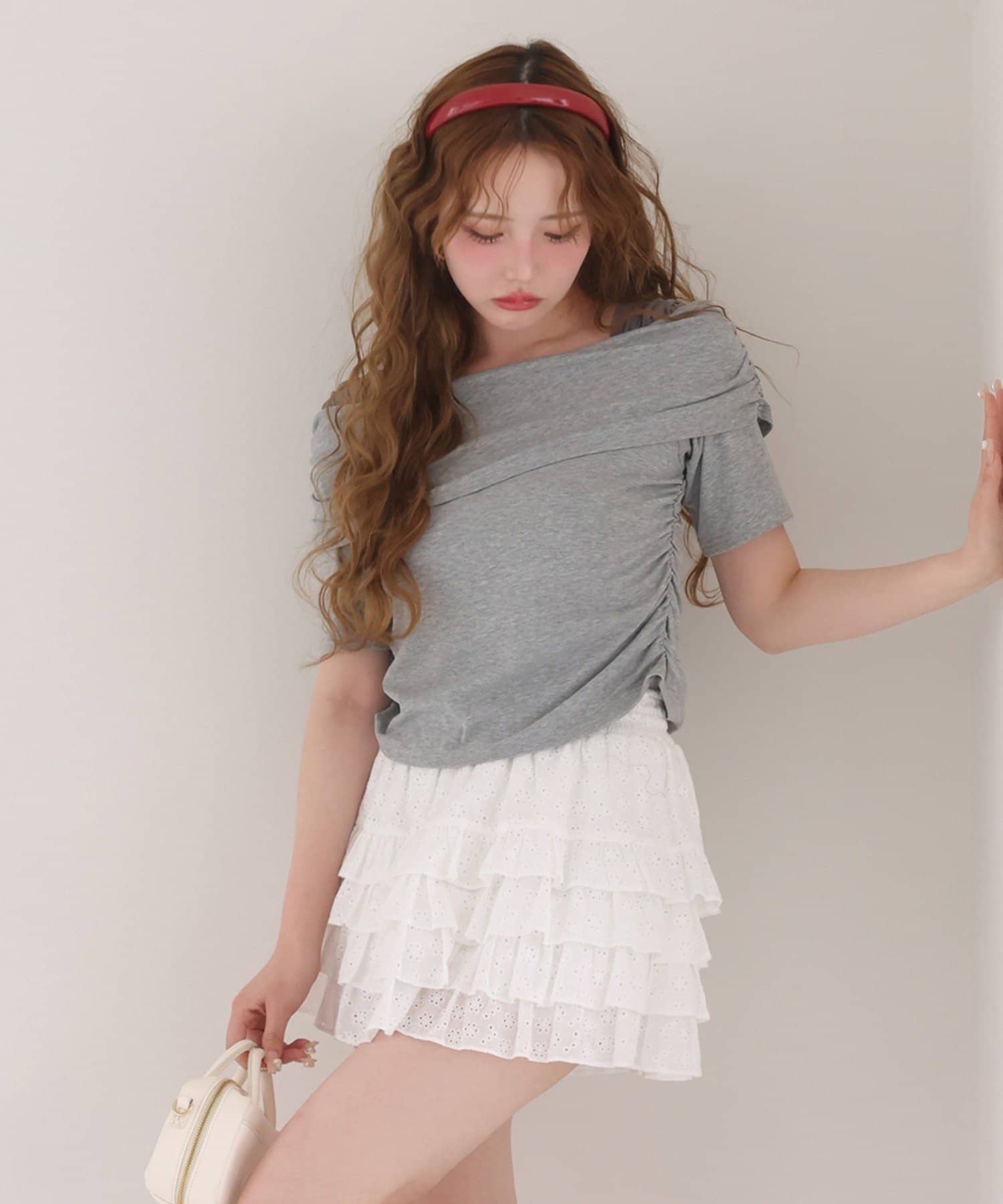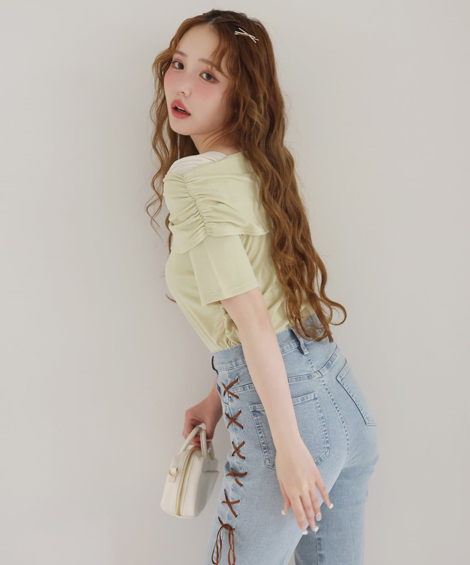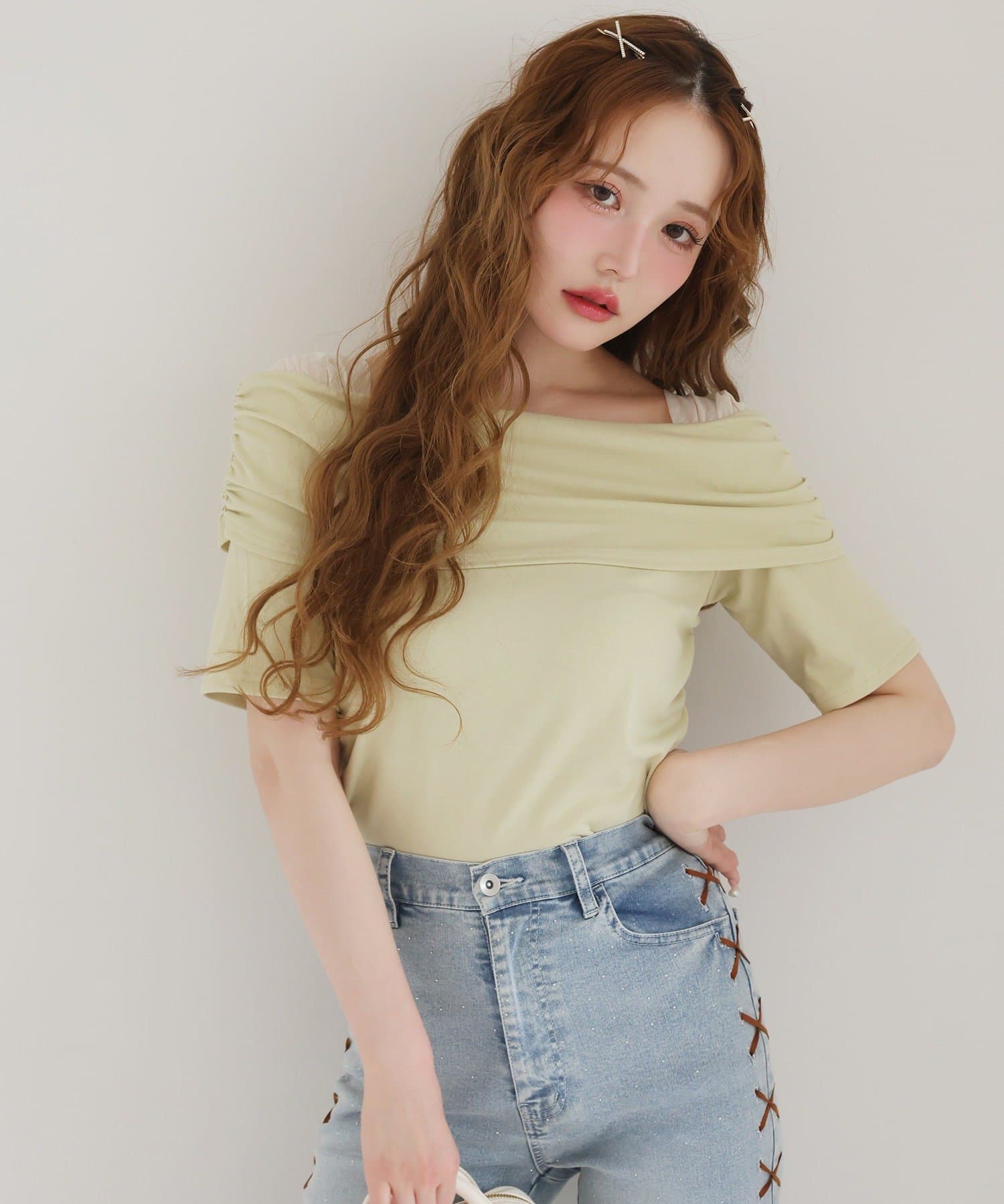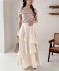 オフショル部分は大きく折り返しているので大人っぽい印象に。