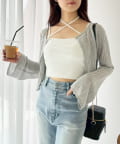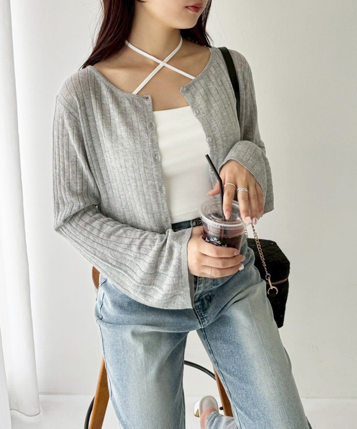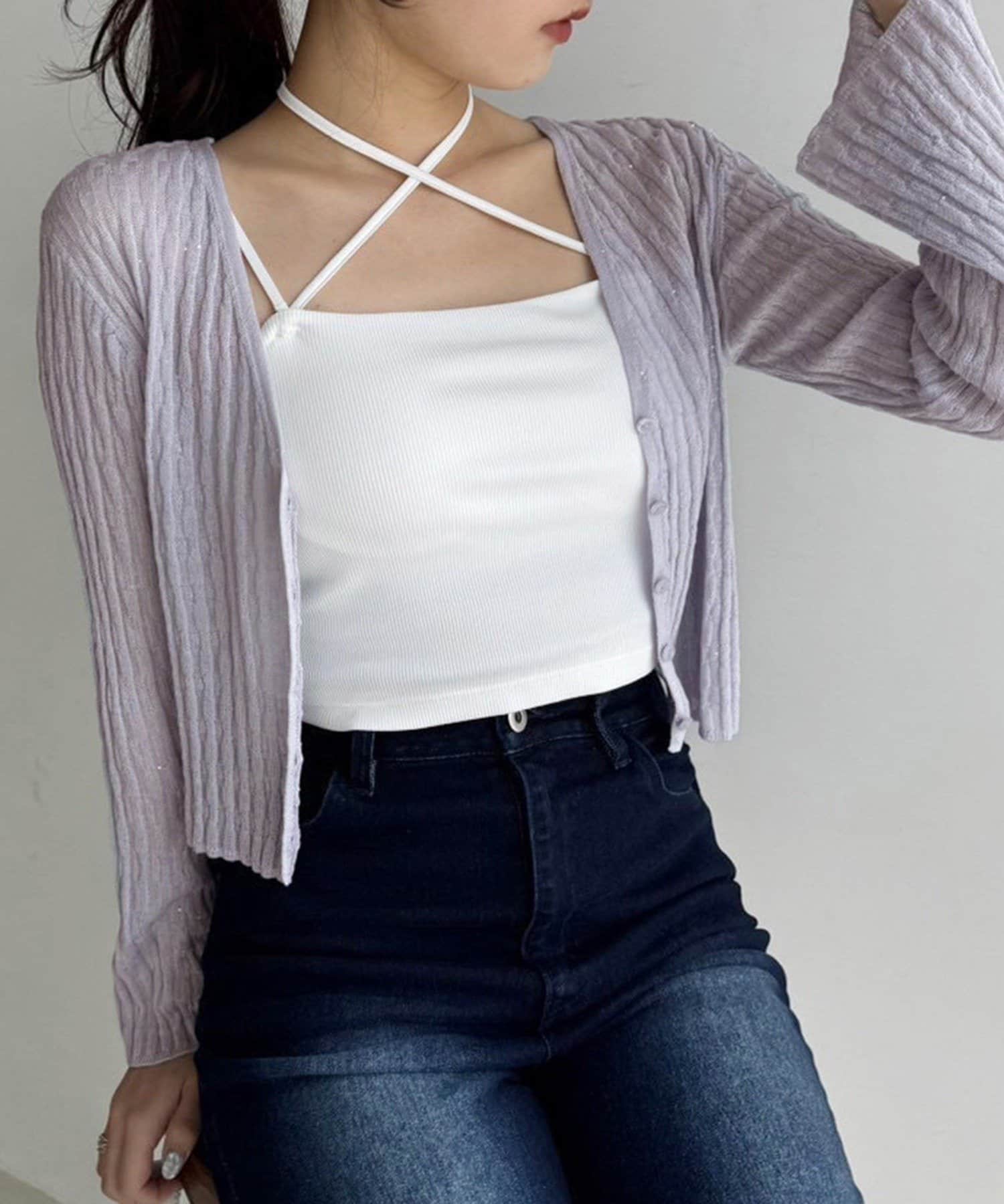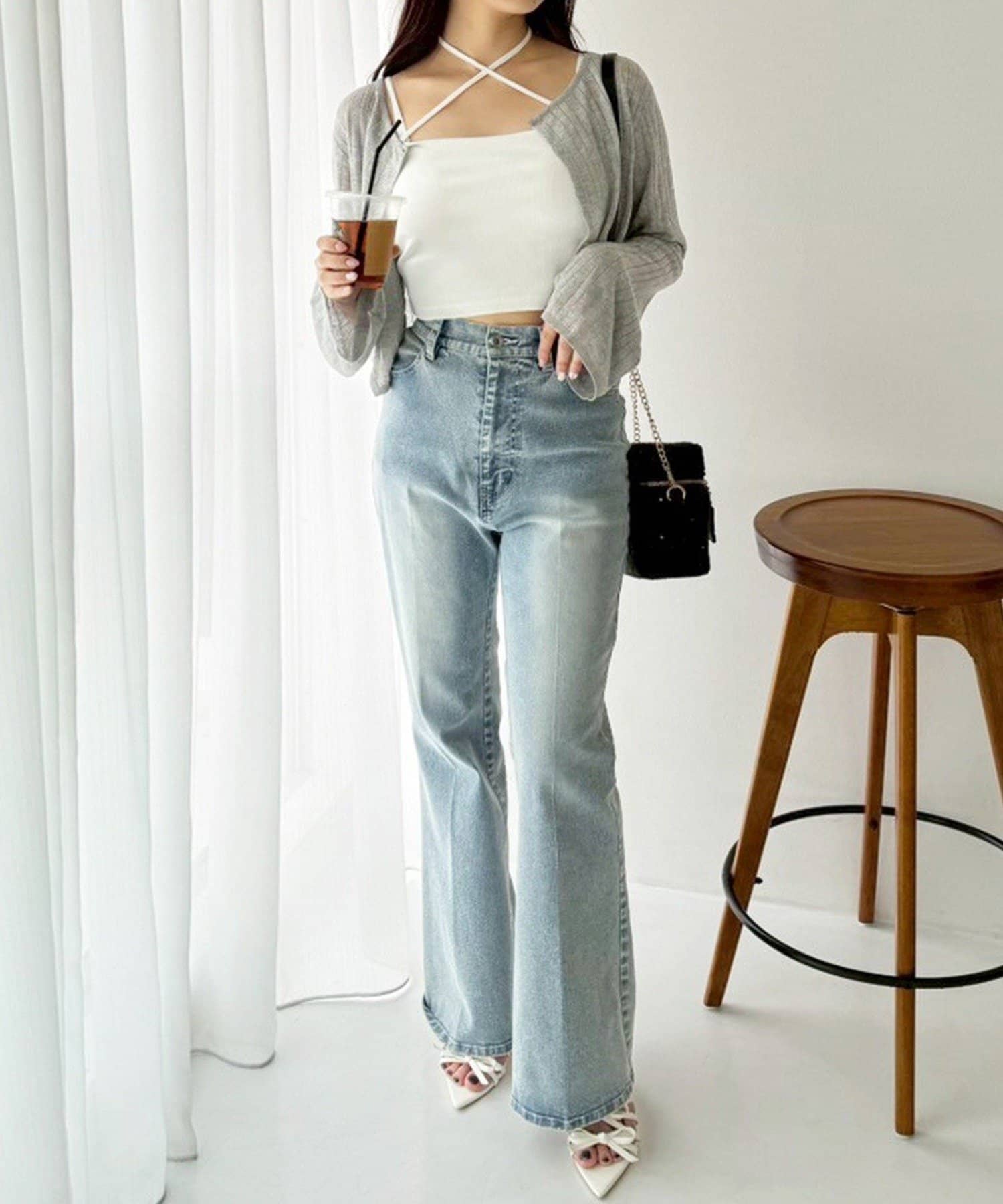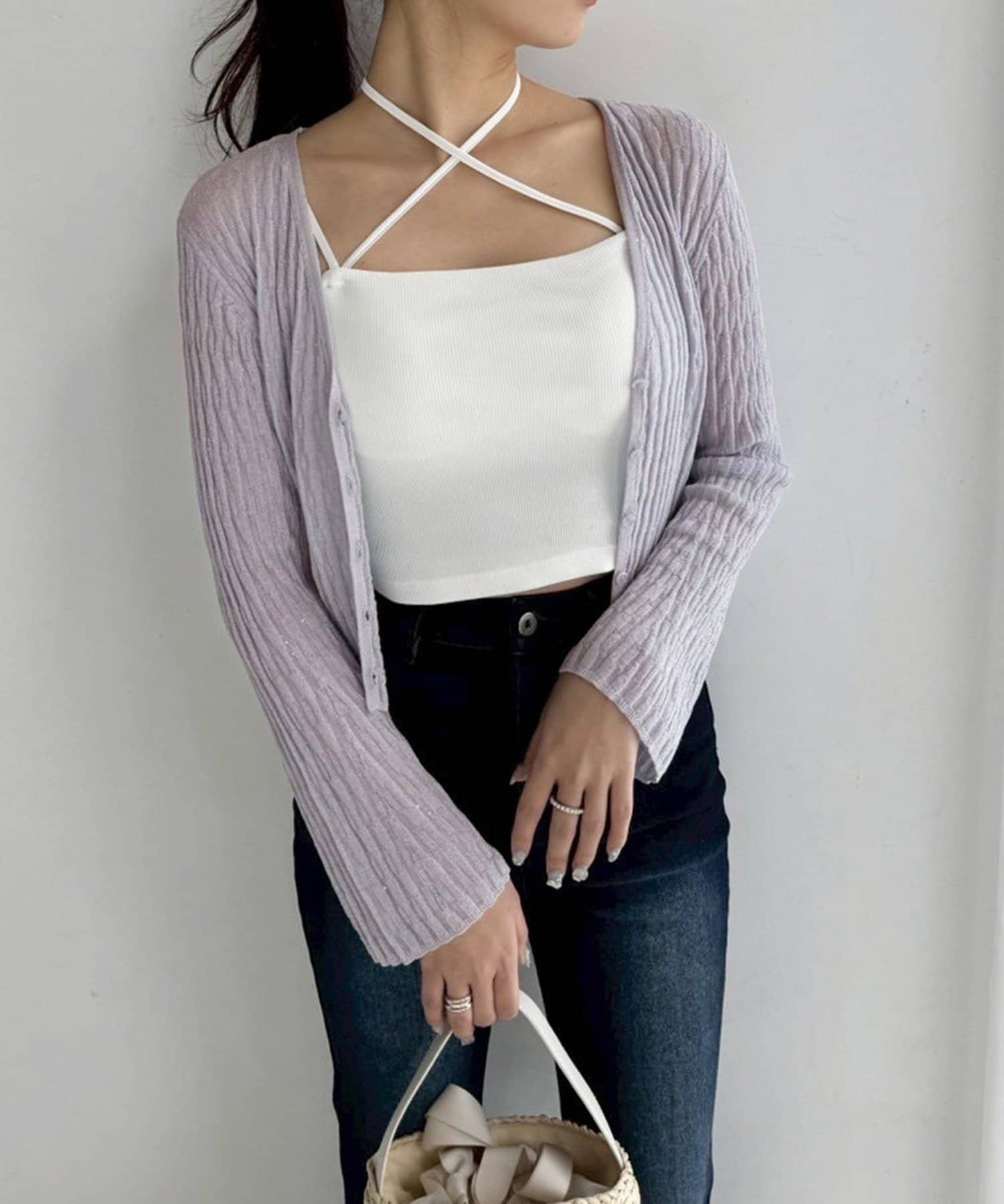 シアーシャツやカーディガンを羽織れば、大人っぽくこなれた印象に。