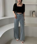 デニムやカーゴパンツと合わせてヘルシーな肌見せコーデに。