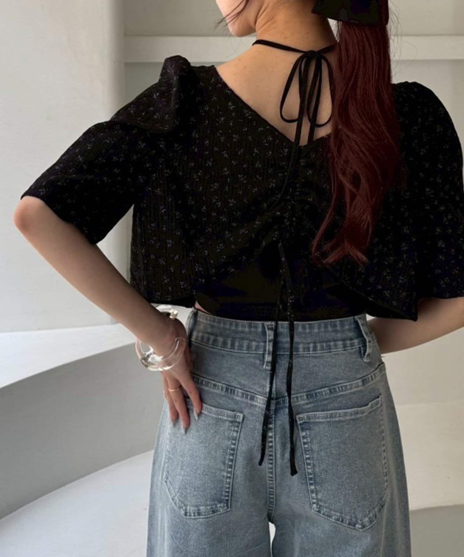 バックスタイルも華奢なストラップで抜け感を演出し、大人っぽい雰囲気をプラス。