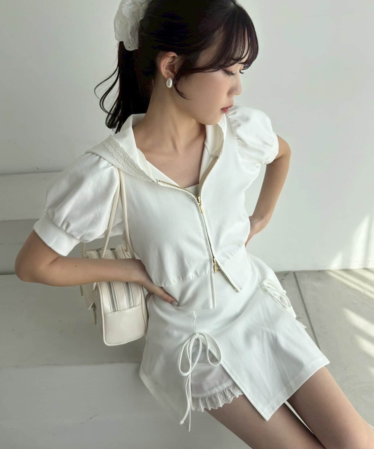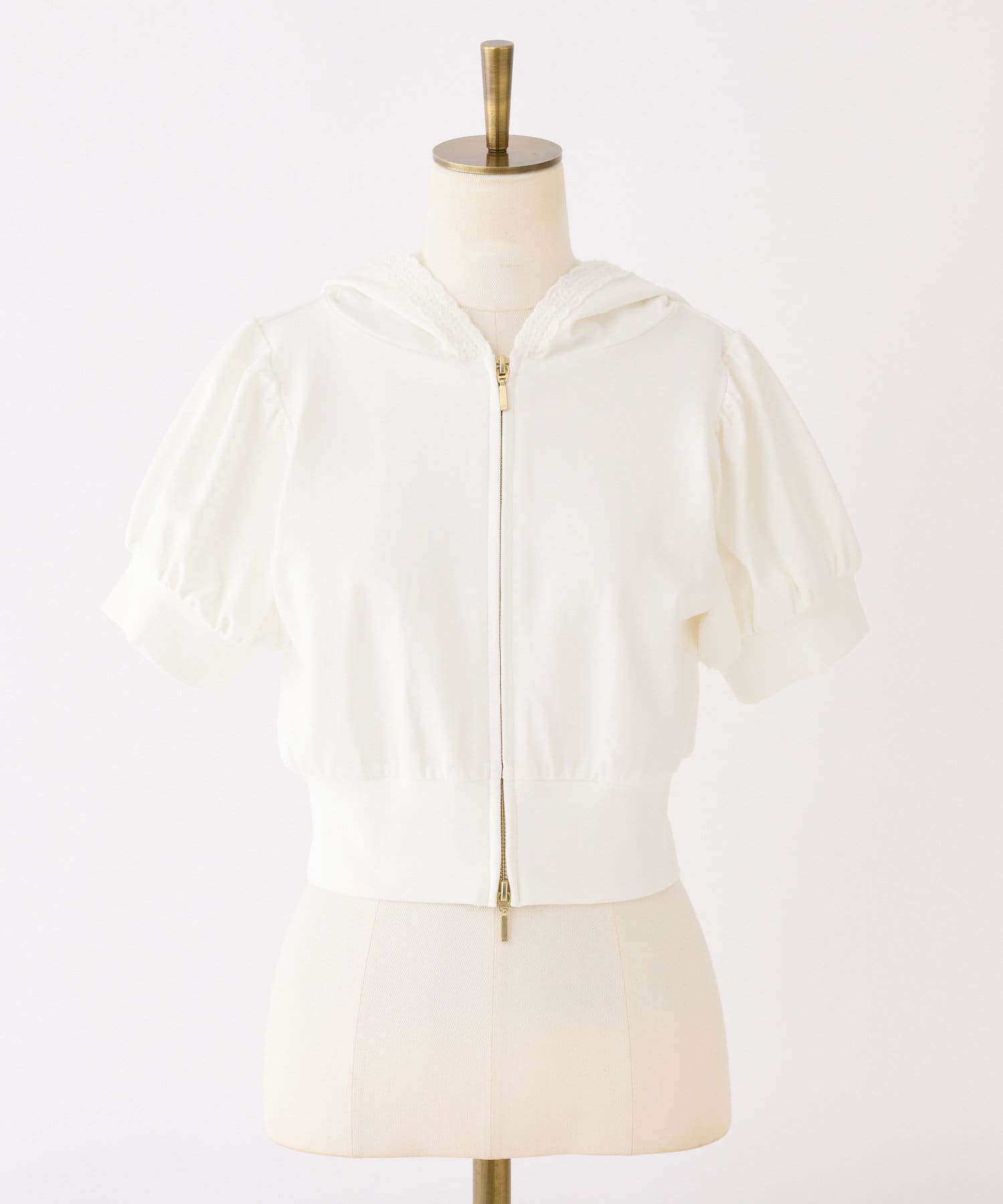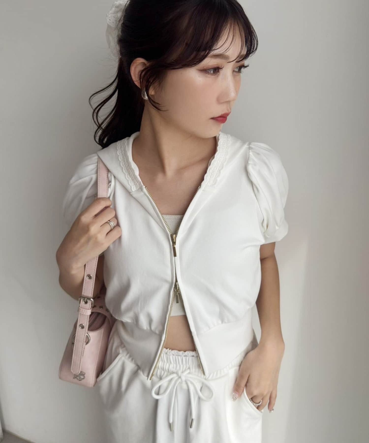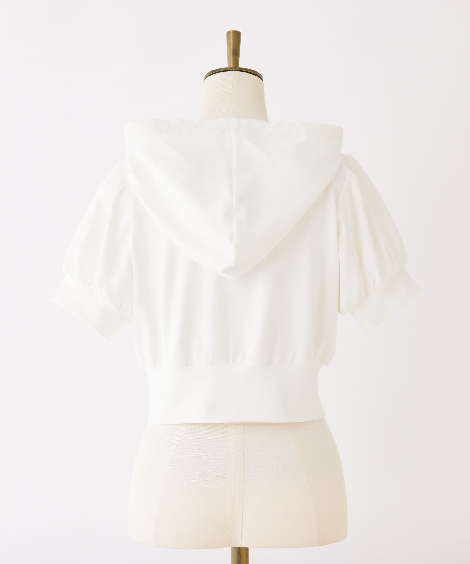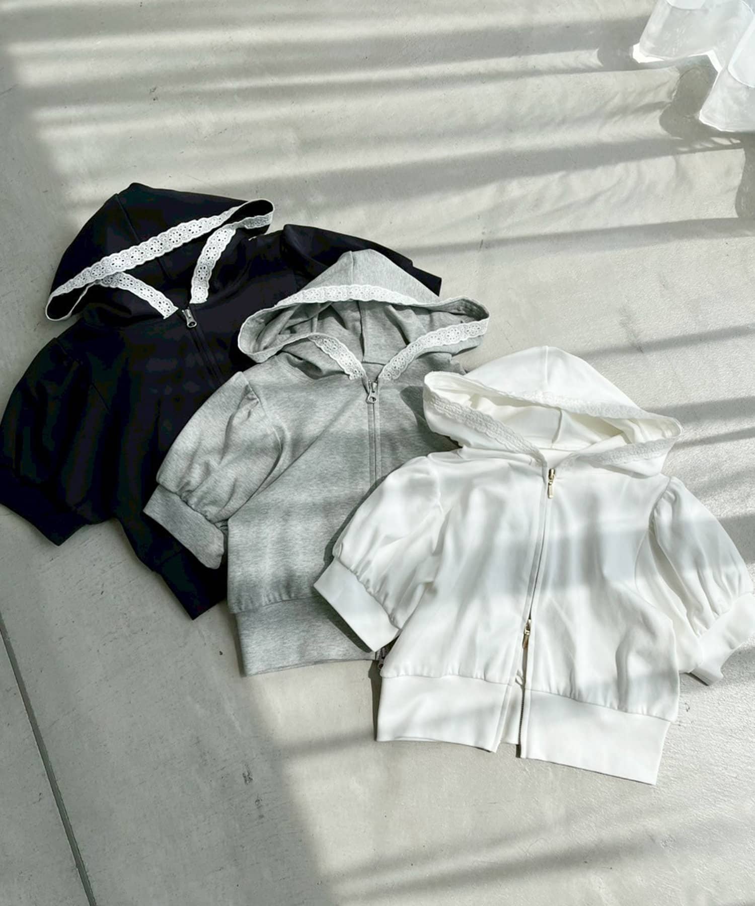 フード部分には繊細なレースを施し、スポーティーなデザインにフェミニンなアクセントをプラス。