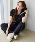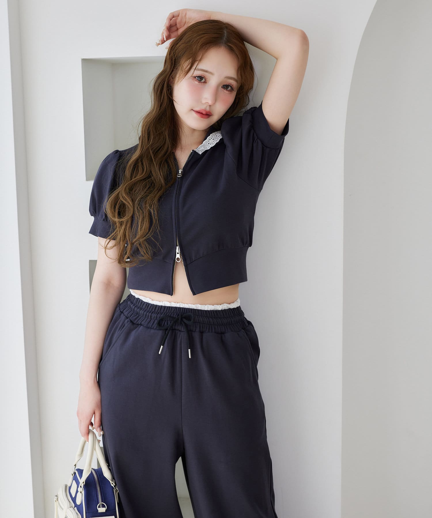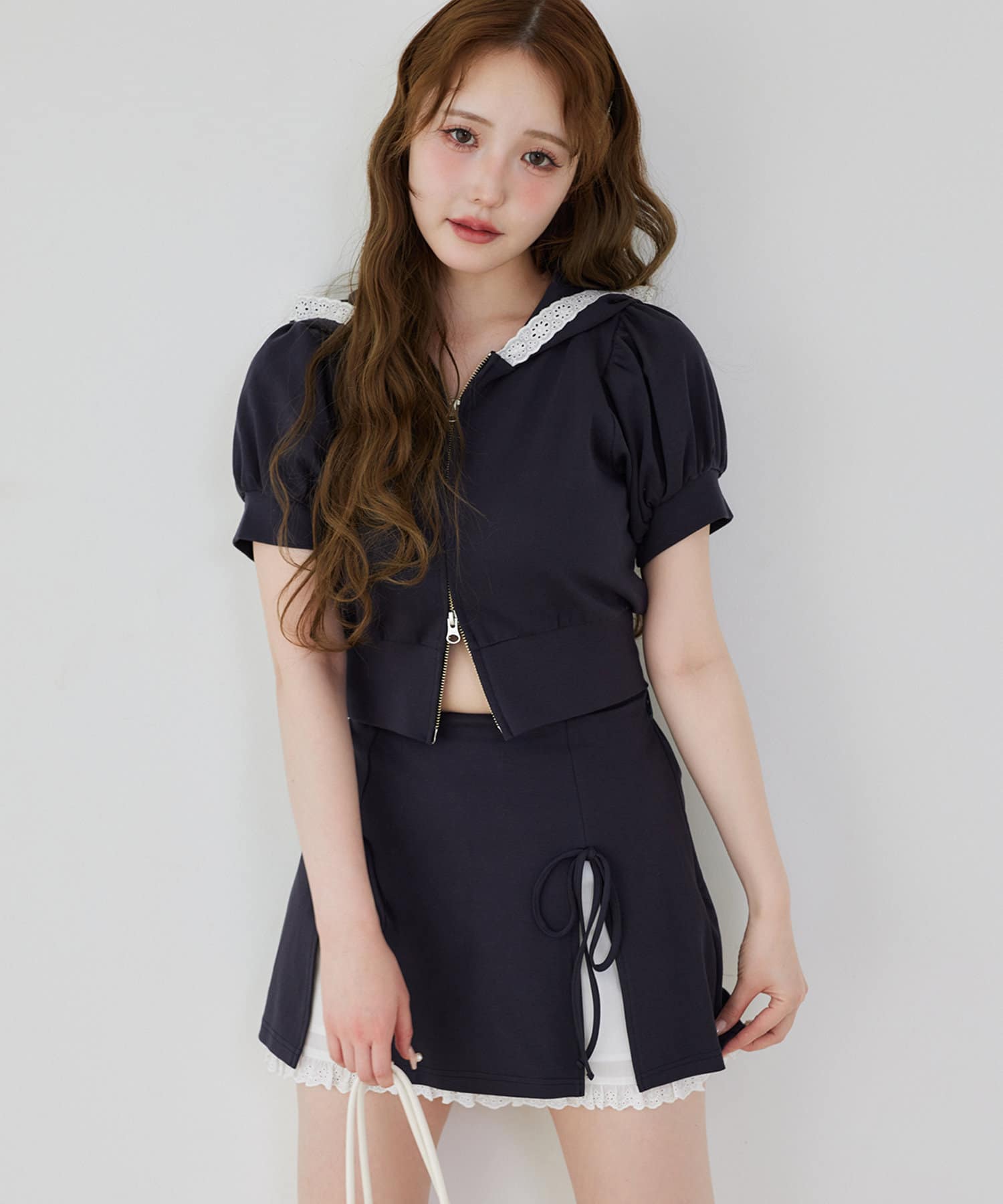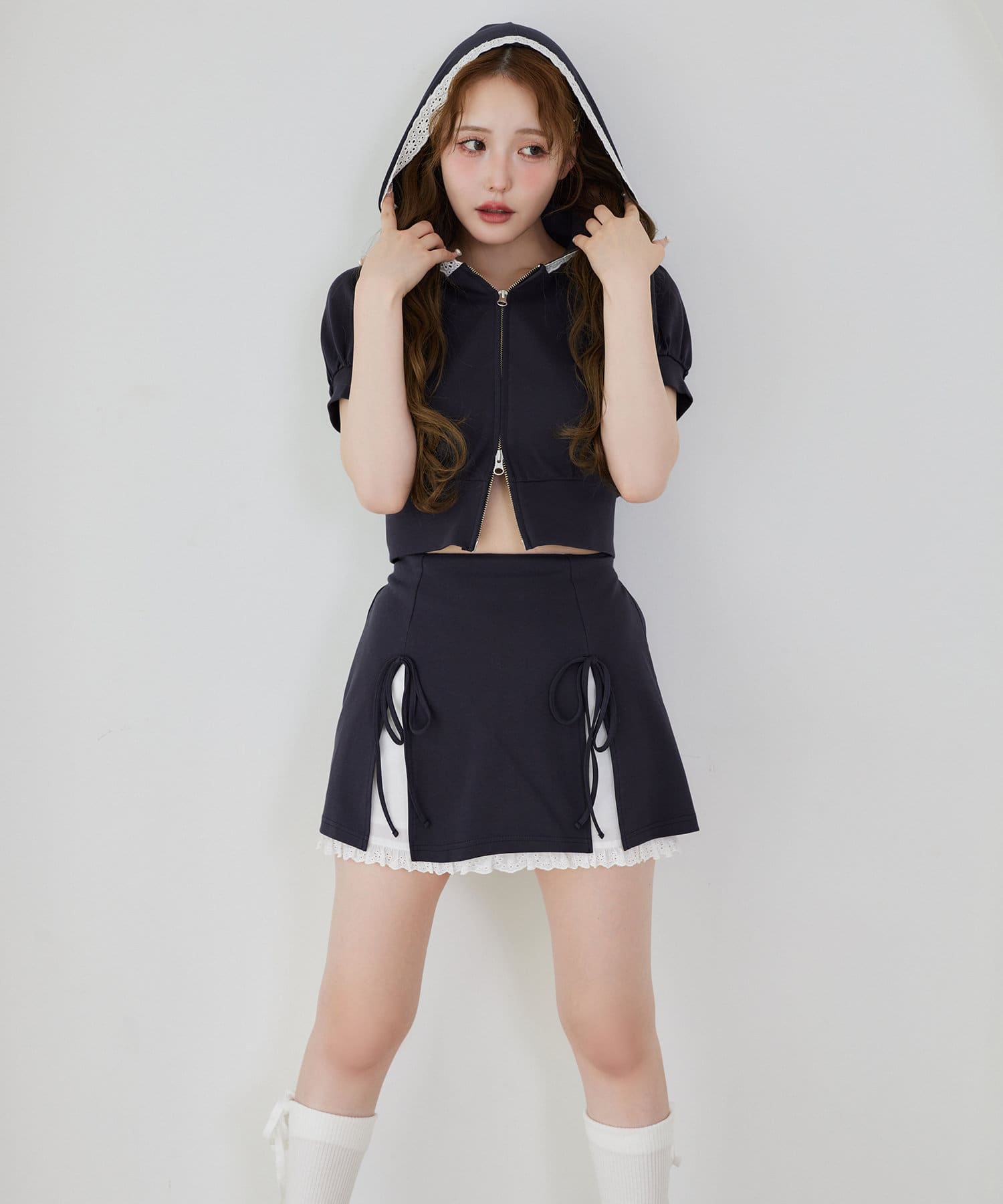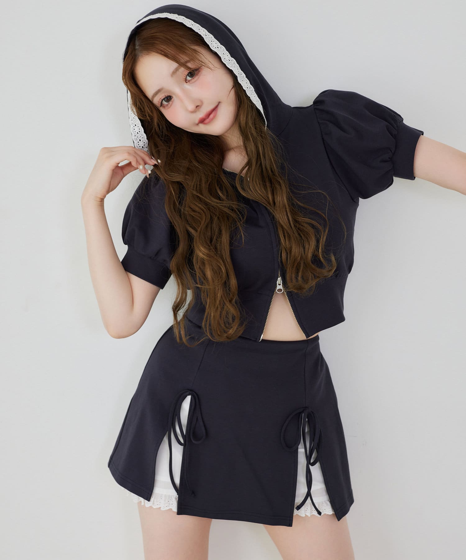 フード部分には繊細なレースを施し、スポーティーなデザインにフェミニンなアクセントをプラス。