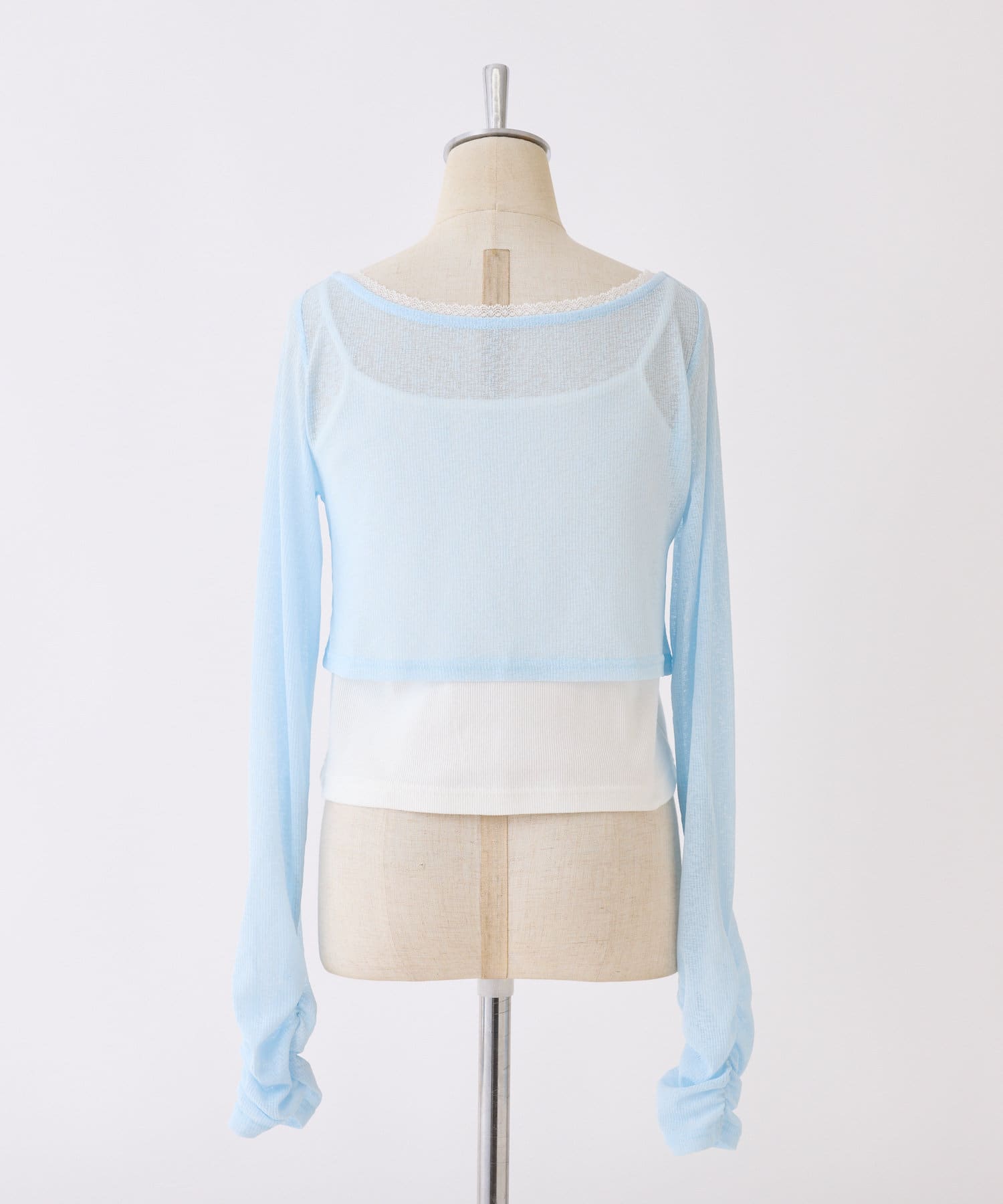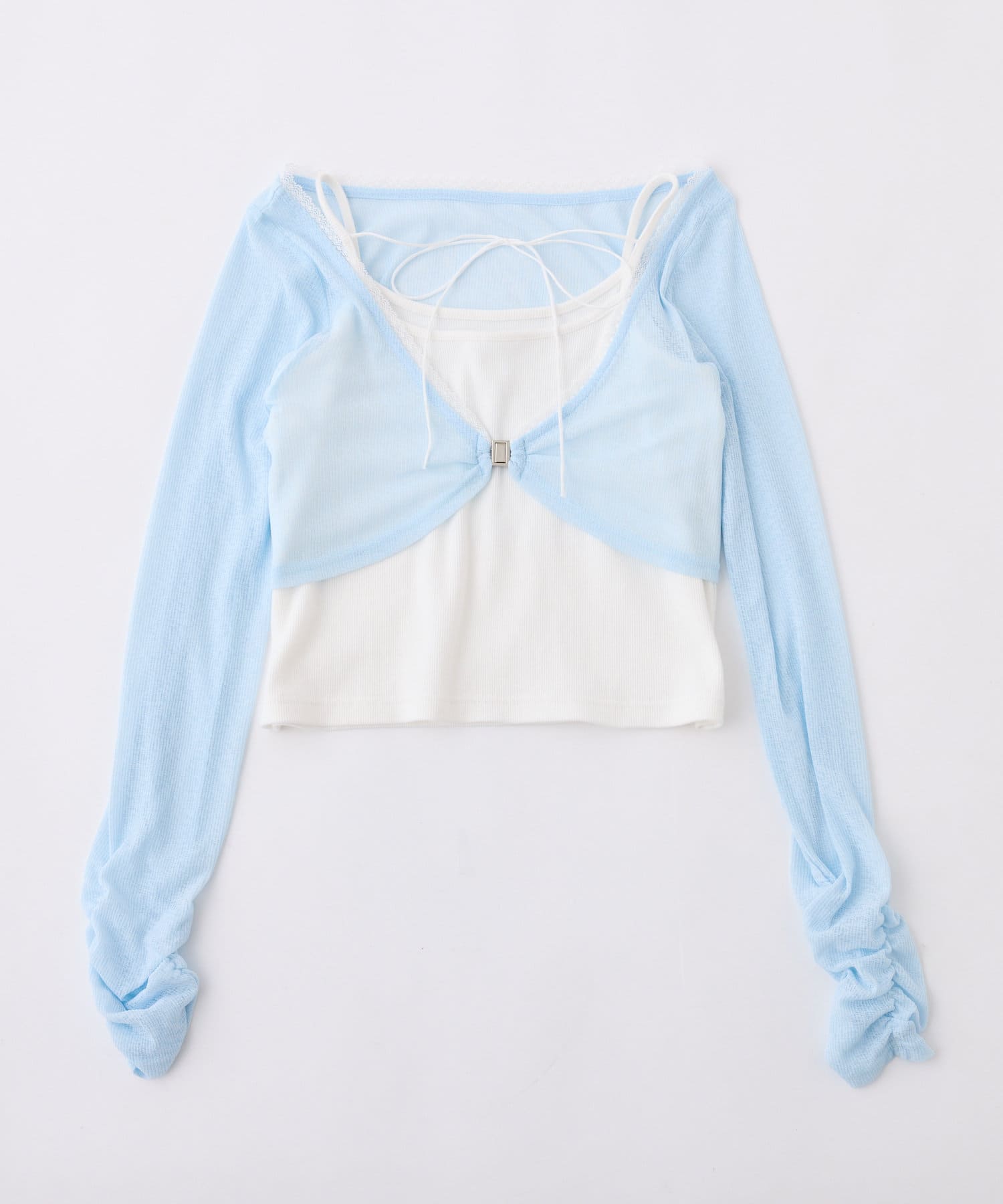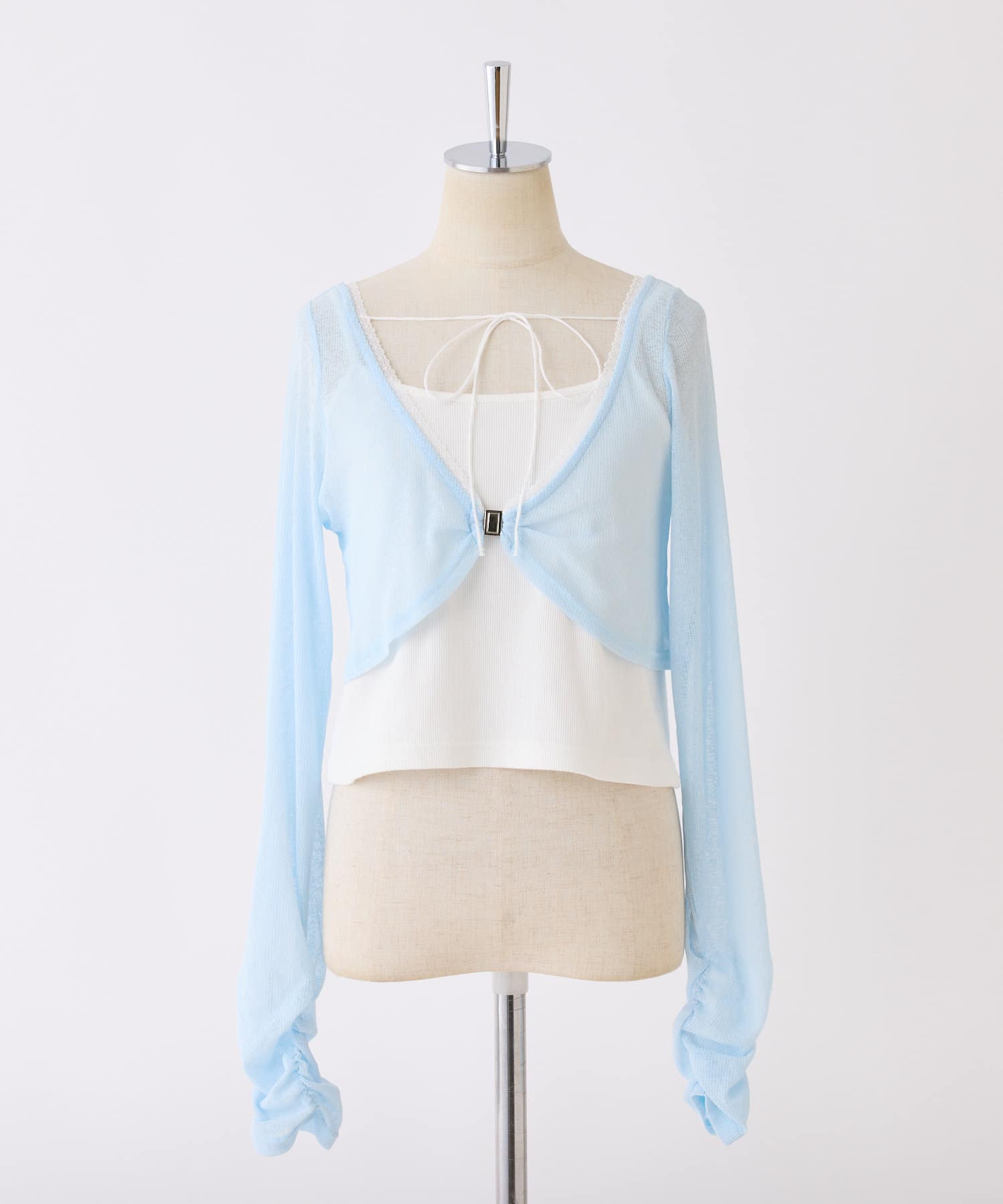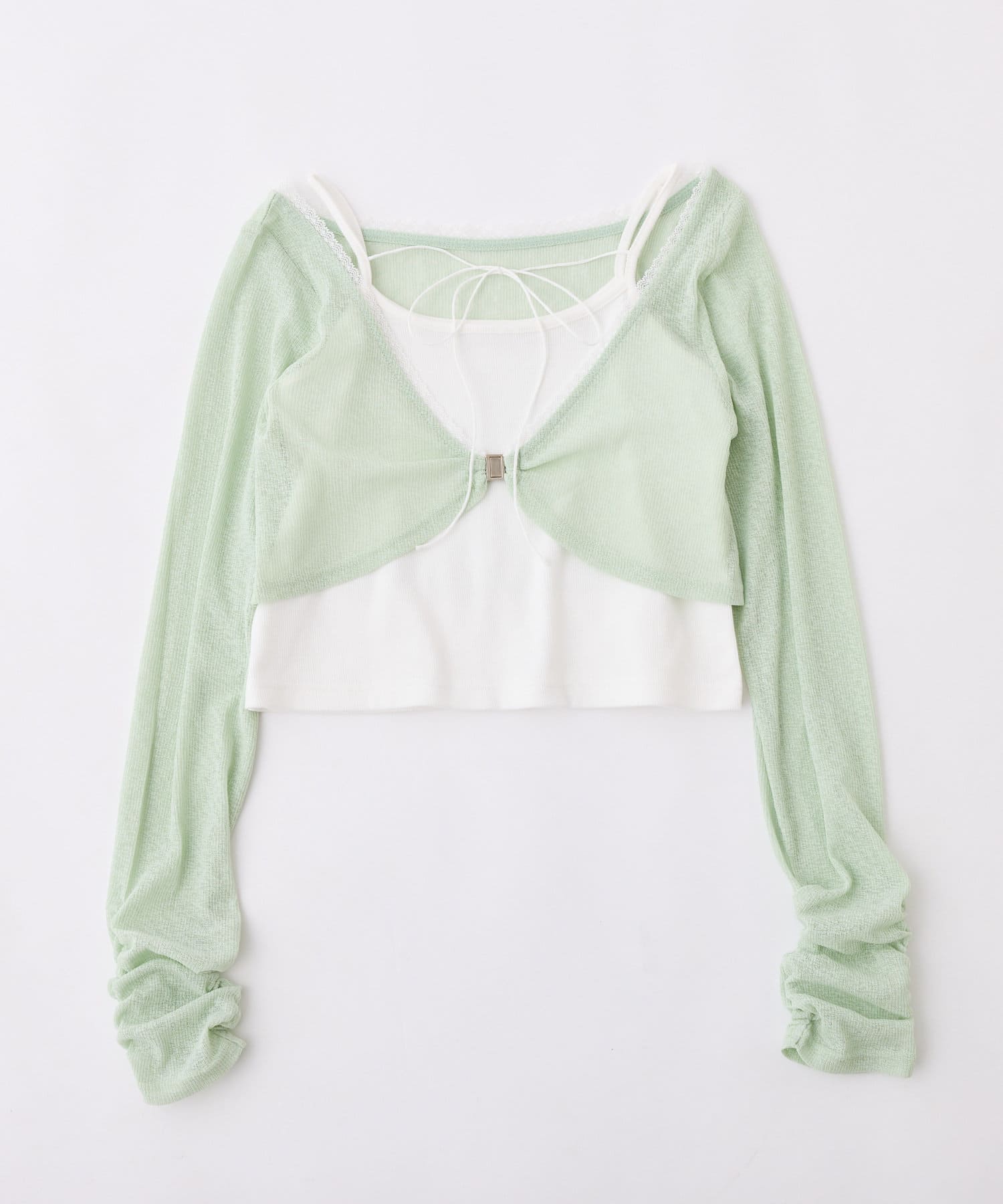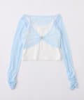 程よい透け感のシアーボレロとシンプルなキャミソールがセットになった、着回し力抜群のアイテム。