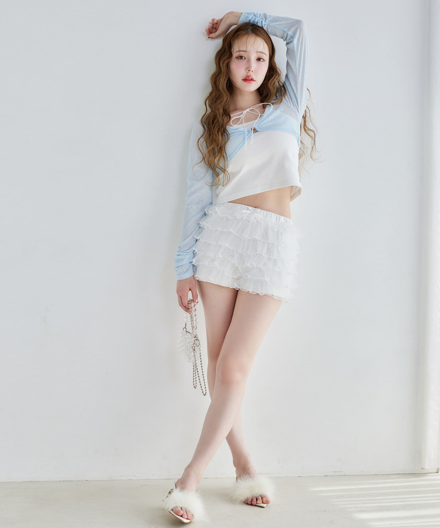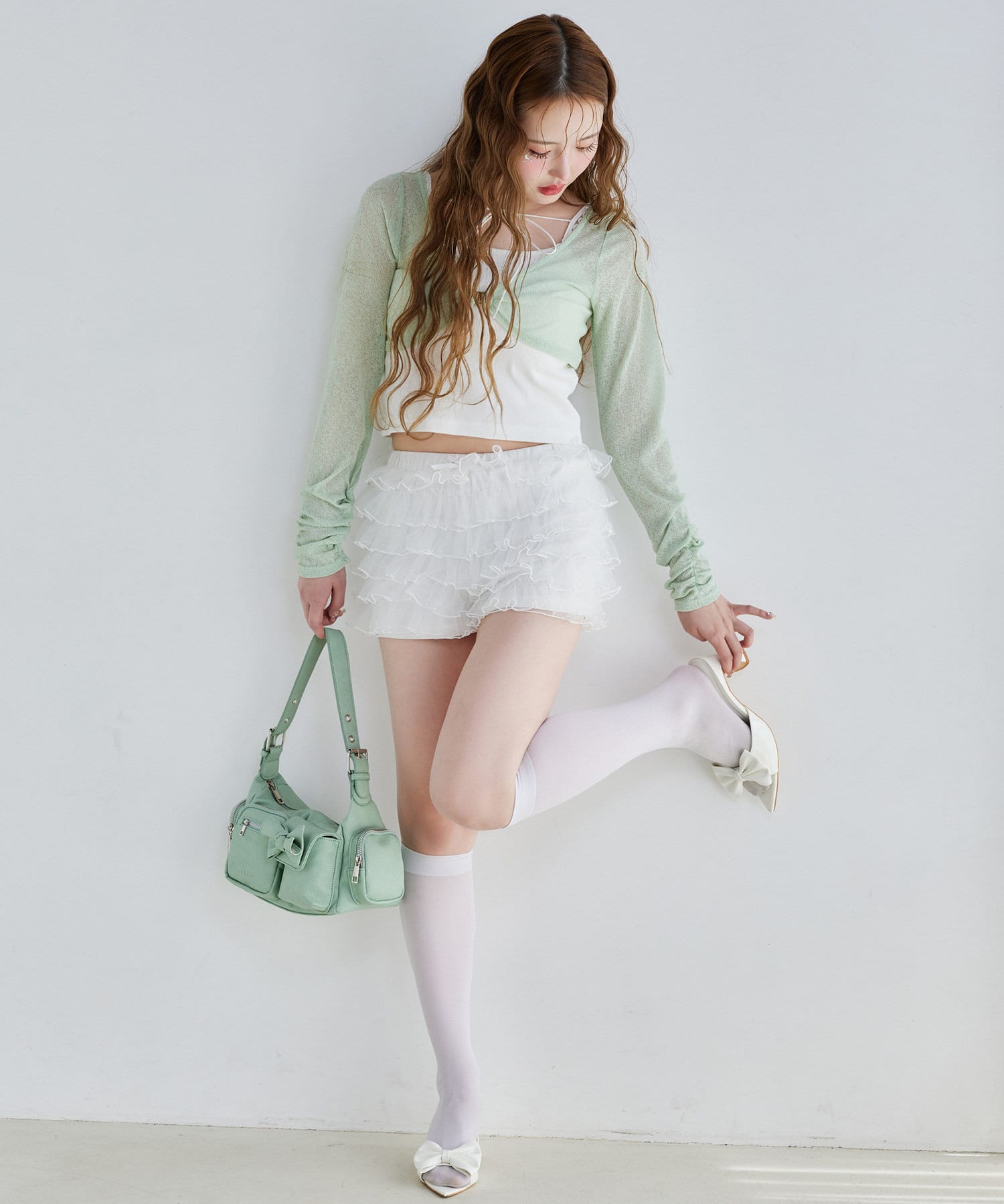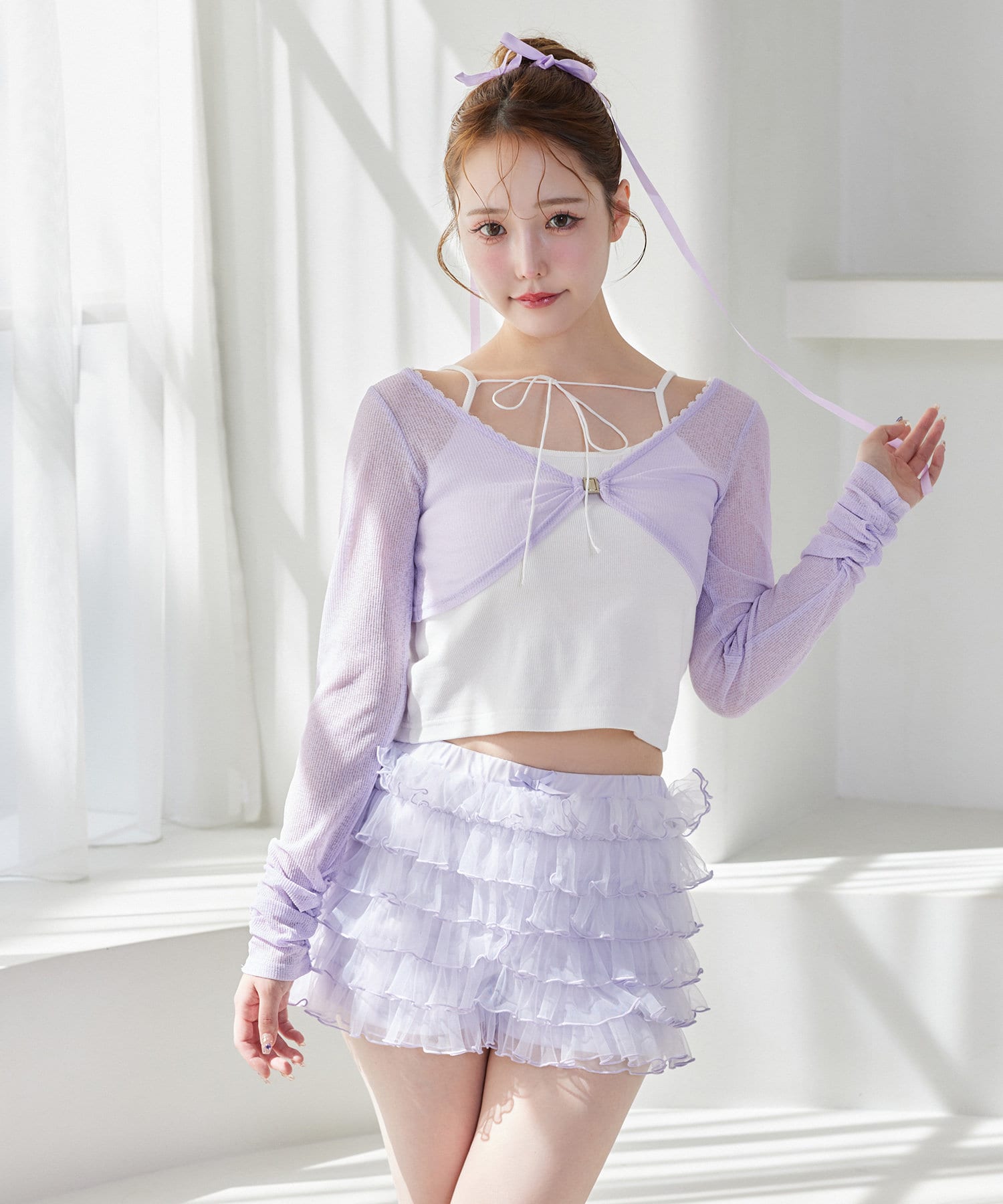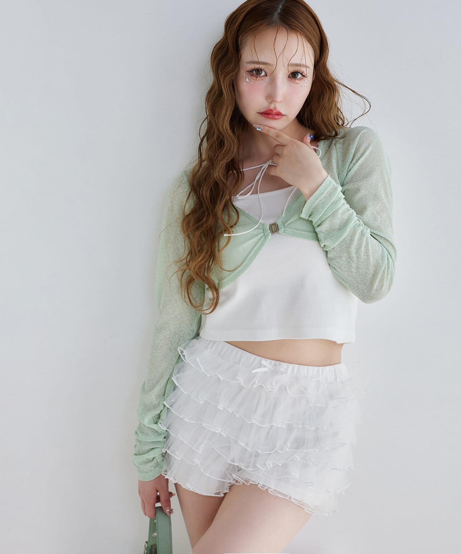 ボレロはショート丈でスタイルアップ効果◎キャミは細めの肩紐で華奢見えし、女性らしさを引き立てます。