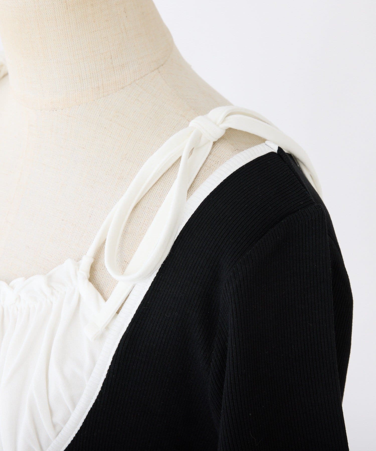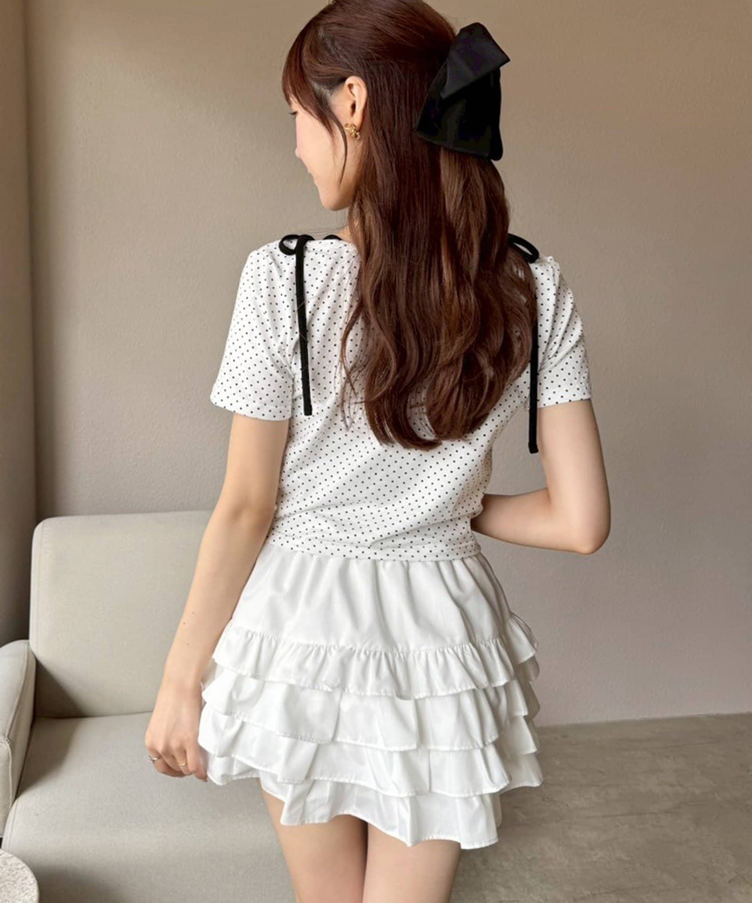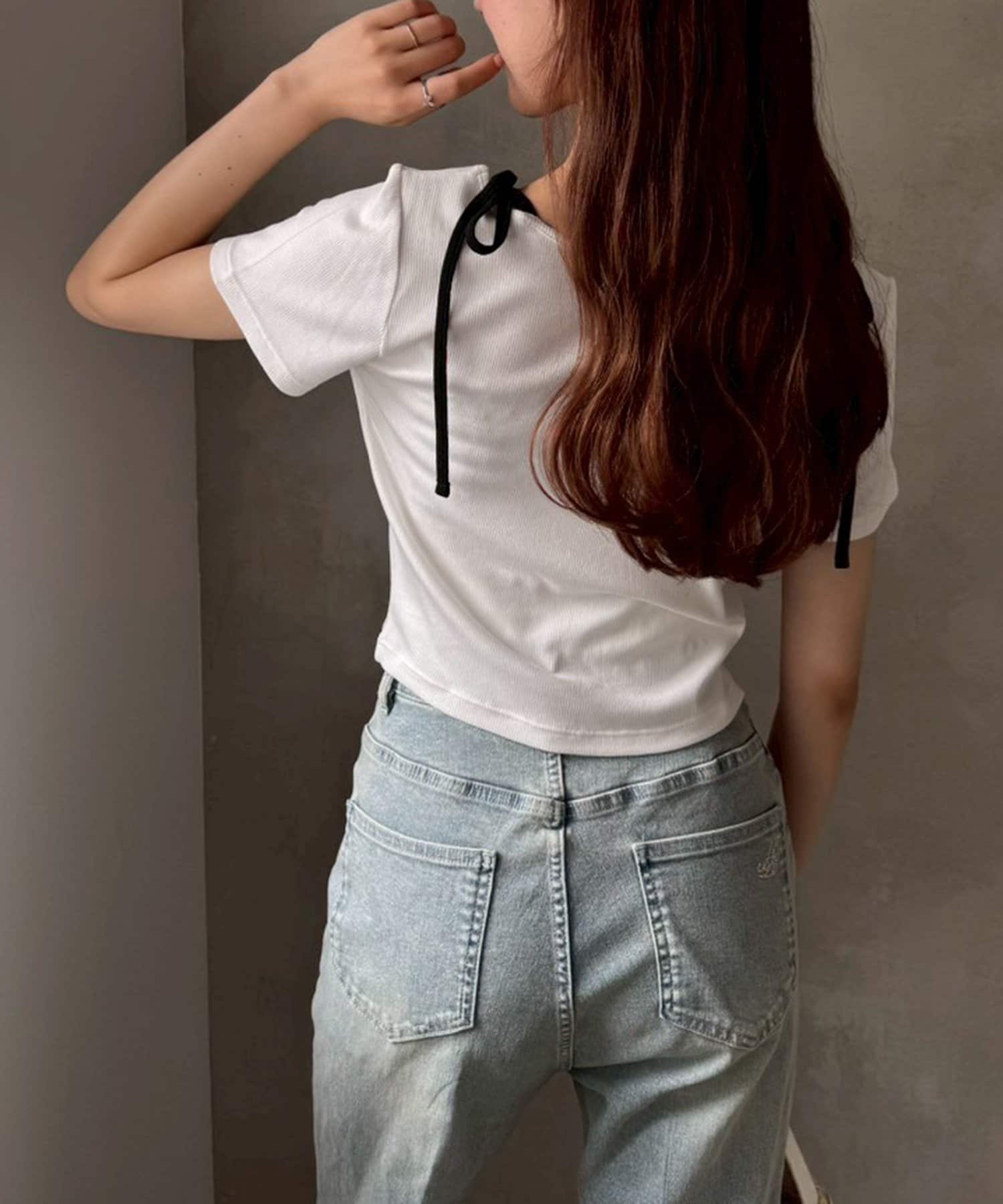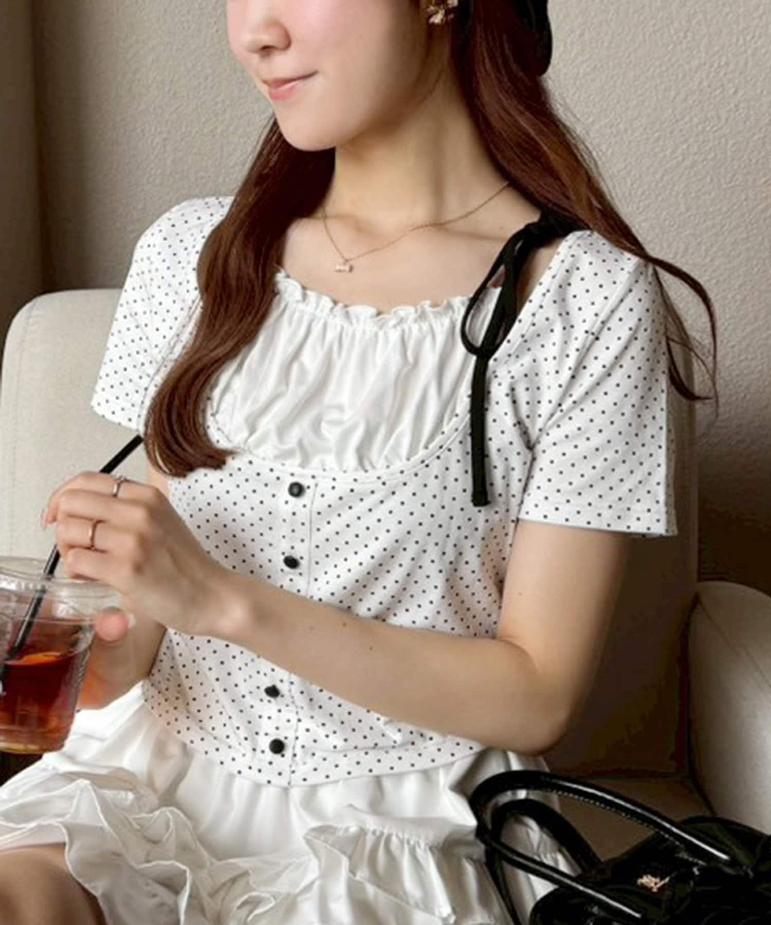 肩のリボンがシンプルなデザインの中に甘さをプラスしてくれます。