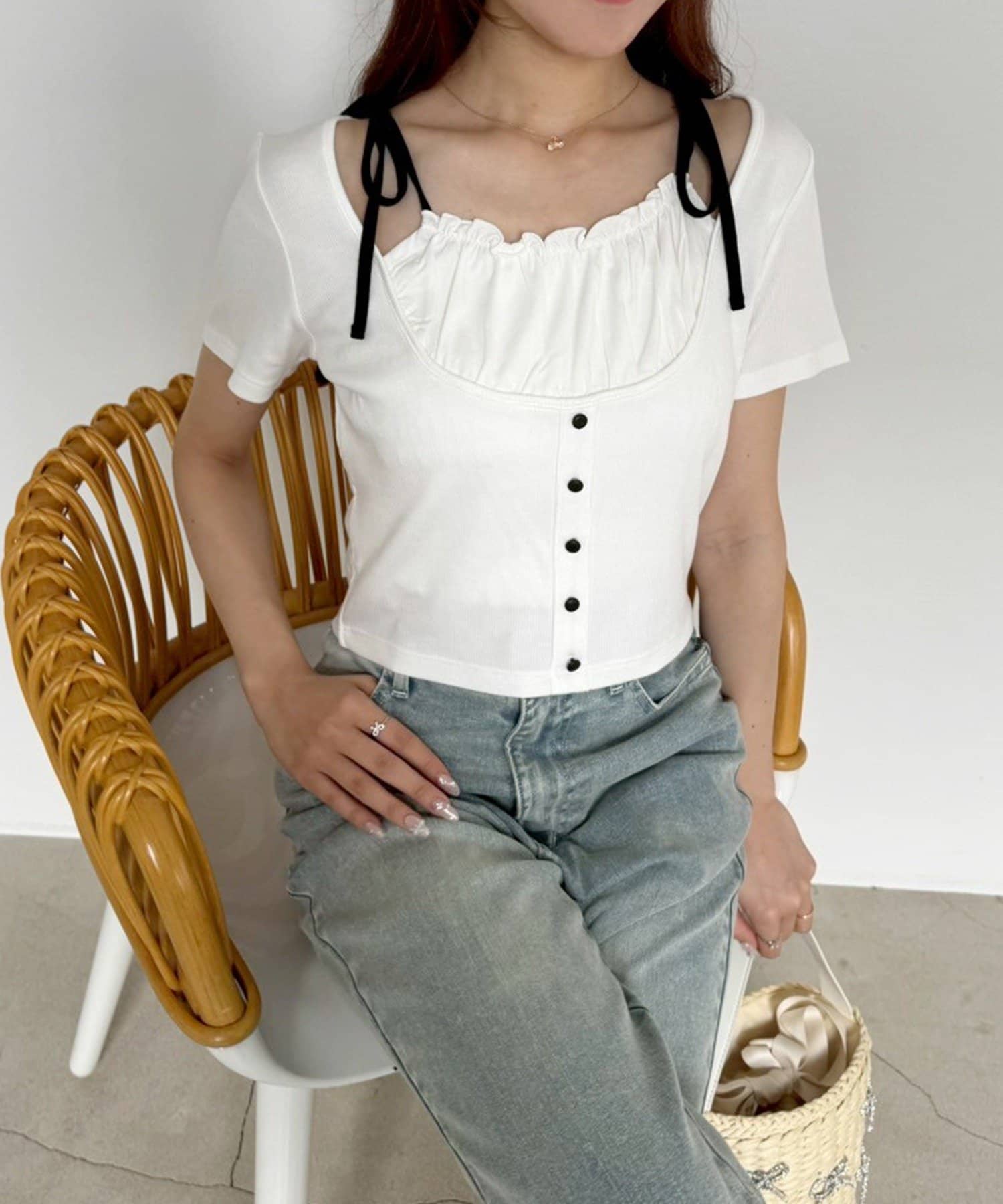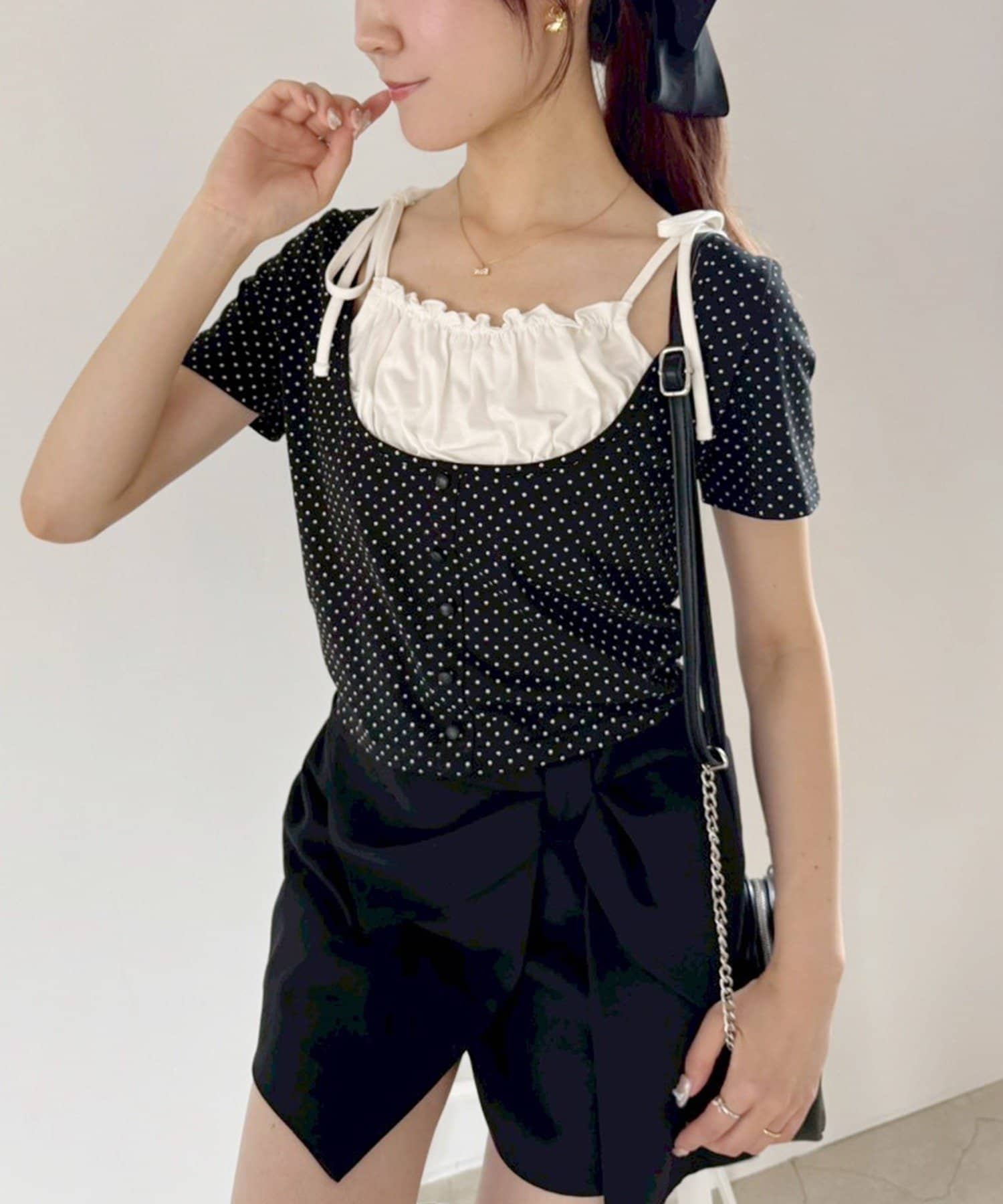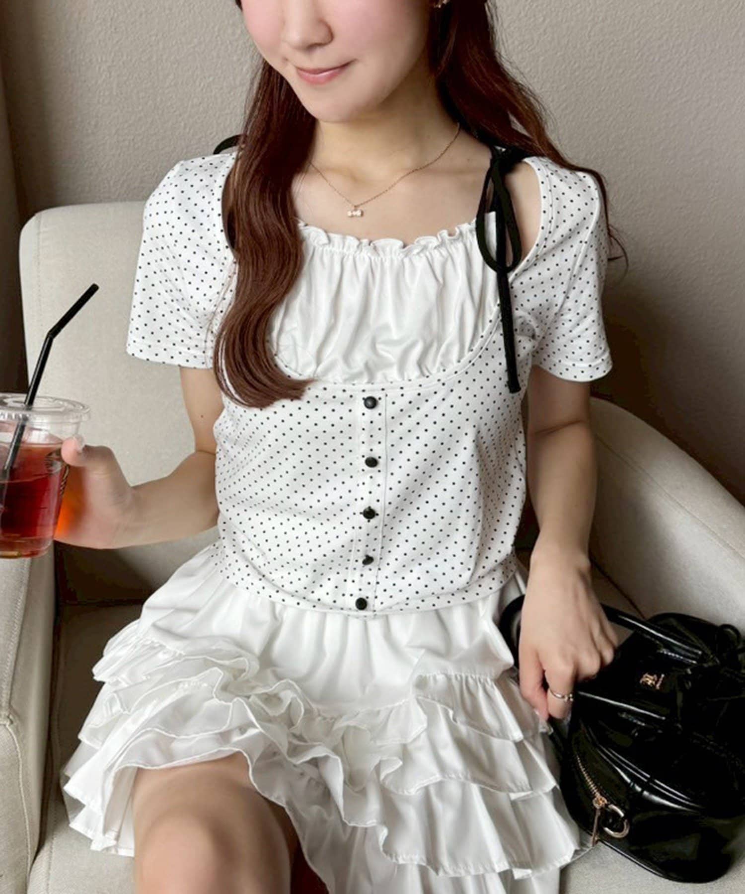 肩のリボンがシンプルなデザインの中に甘さをプラスしてくれます。
