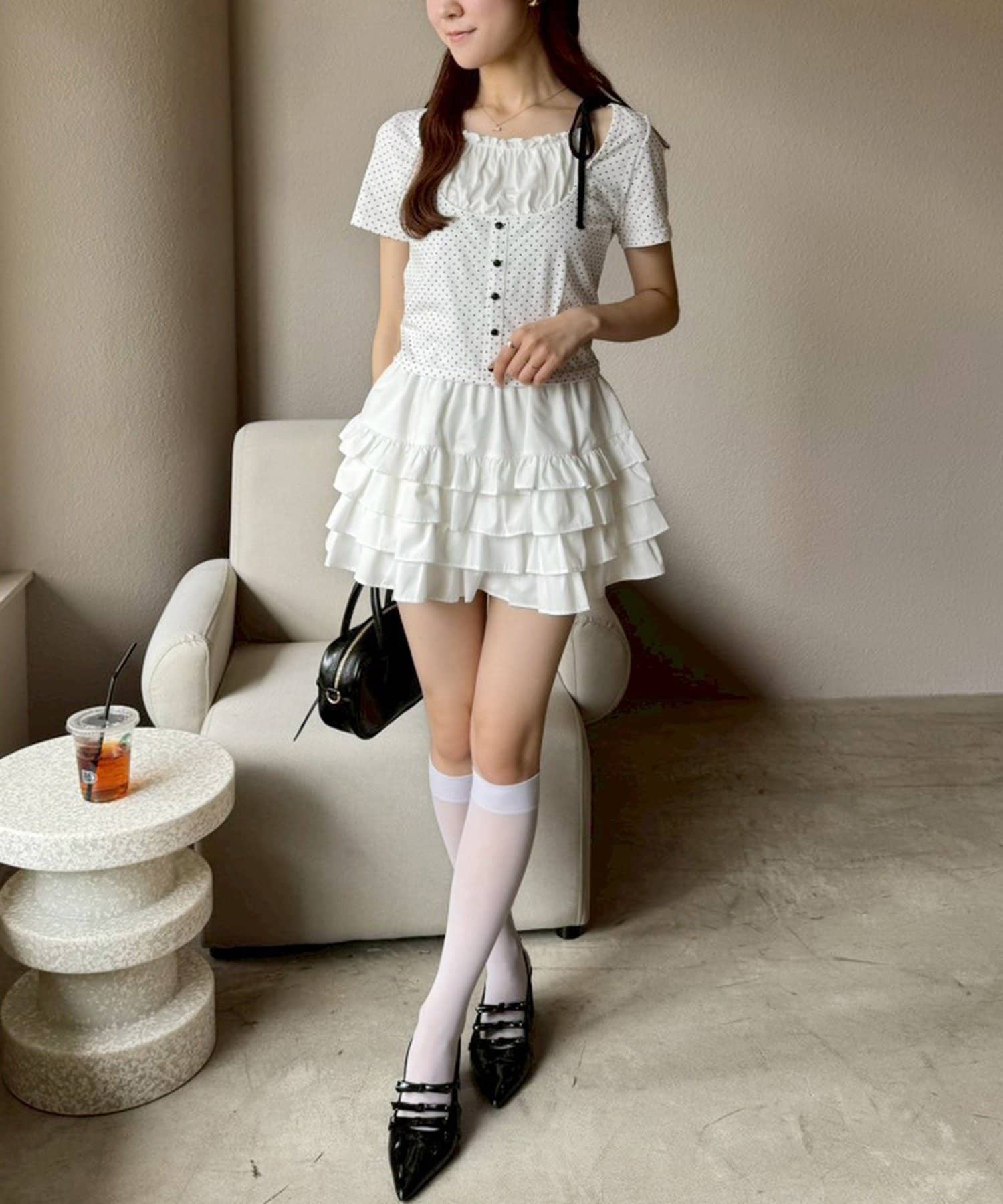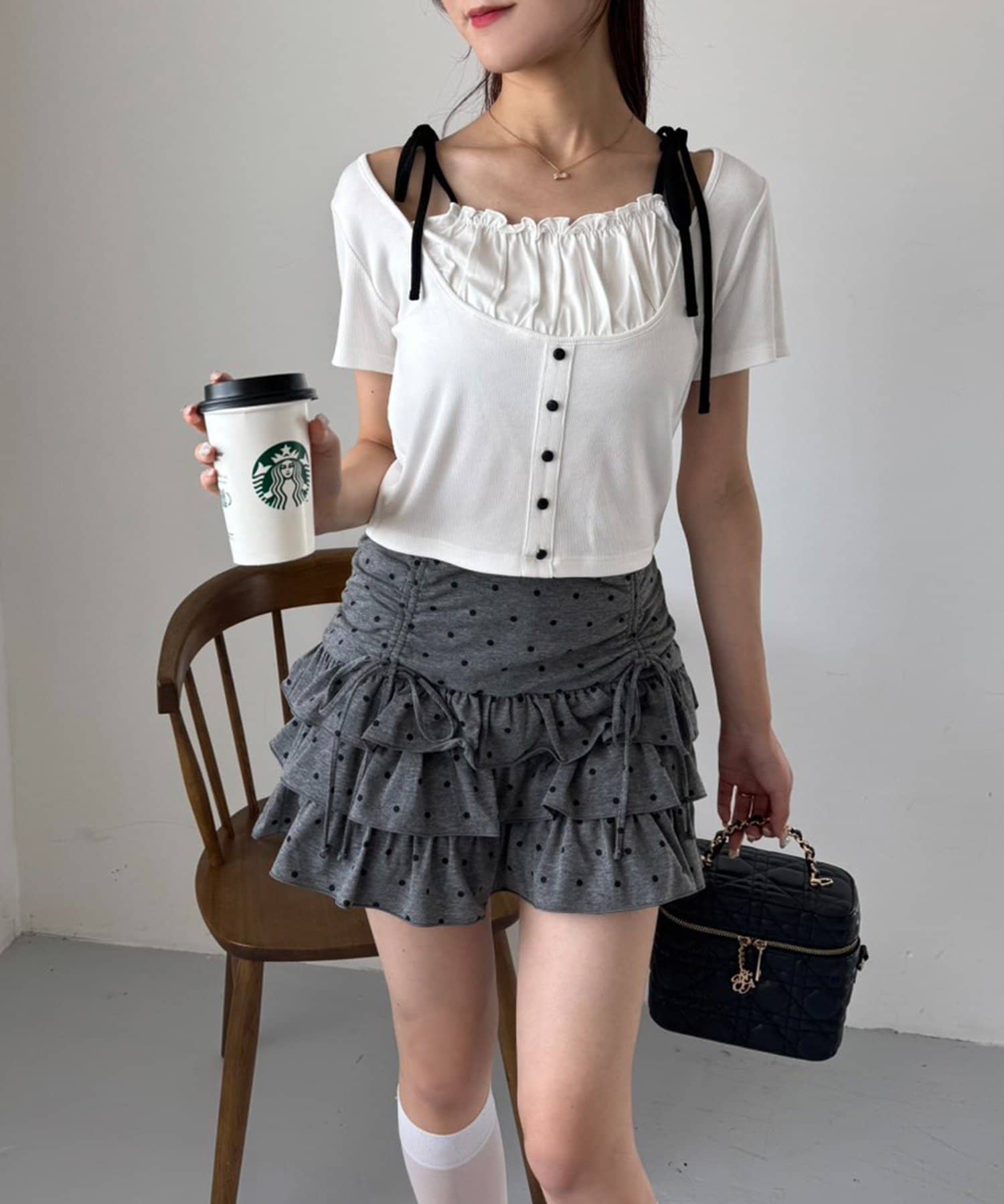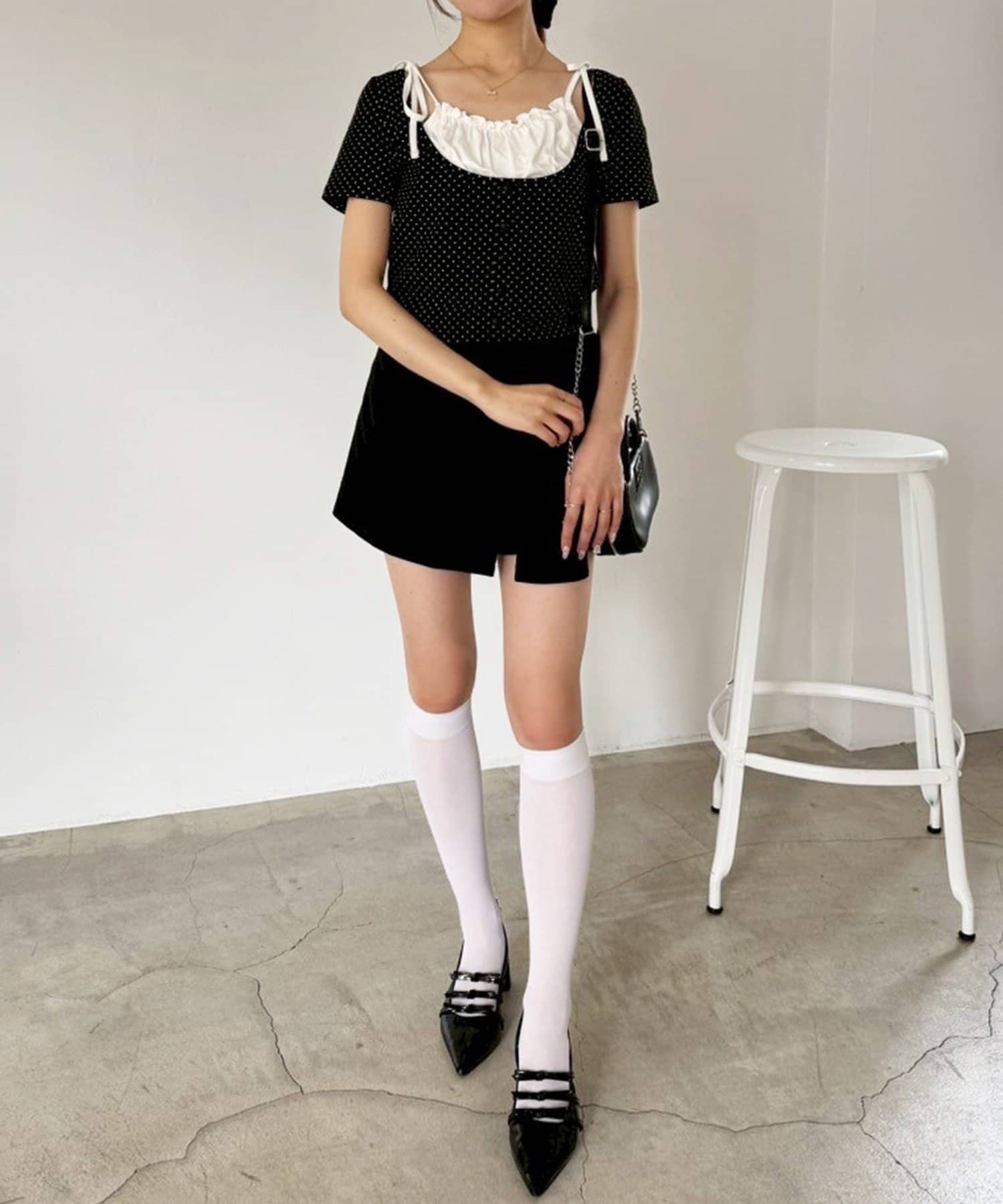 ミニ丈のスカートと合わせてトレンドのバレエコアスタイルもオススメです。