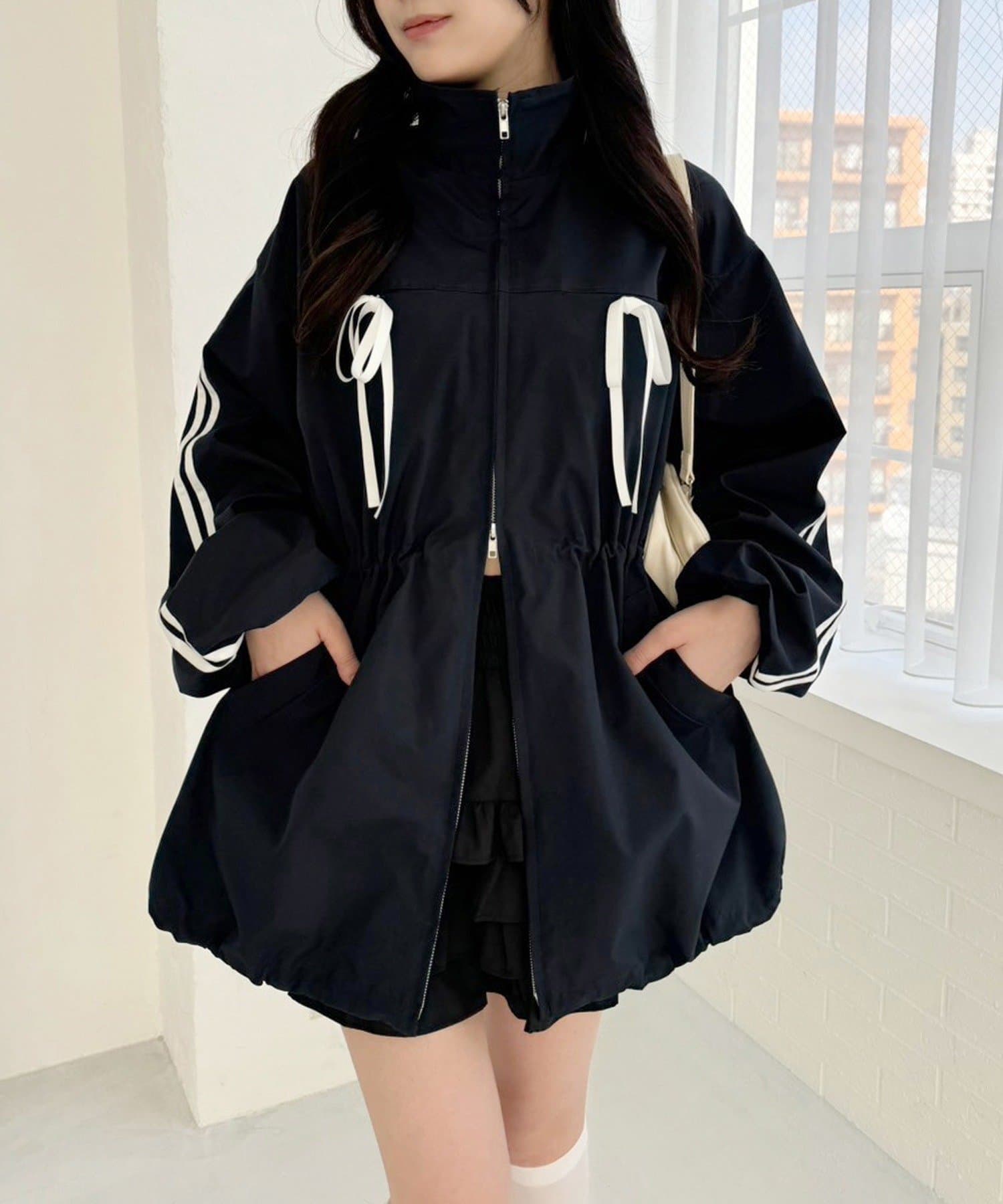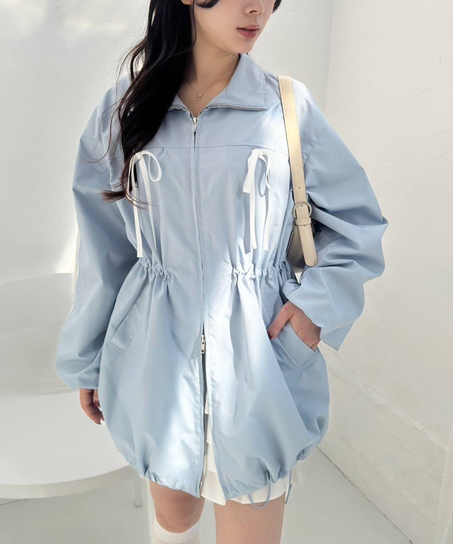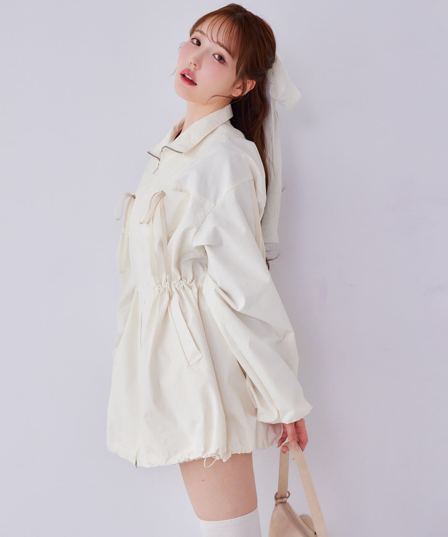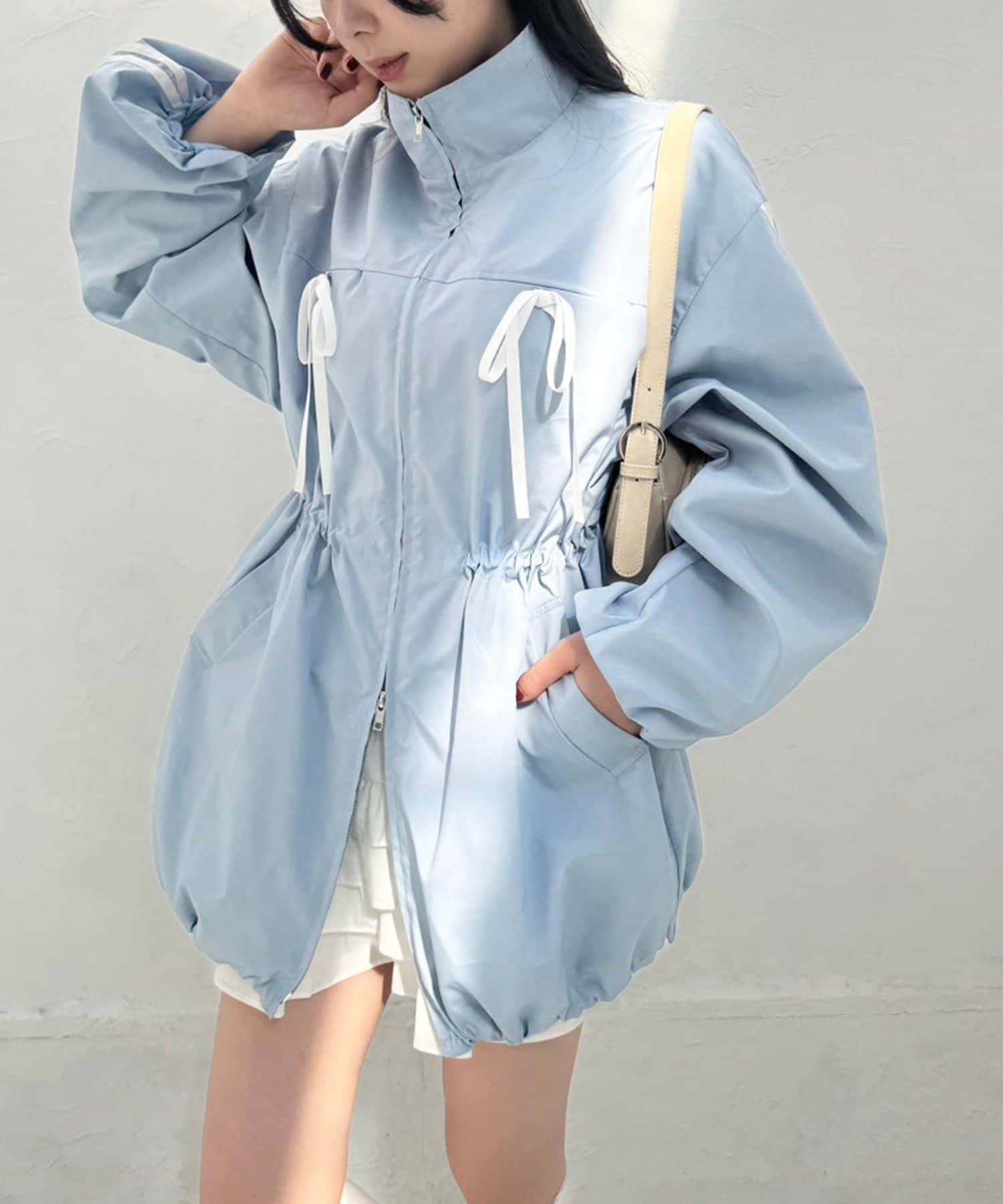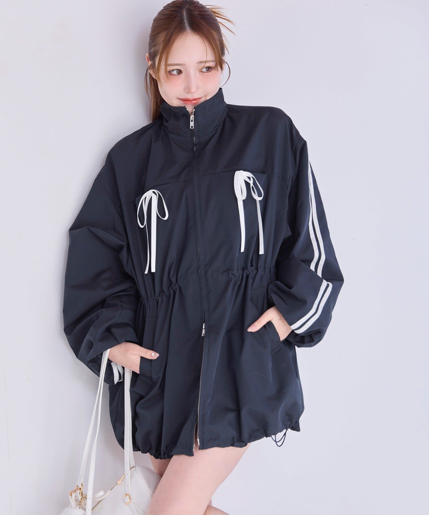 袖のラインと胸元のリボンがポイントのミドルブルゾン