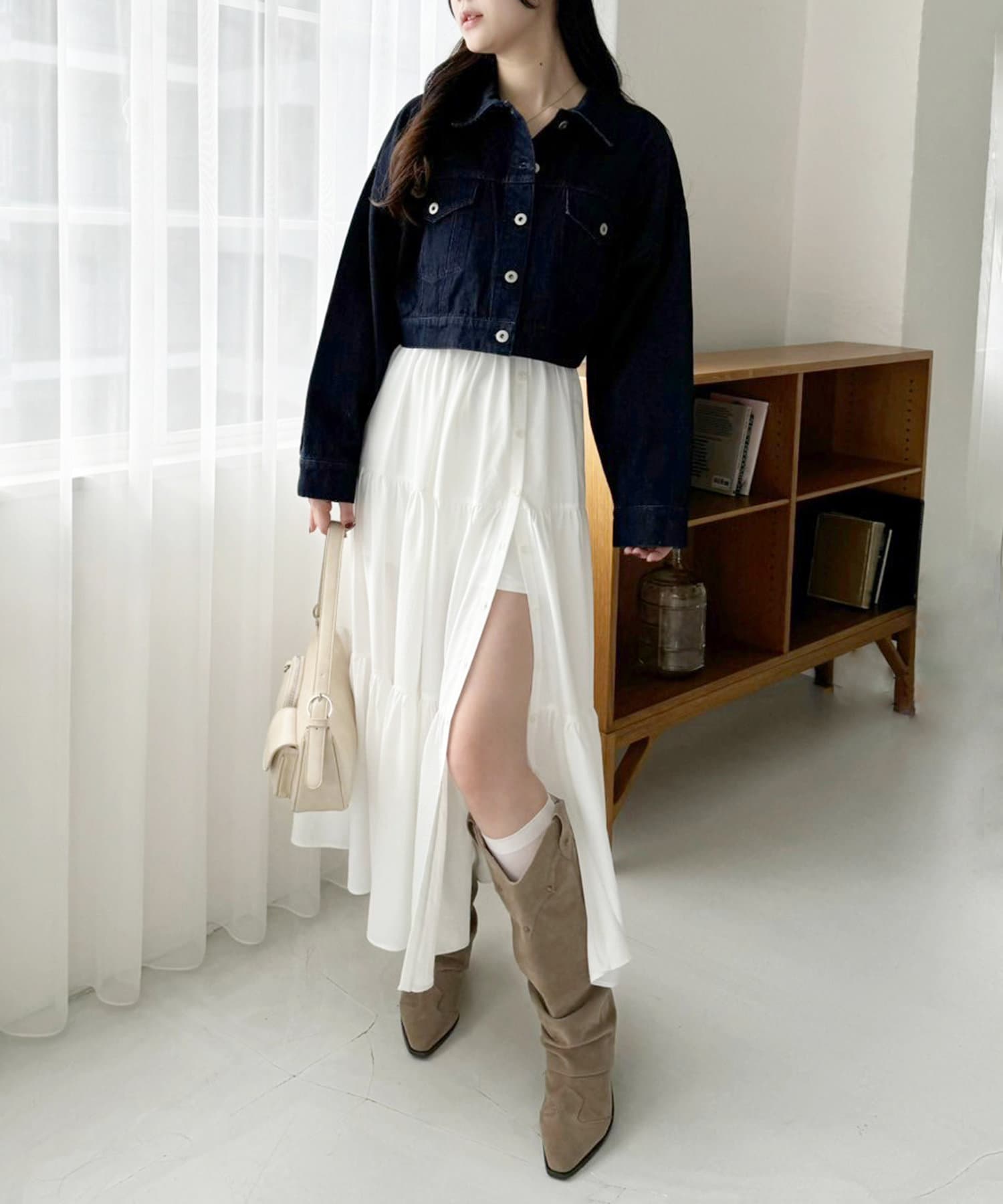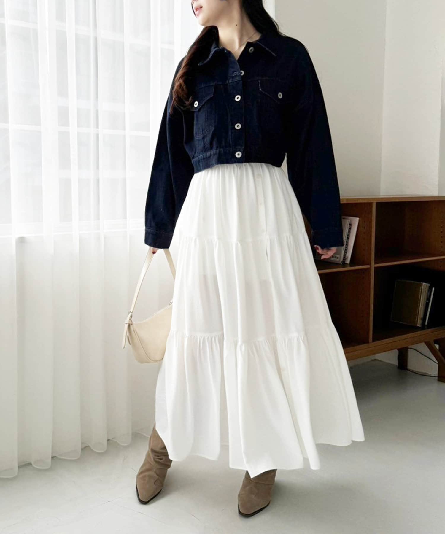 キレイめなコーデなら、フレアスカートやワンピースに合わせるのがオススメ。
