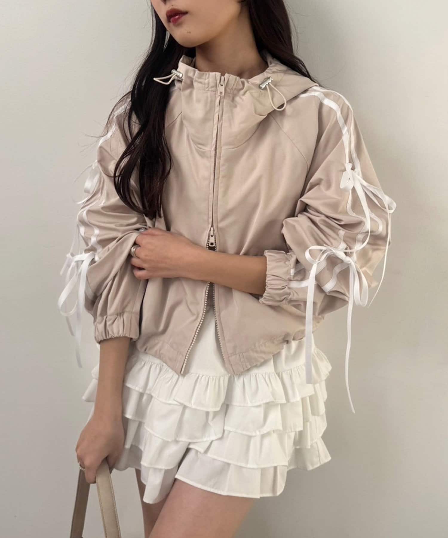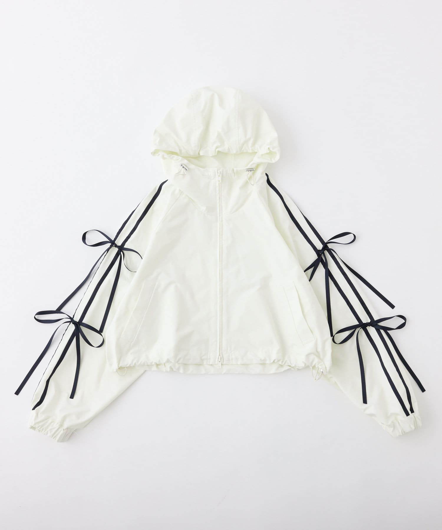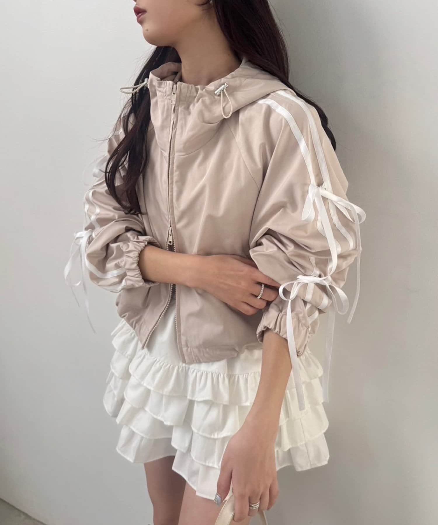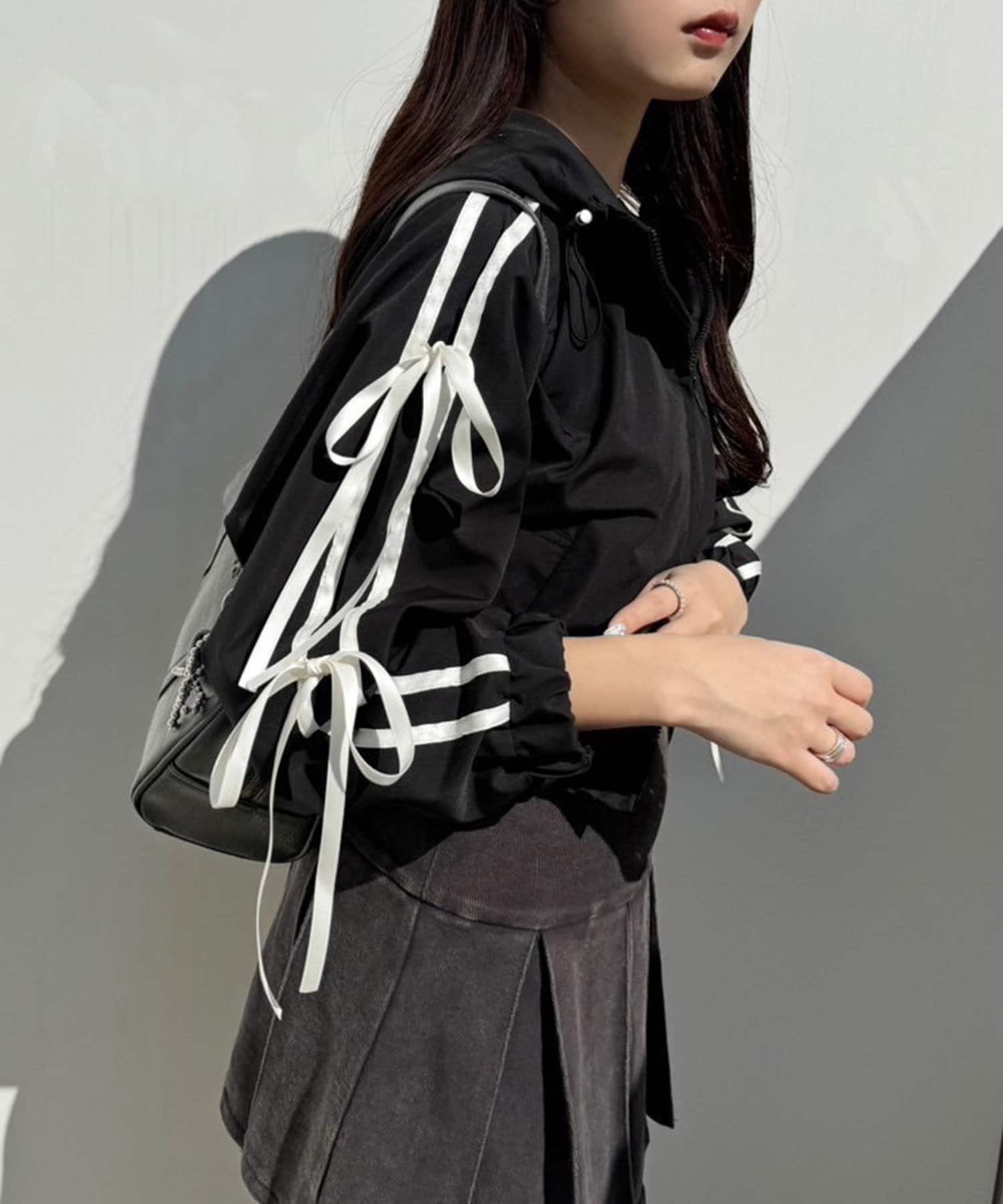 スポーティーな印象のマウンテンパーカーに、袖口にリボンデザインを施し、甘さを取り入れた大人かわいいアイテムに仕上げました。