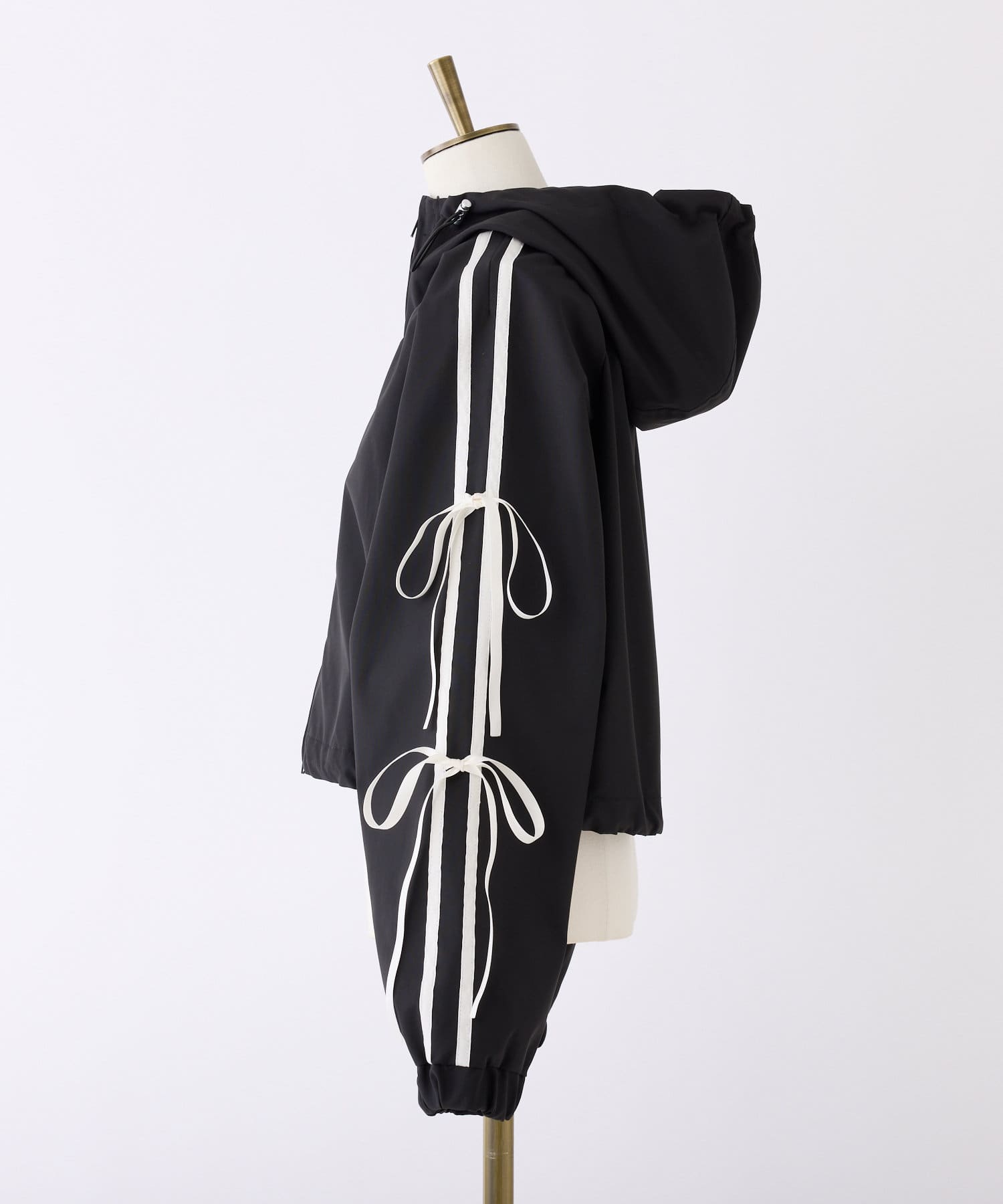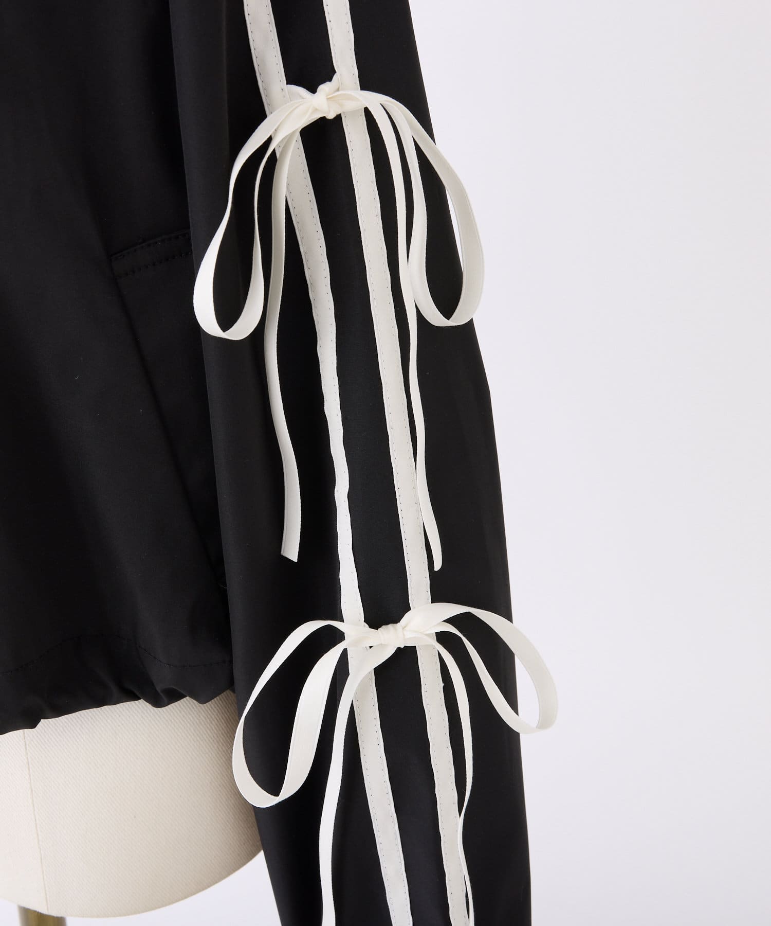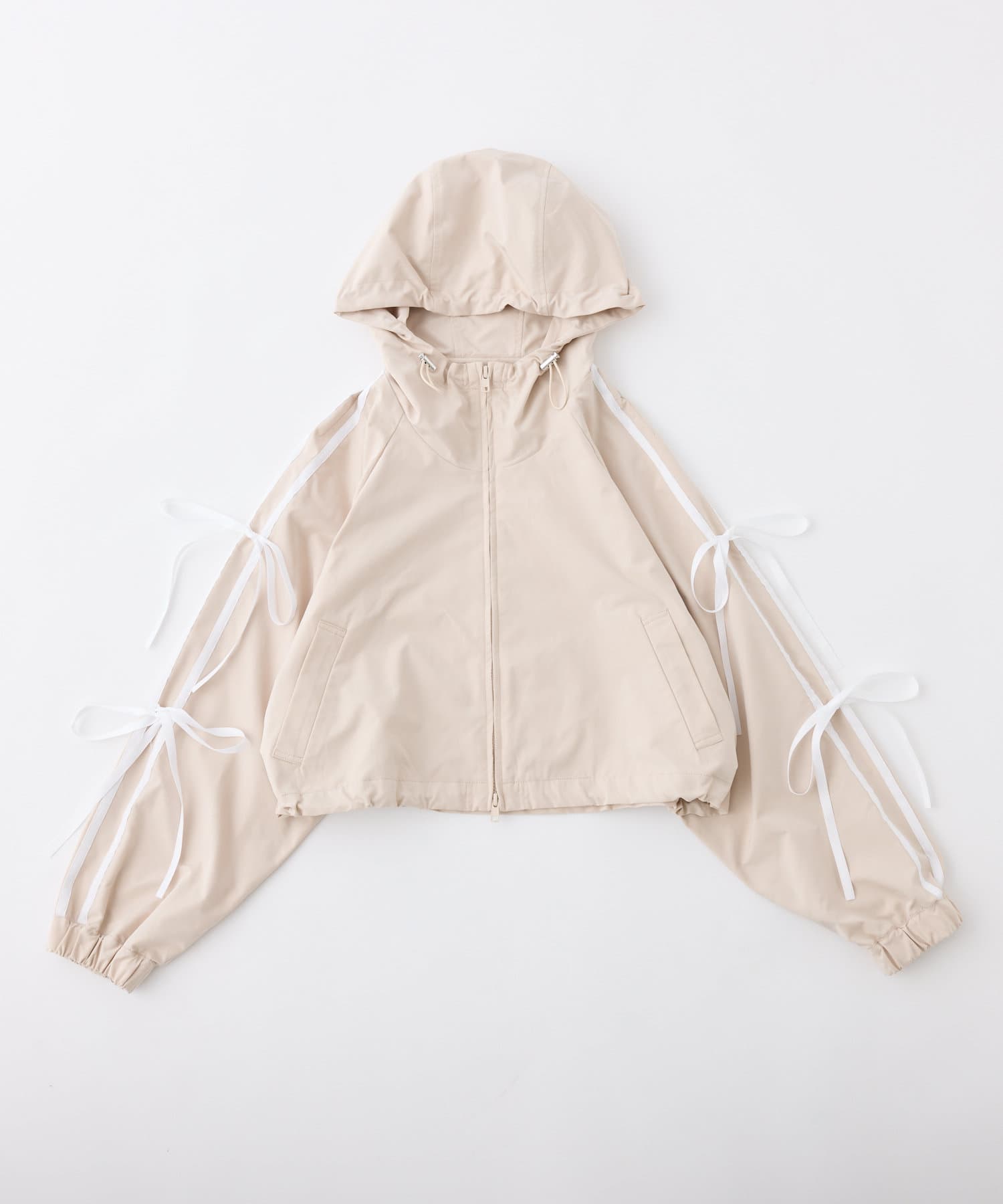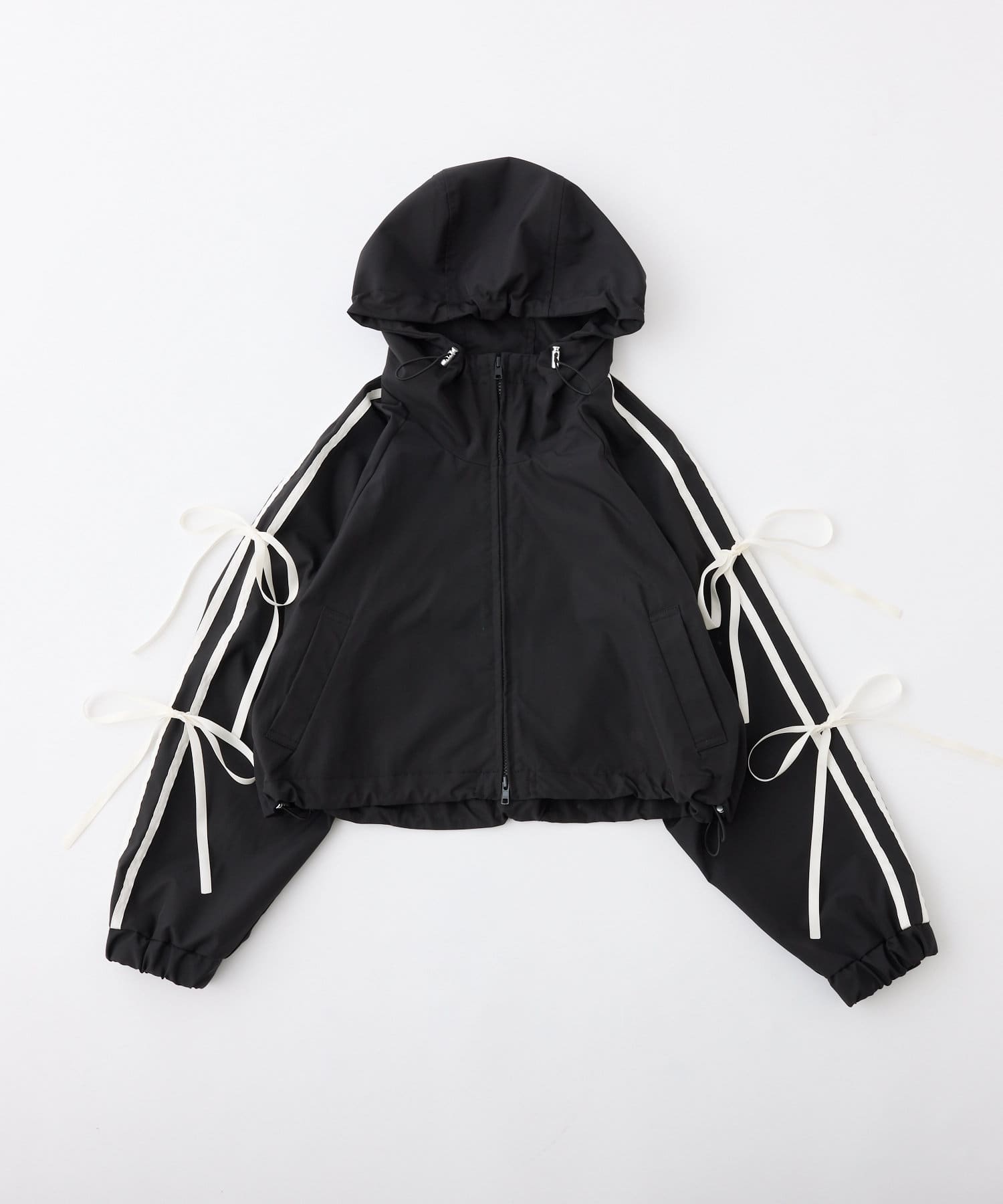 スポーティーな印象のマウンテンパーカーに、袖口にリボンデザインを施し、甘さを取り入れた大人かわいいアイテムに仕上げました。