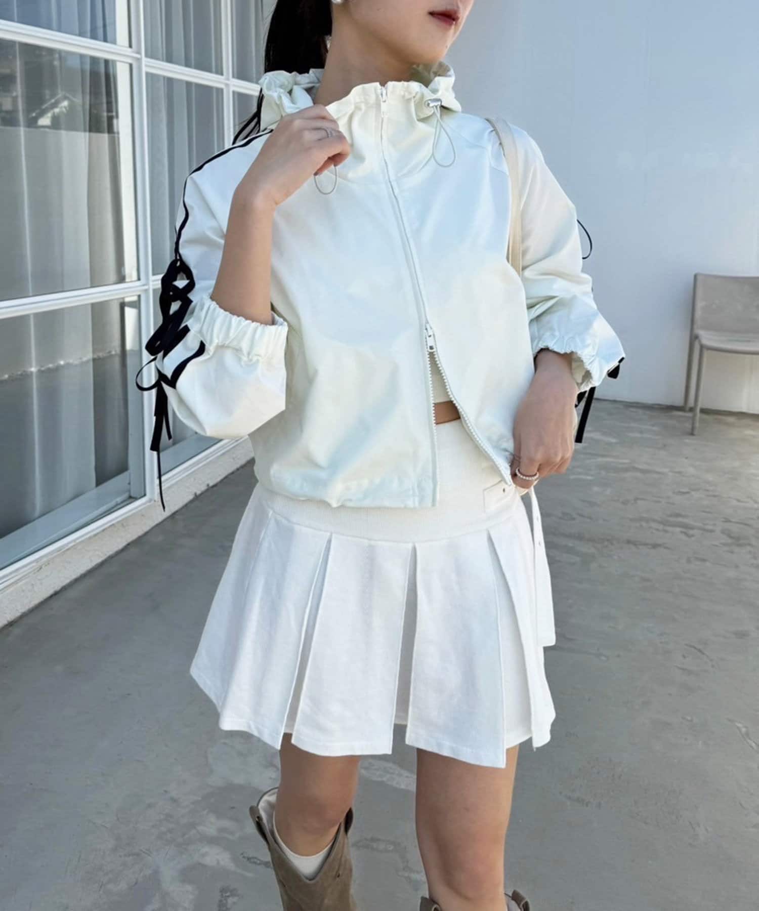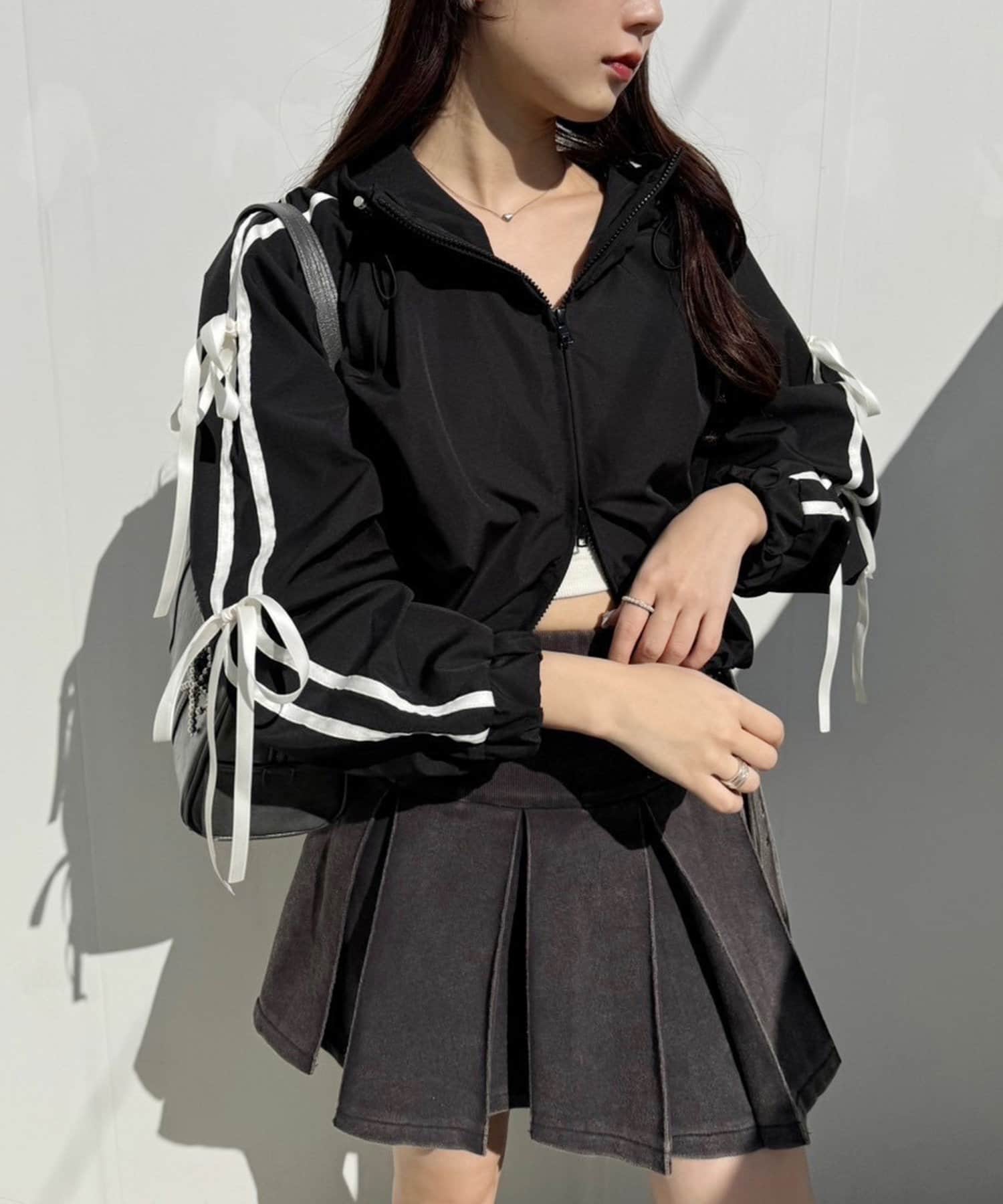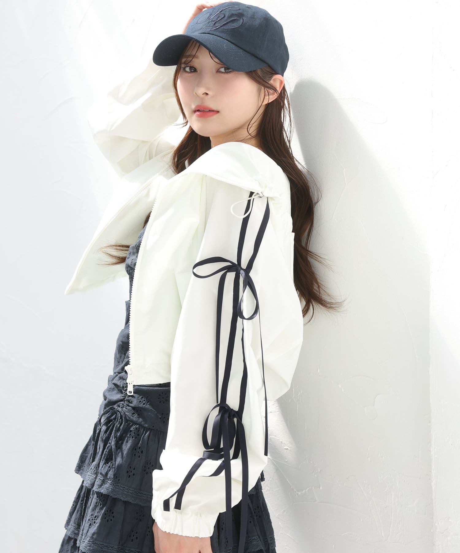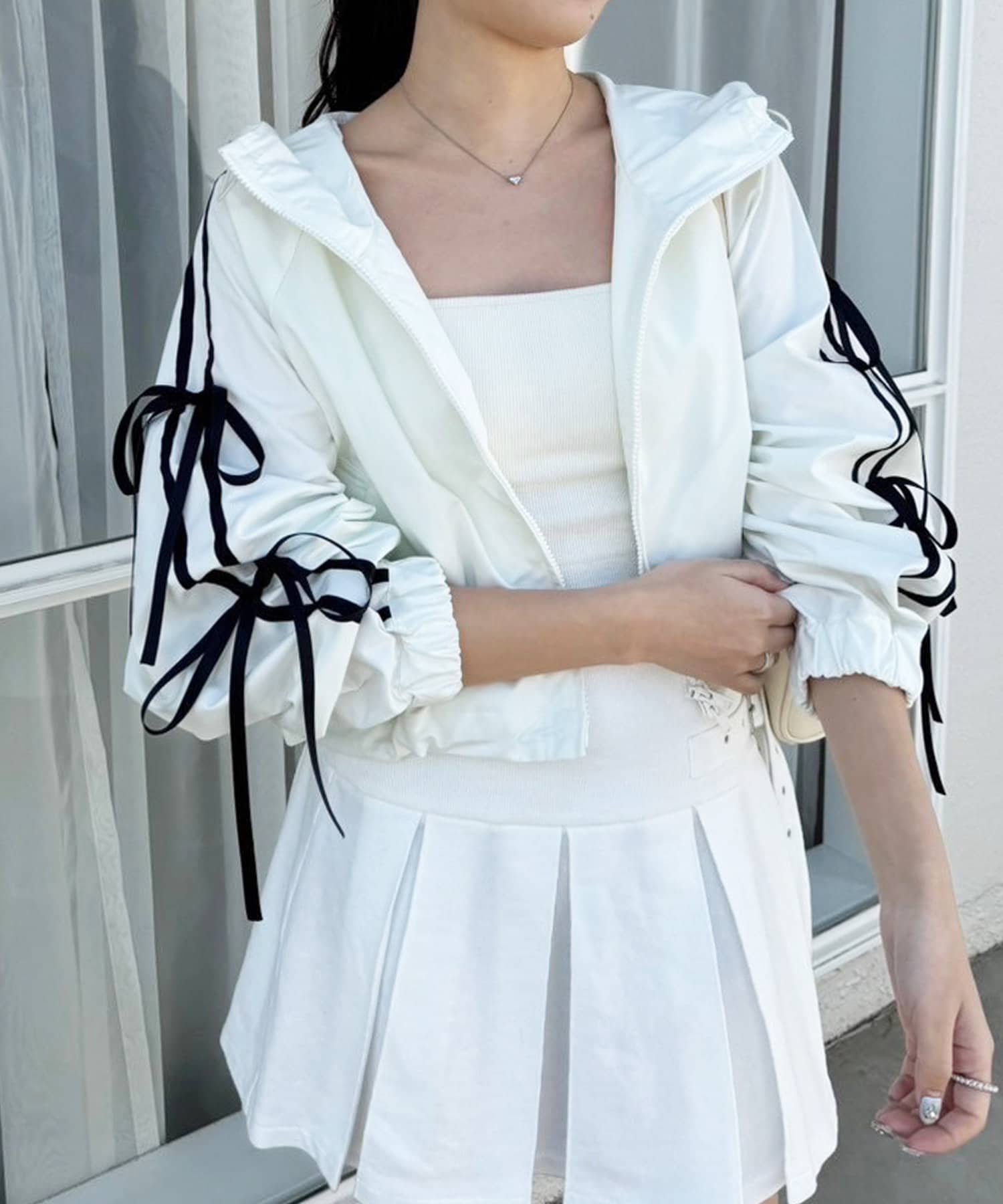 スポーティーな印象のマウンテンパーカーに、袖口にリボンデザインを施し、甘さを取り入れた大人かわいいアイテムに仕上げました。