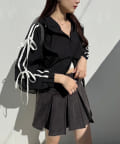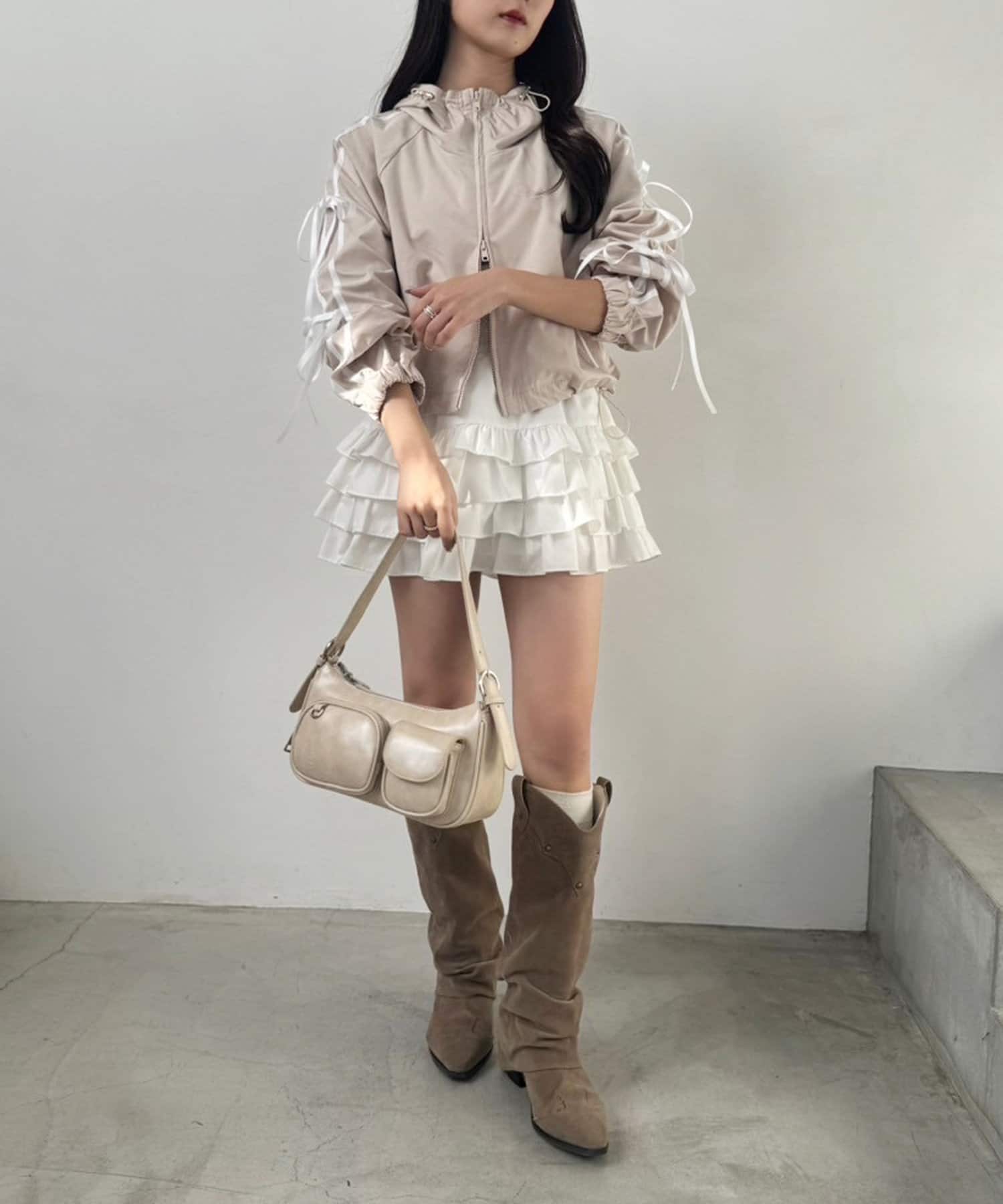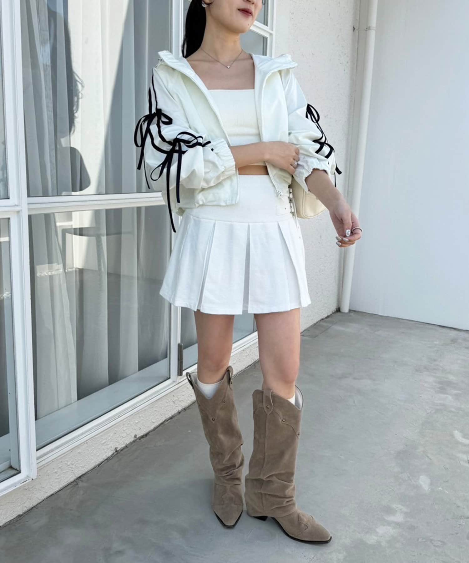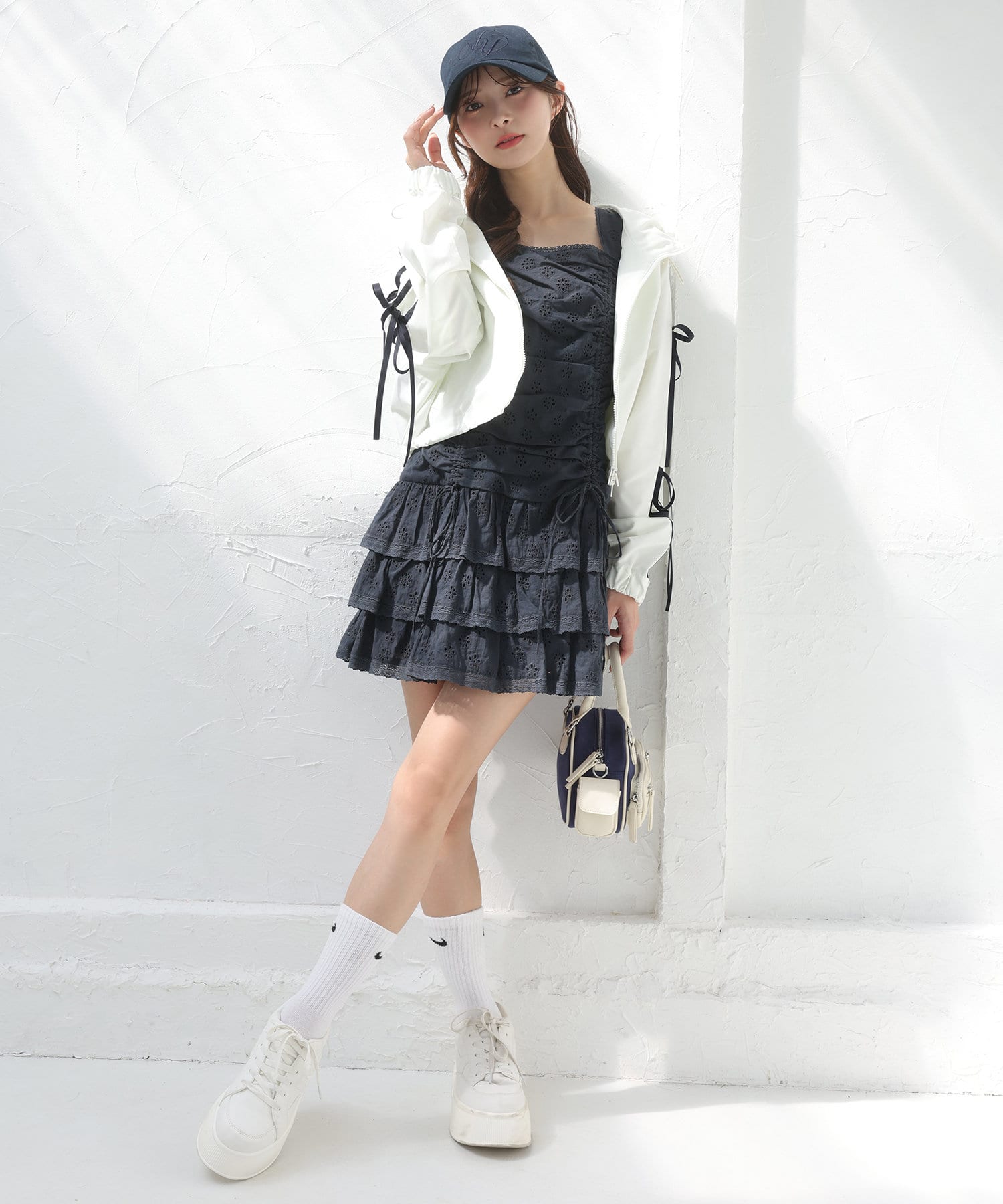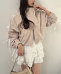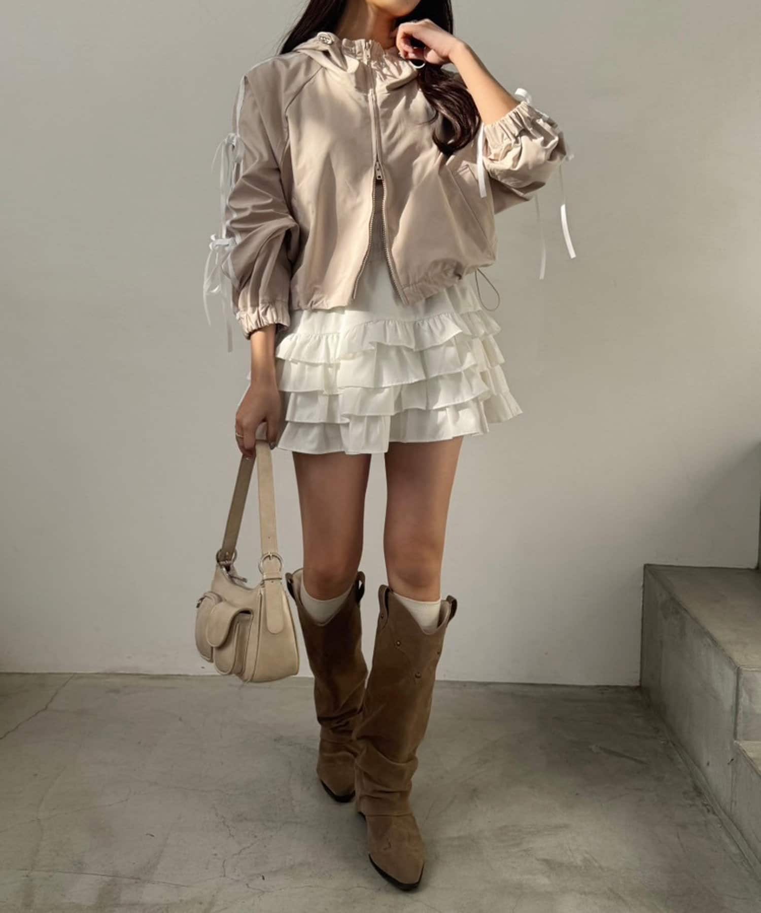 スポーティーな印象のマウンテンパーカーに、袖口にリボンデザインを施し、甘さを取り入れた大人かわいいアイテムに仕上げました。