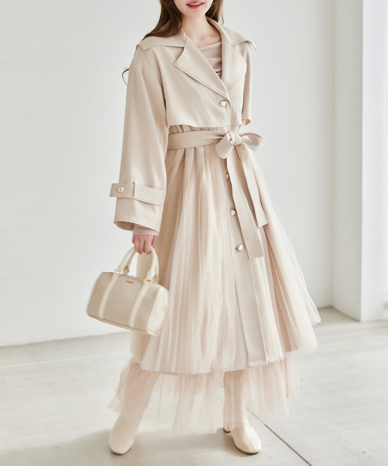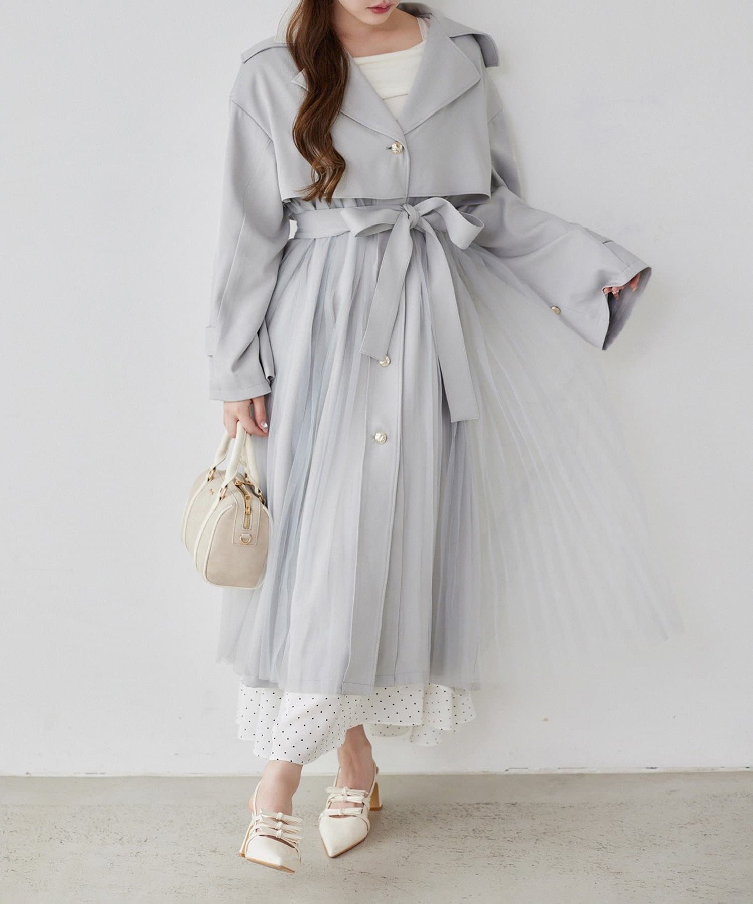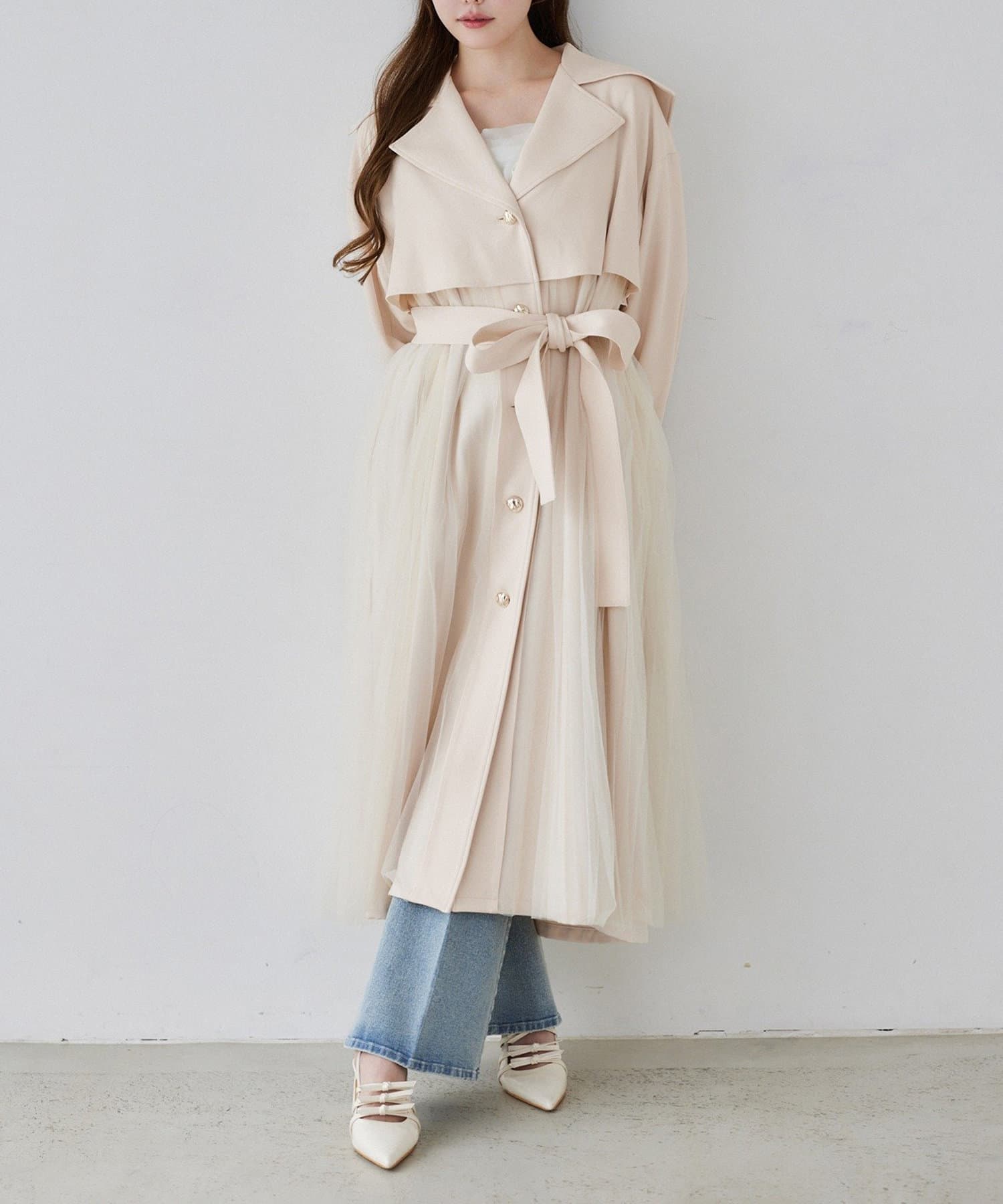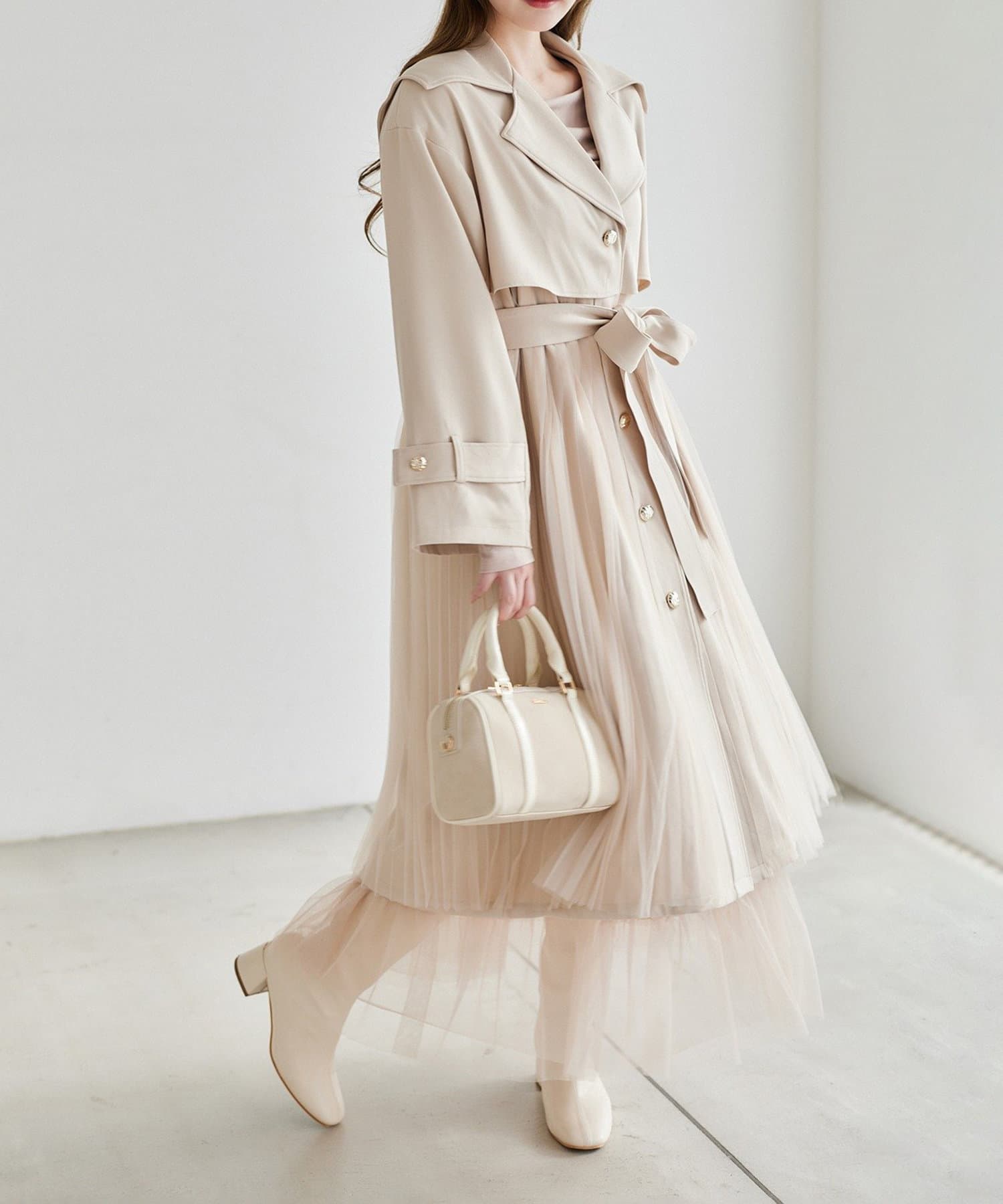 ゴールドボタンとチュールが目を惹くトレンチコート