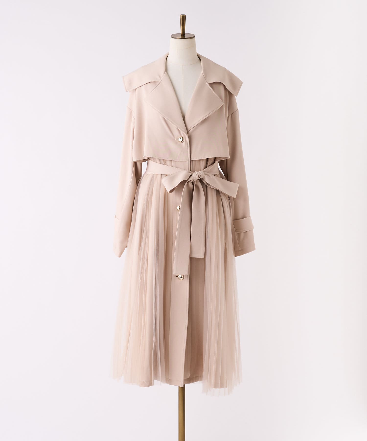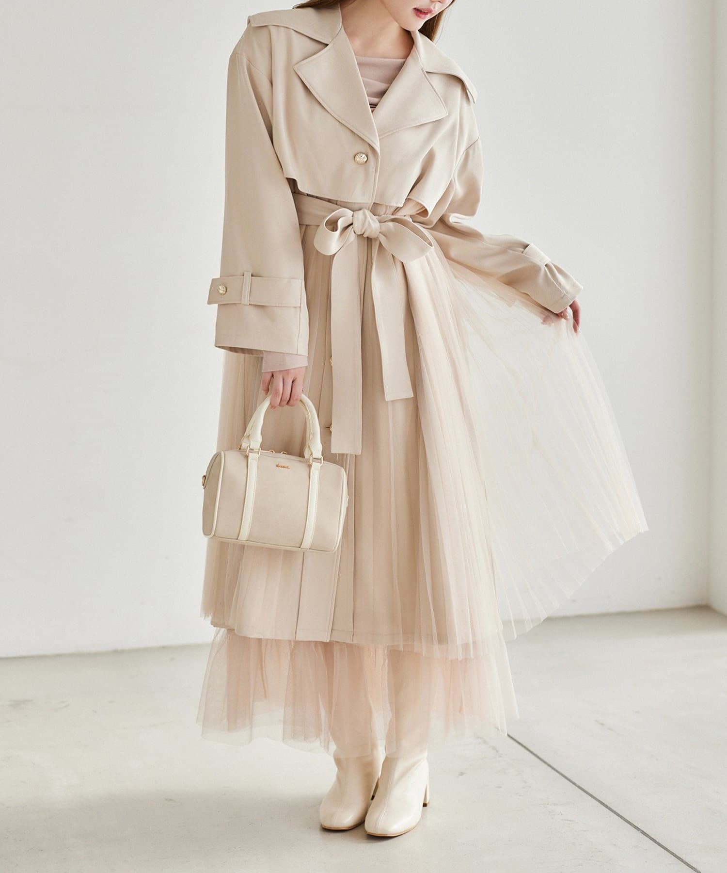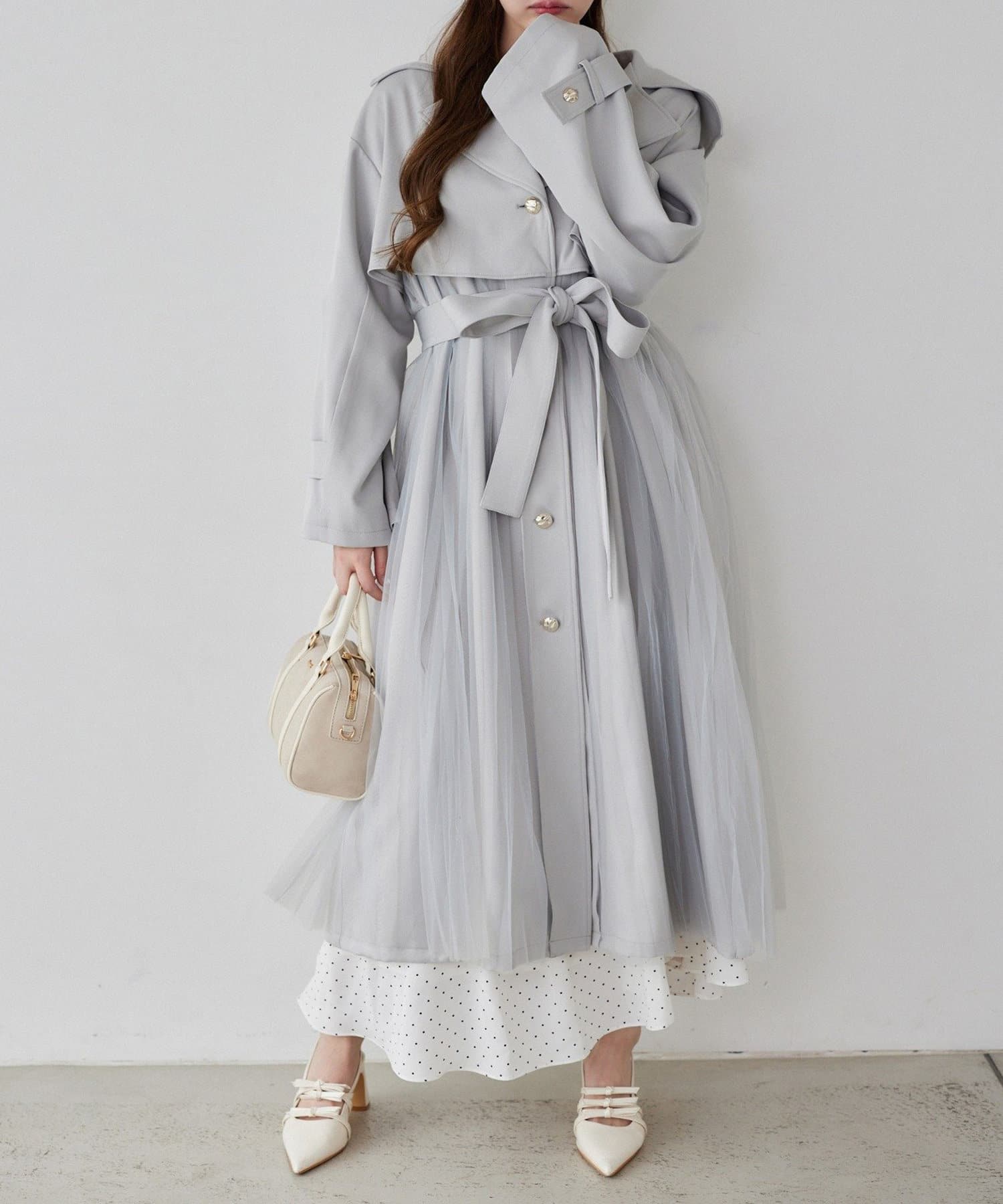ゴールドボタンとチュールが目を惹くトレンチコート