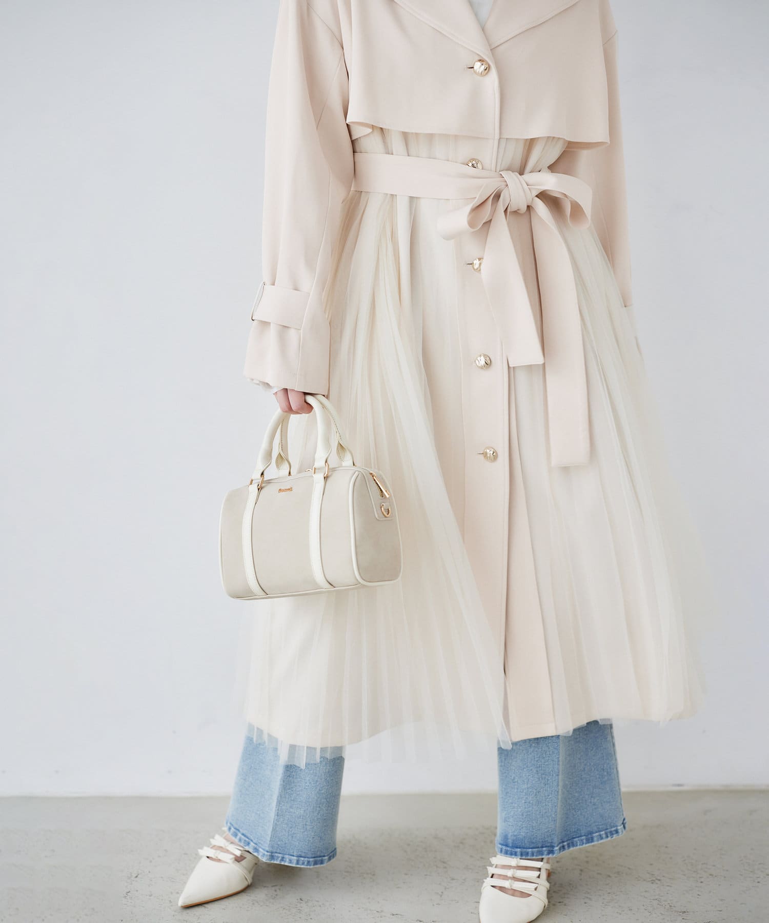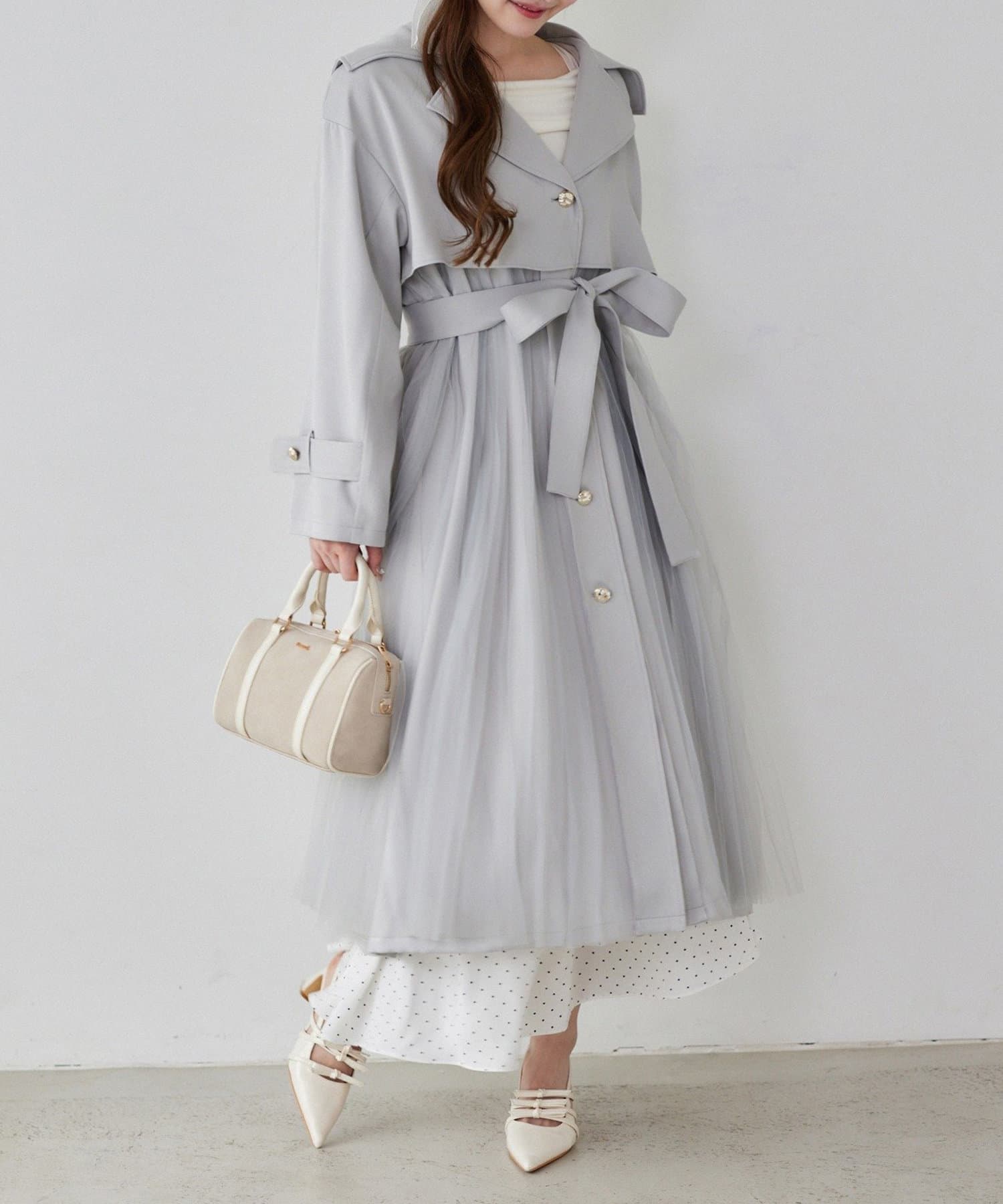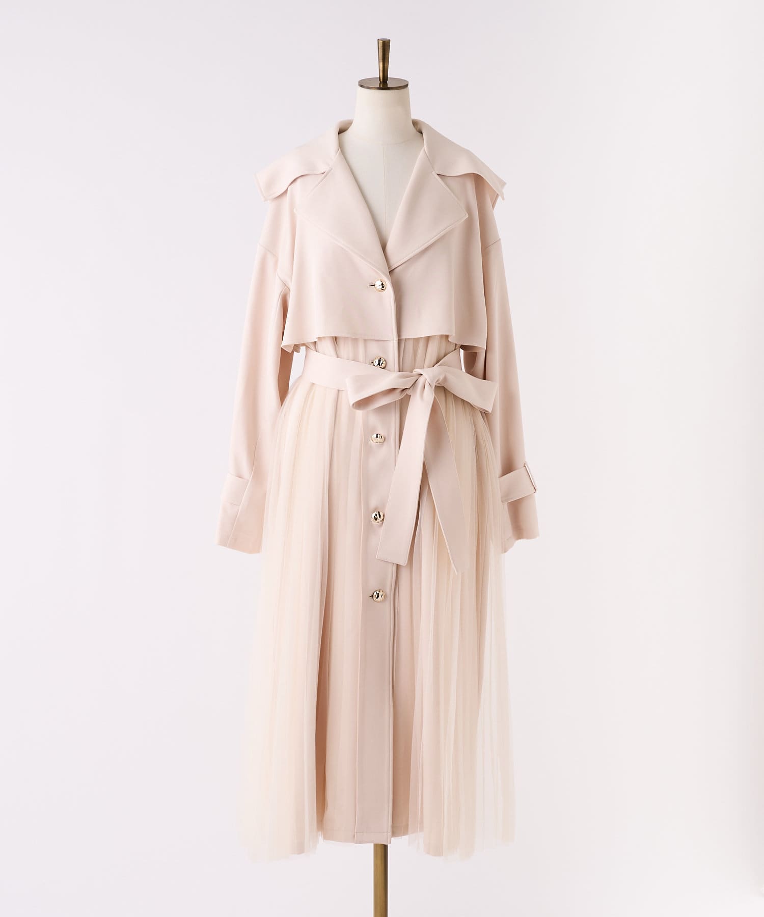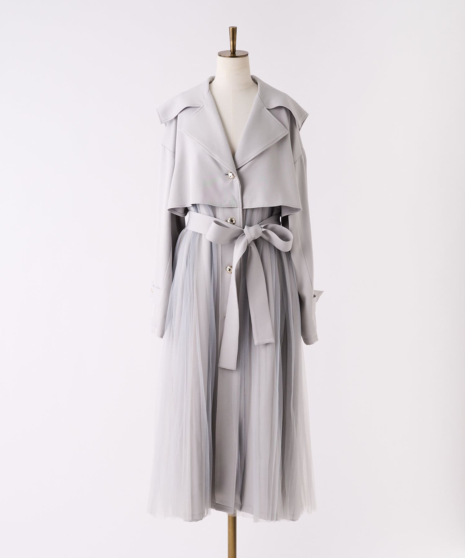 ゴールドボタンとチュールが目を惹くトレンチコート