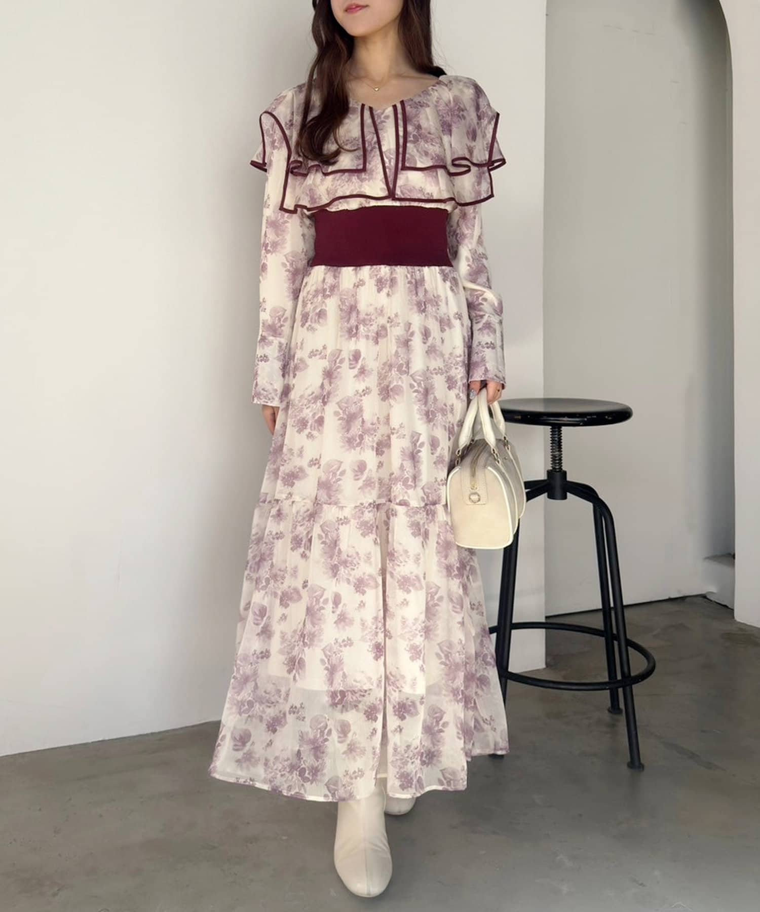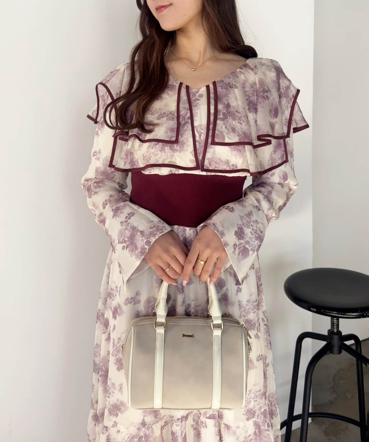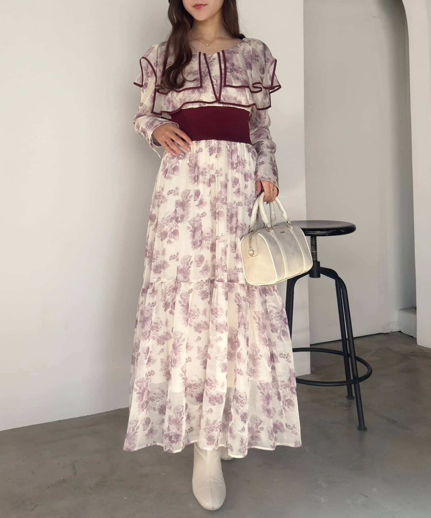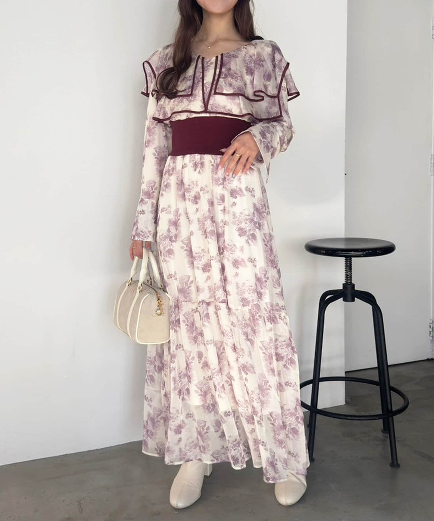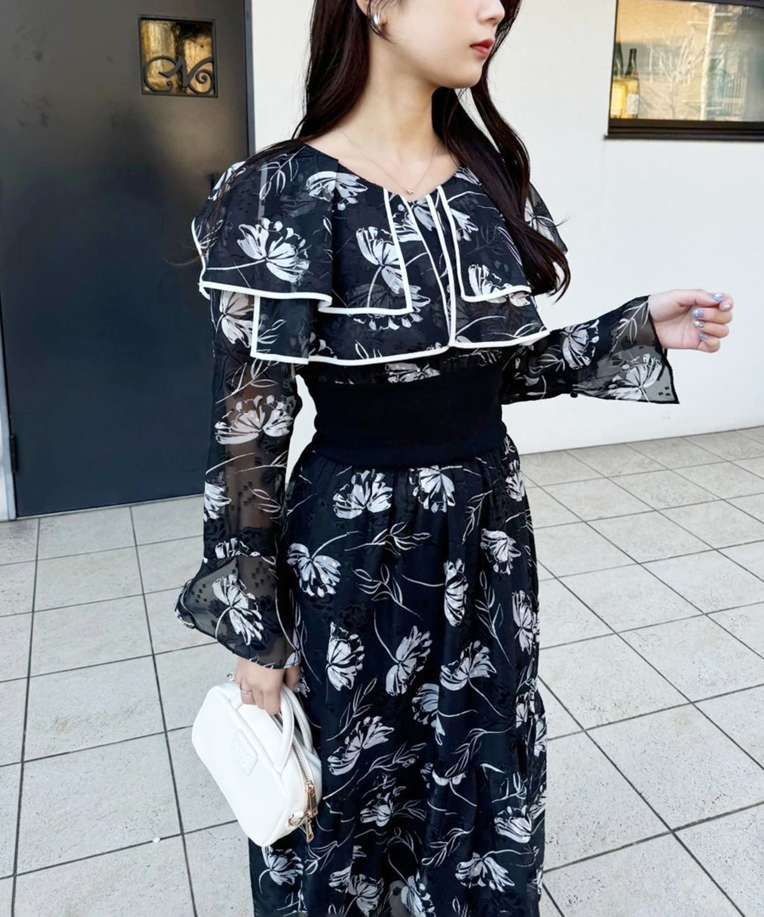 オトナ可愛いパイピング配色の花柄ワンピース。