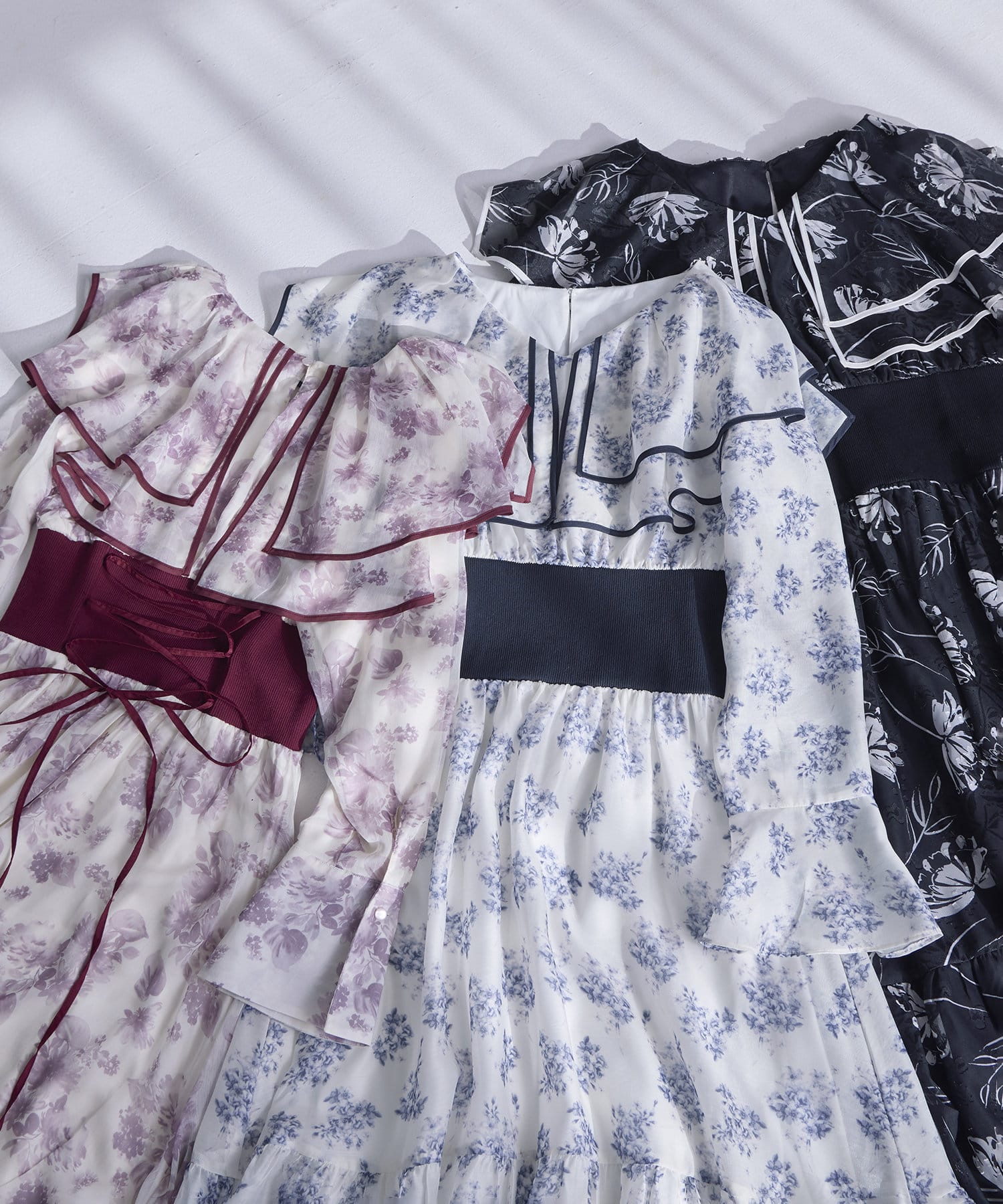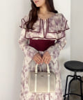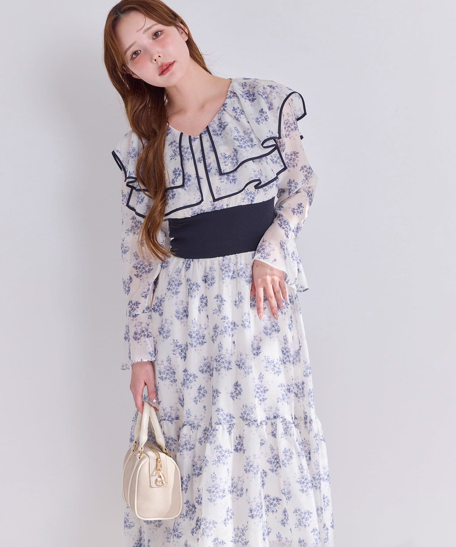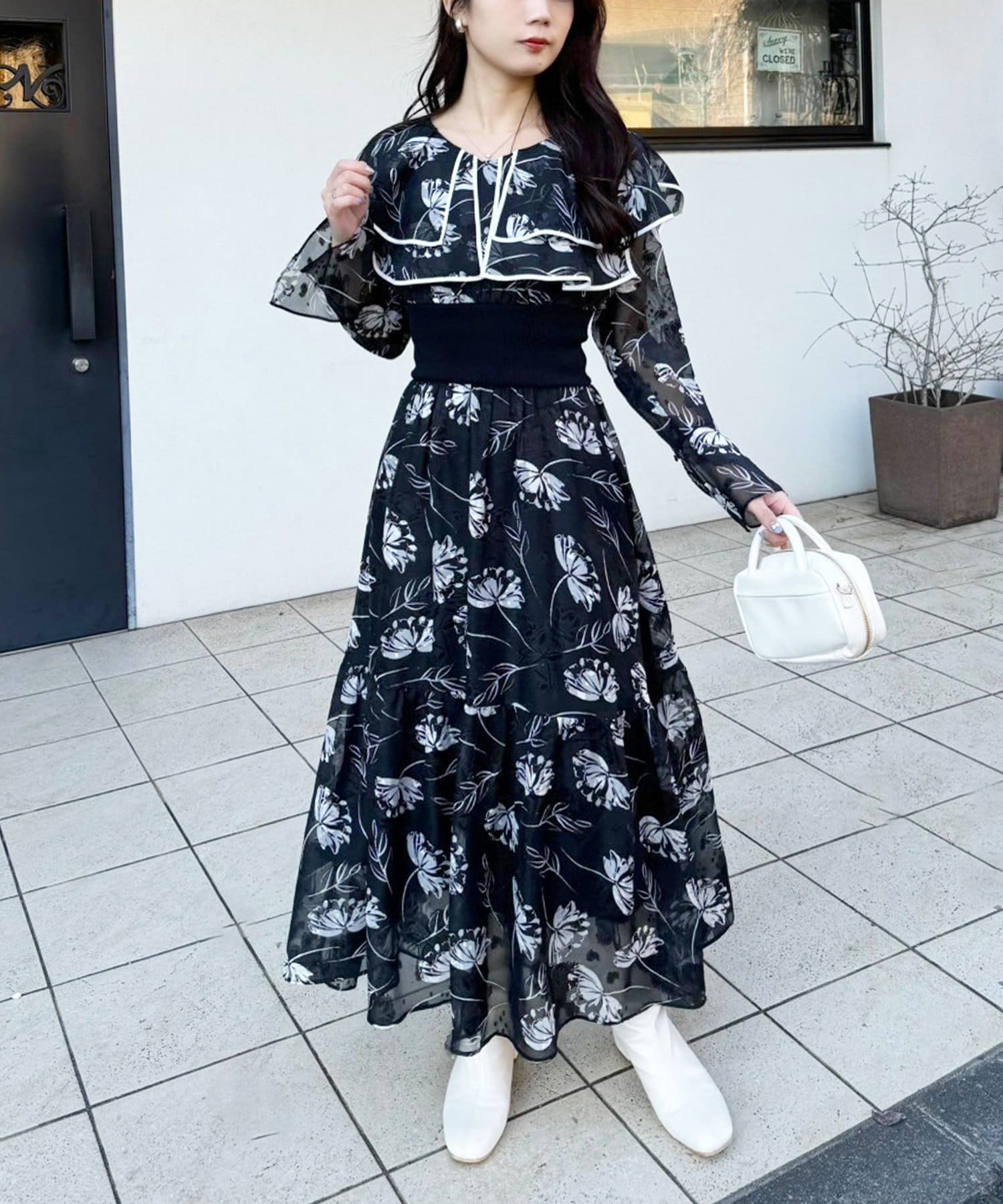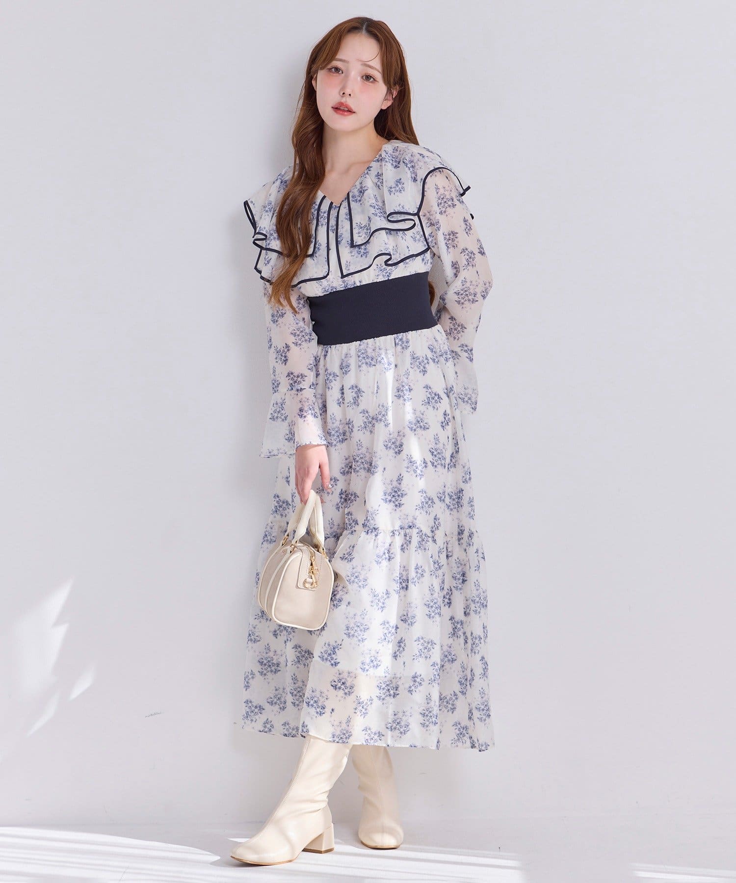 オトナ可愛いパイピング配色の花柄ワンピース。