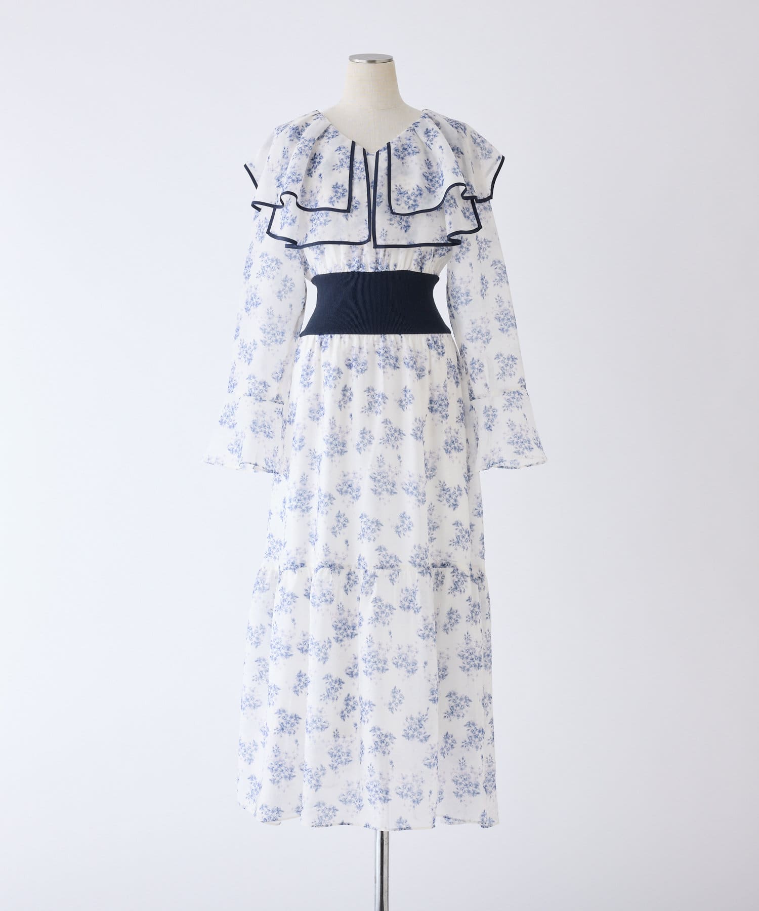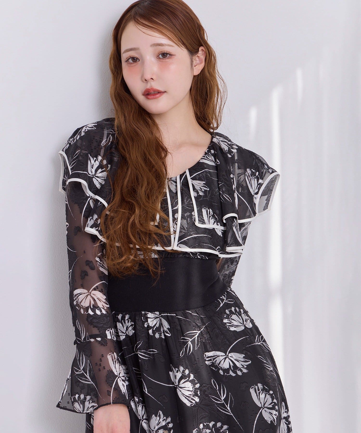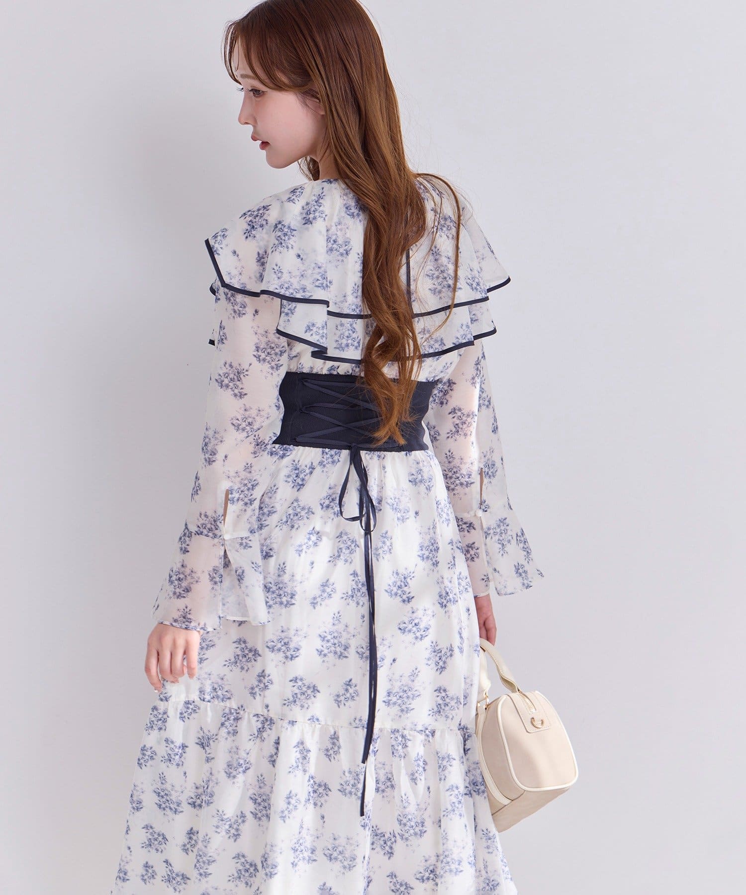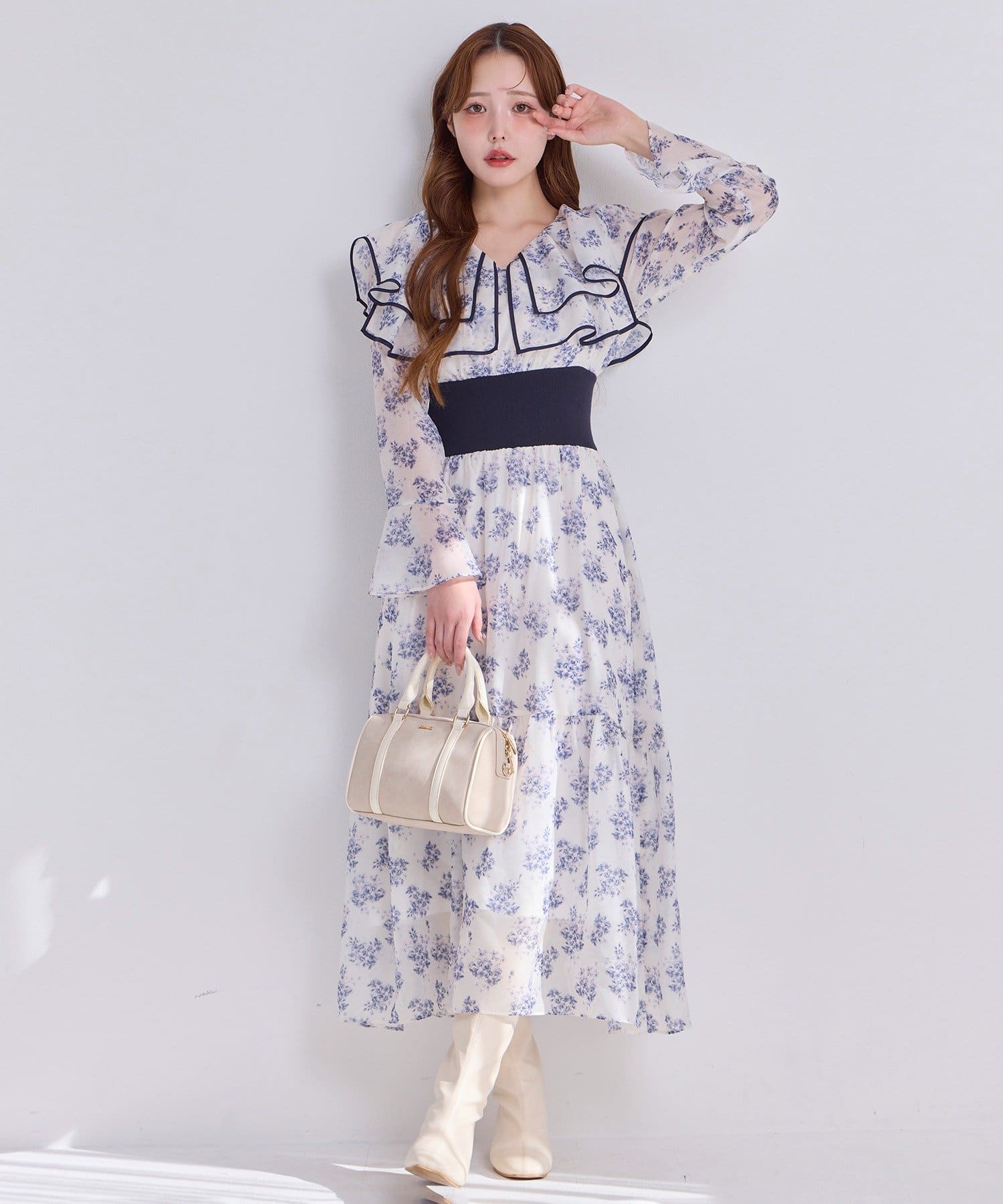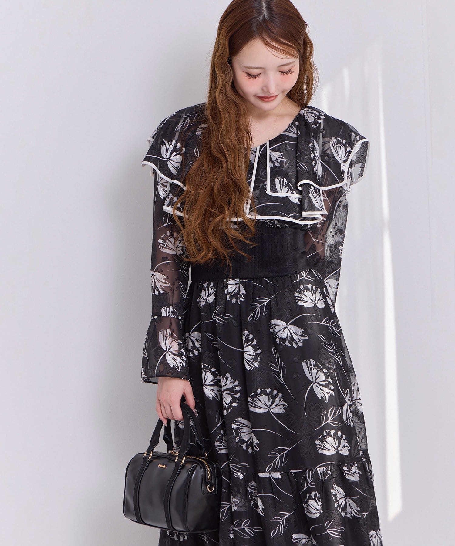 オトナ可愛いパイピング配色の花柄ワンピース。