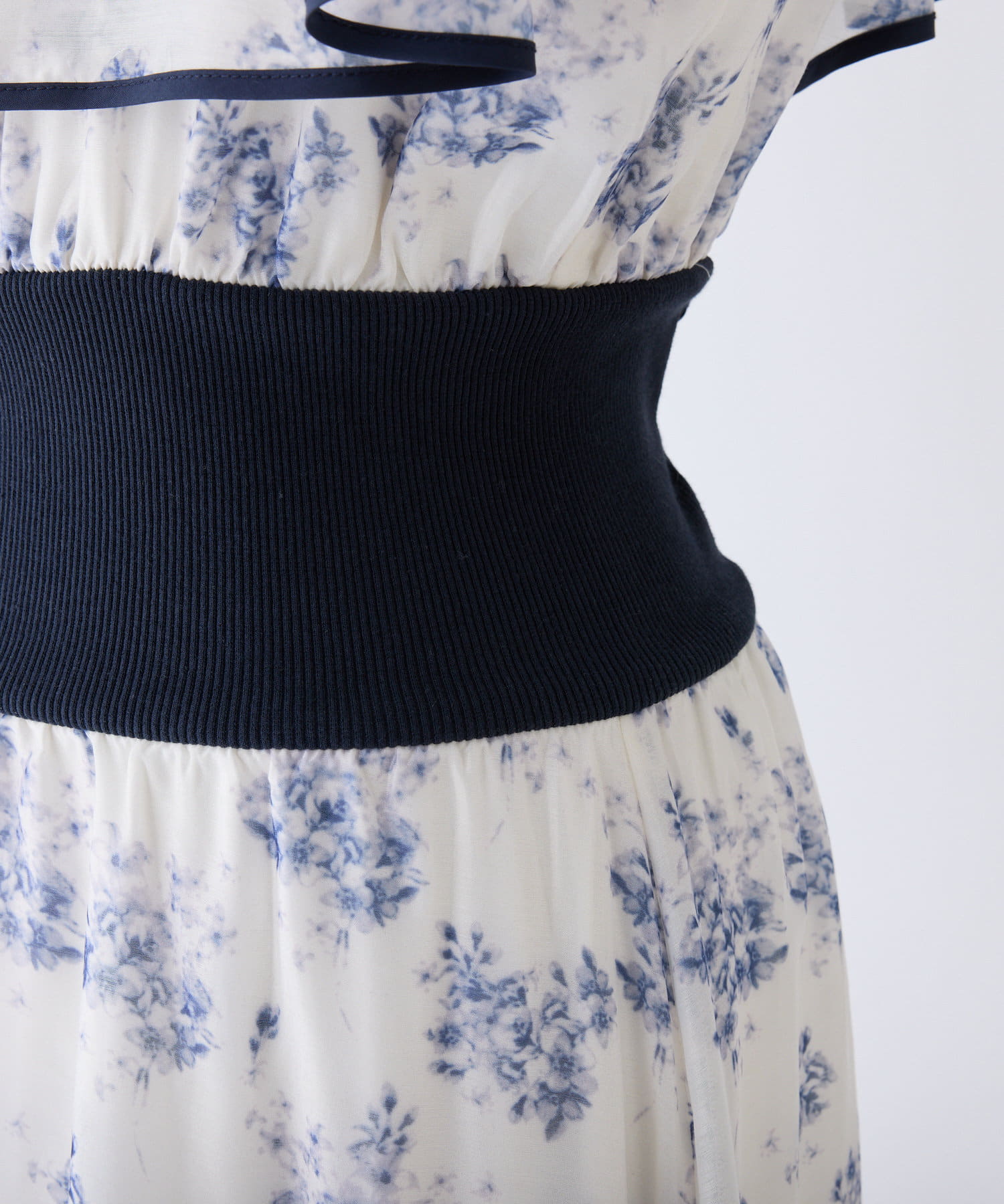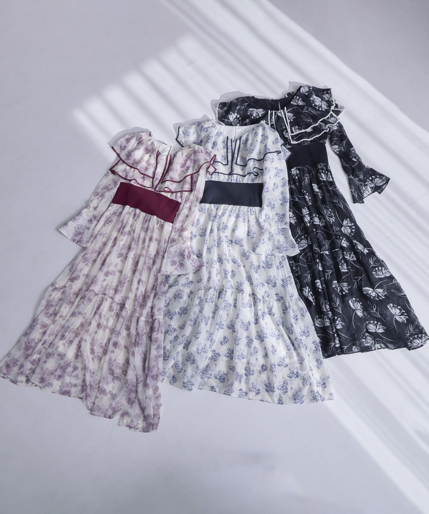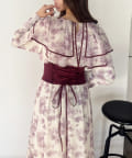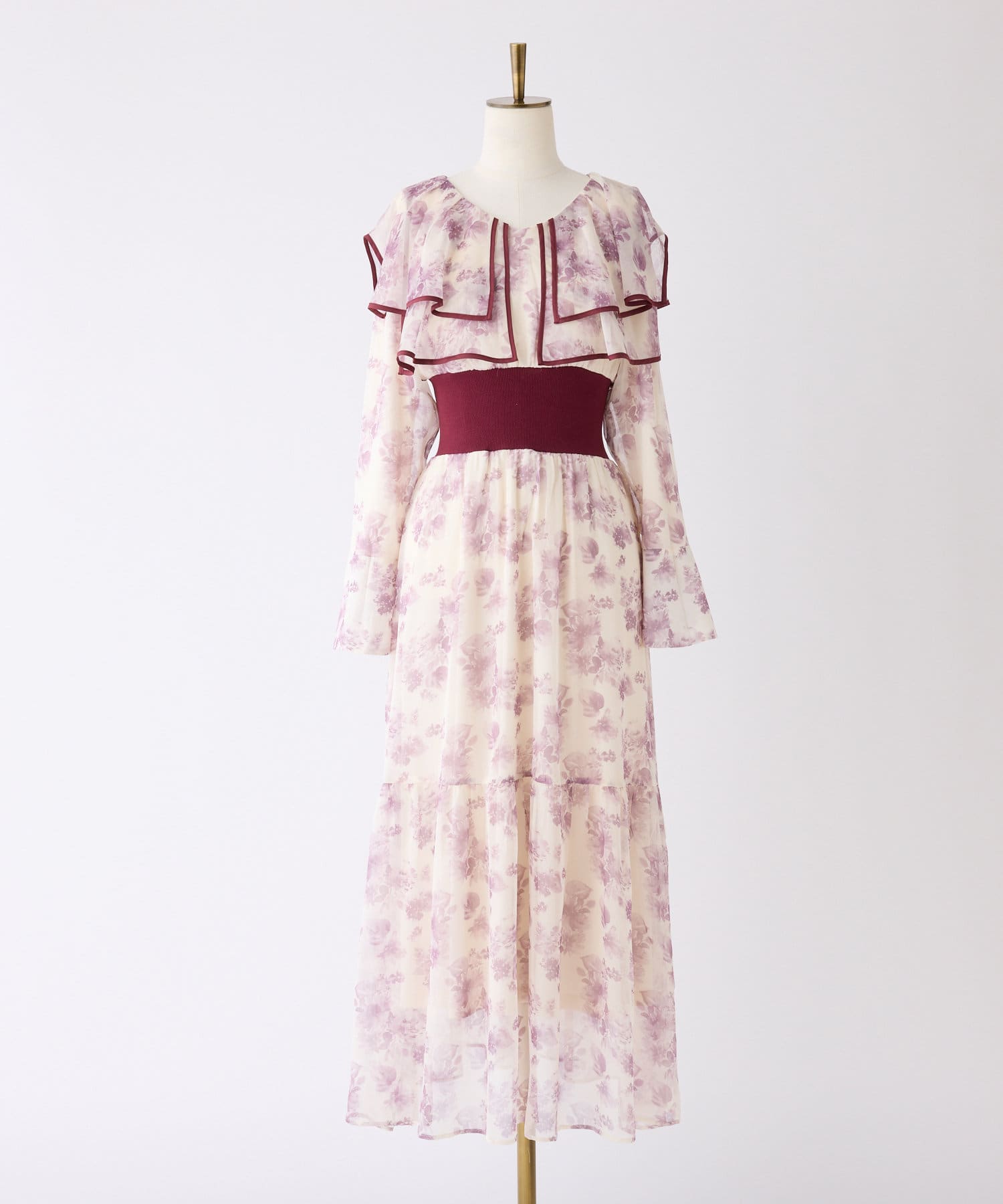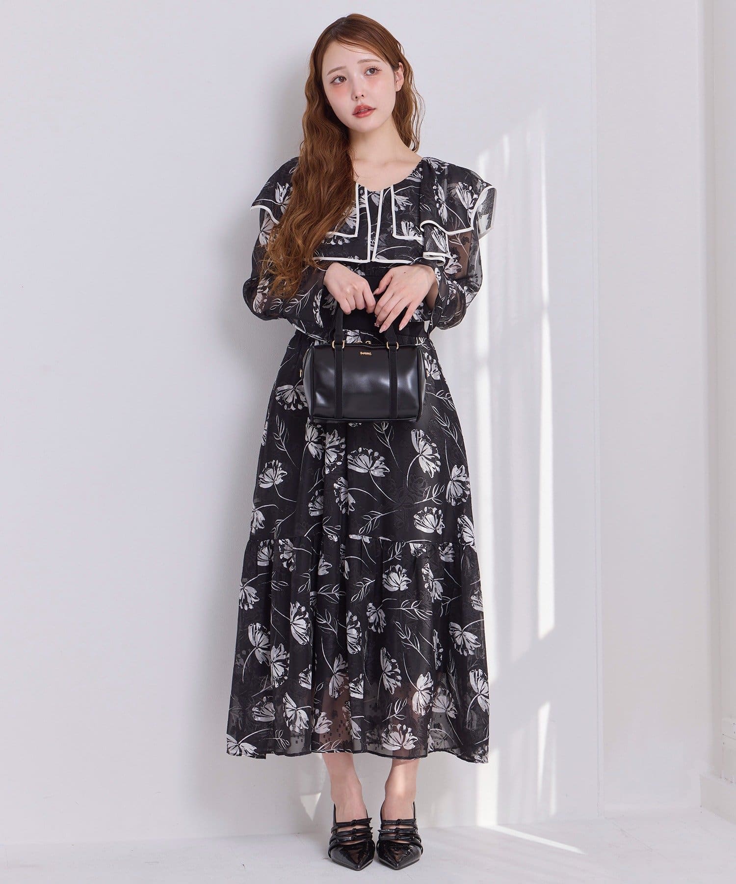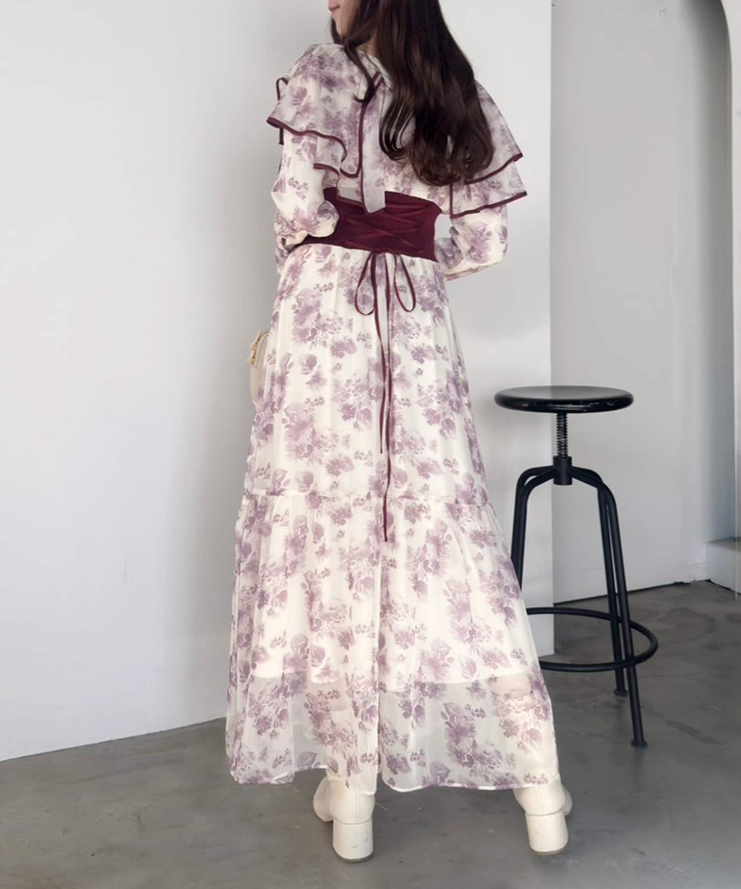 オトナ可愛いパイピング配色の花柄ワンピース。