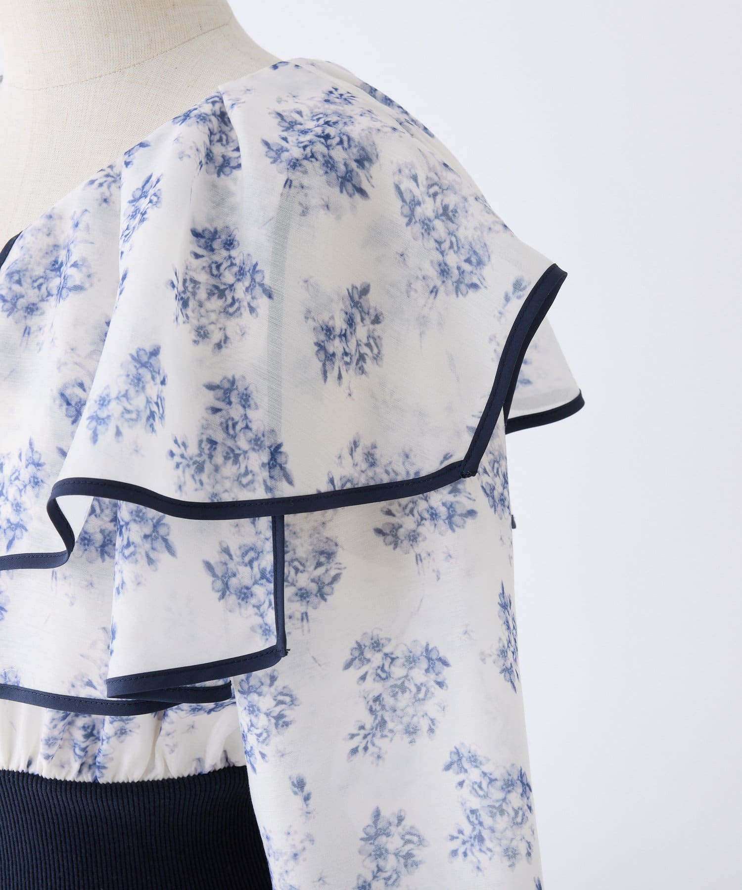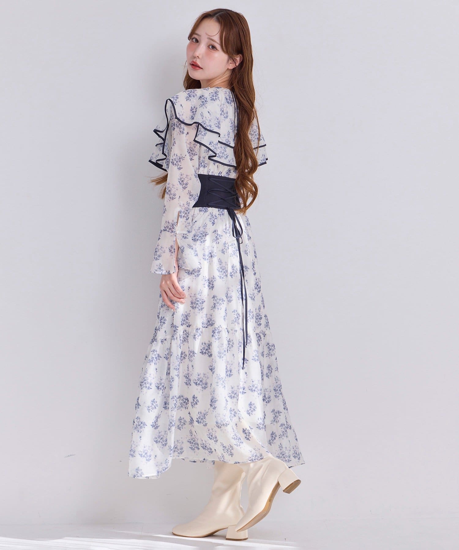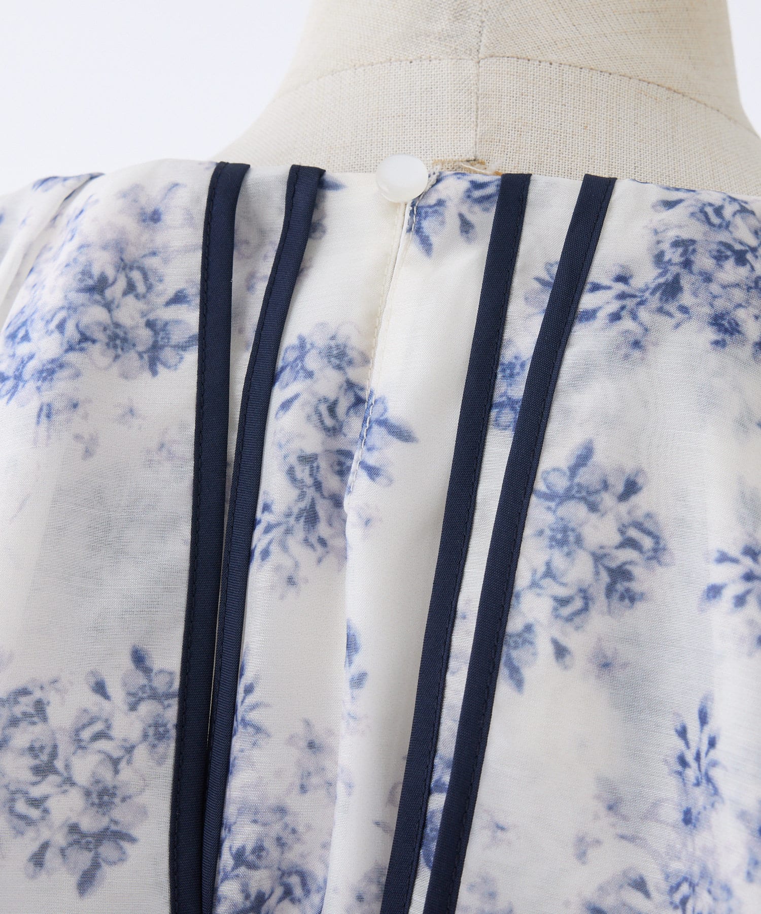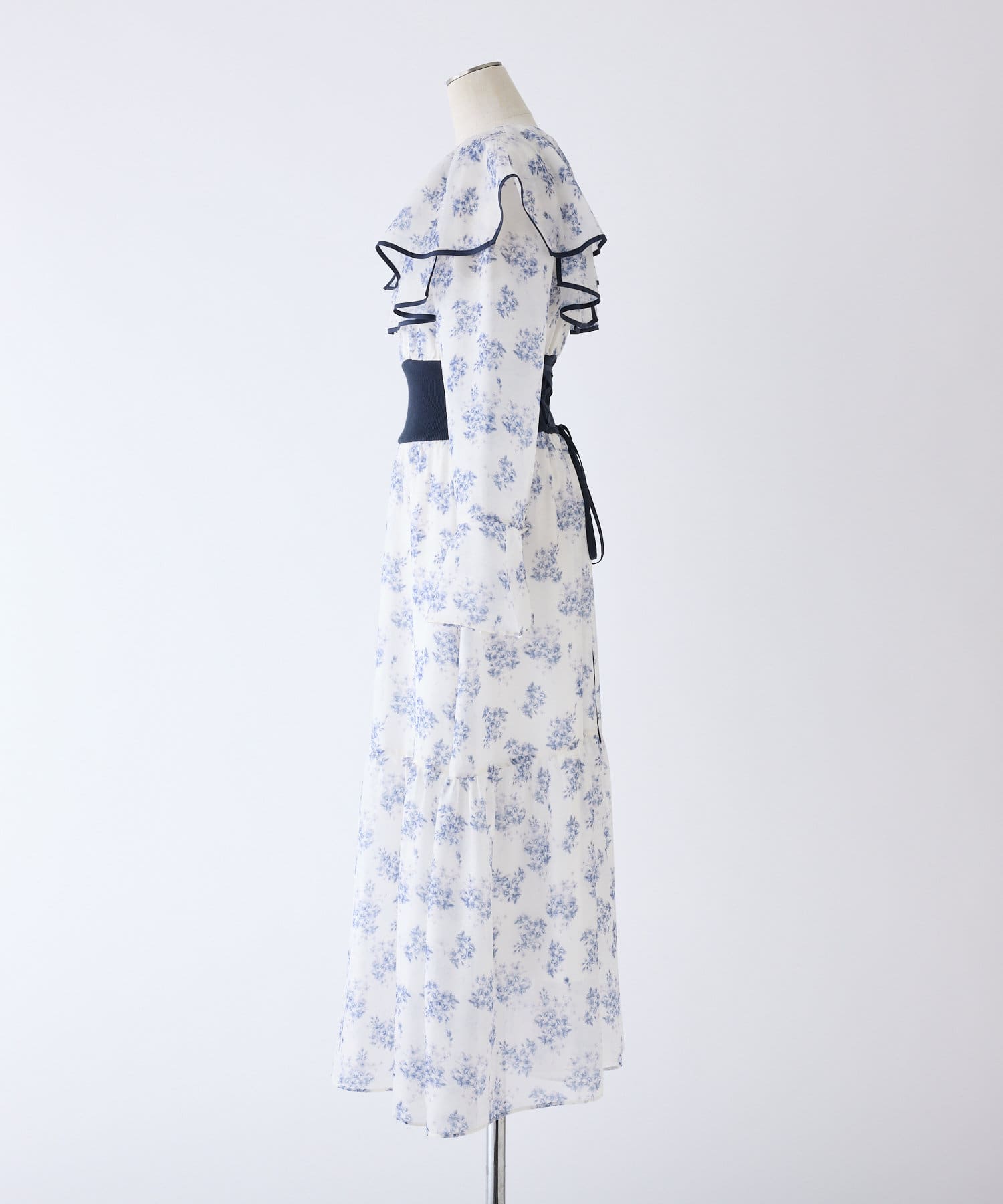 オトナ可愛いパイピング配色の花柄ワンピース。