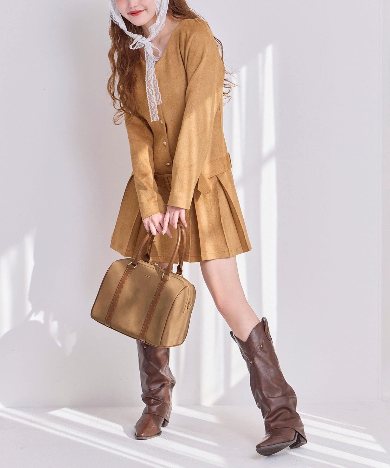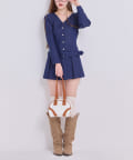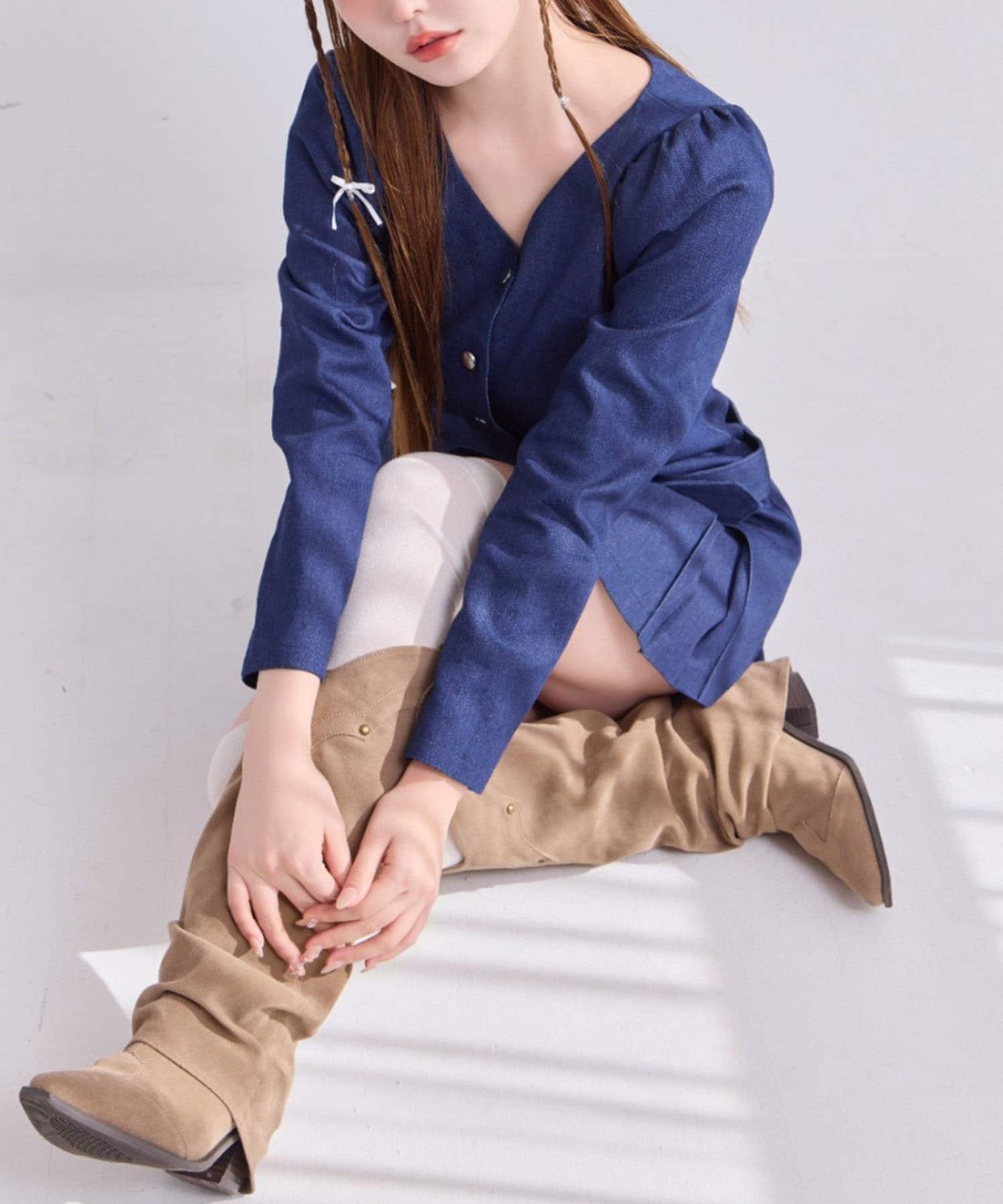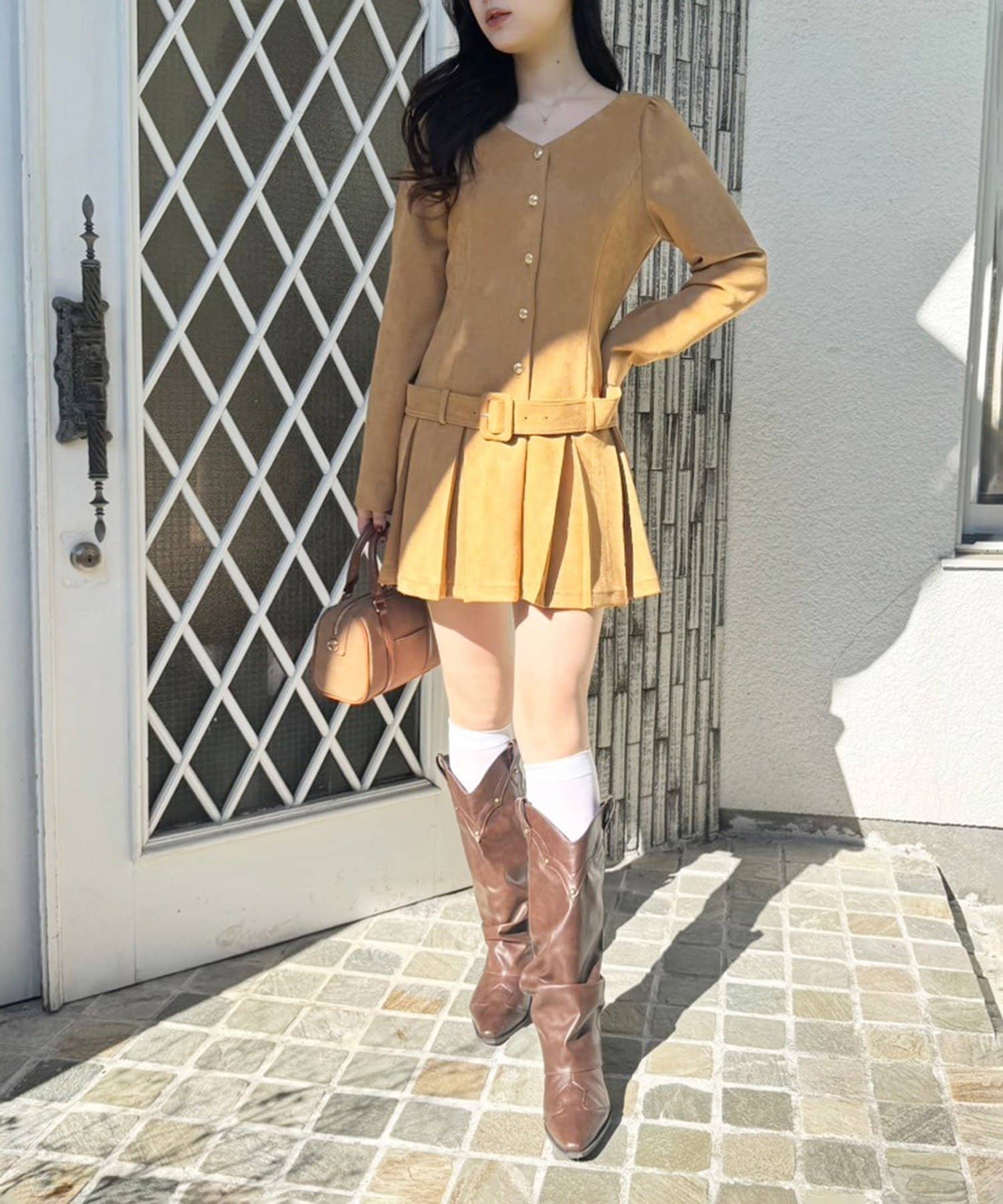 足元はロングブーツや、ハイソックスにパンプスを合わせるのがおすすめです。