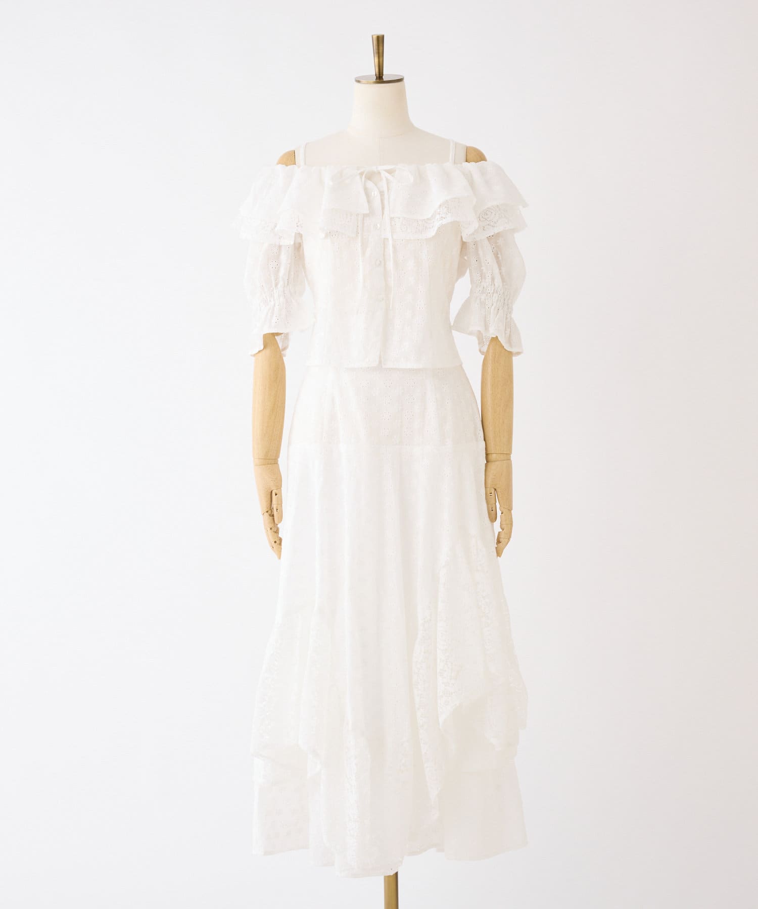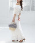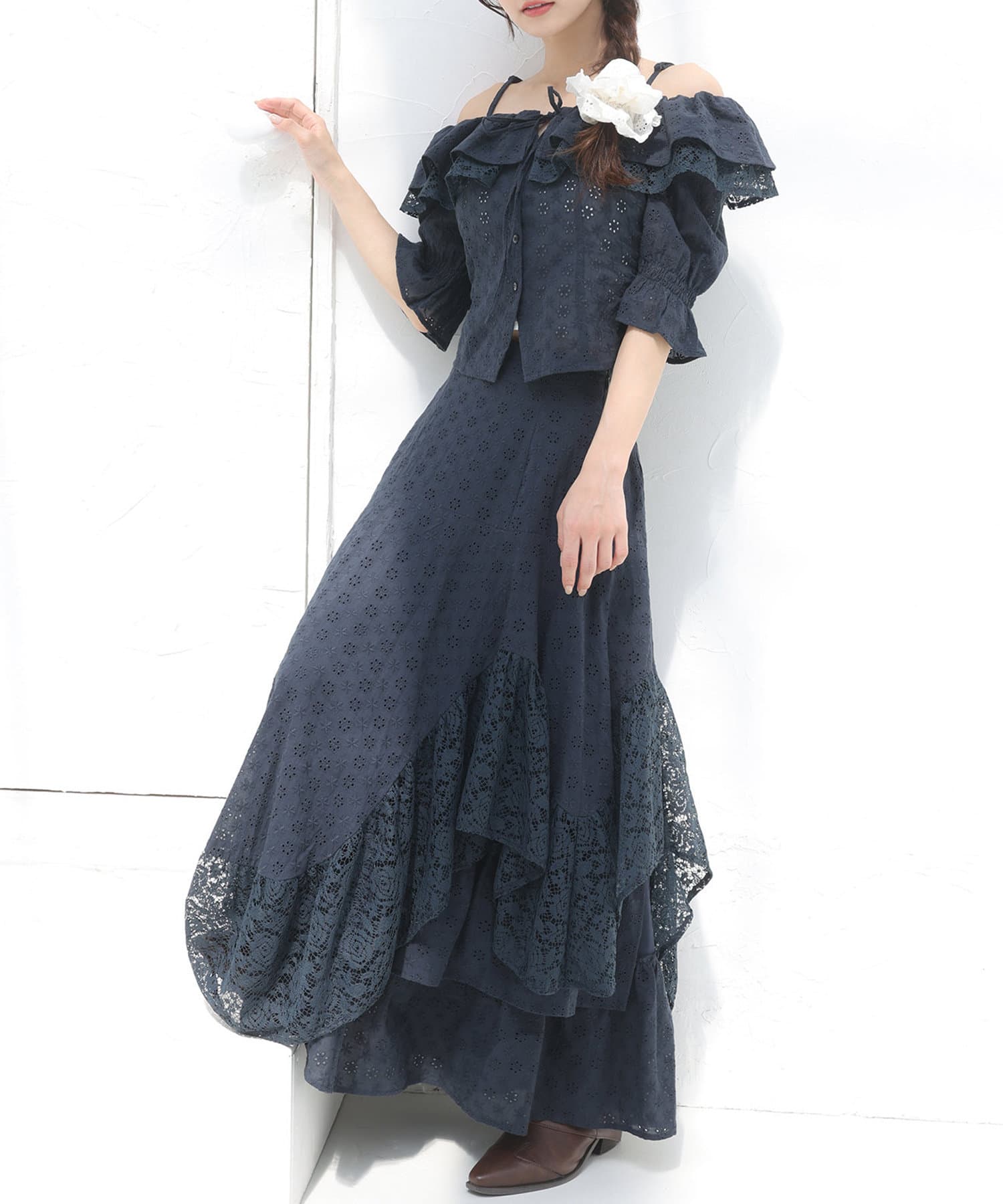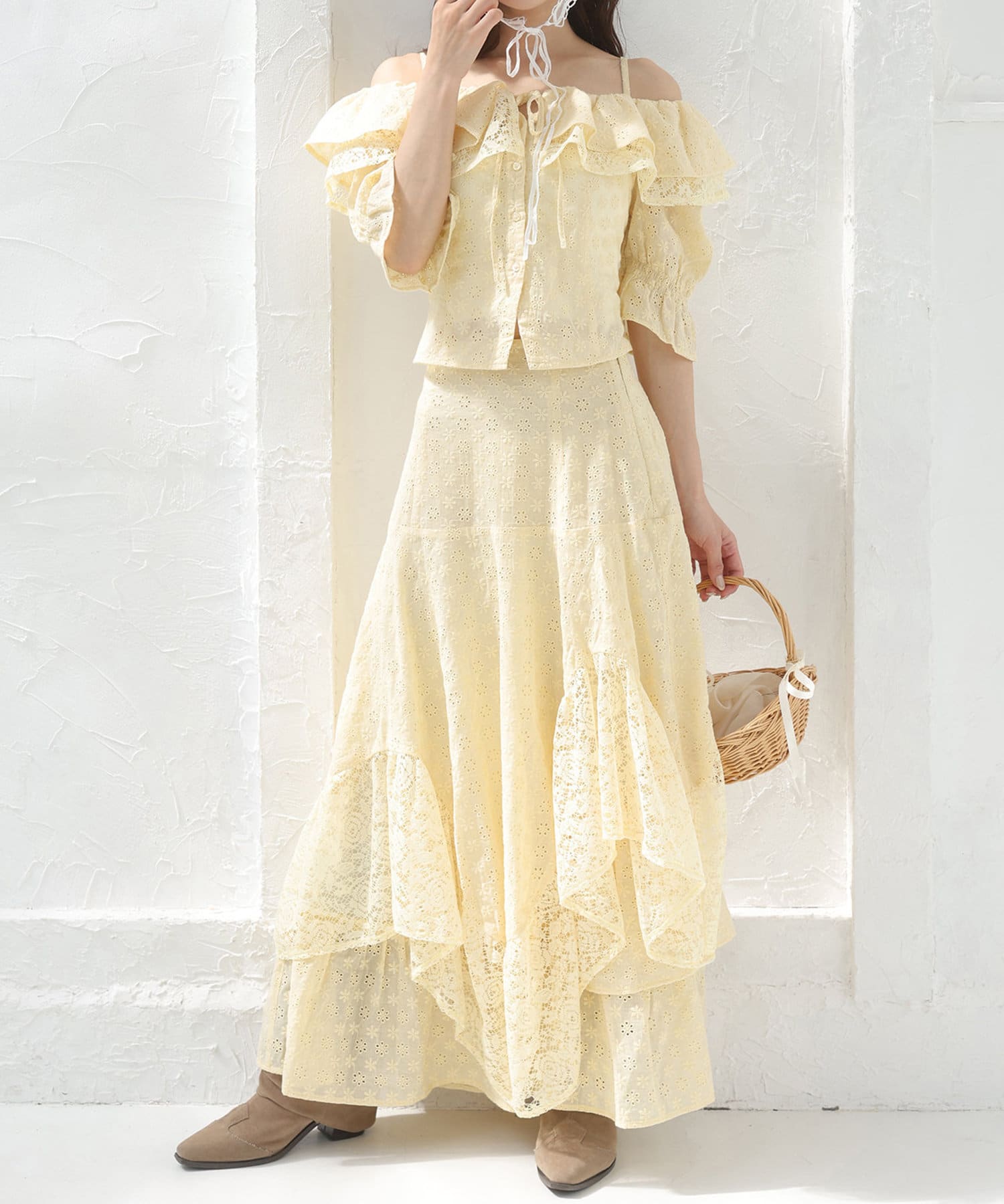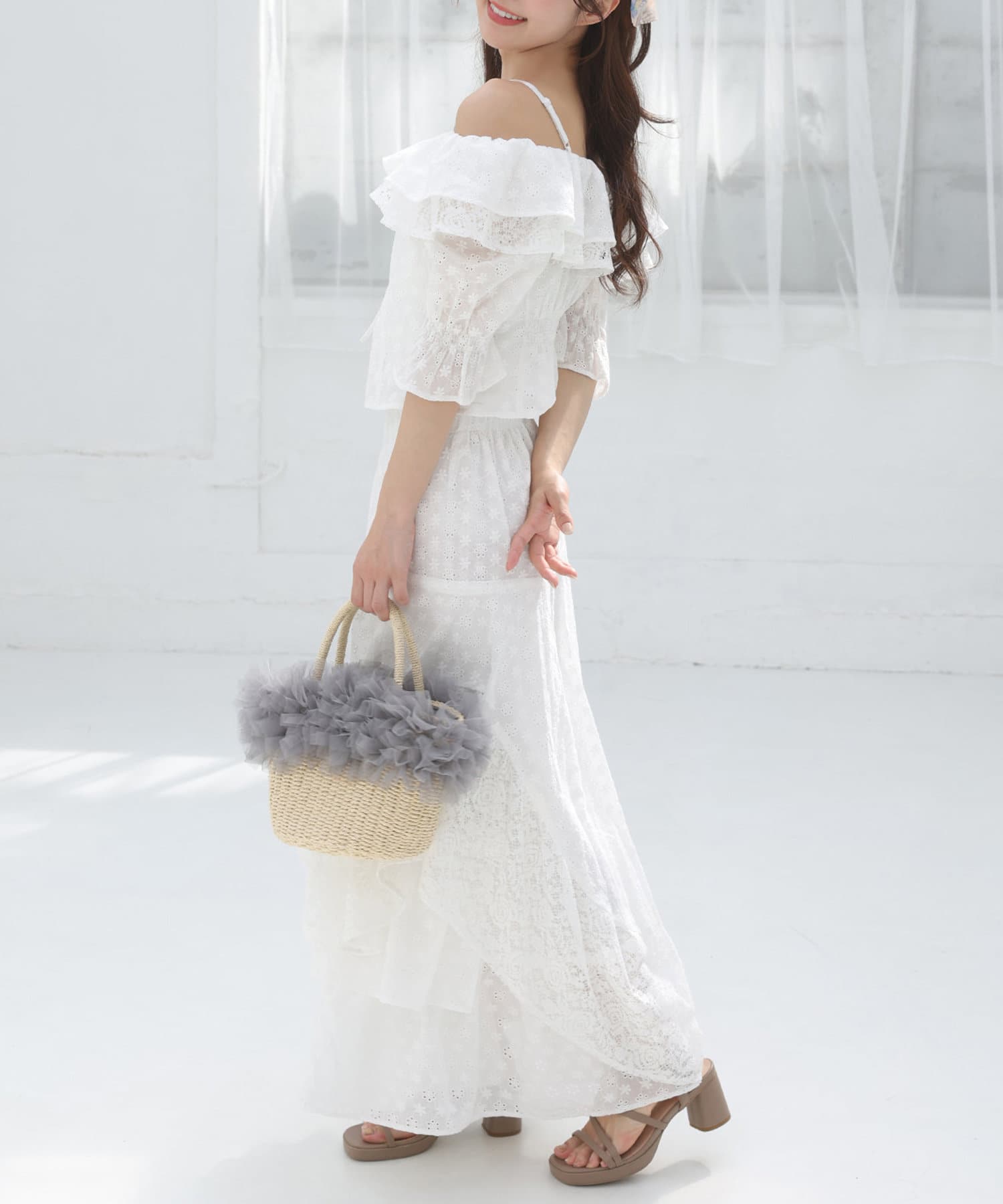 女性らしさを引き立てるショート丈のフリルオフショルブラウスと、