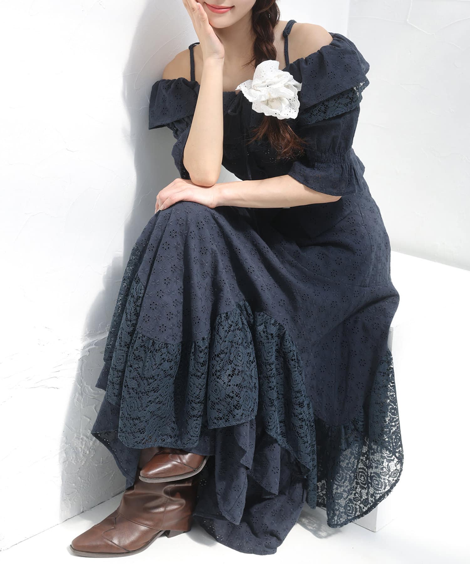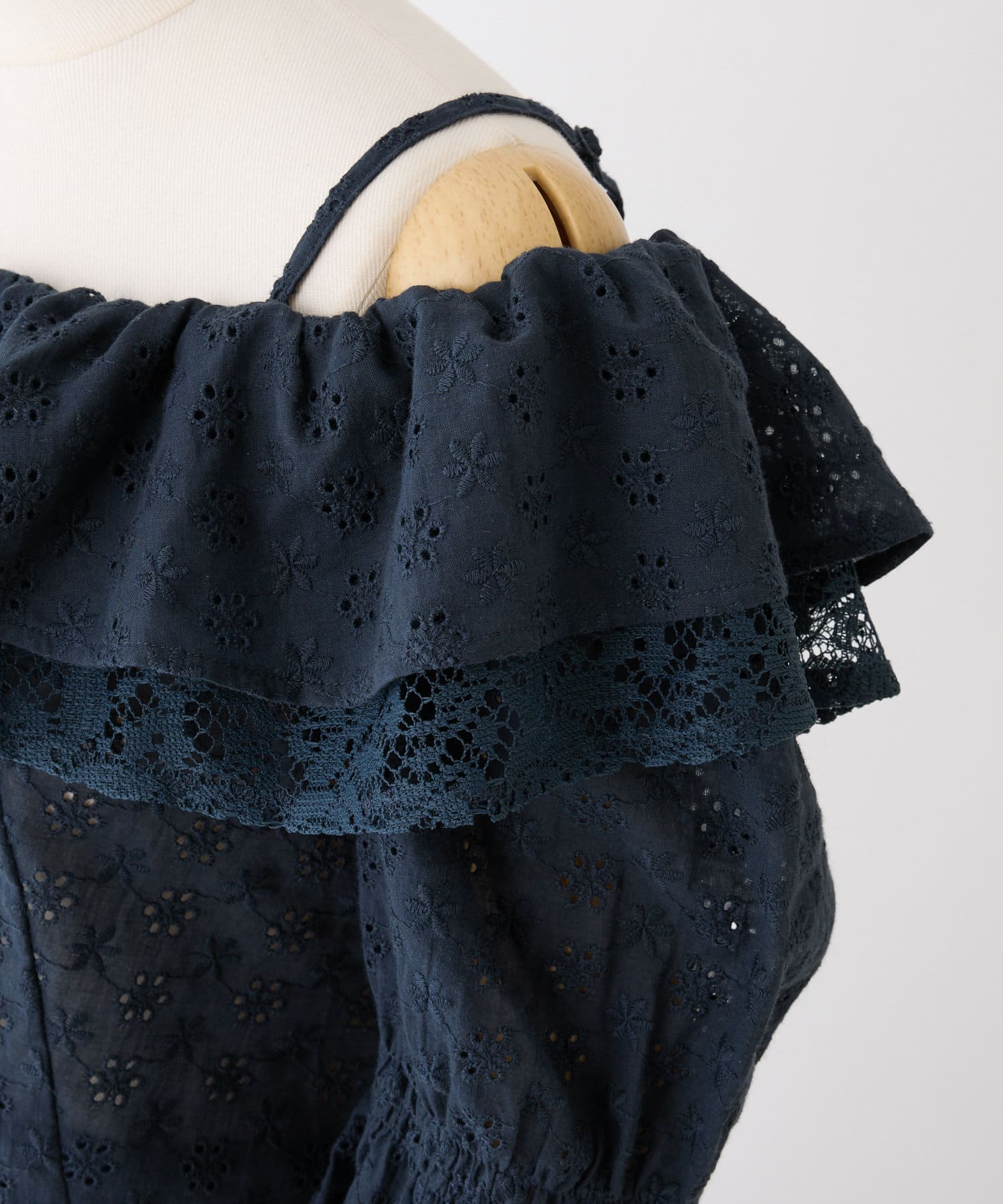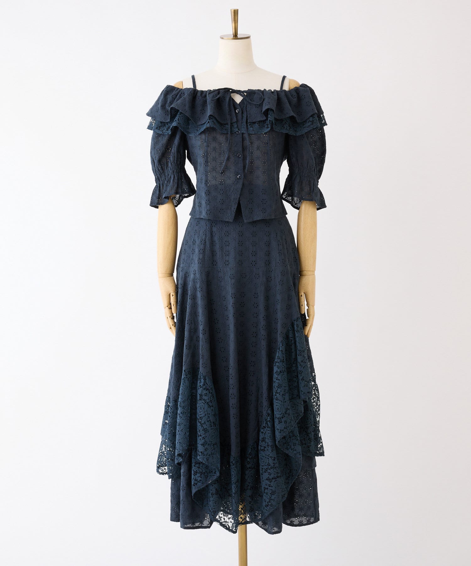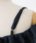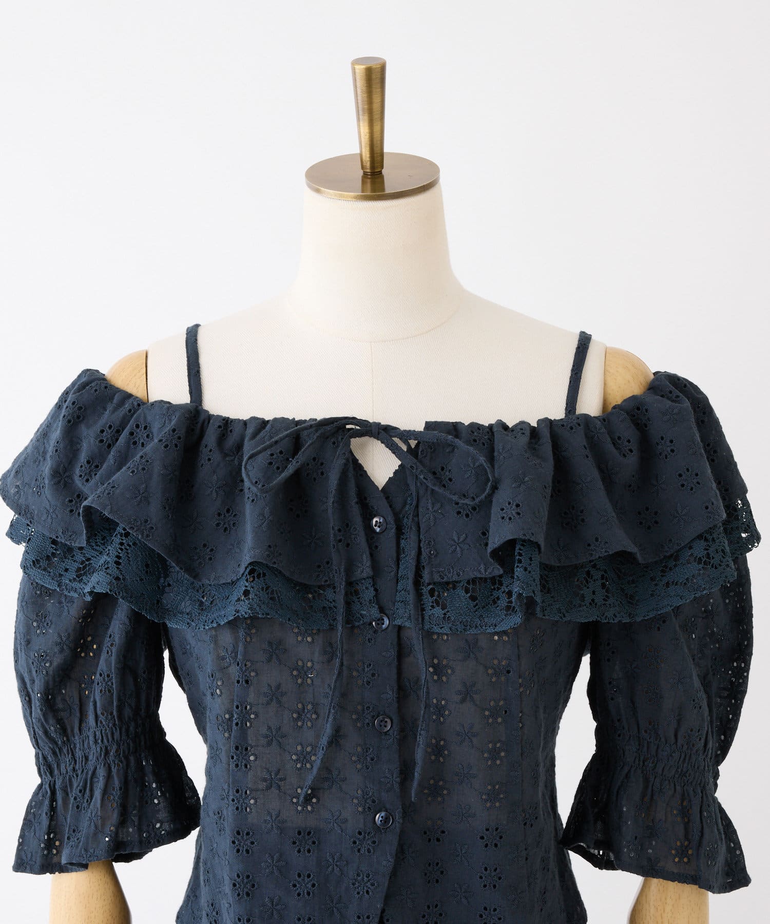 女性らしさを引き立てるショート丈のフリルオフショルブラウスと、