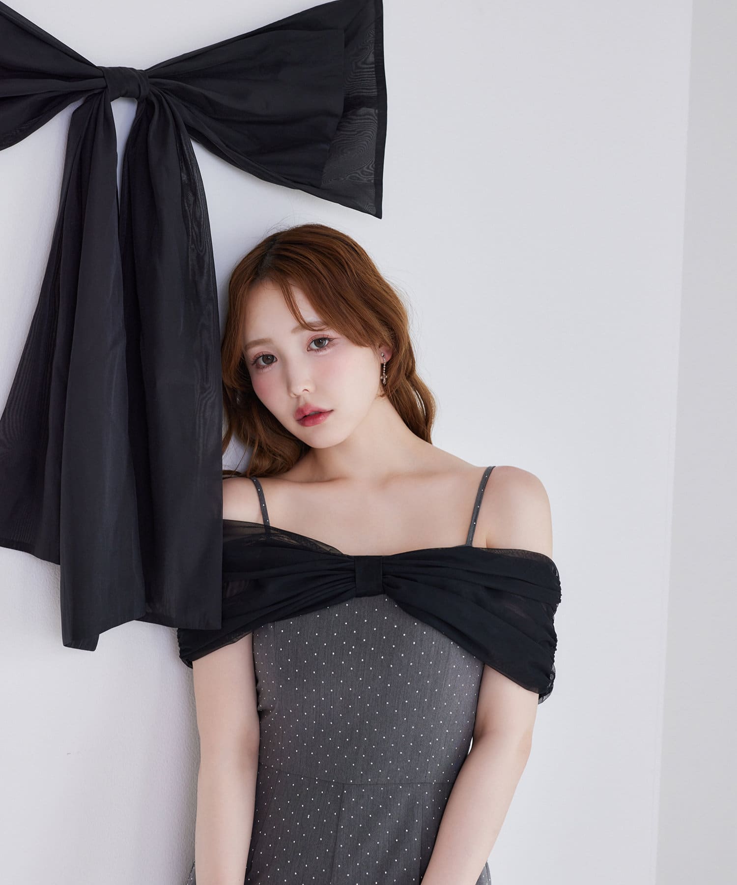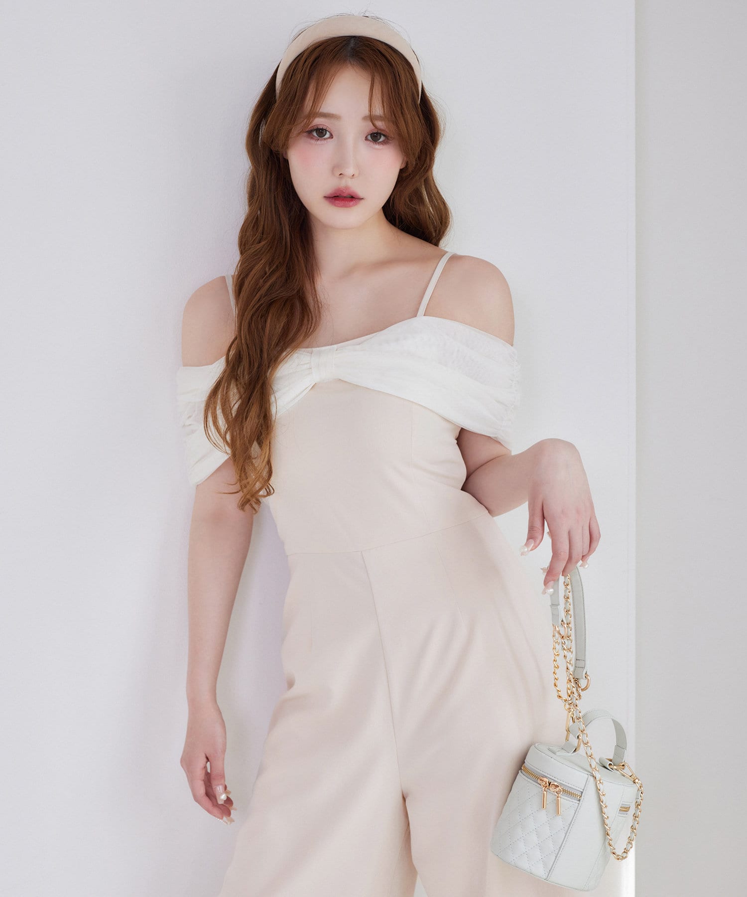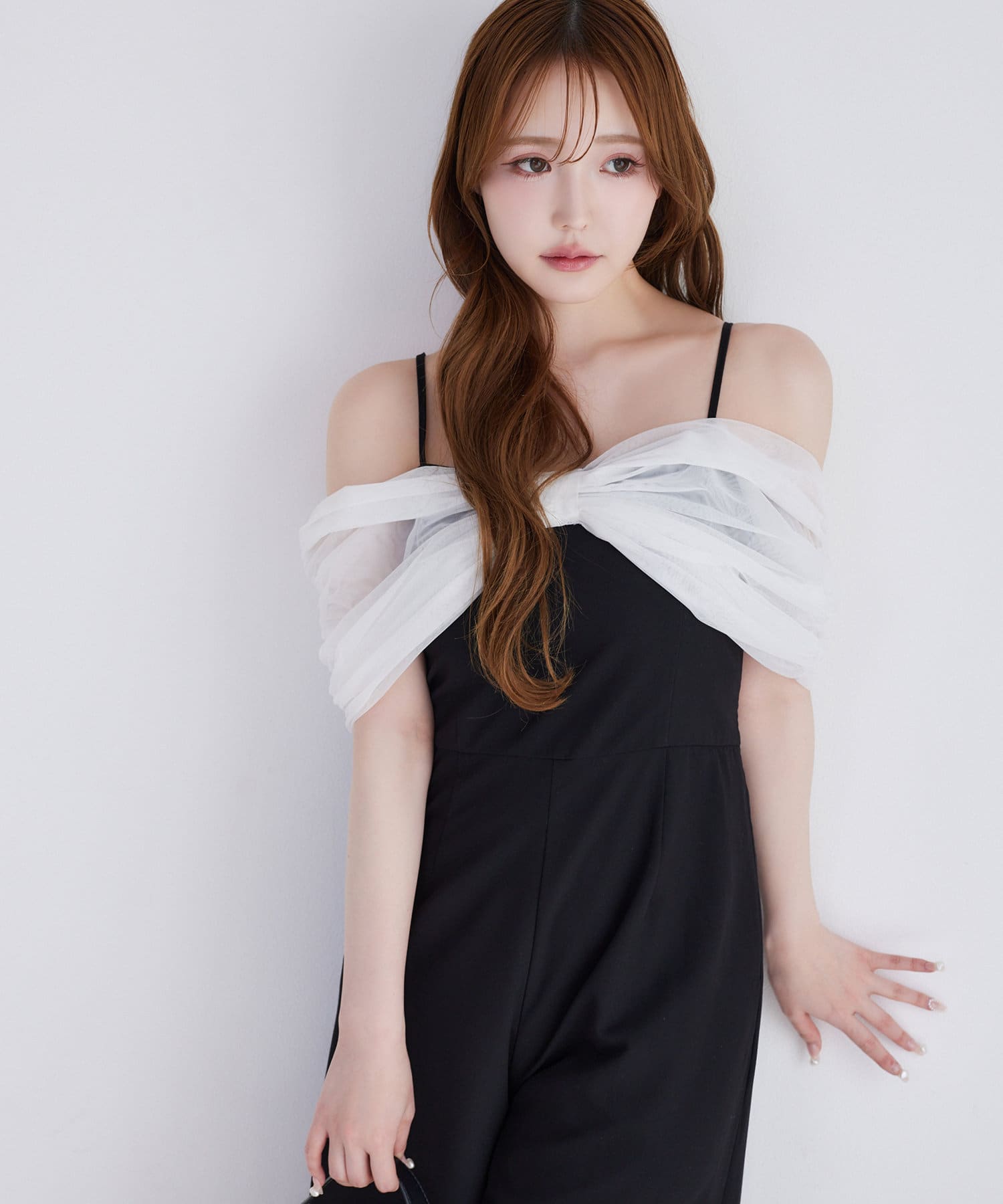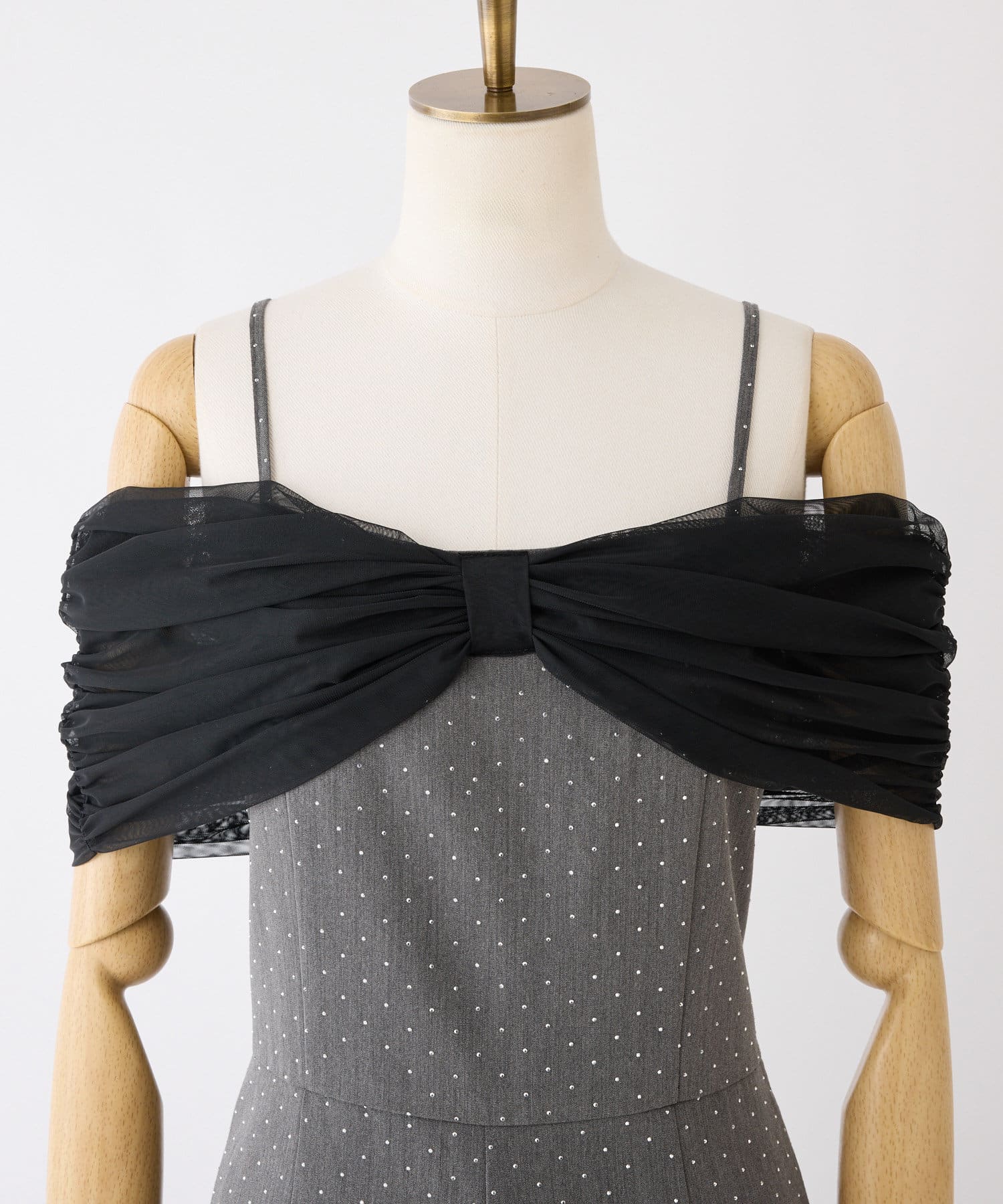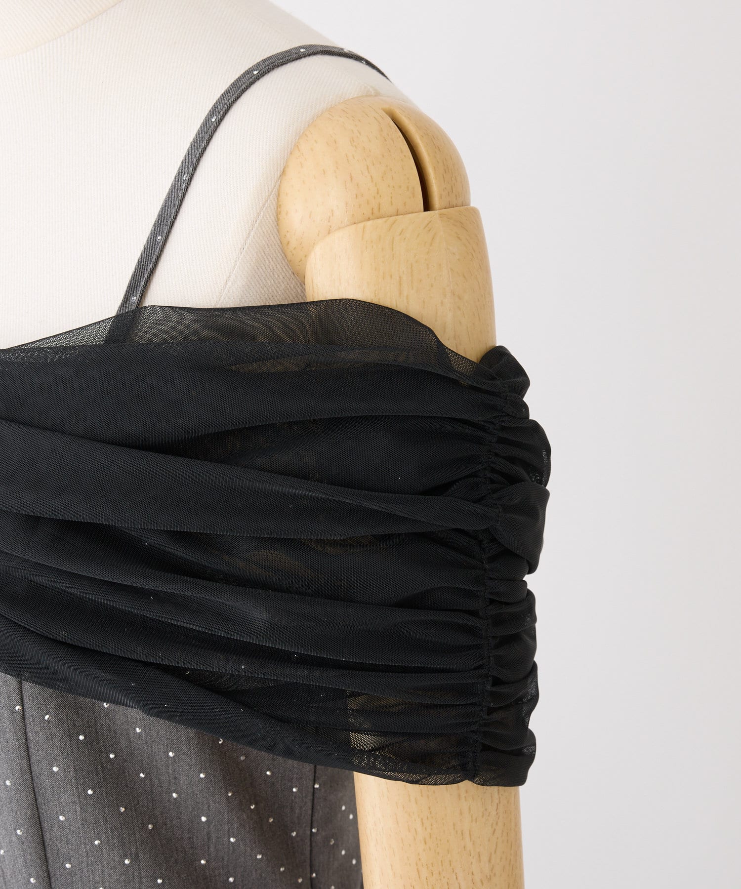 襟元のチュールが顔まわりを華やかに演出し、オフショルダー仕様でデコルテを美しく魅せながら、
